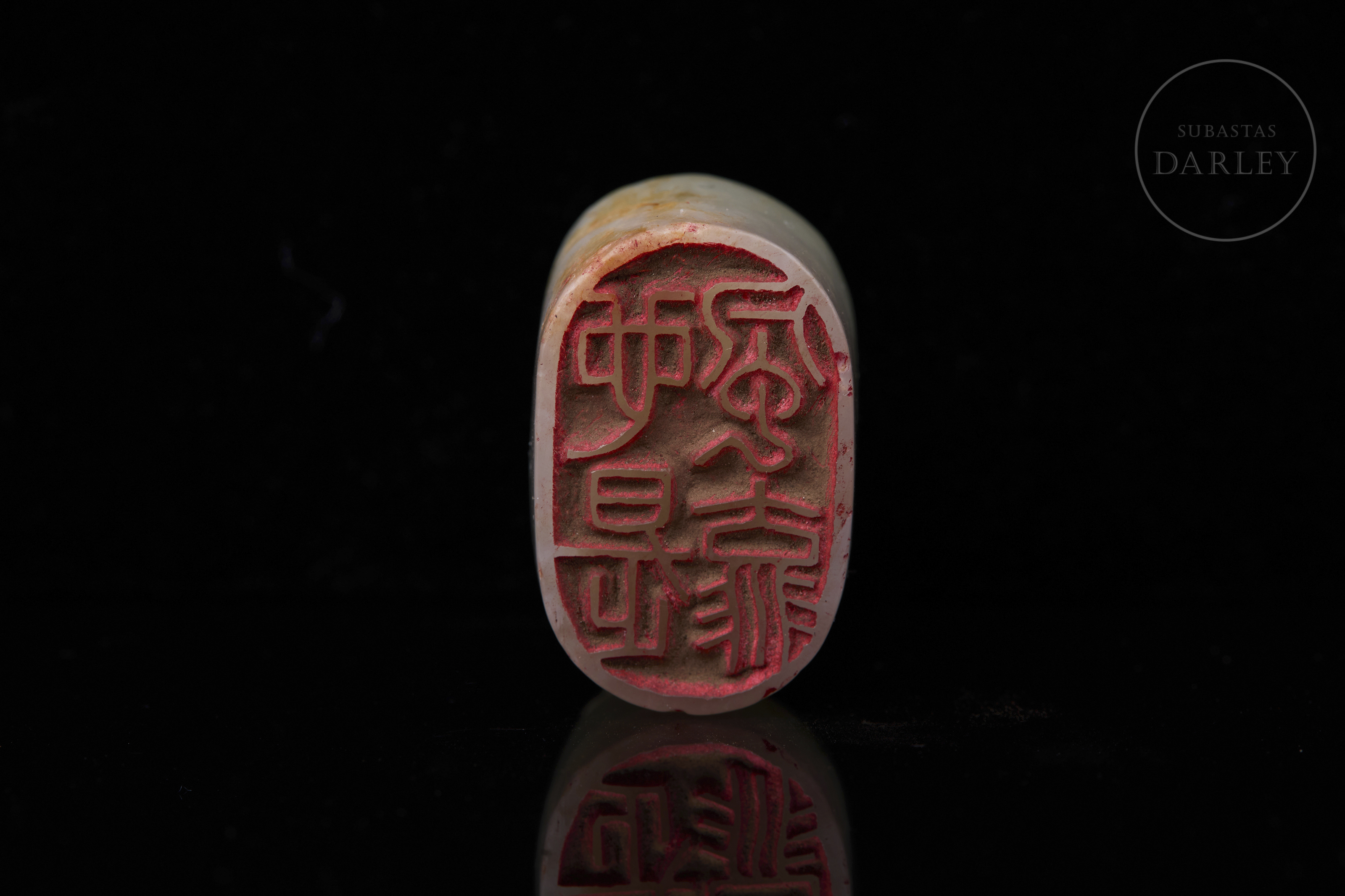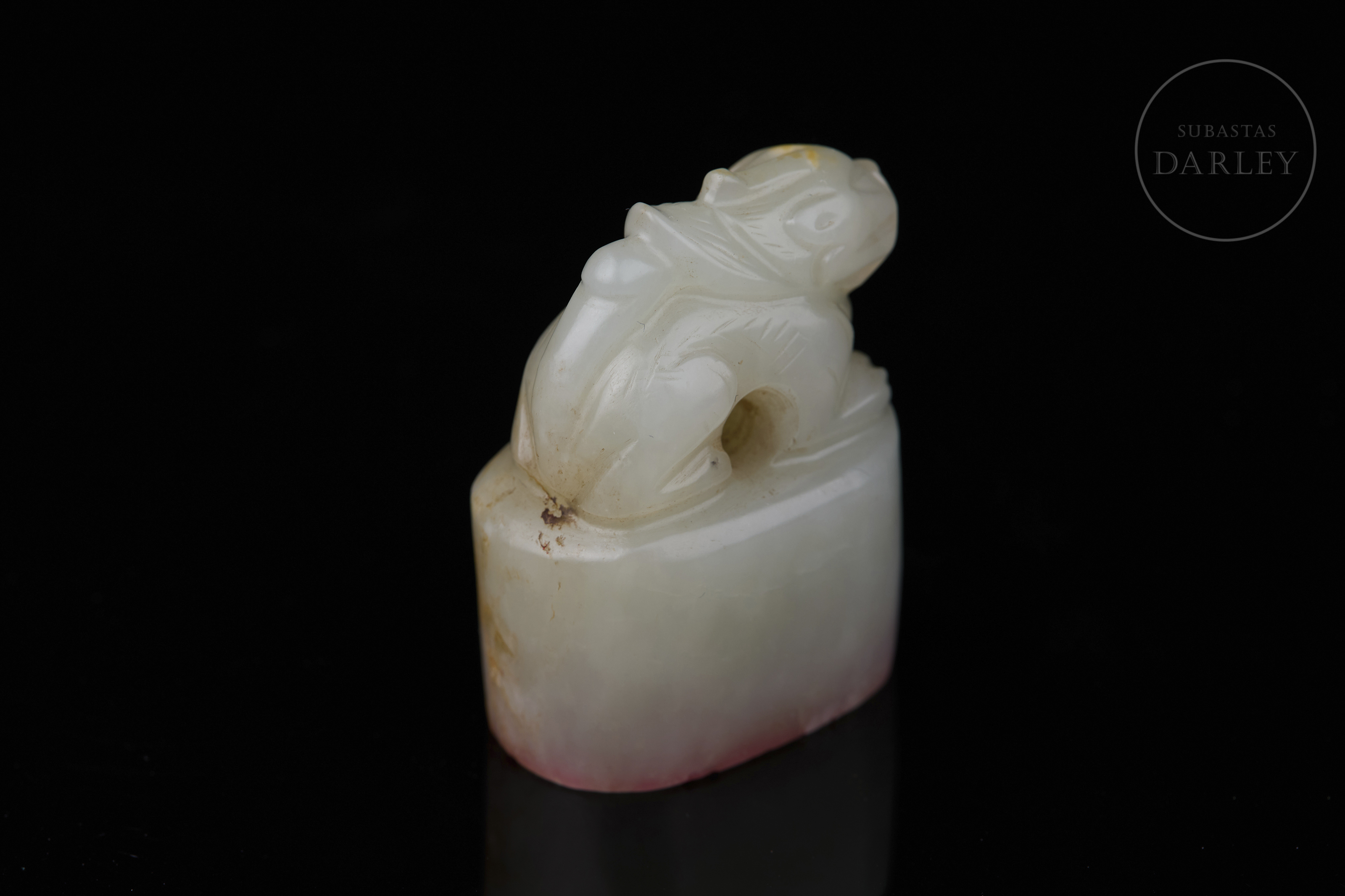 Sello tallado de jade de color blanco lechoso, con áreas de pátina de tonalidad ámbar. Muestra un remate en forma de bestia mítica en posición de alerta, con la cabeza recta, patas flexionadas y rasgos detallados. La base es lisa y ligeramente ovalada. La matriz muestra una inscripción "也是风流" grabada y restos de lacre. Dinastía Qing (1644–1912).