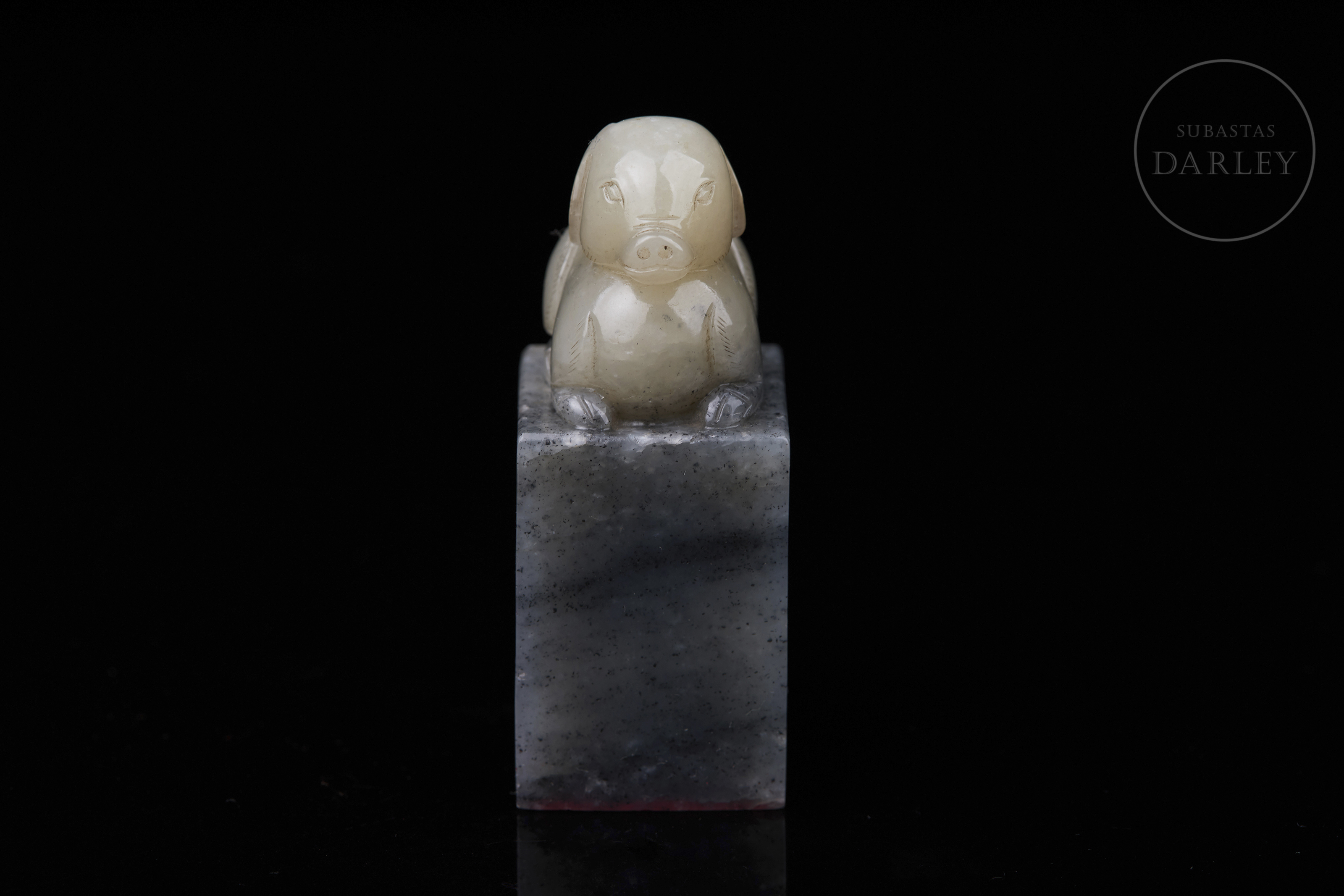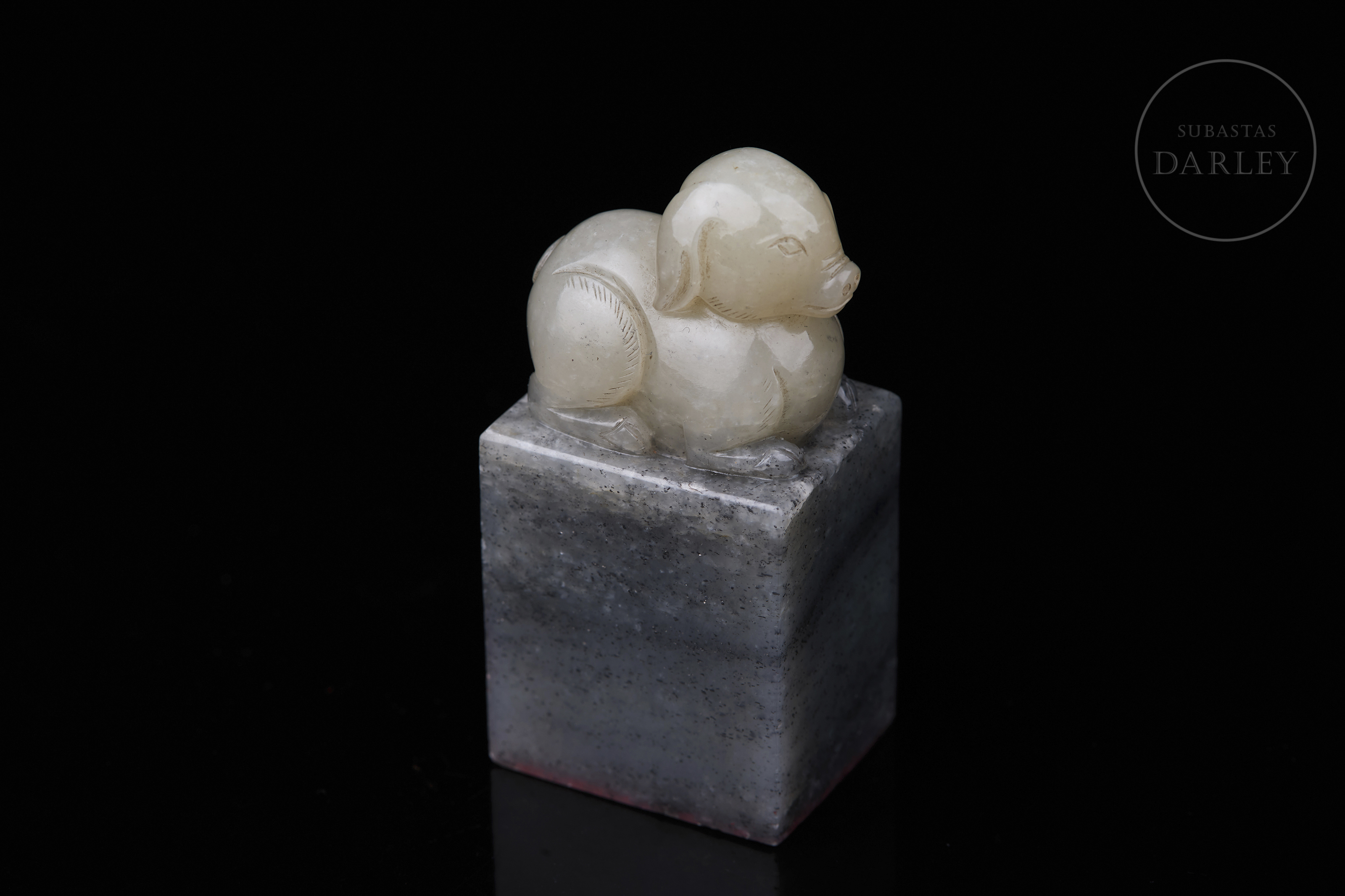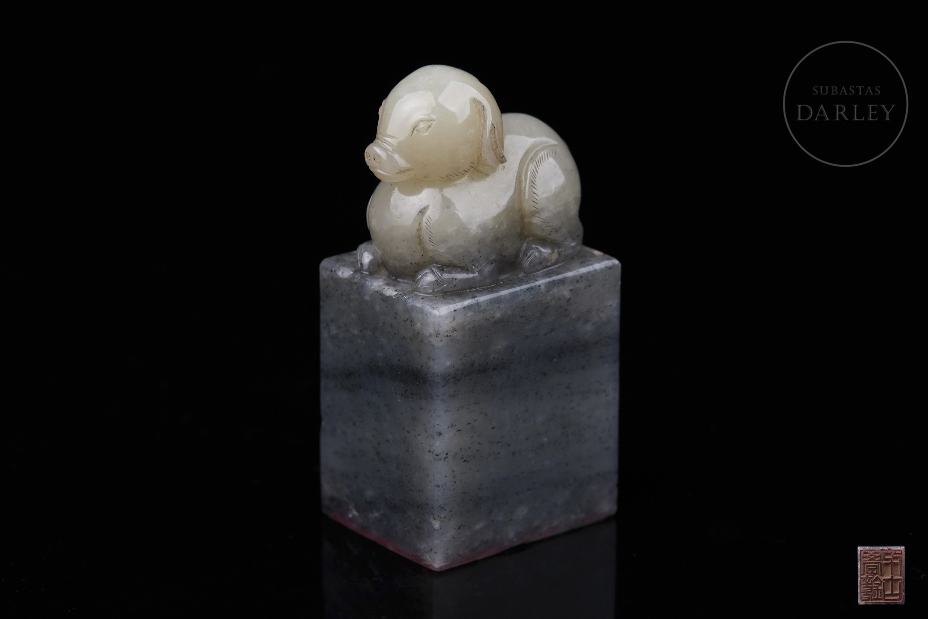Sello de jade de forma rectangular. Presenta un cerdito recostado con el cuerpo regordete y la cola enroscada. El color del jade es dual: la parte superior es de un tono blanco, mientras la zona inferior es de un color gris oscuro. La base muestra la inscripción "学镜千古". Dinastía Qing (1644–1912).