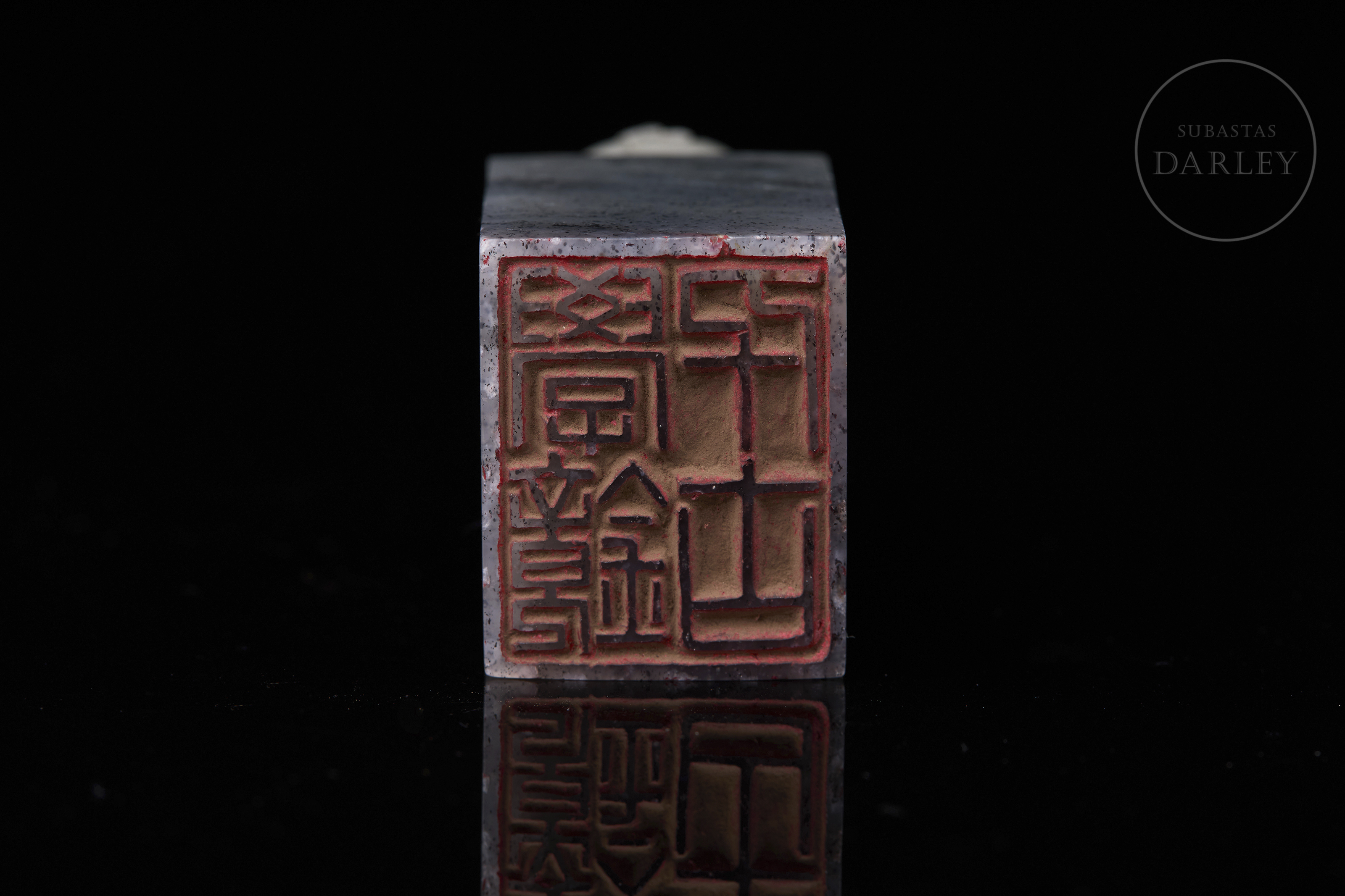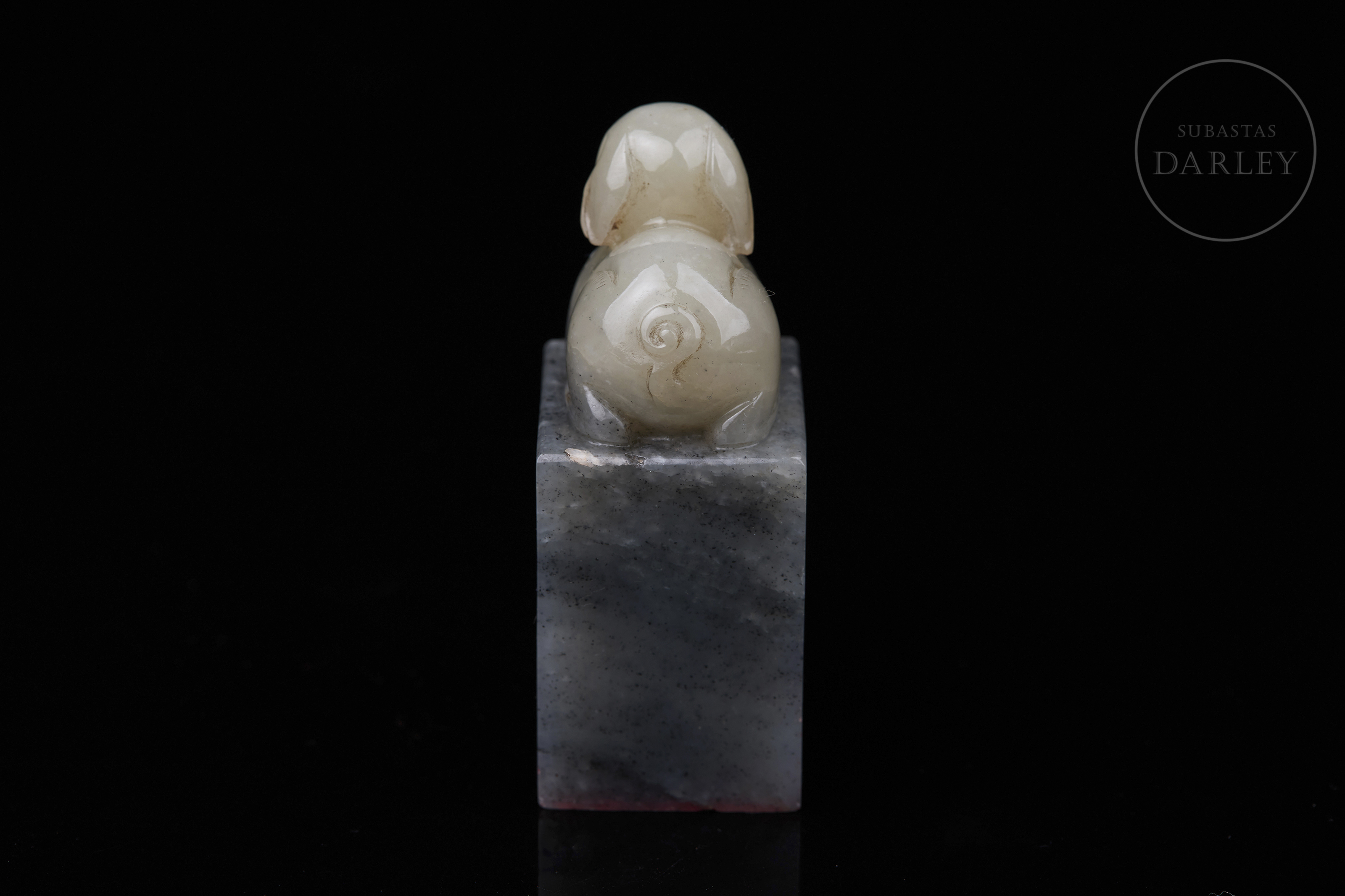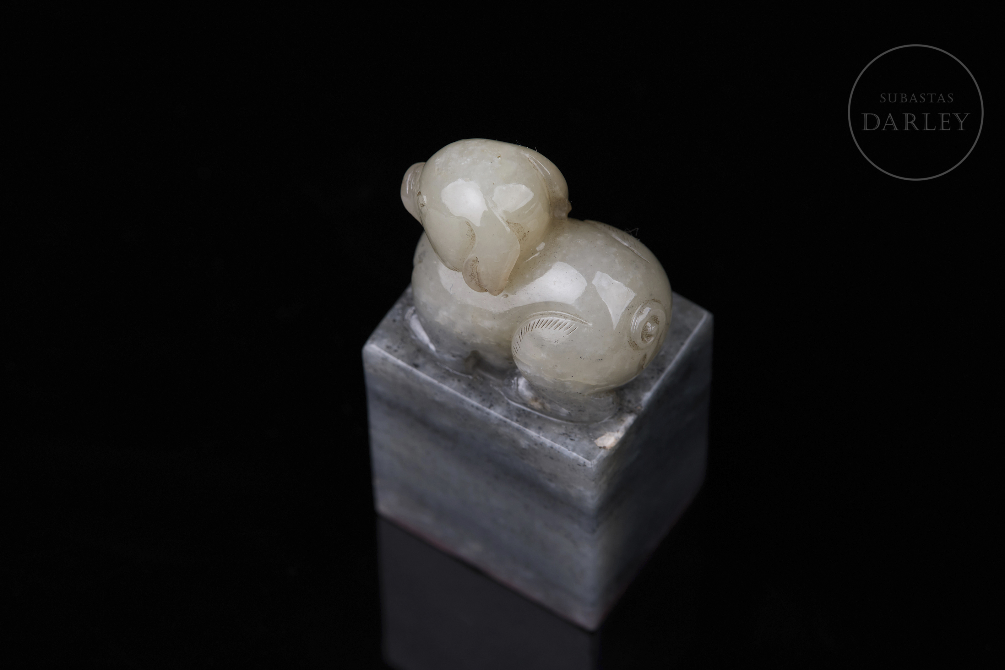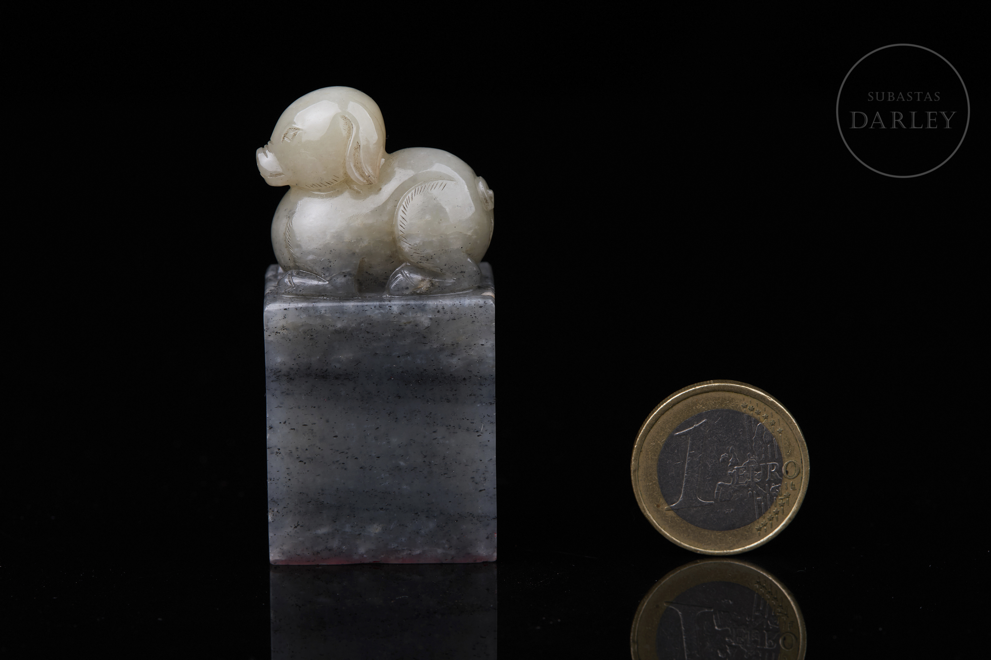 Sello de jade de forma rectangular. Presenta un cerdito recostado con el cuerpo regordete y la cola enroscada. El color del jade es dual: la parte superior es de un tono blanco, mientras la zona inferior es de un color gris oscuro. La base muestra la inscripción "学镜千古". Dinastía Qing (1644–1912).