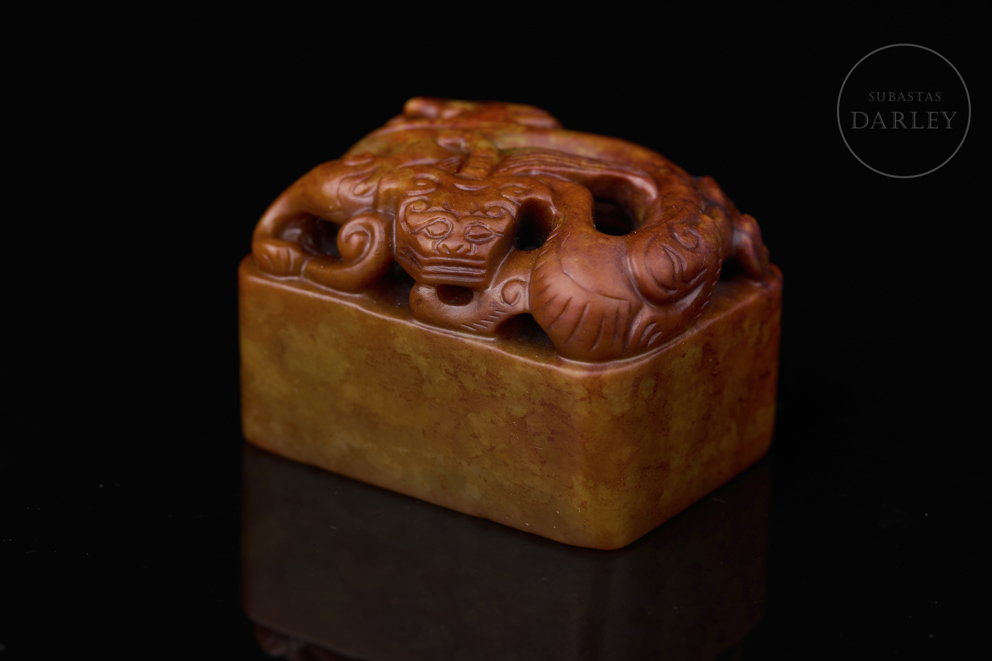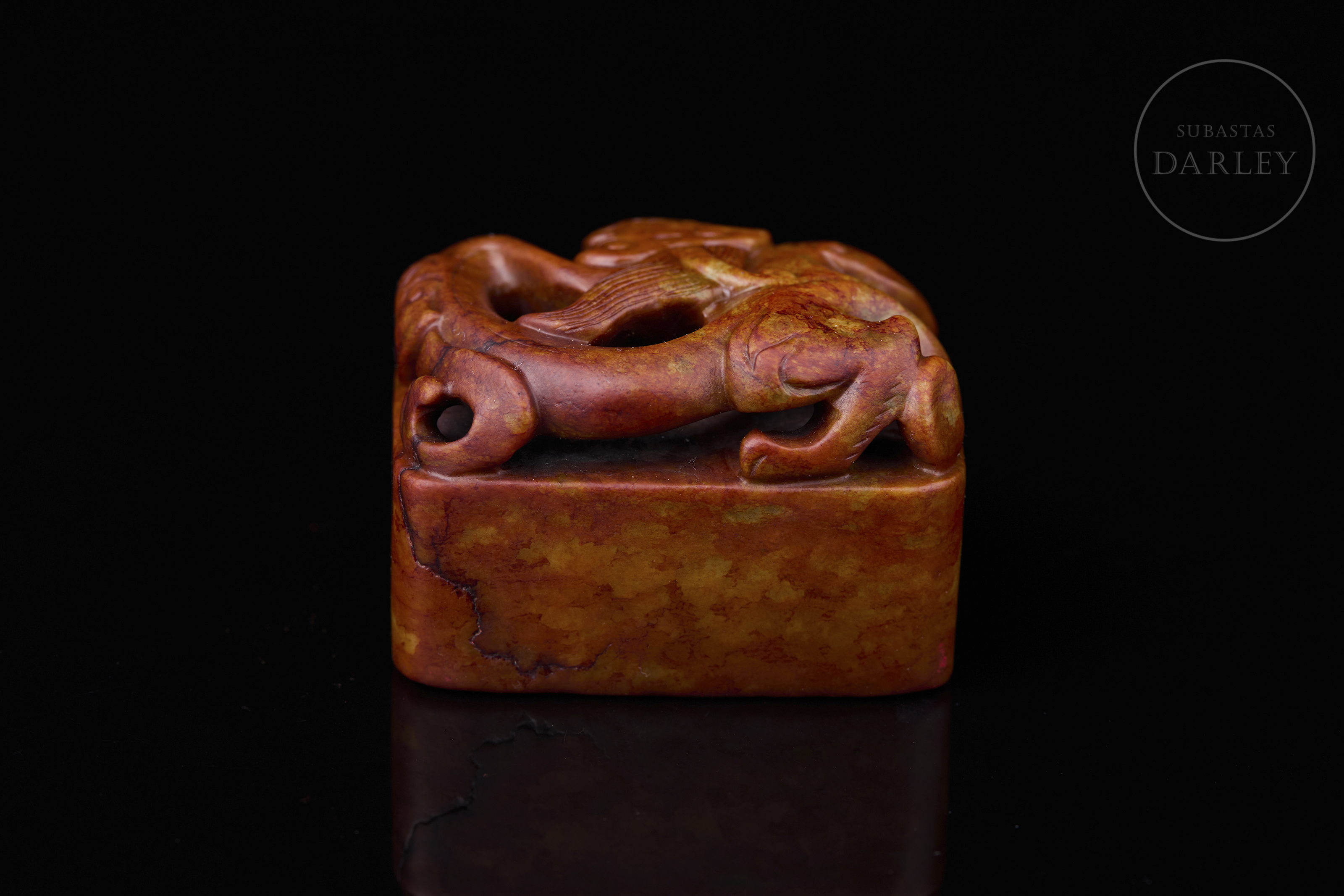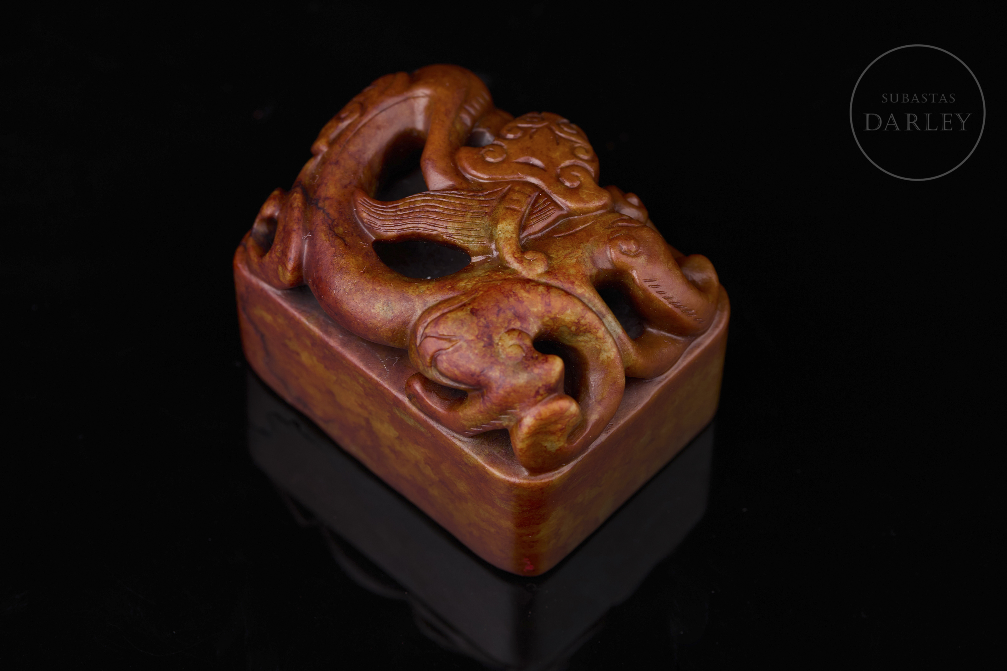 Sello tallado de jade de color marrón rojizo con vetas ámbar, y muestras de pátina. Muestra una base rectangular y robusta, coronado por un dragón estilizado, de sinuoso cuerpo enroscado, realizado con minucioso detalle que dibujan la crin, cuerno y musculatura mediante incisiones y detalles calados. En la base se dispone un el sello "御赐朗吟阁宝" inciso. Dinastía Qing (1644-1912).