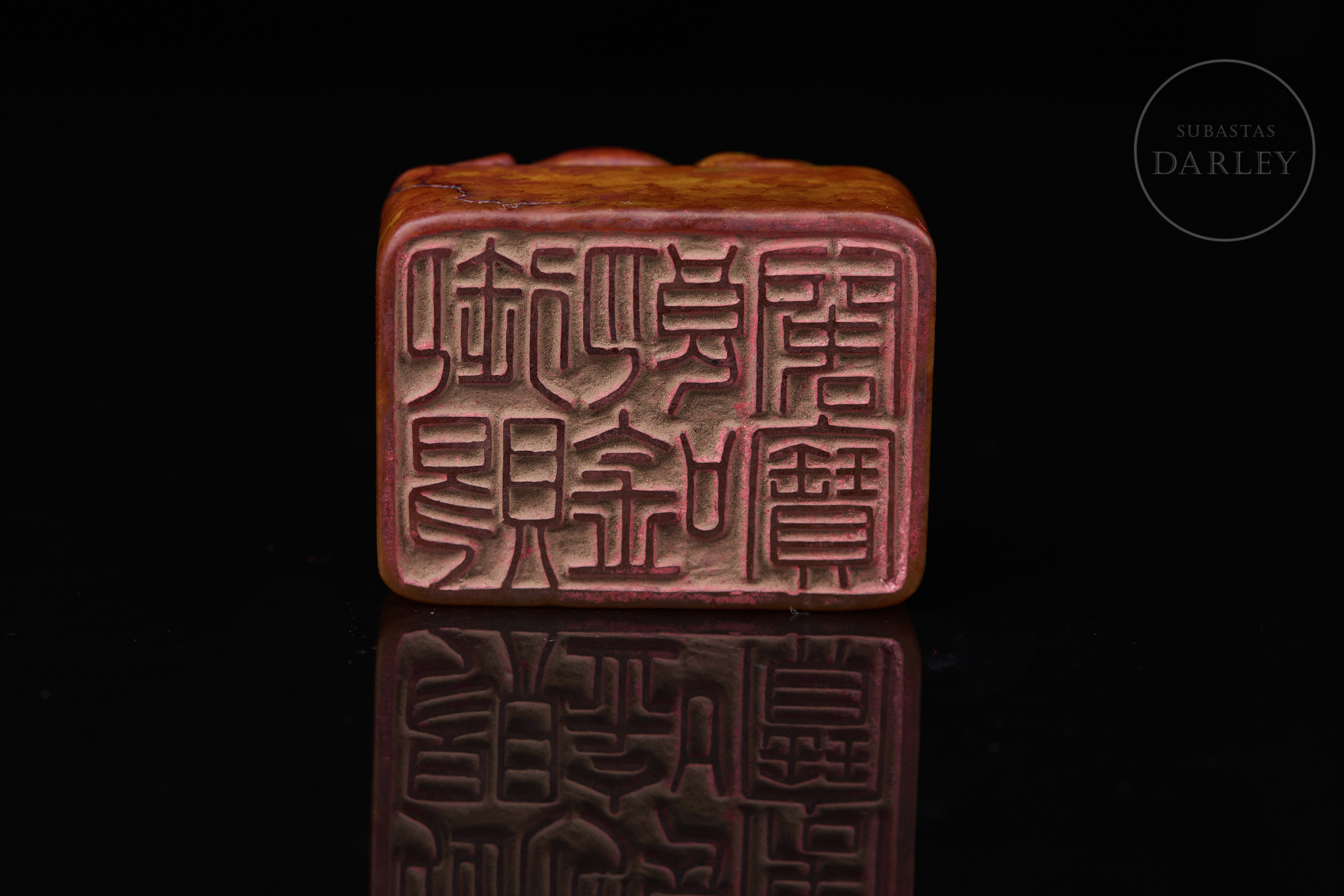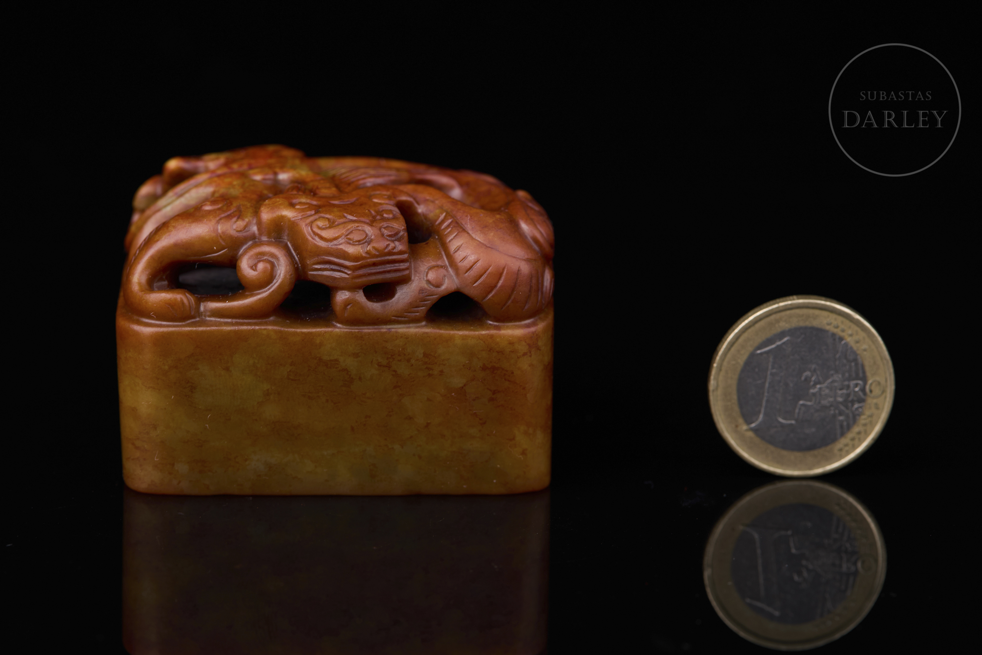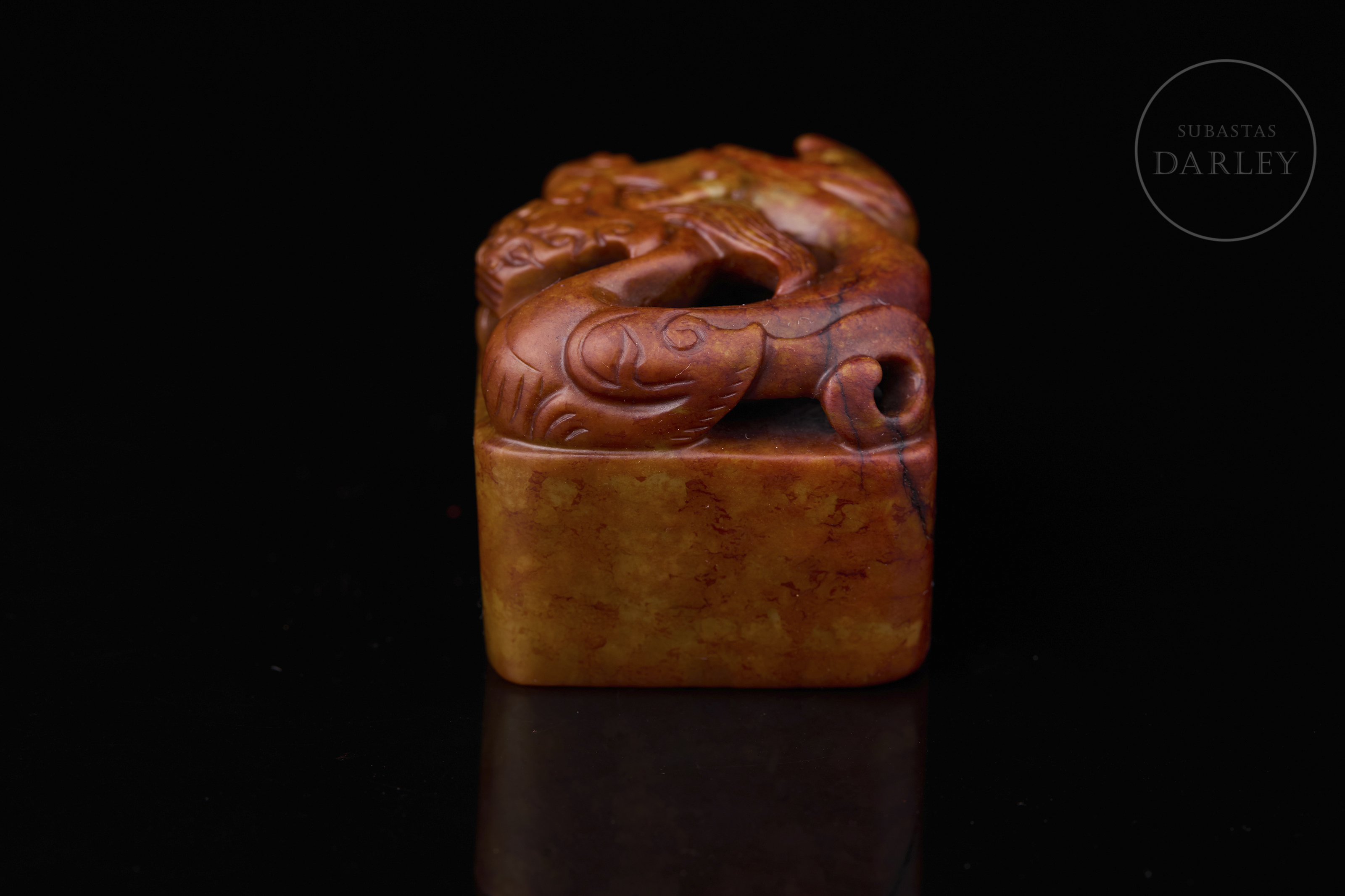 Sello tallado de jade de color marrón rojizo con vetas ámbar, y muestras de pátina. Muestra una base rectangular y robusta, coronado por un dragón estilizado, de sinuoso cuerpo enroscado, realizado con minucioso detalle que dibujan la crin, cuerno y musculatura mediante incisiones y detalles calados. En la base se dispone un el sello "御赐朗吟阁宝" inciso. Dinastía Qing (1644-1912).