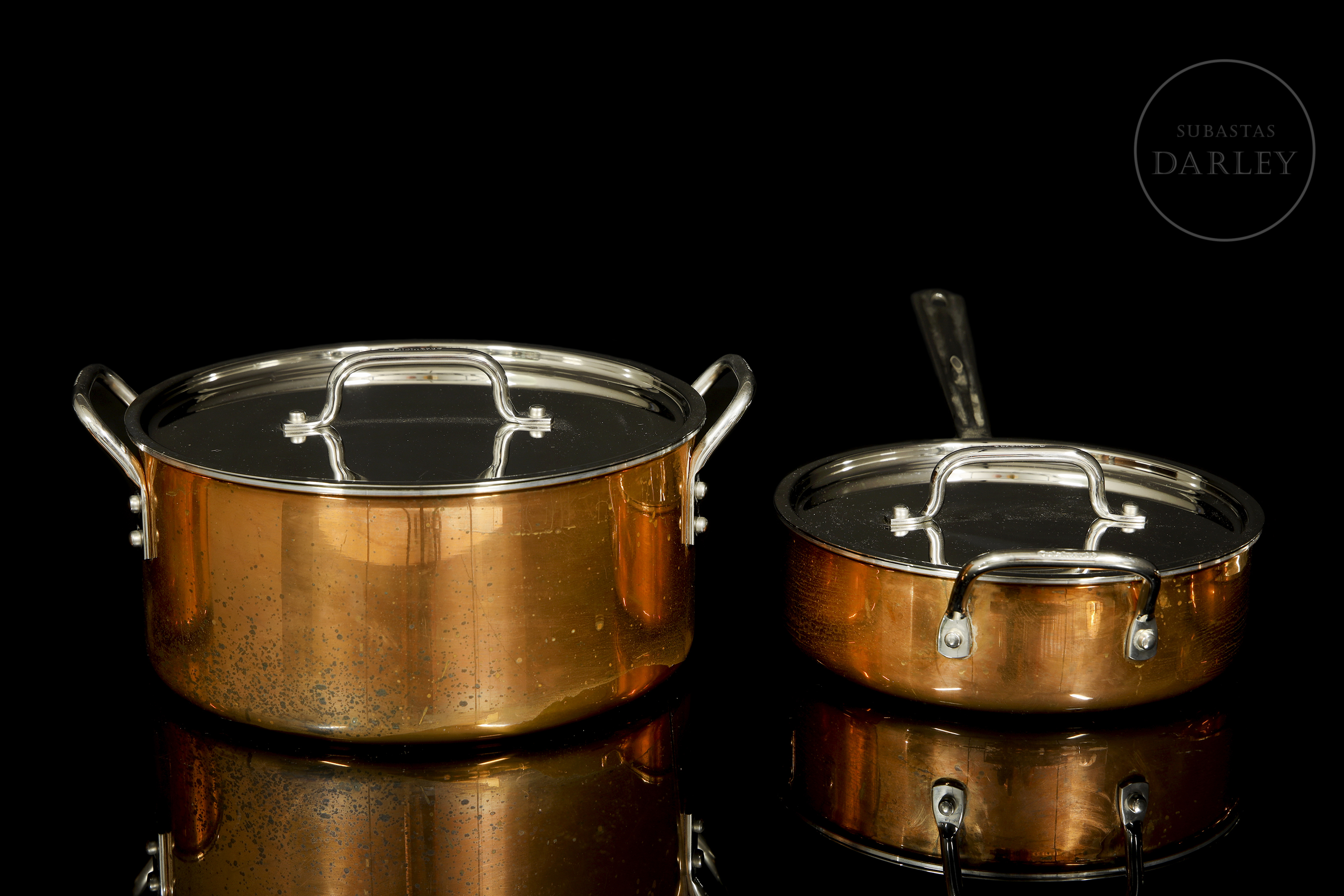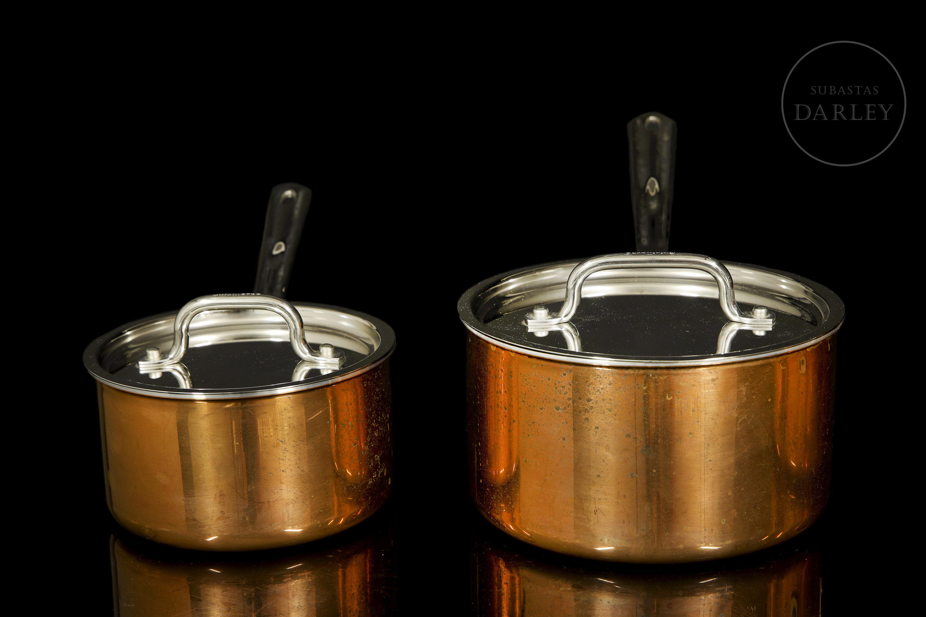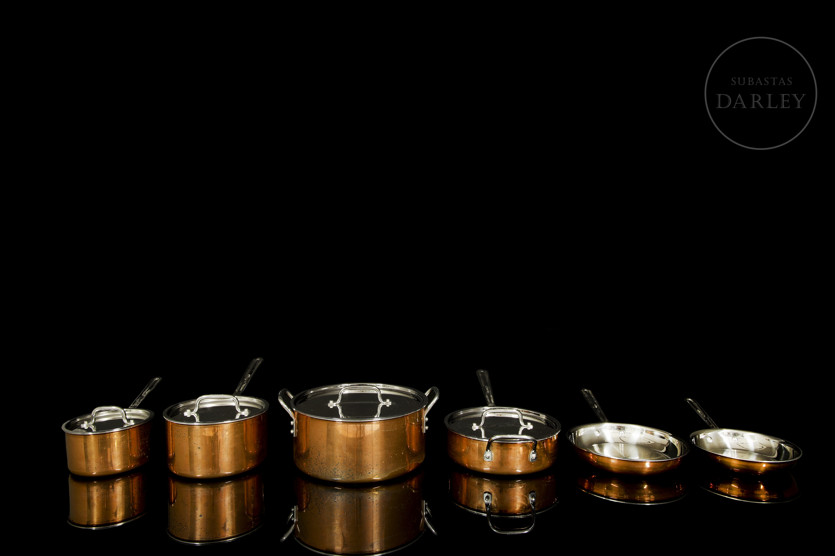 Juego de cocina compuesto por seis piezas de cobre de diversos tamaños. Con indicaciones de marca, modelo y fabricación en su base "Cuisinart[...] Korea". También podemos identificar la inscripción de la marca en la unión entre asa y cuerpo. Presentan ligero desgaste en la base, encontrándose el interior de las piezas en perfecto estado e identificando cierto desgaste interno en solo uno de los cazos.