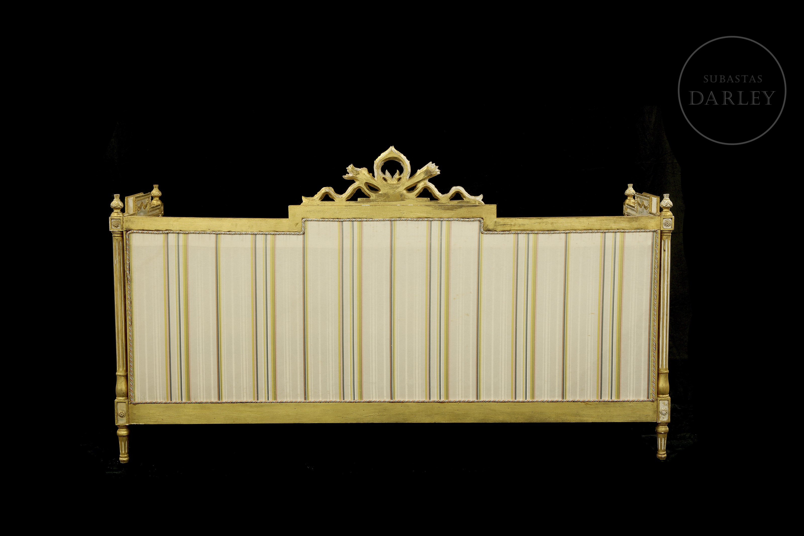 Madera tallada y dorada con tapicería de seda. El diseño integra diversos elementos decorativos siguiendo los dictados del estilo Luis XVI. La estructura de madera dorada, está rematada por un copete central, flanqueada por guirnaldas de flores. Los reposabrazos, rectos y acanalados, terminan en dados decorados con rosetas sobre patas en gaine con estrías.
