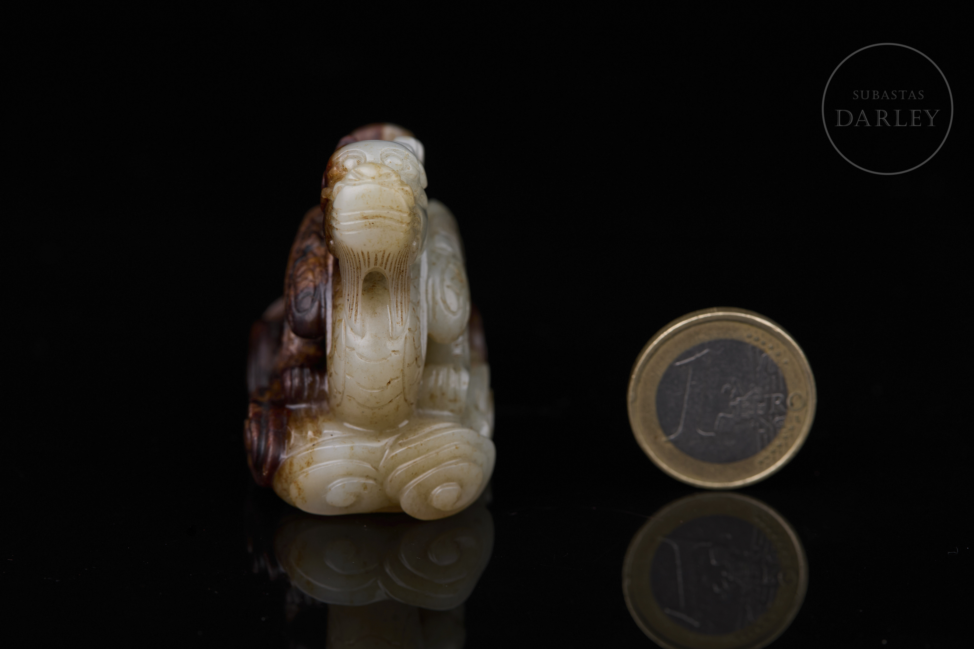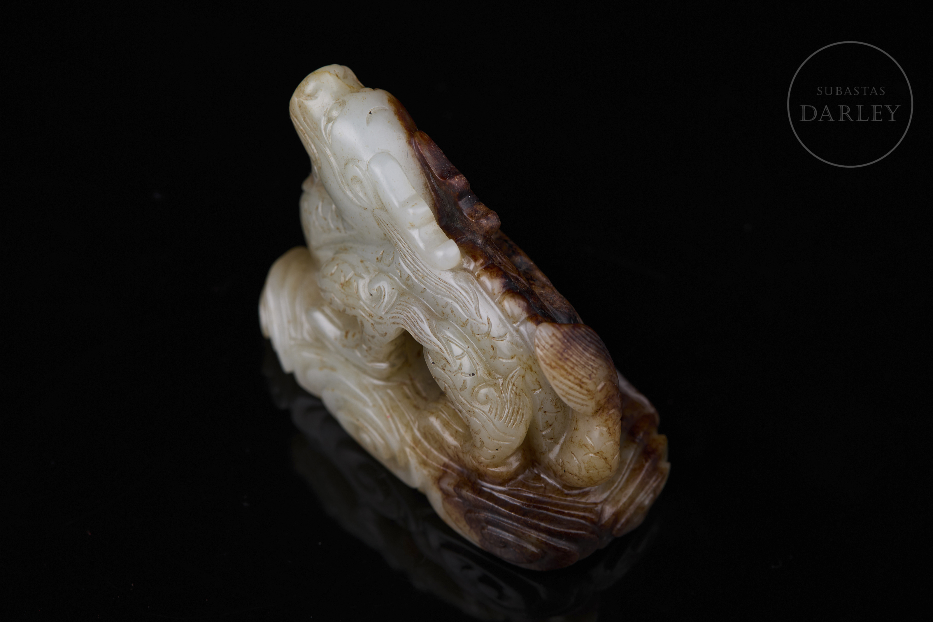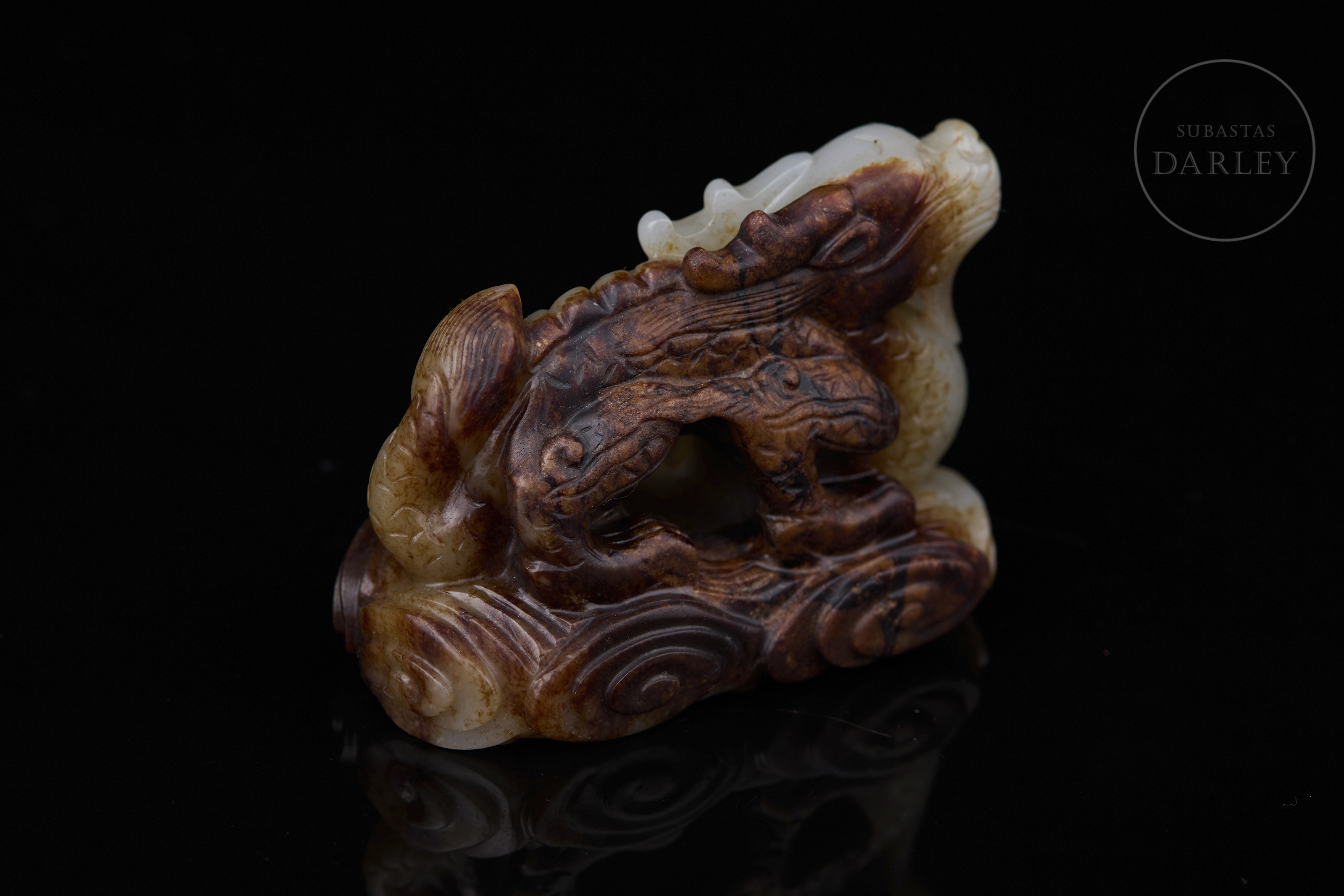 Figura tallado de jade blanco, con áreas de pátina marrón y ámbar. Muestra una base rectangular de perfil lobulado y nubes en relieve, sobre la que se dispone un imponente dragón erguido, de cuerpo sinuoso y escamado, con la cabeza alzada hacia el cielo, coronada por una larga cornamenta. Dinastía Qing (1644-1912).