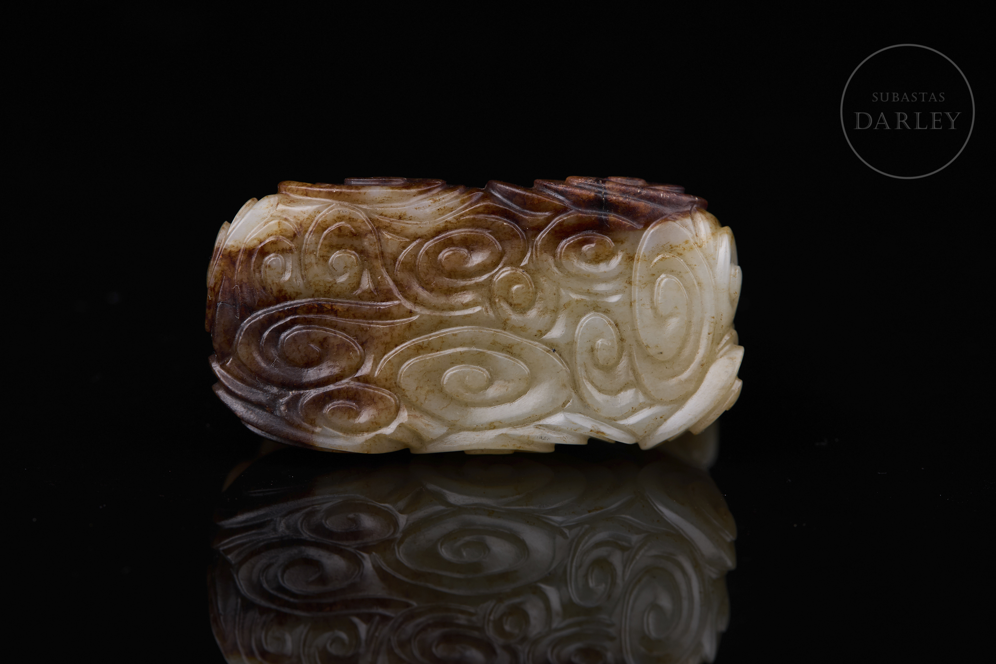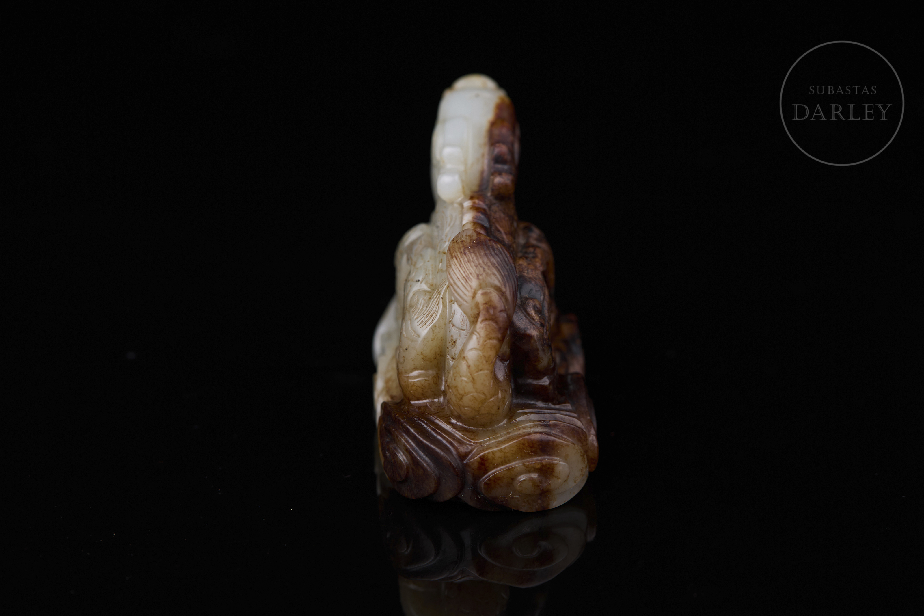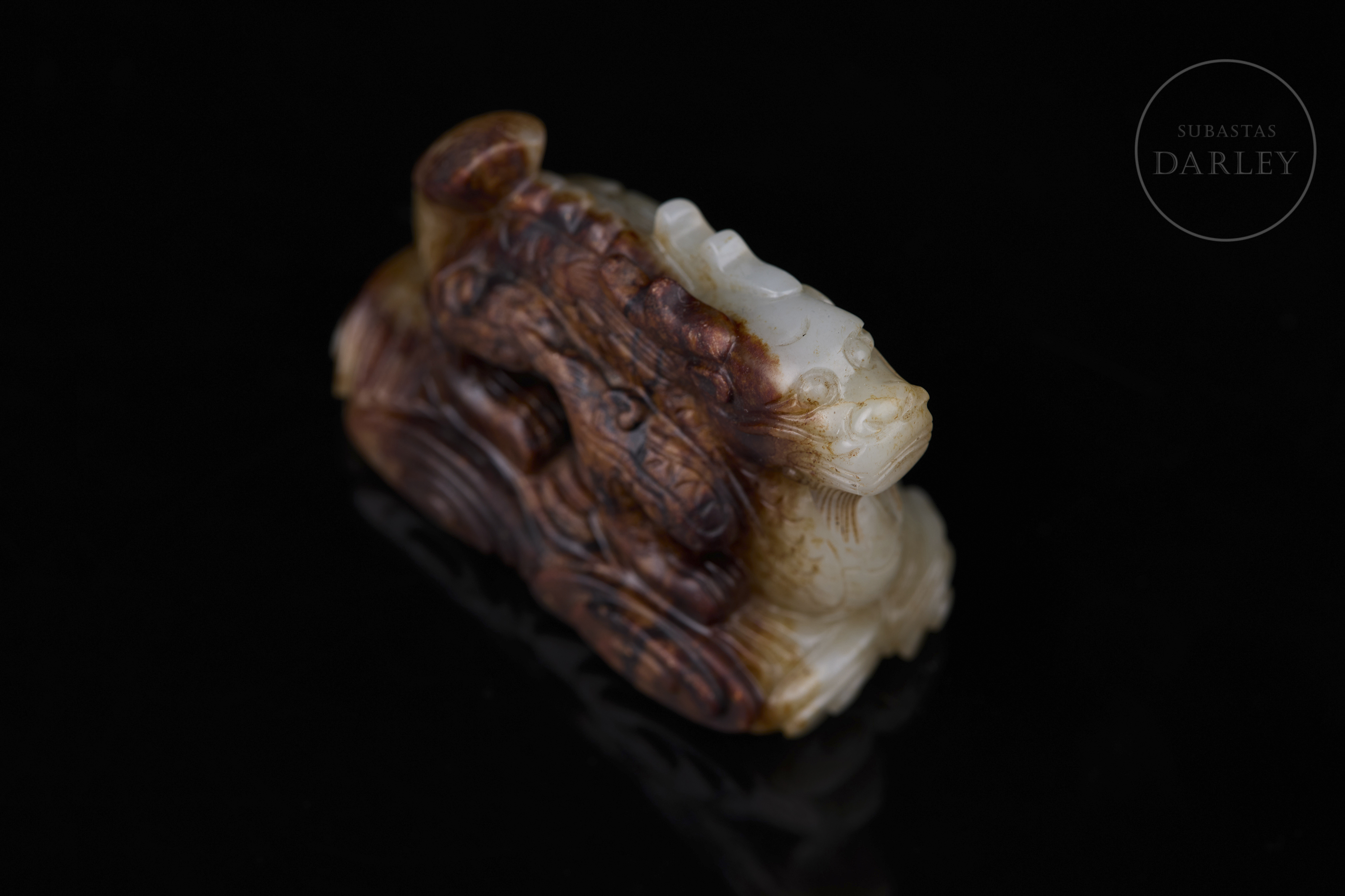 Figura tallado de jade blanco, con áreas de pátina marrón y ámbar. Muestra una base rectangular de perfil lobulado y nubes en relieve, sobre la que se dispone un imponente dragón erguido, de cuerpo sinuoso y escamado, con la cabeza alzada hacia el cielo, coronada por una larga cornamenta. Dinastía Qing (1644-1912).