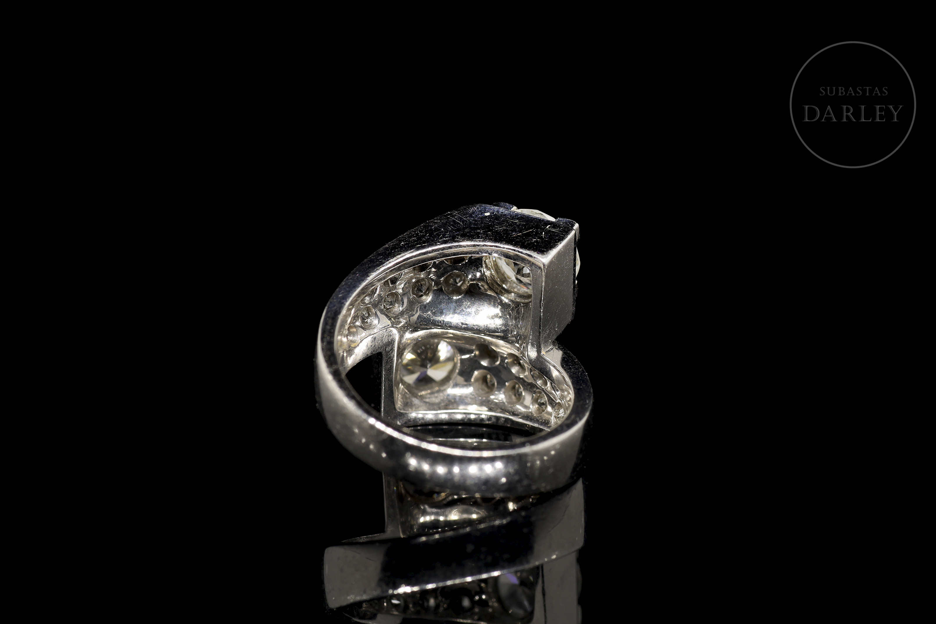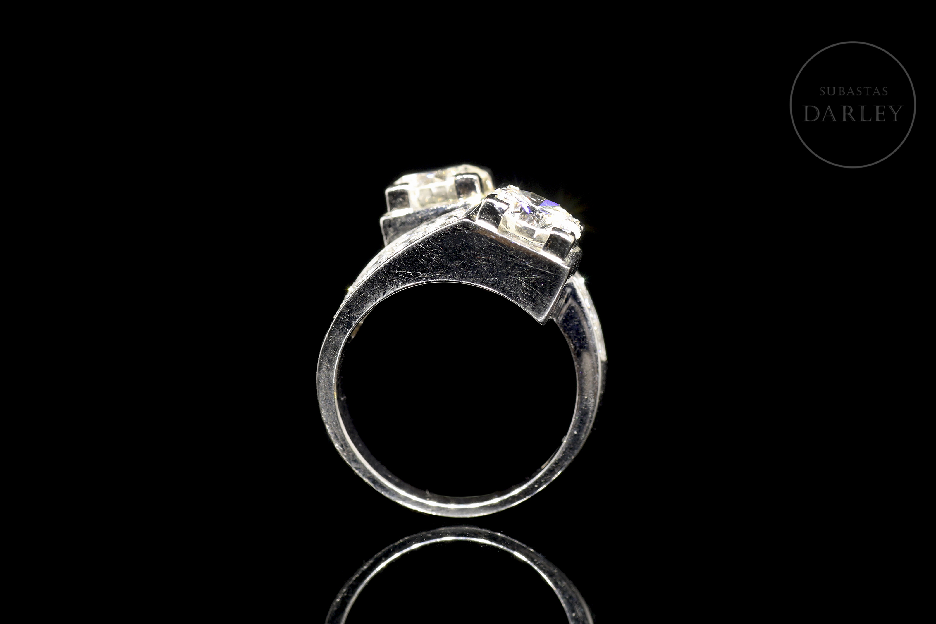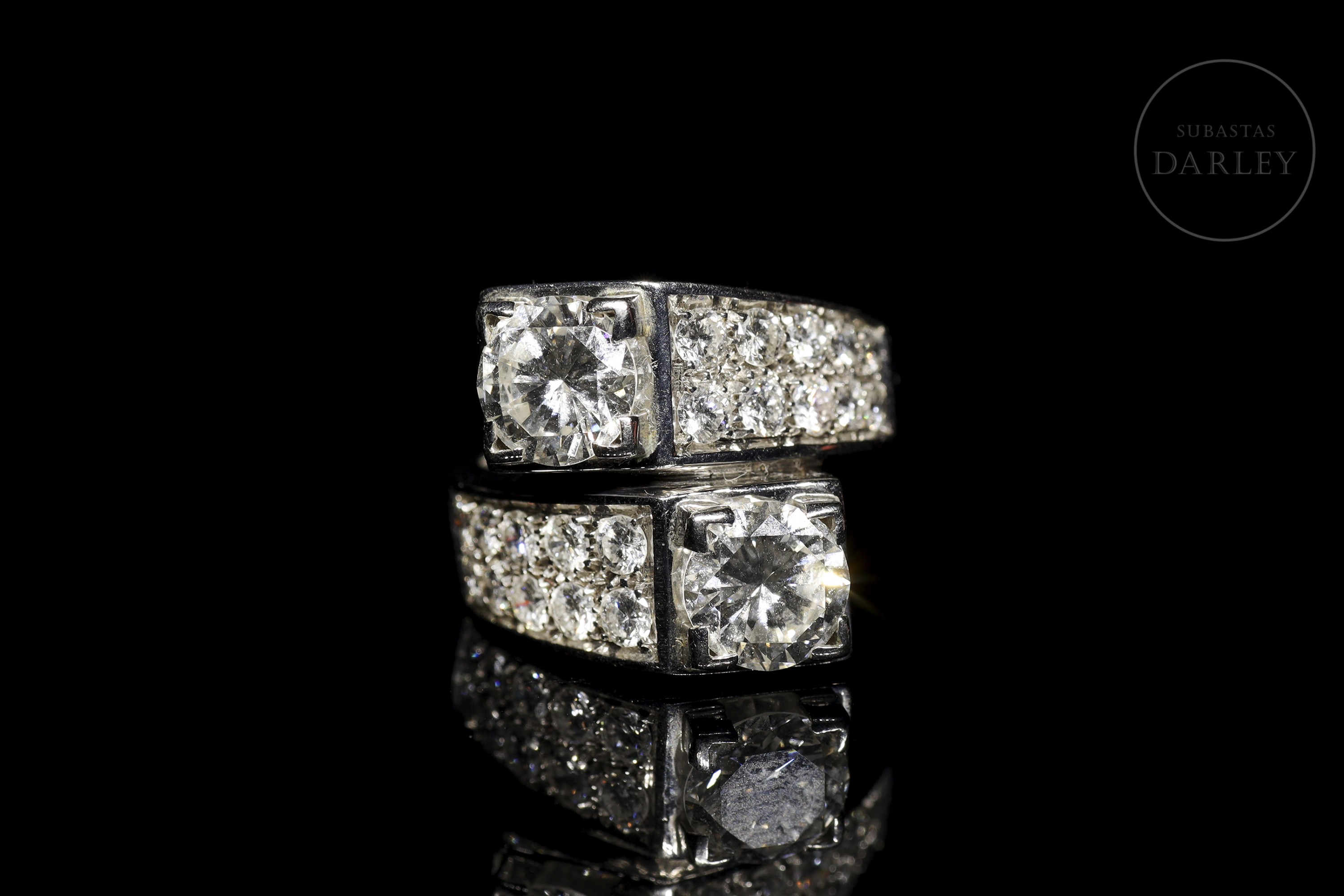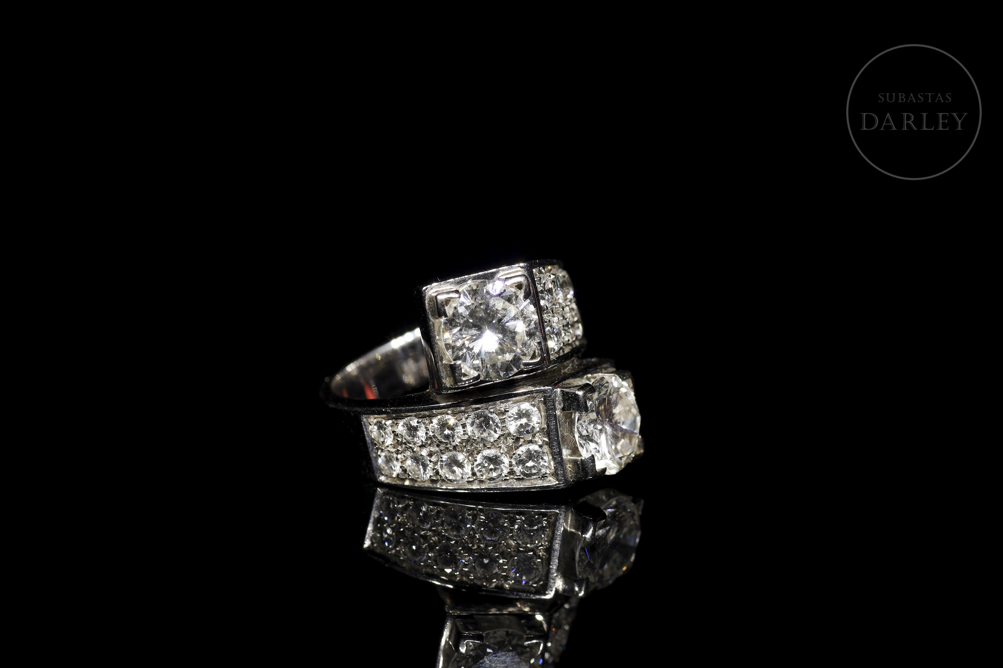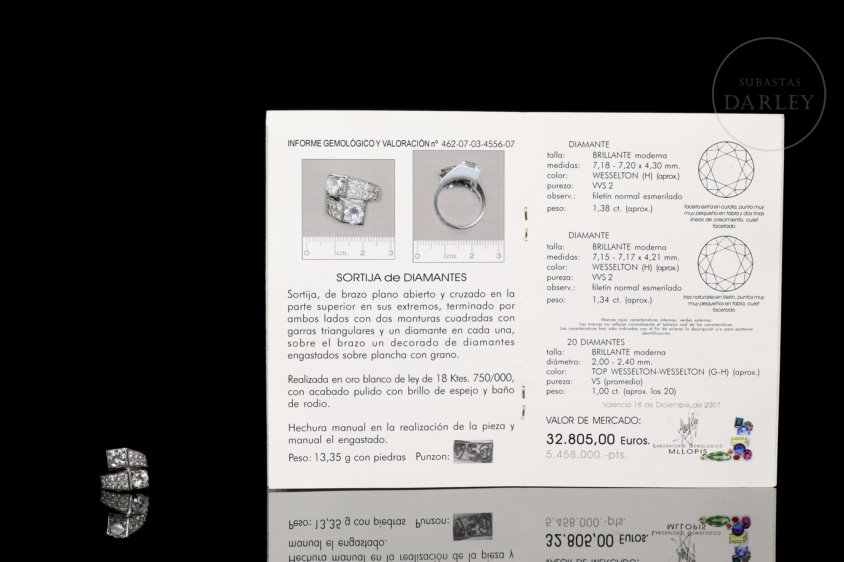 Sortija de diseño moderno, de brazo plano cruzado en la parte superior y abierto en los extremos, cada uno rematado por un diamante talla brillante, engastado en garras angulares. Los diamantes centrales, de 1,38 ct y 1,34 ct respectivamente, color (H) y pureza VVS2, se acompañan de veinte diamantes adicionales de menor tamaño (aprox. 1 ct total) dispuestos en pavé a ambos lados del brazo. Realizada en oro blanco de 18 k.
