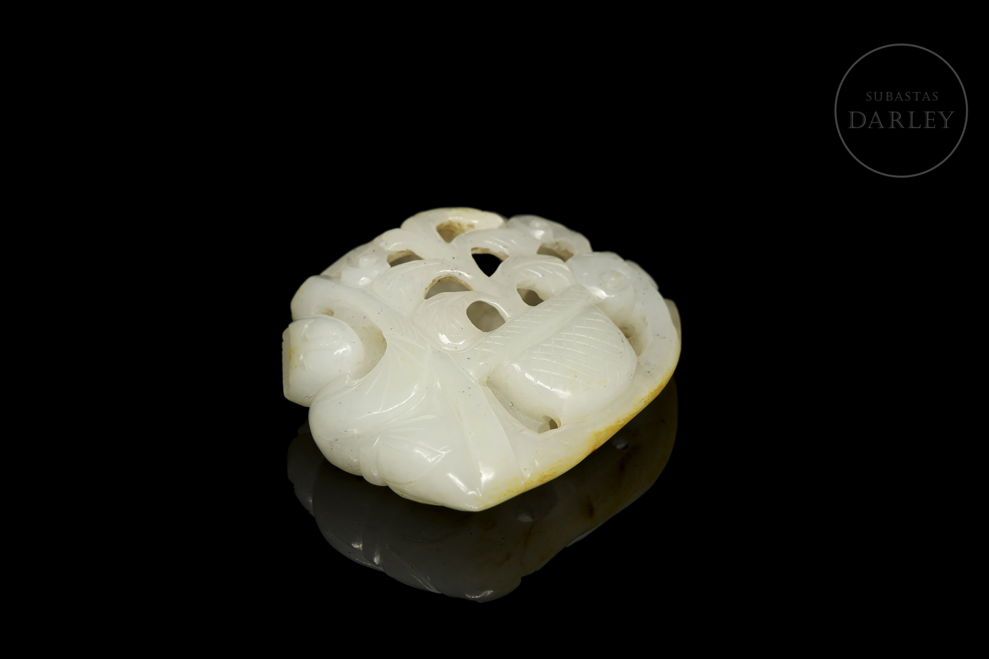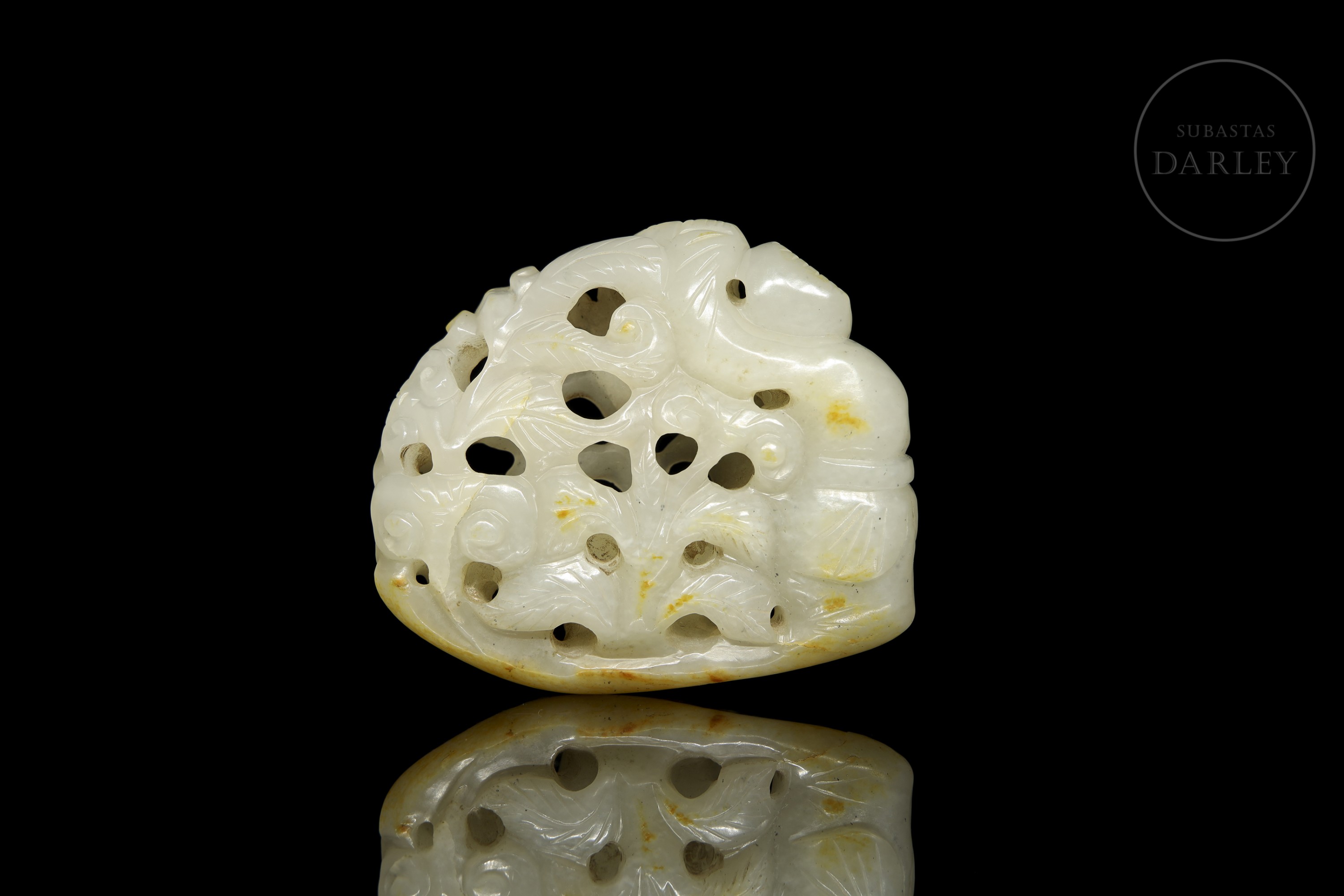 Figura tallada en jade blanco de tonos marfileños, representando a un personaje sosteniendo una gran maceta con follaje. El trabajo en celosía, con múltiples calados, otorga dinamismo a la pieza. El jade presenta vetas naturales y ligeras pátinas de oxidación superficial. Qing Dynasty (1644–1912)