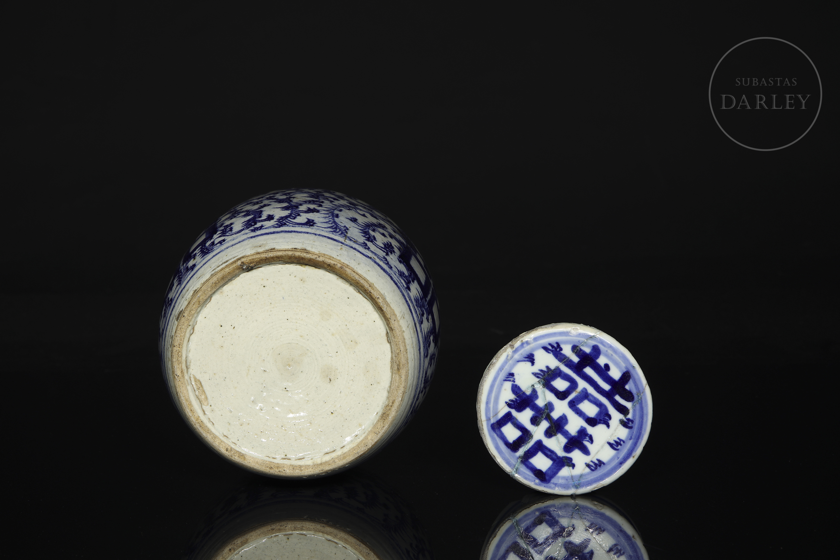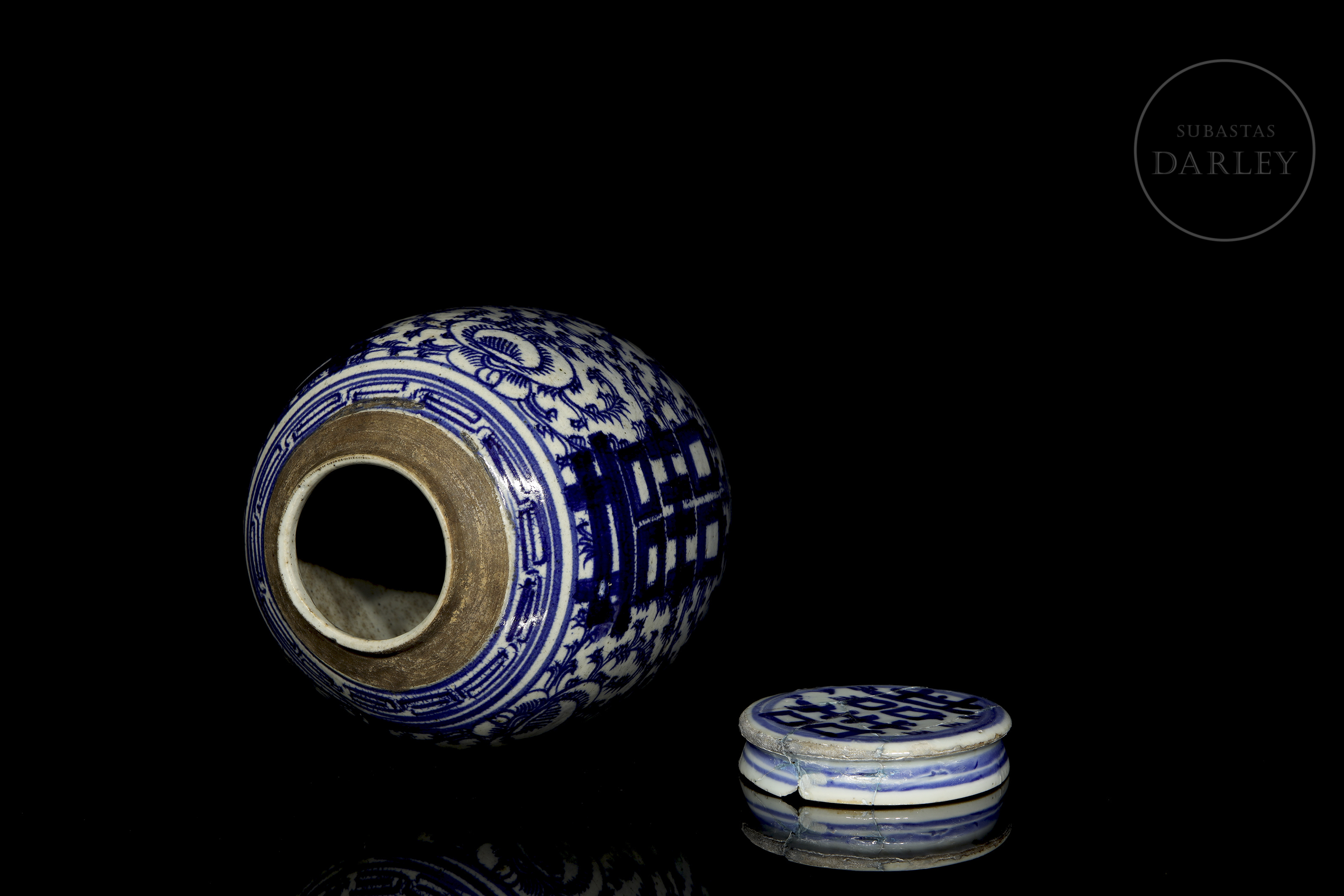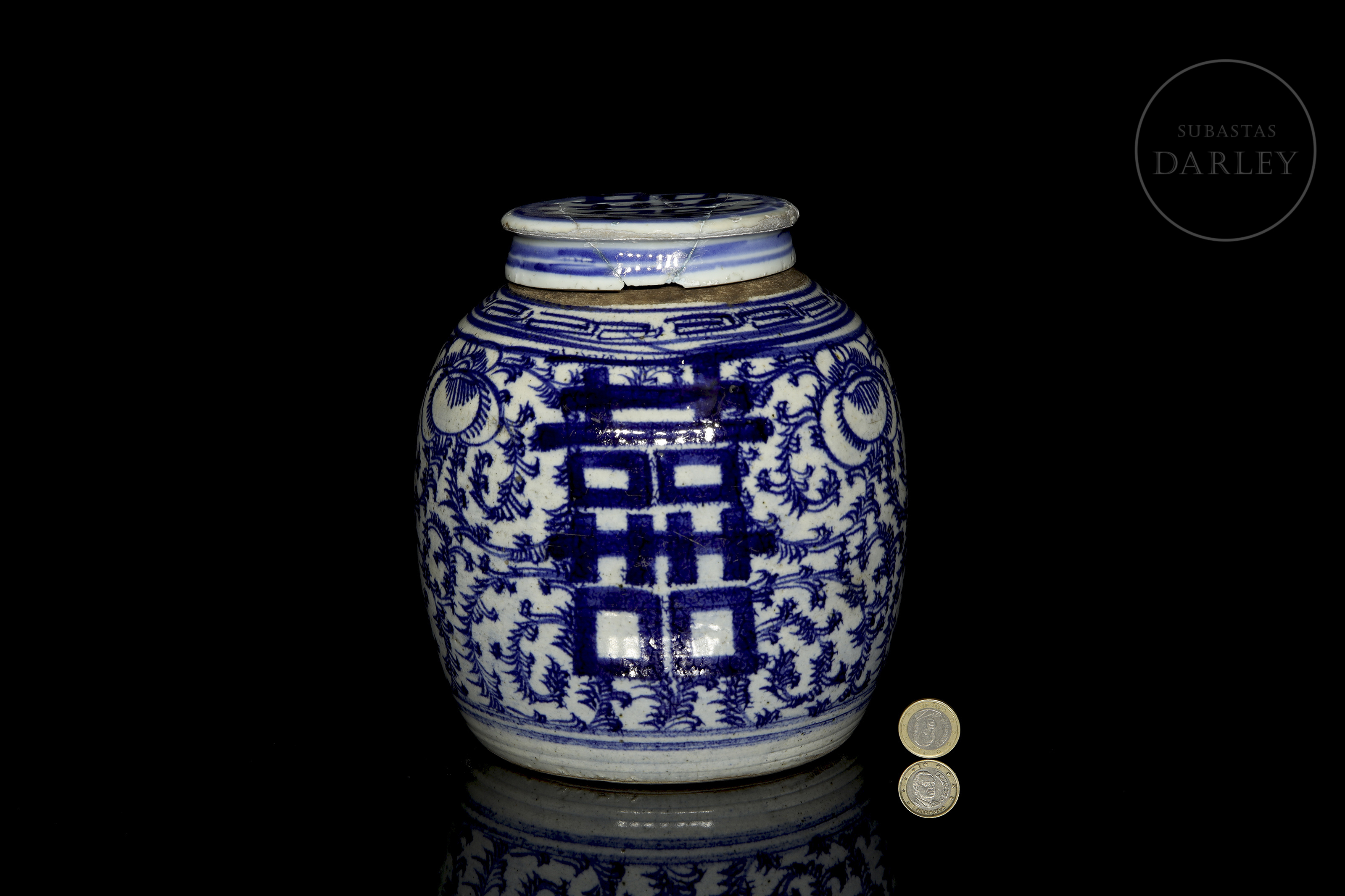 Porcelana esmaltada con decoración bajo vidriado de color blanco y azul cobalto. Posee un cuerpo globular, con cuello corto y estrecho y tapa a juego (restaurada). La decoración consiste en un ramaje floral continuo sobre el que se superponen cuatro grandes caracteres "囍". La base vidriada en blanco no muestra marca visible. Dinastía Qing (1644-1912).