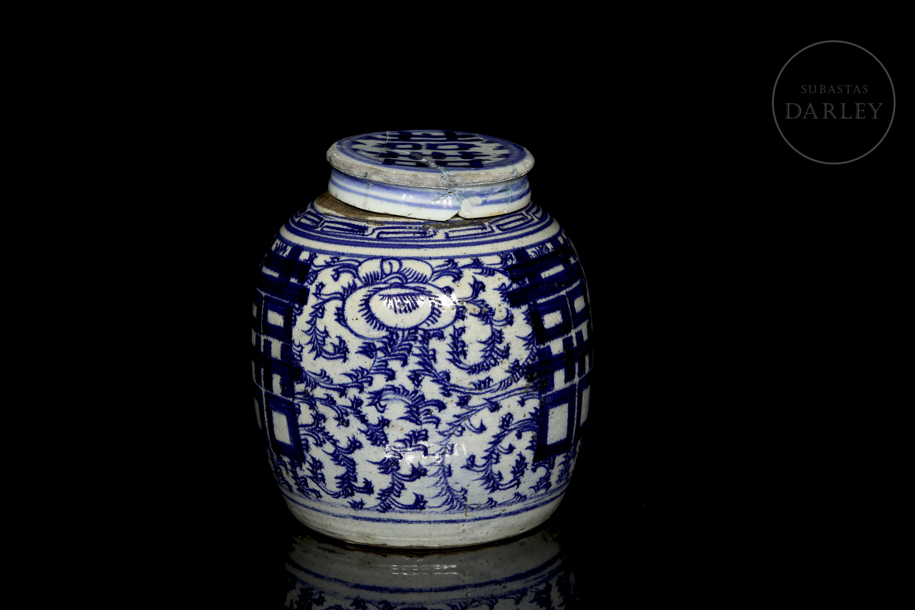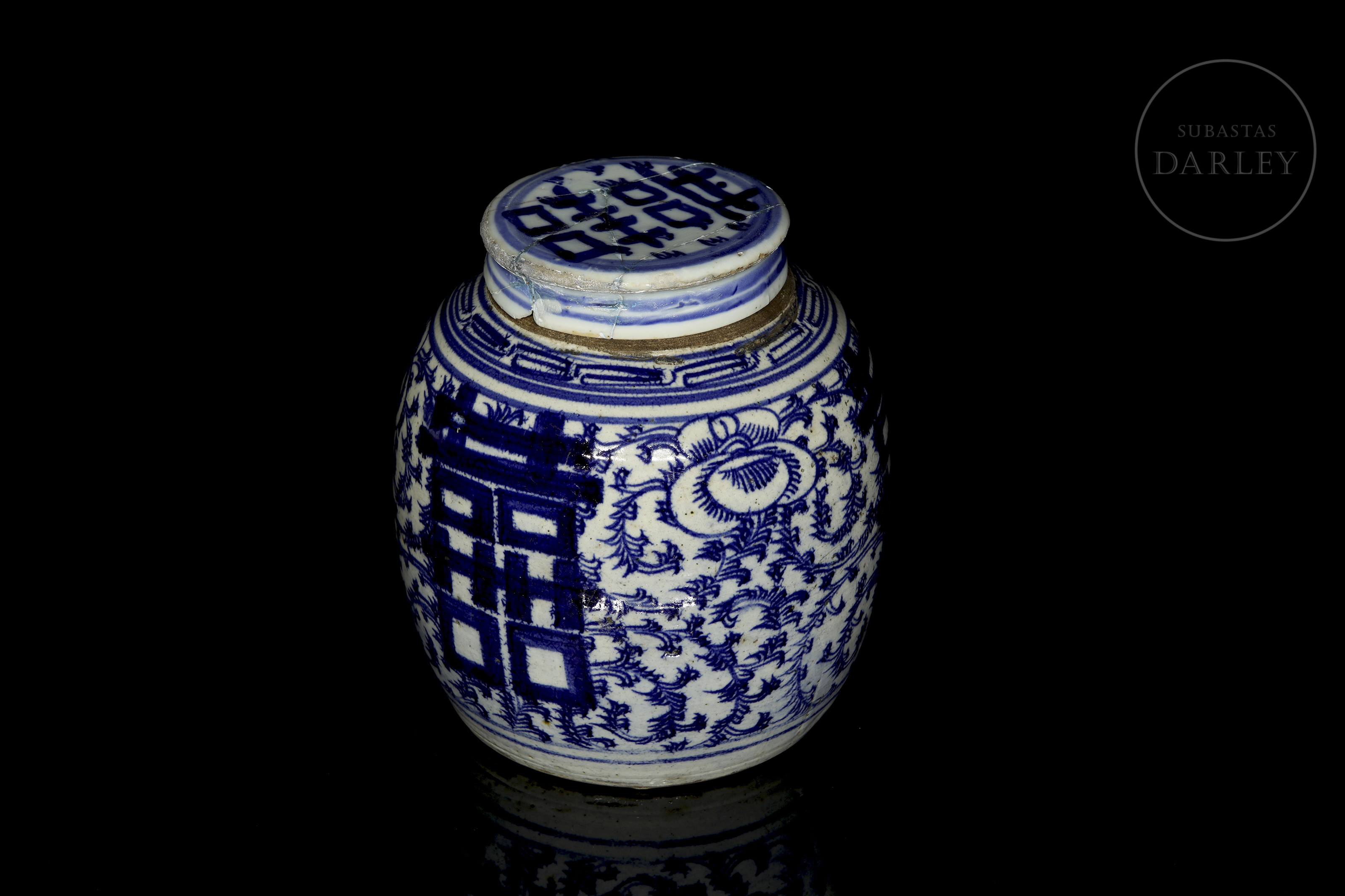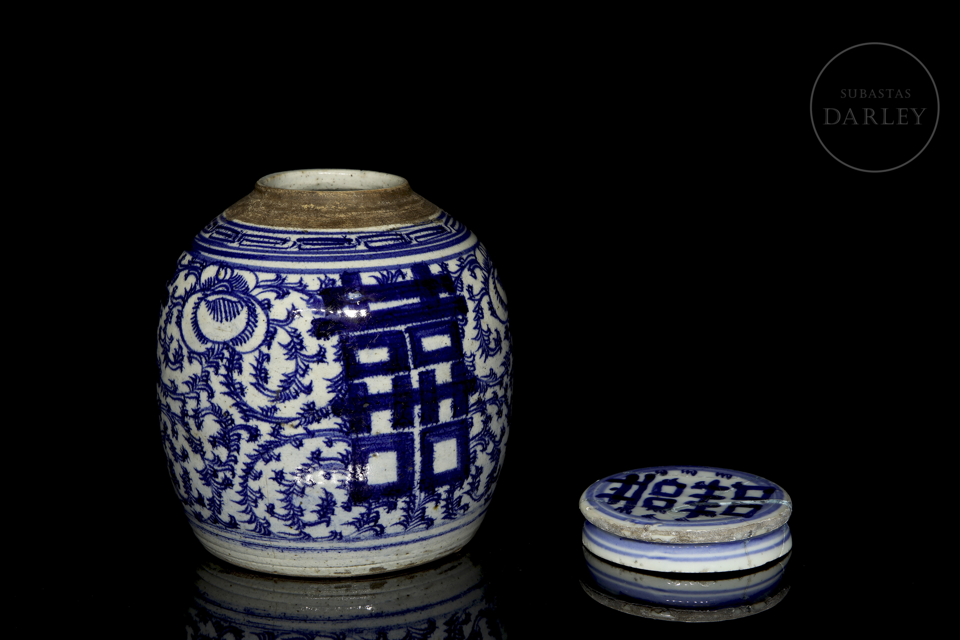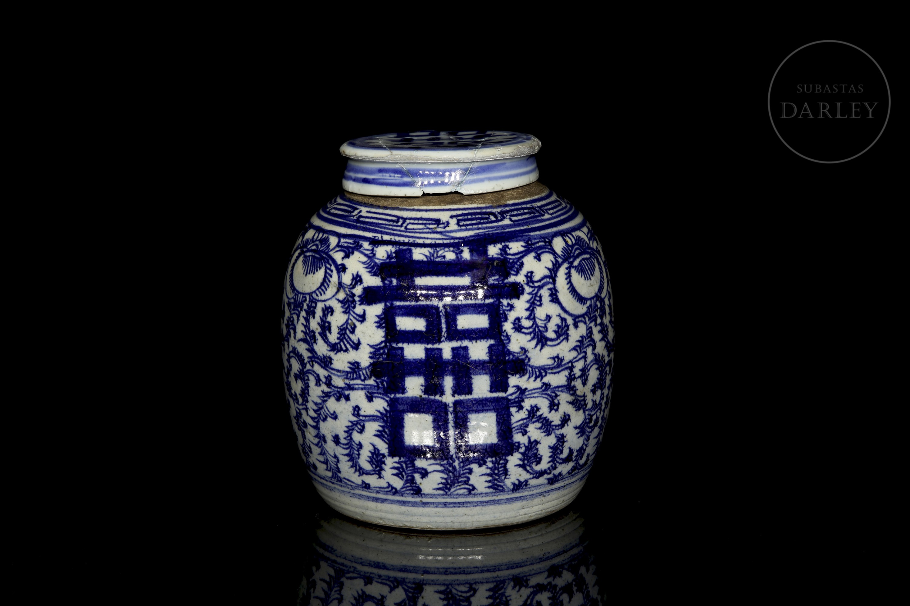 Porcelana esmaltada con decoración bajo vidriado de color blanco y azul cobalto. Posee un cuerpo globular, con cuello corto y estrecho y tapa a juego (restaurada). La decoración consiste en un ramaje floral continuo sobre el que se superponen cuatro grandes caracteres "囍". La base vidriada en blanco no muestra marca visible. Dinastía Qing (1644-1912).
