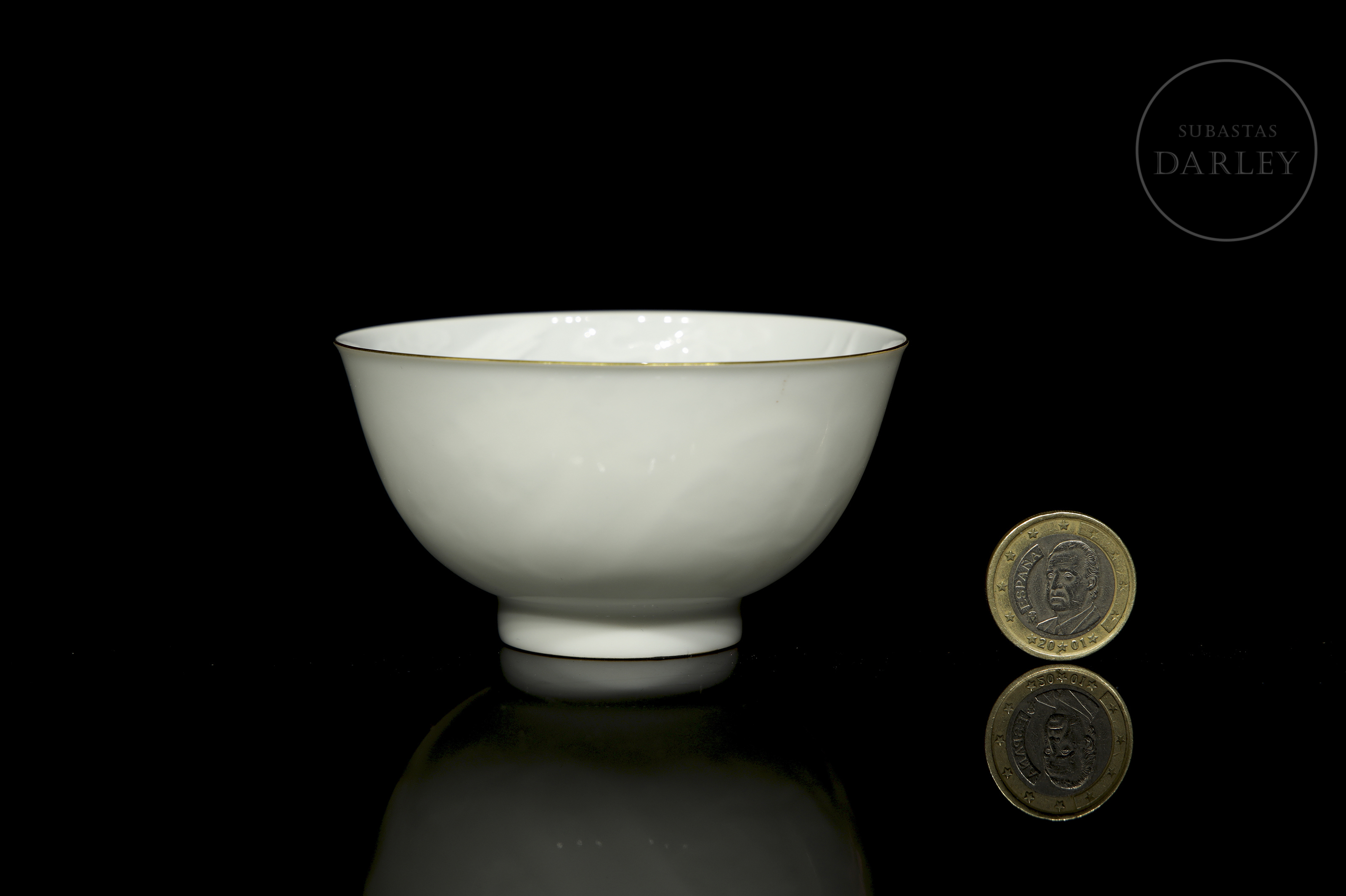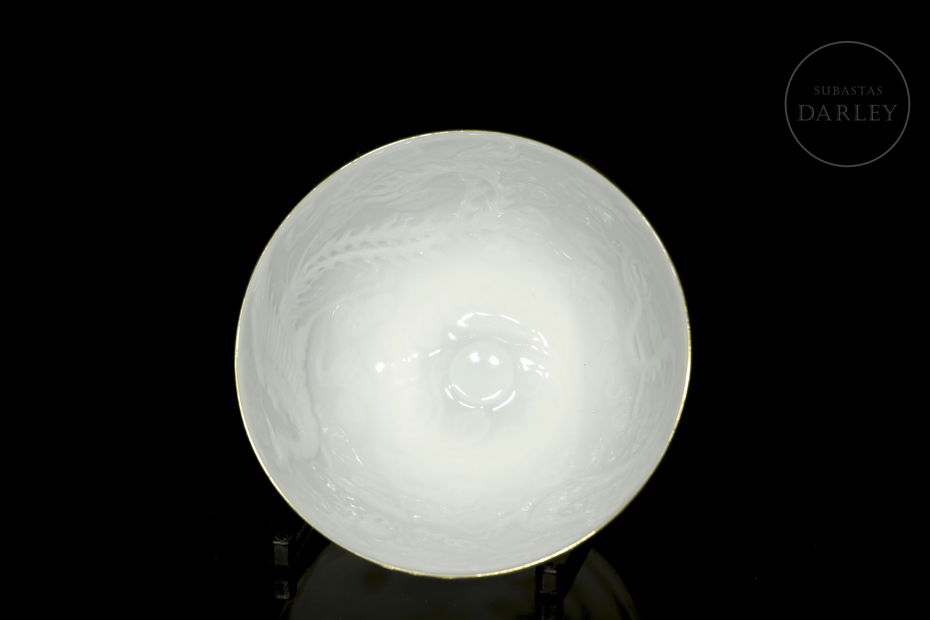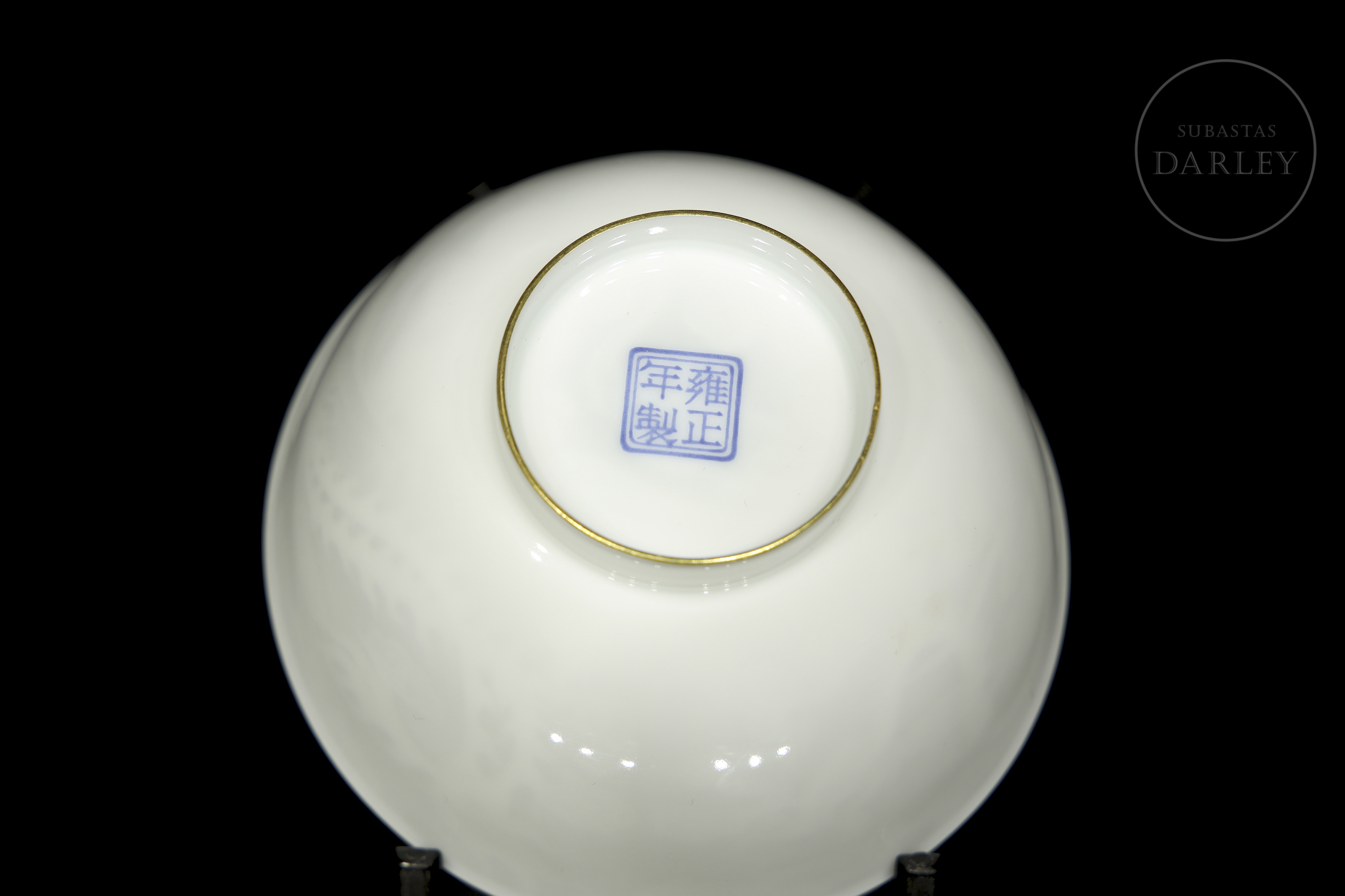 Taza de porcelana esmaltada "cáscara de huevo" sobre vidriado en blanco puro y translúcido, con un ribete dorado en el borde superior. Muestra un cuerpo circular y paredes acampanadas sobre un pequeño pie anular, de porcelana extremadamente fina. Está decorada con un motivo sutil de dos dragones y fénix en relieve oculto "anhua" en el interior, visible por la translucidez. En la base se dispone un sello bajo vidriado "雍正年制" en azul.