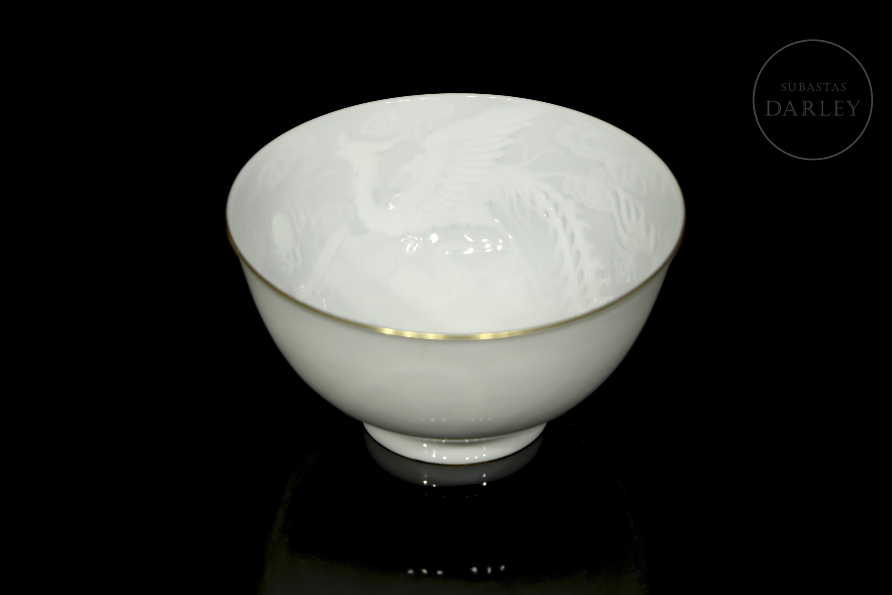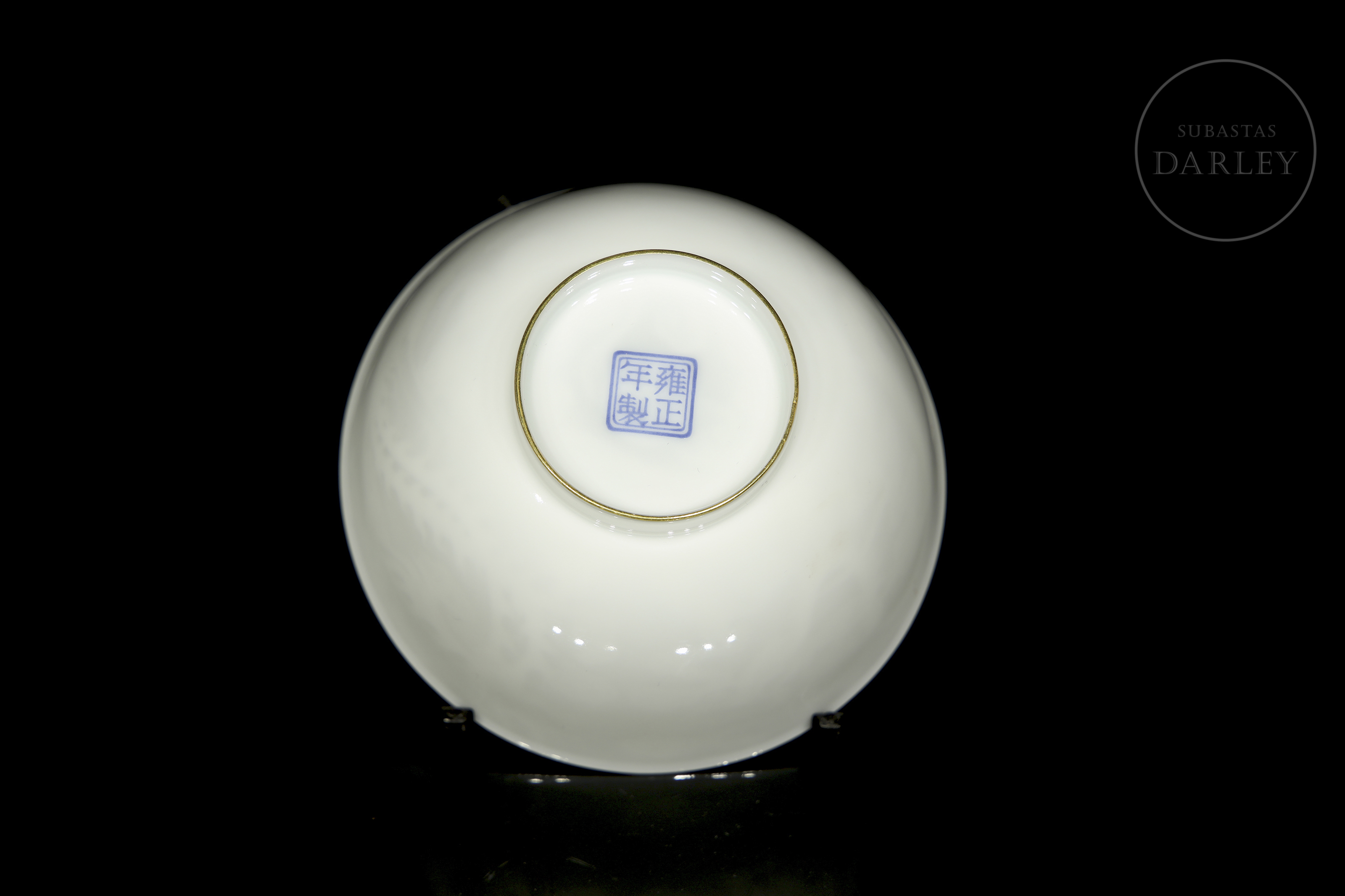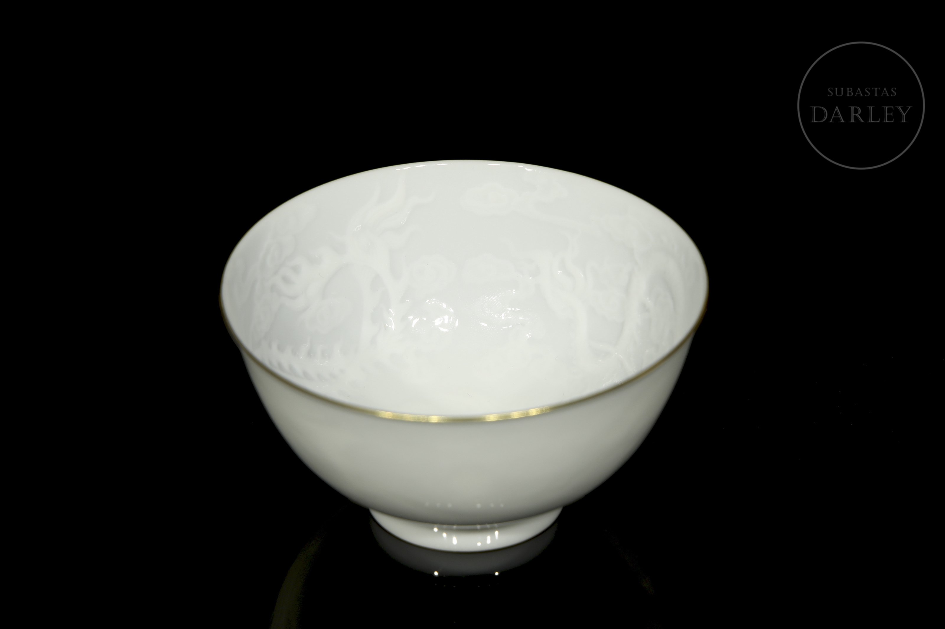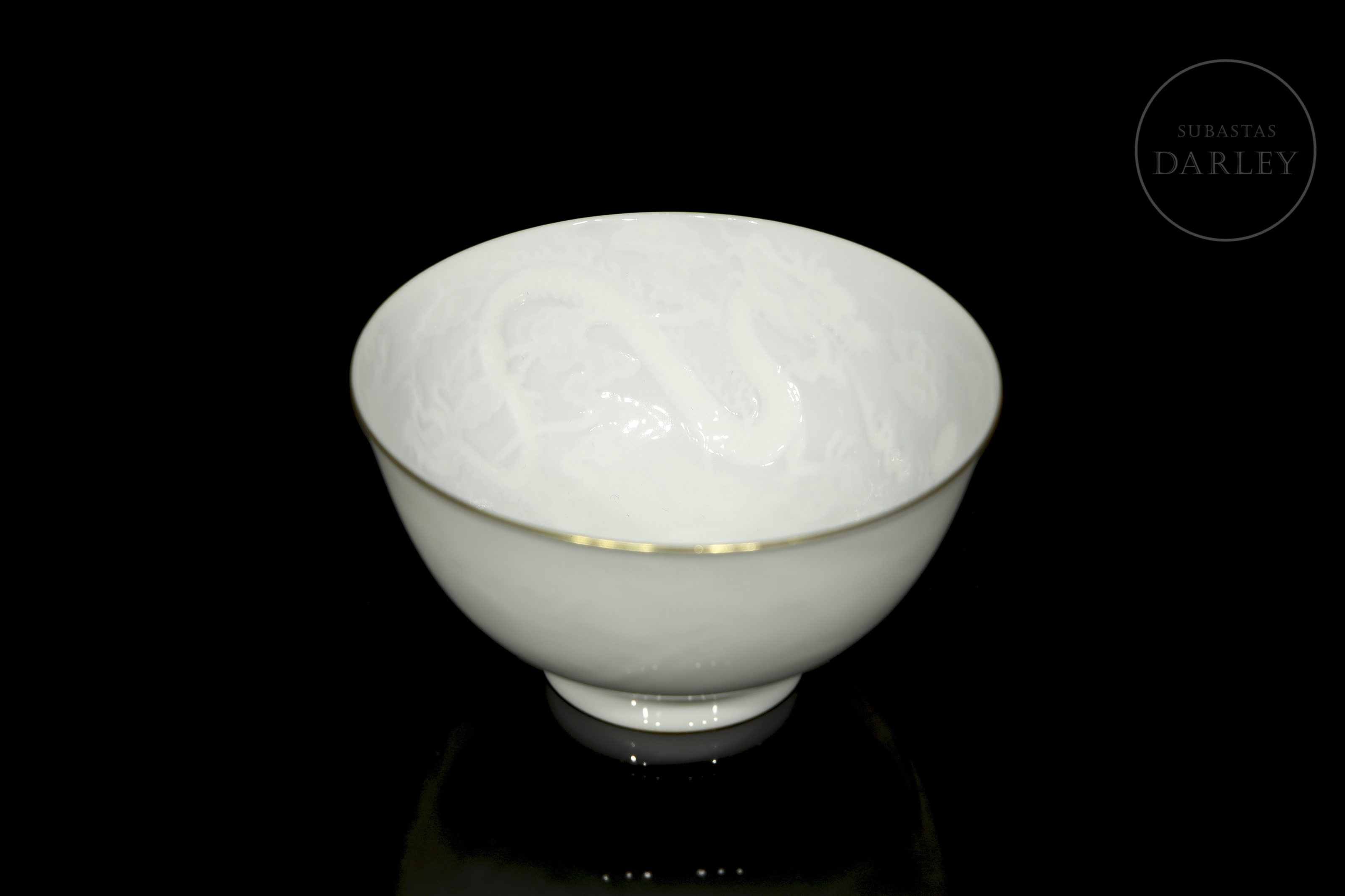 Taza de porcelana esmaltada "cáscara de huevo" sobre vidriado en blanco puro y translúcido, con un ribete dorado en el borde superior. Muestra un cuerpo circular y paredes acampanadas sobre un pequeño pie anular, de porcelana extremadamente fina. Está decorada con un motivo sutil de dos dragones y fénix en relieve oculto "anhua" en el interior, visible por la translucidez. En la base se dispone un sello bajo vidriado "雍正年制" en azul.
