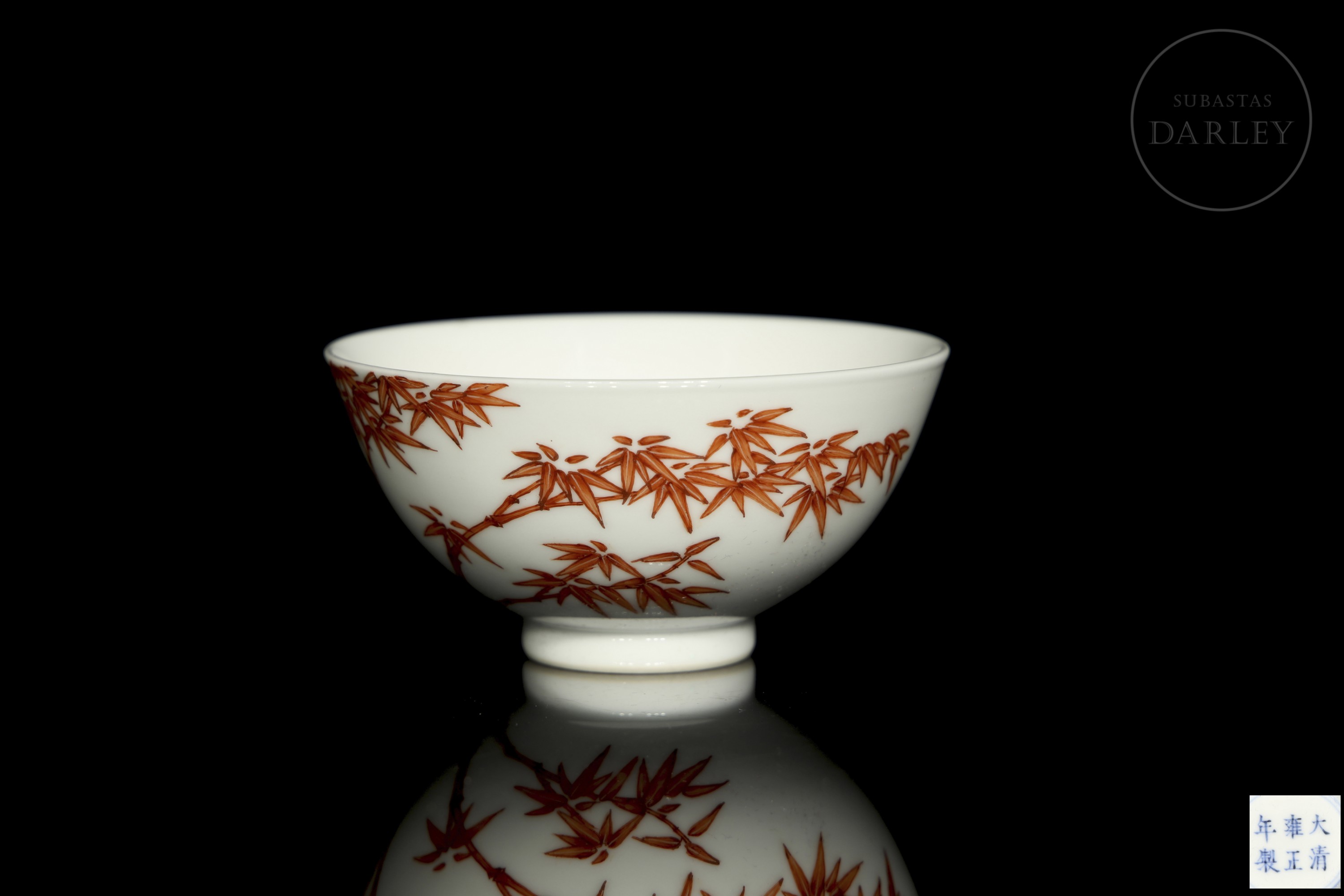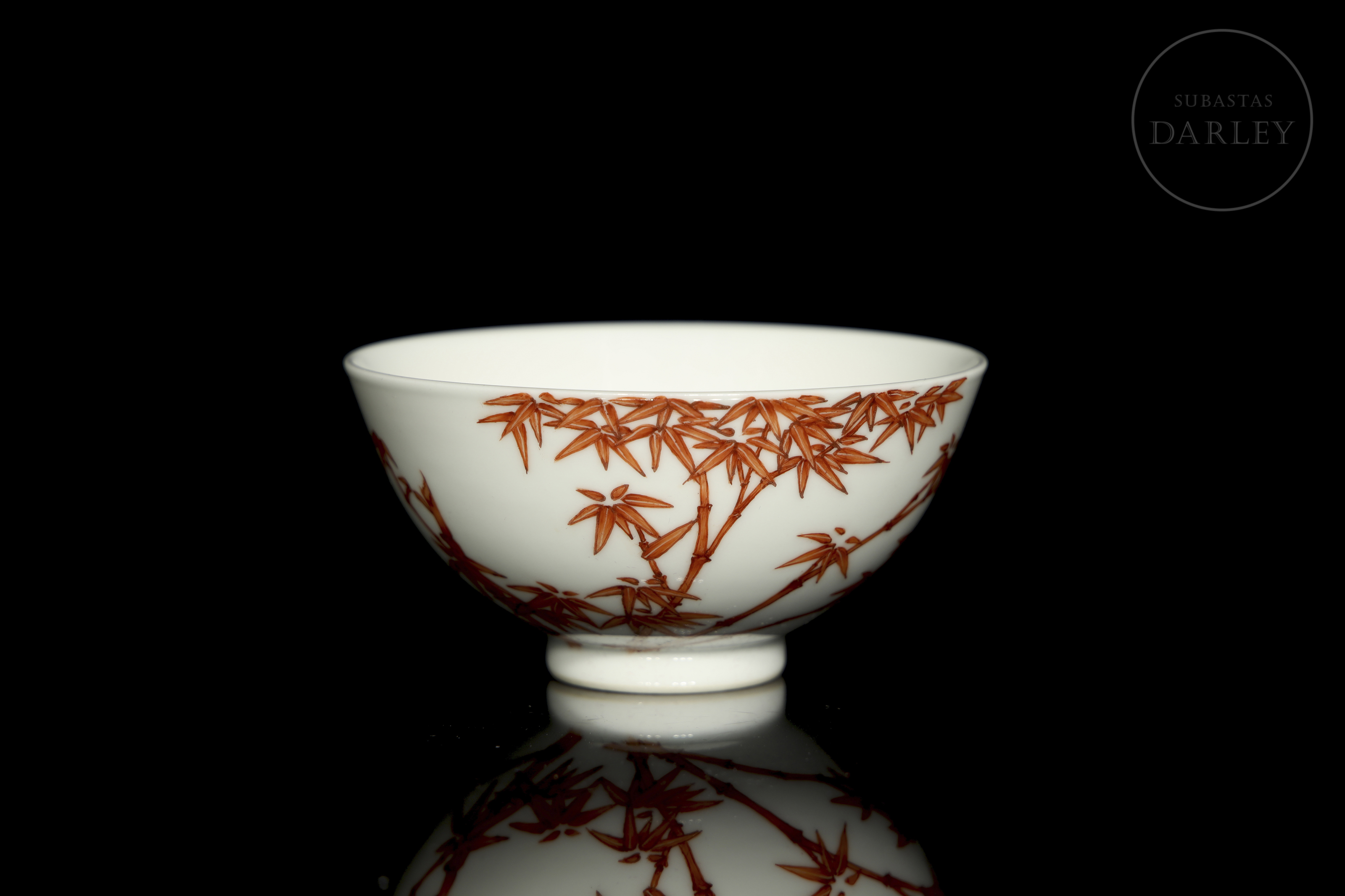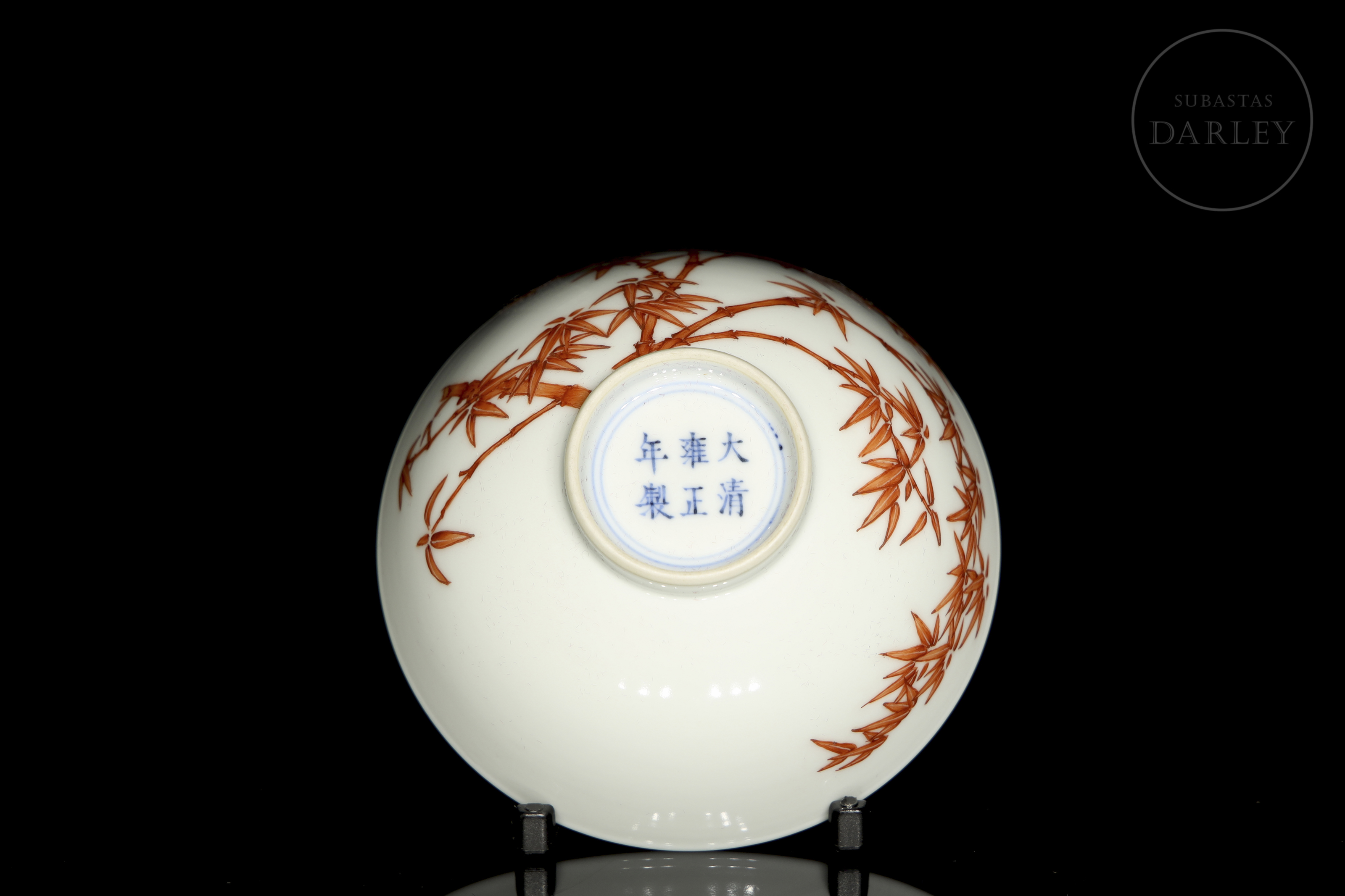 Taza de porcelana esmaltada con decoración sobre vidriado en rojo óxido. Posee una morfología de copa profunda con paredes curvas y borde ligeramente acampanado, asentada sobre un pie anular. Está decorada con un motivo de bambú, con tallos y hojas que recorren todo el exterior de la taza. En la base se dispone un sello bajo vidriado "大清雍正年制".