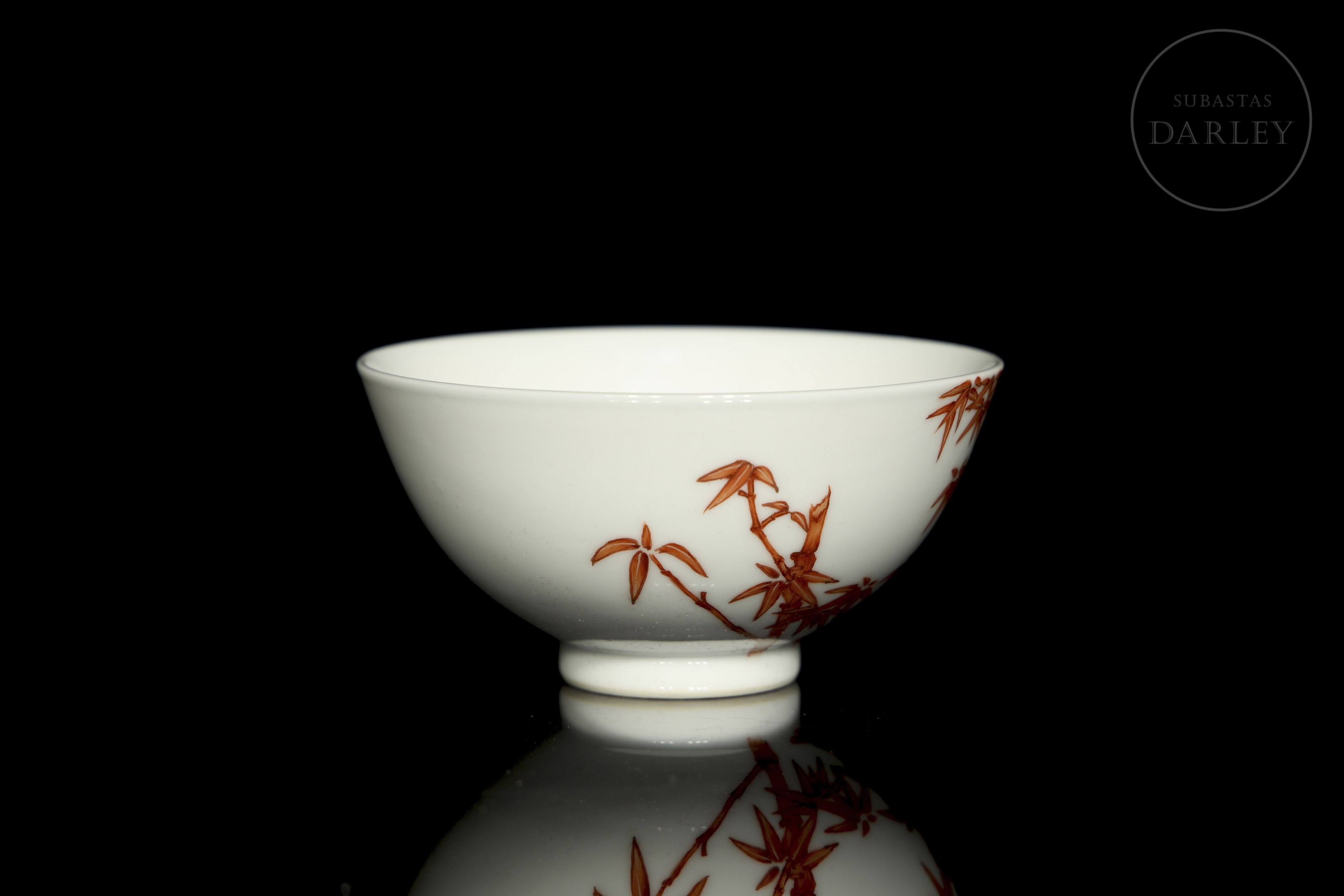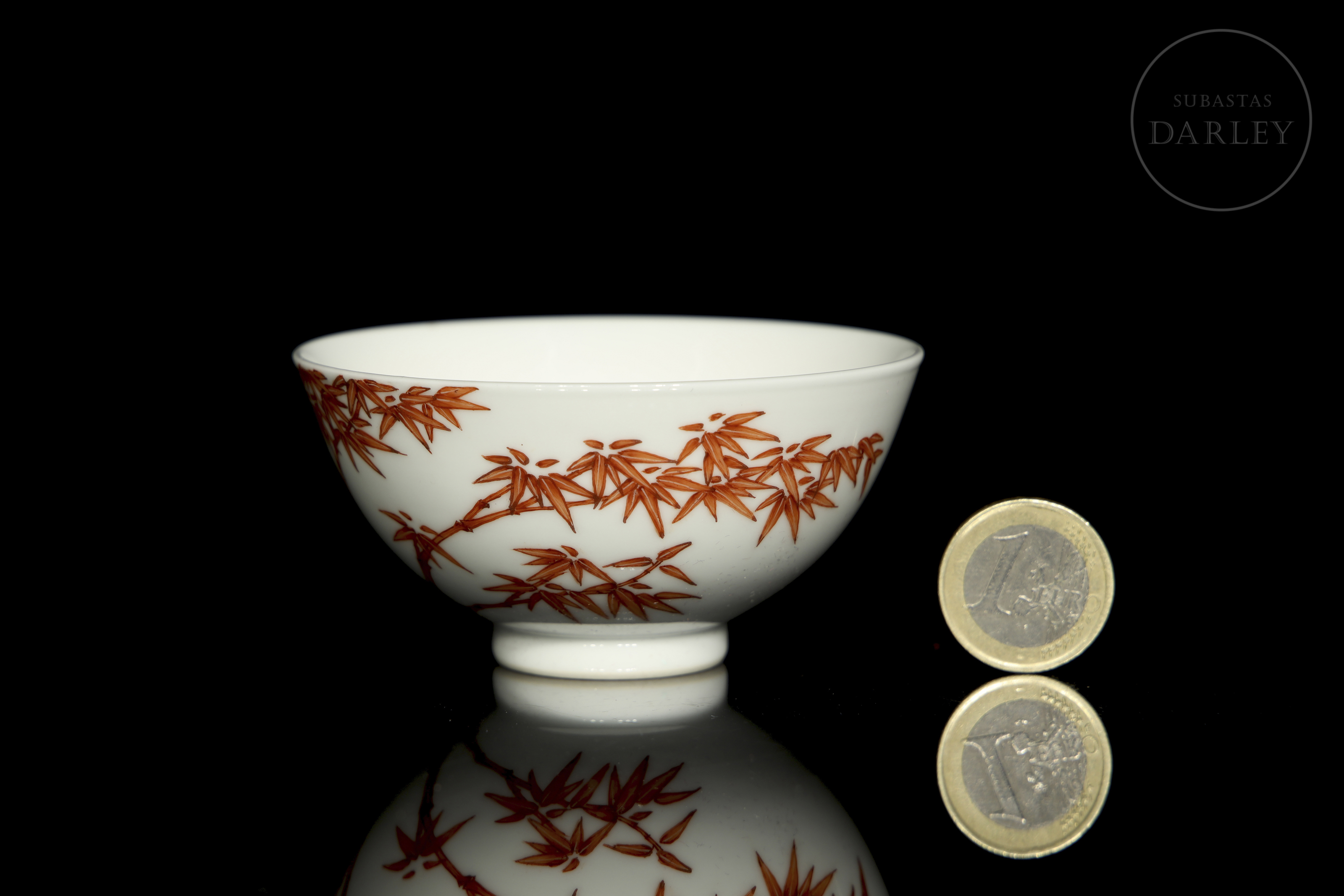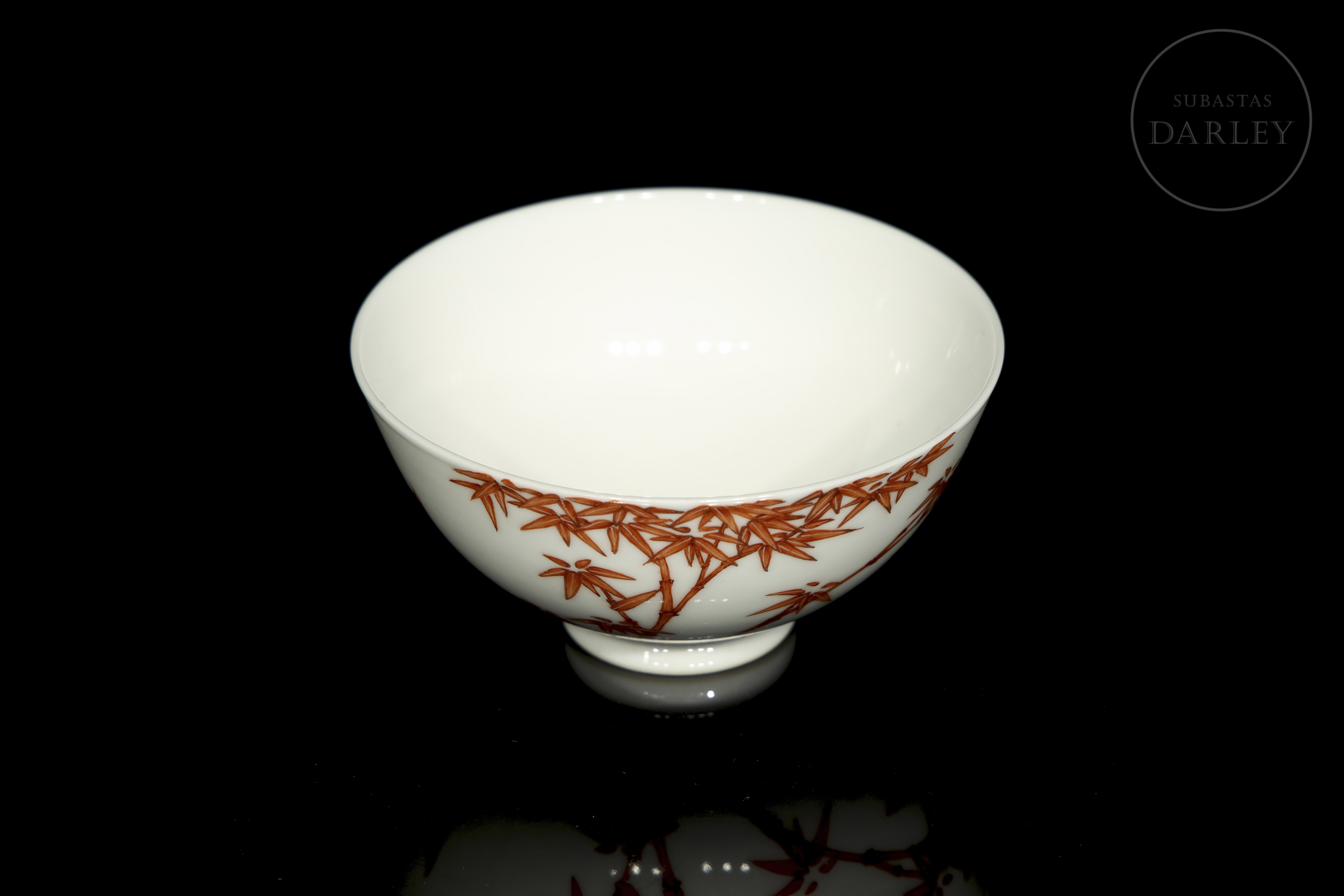 Taza de porcelana esmaltada con decoración sobre vidriado en rojo óxido. Posee una morfología de copa profunda con paredes curvas y borde ligeramente acampanado, asentada sobre un pie anular. Está decorada con un motivo de bambú, con tallos y hojas que recorren todo el exterior de la taza. En la base se dispone un sello bajo vidriado "大清雍正年制".