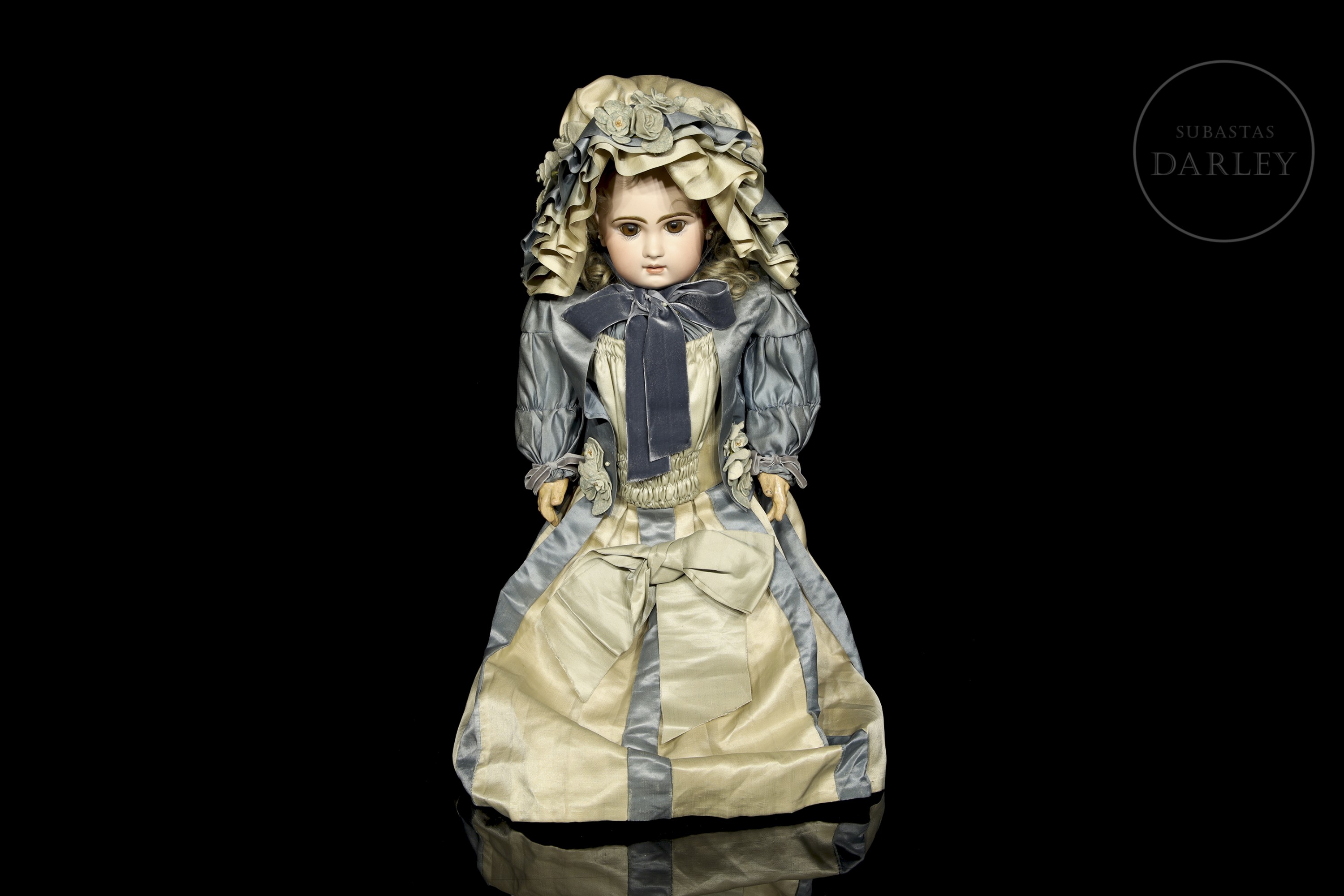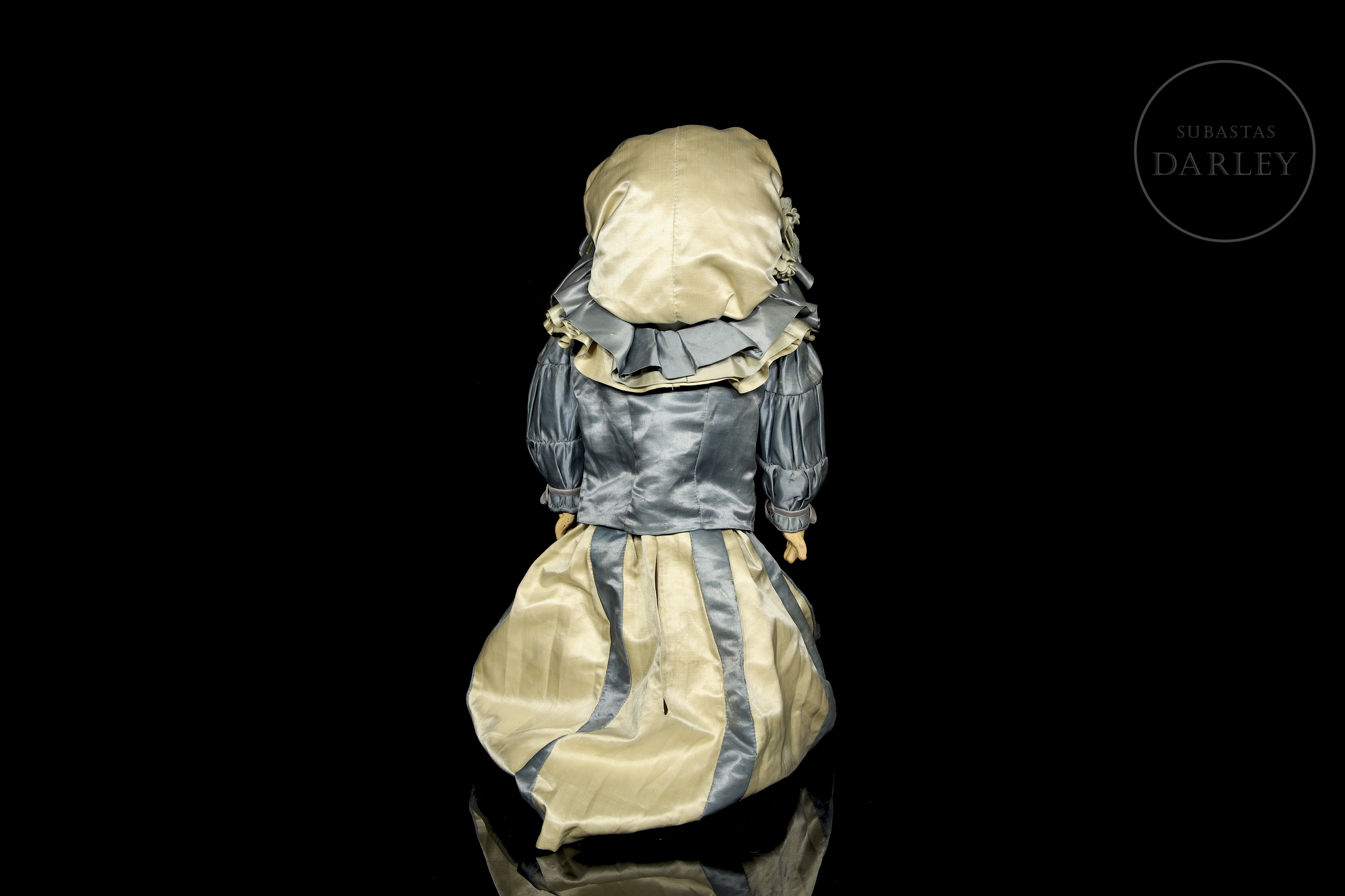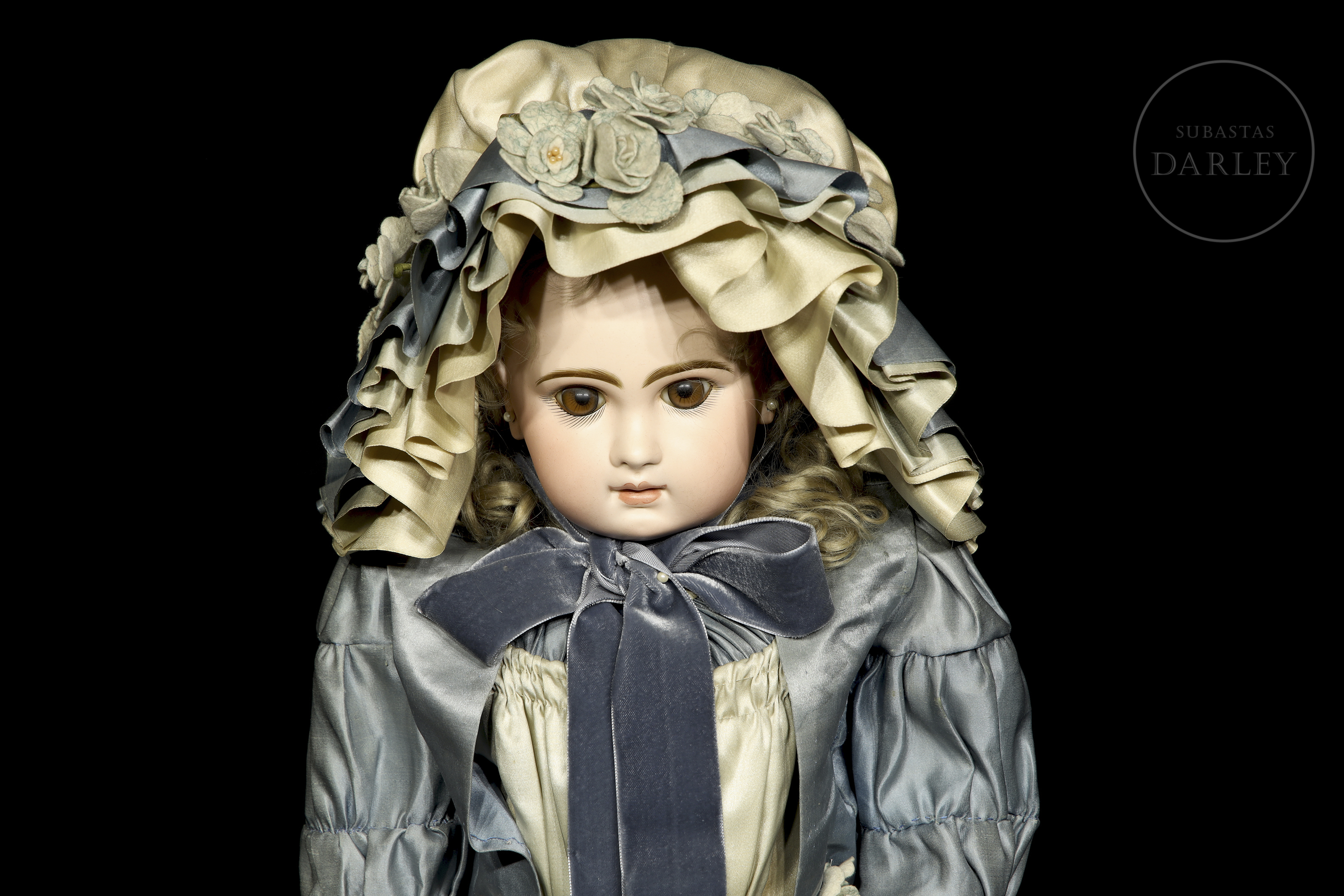 Excepcional muñeca francesa de boca cerrada, considerada una de las piezas más valiosas de la manufactura Jumeau. Presenta cabeza de biscuit con ojos de cristal, orejas perforadas y cuerpo articulado de composición "Médaille d'Or". Marcas en la nuca: "DÉPOSÉ / TÉTE JUMEAU / Bté S.G.D.G. / 11" en sello rojo y sello en el cuerpo: "JUMEAU / MÉDAILLE D'OR / PARIS". Siglo XIX (ca. 1885-1891).