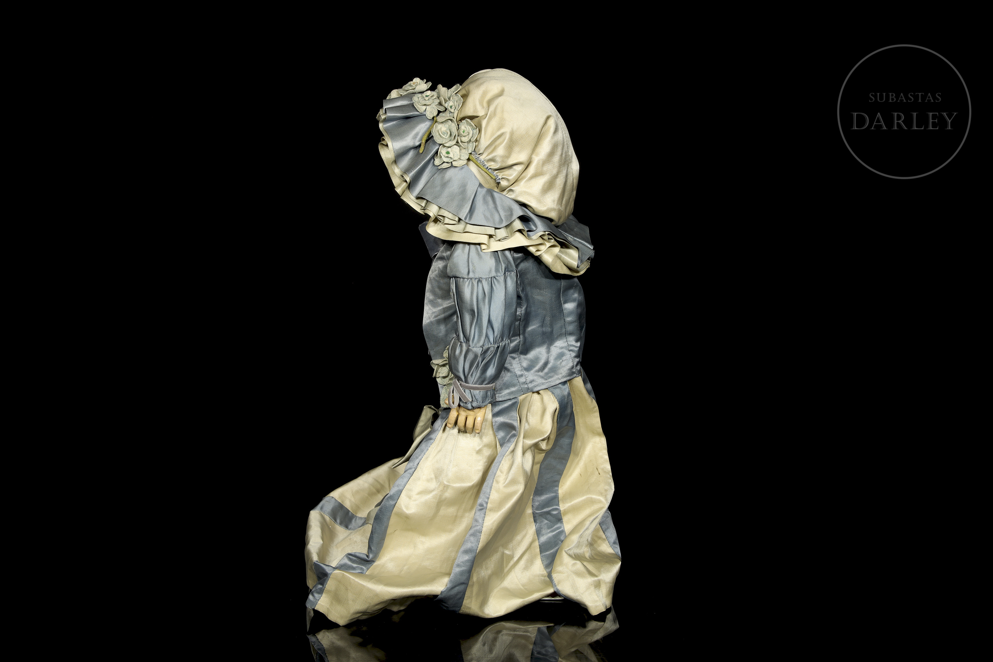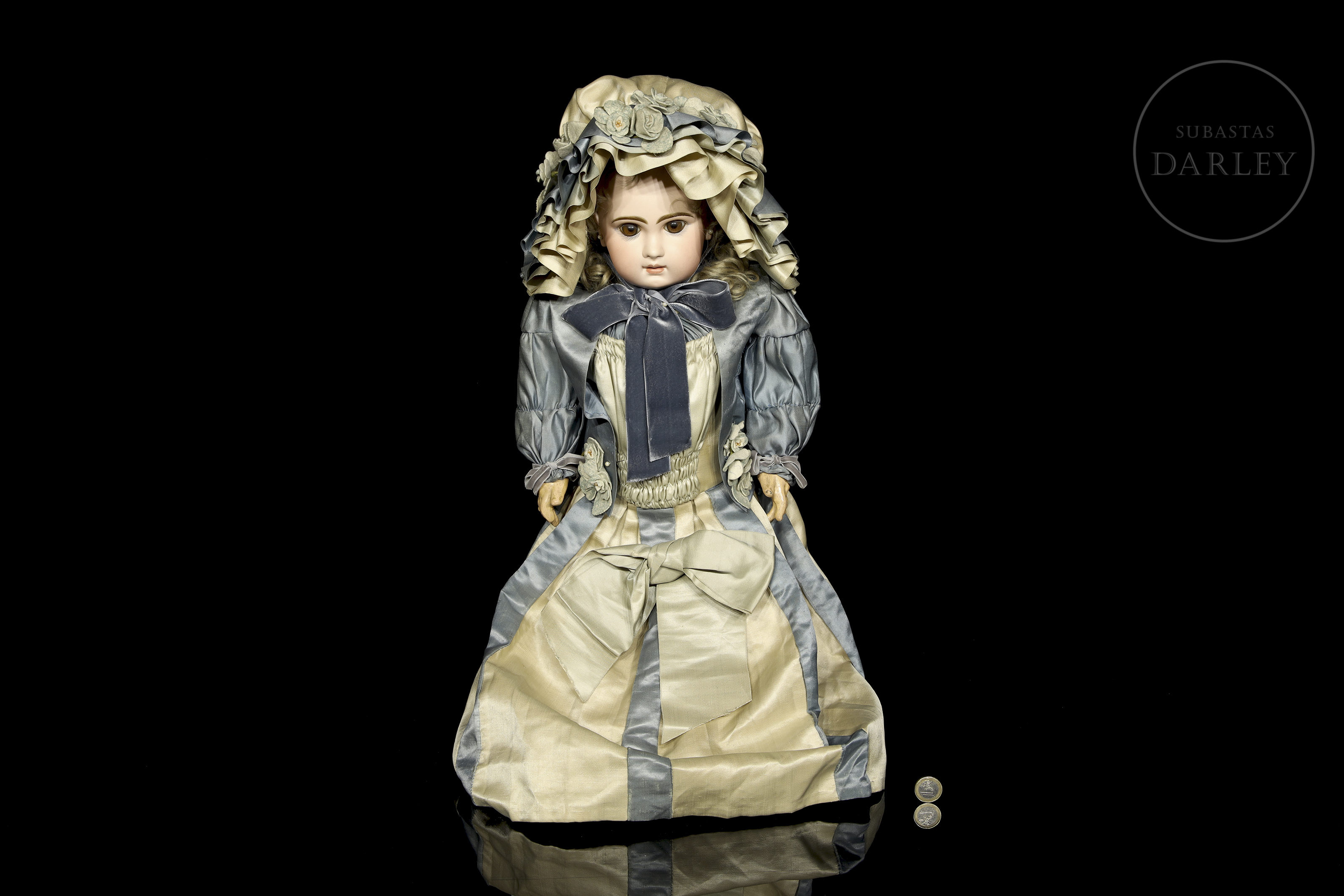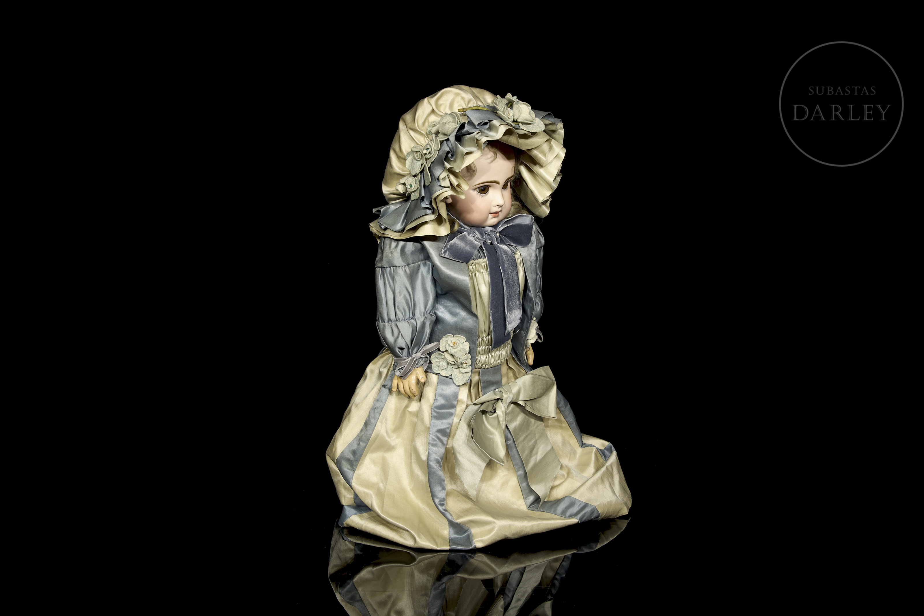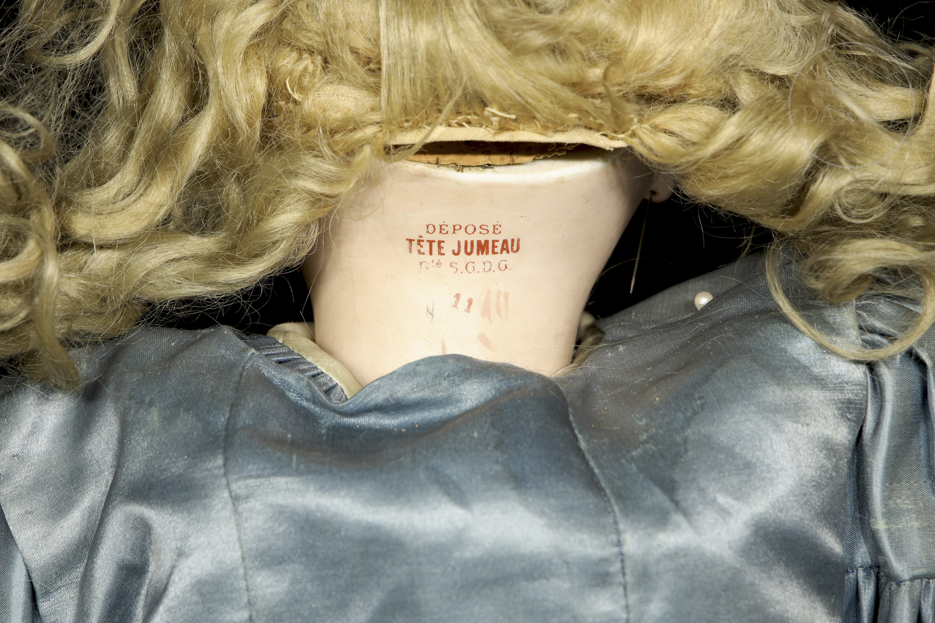 Excepcional muñeca francesa de boca cerrada, considerada una de las piezas más valiosas de la manufactura Jumeau. Presenta cabeza de biscuit con ojos de cristal, orejas perforadas y cuerpo articulado de composición "Médaille d'Or". Marcas en la nuca: "DÉPOSÉ / TÉTE JUMEAU / Bté S.G.D.G. / 11" en sello rojo y sello en el cuerpo: "JUMEAU / MÉDAILLE D'OR / PARIS". Siglo XIX (ca. 1885-1891).