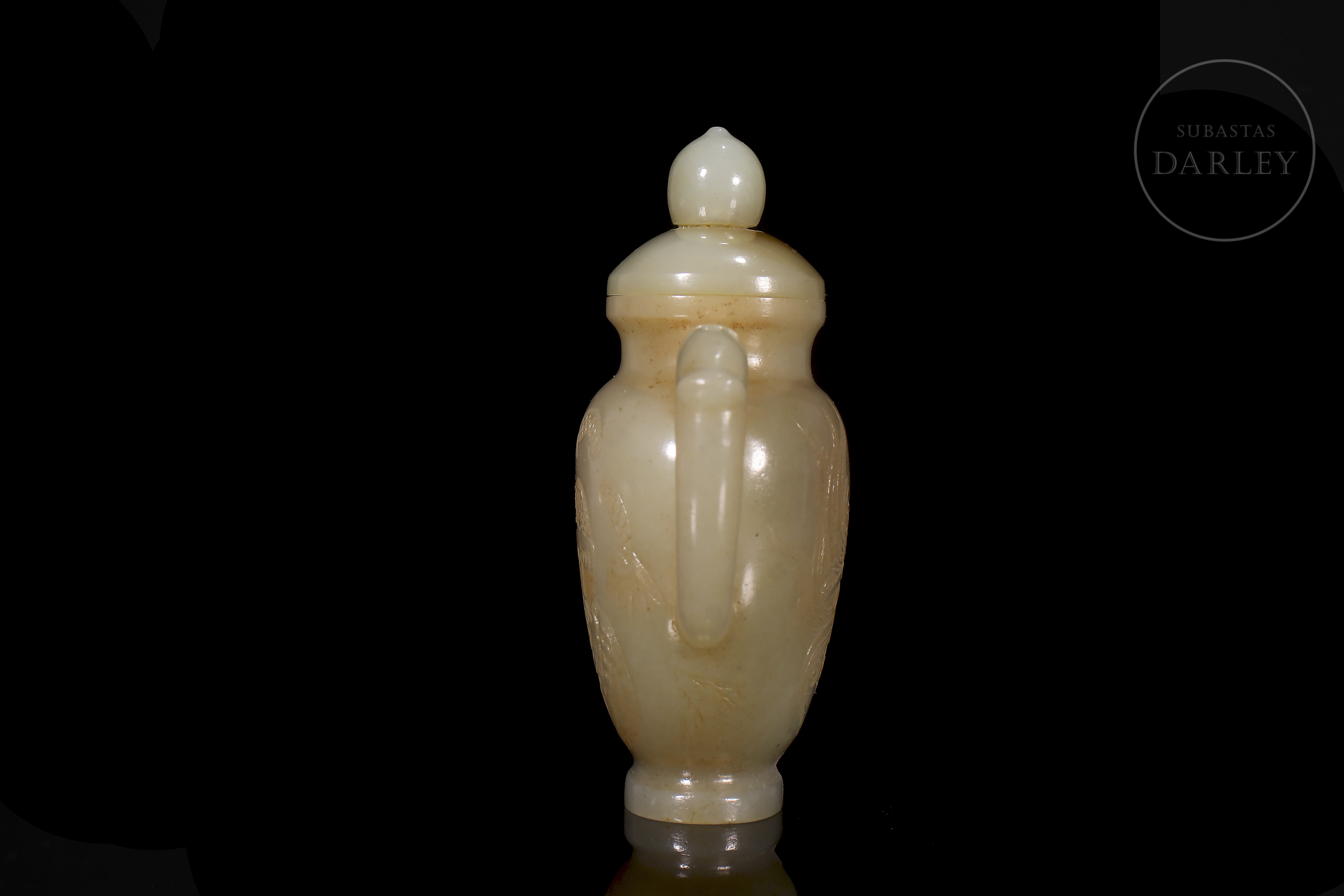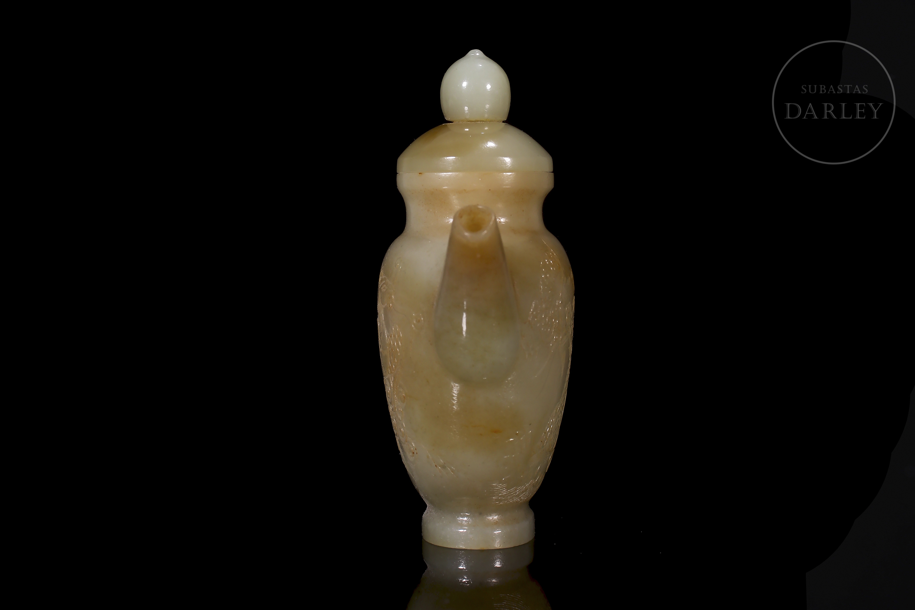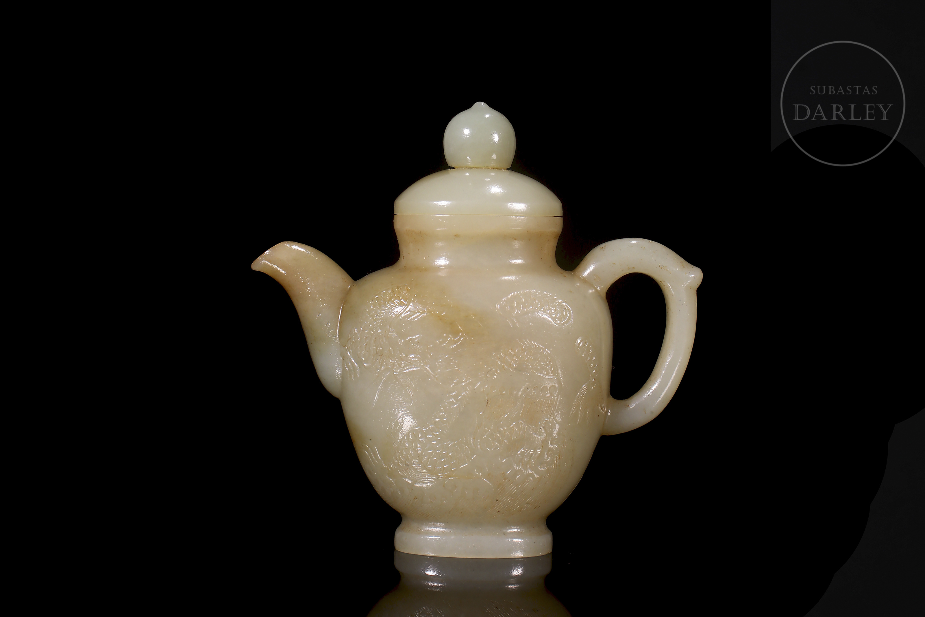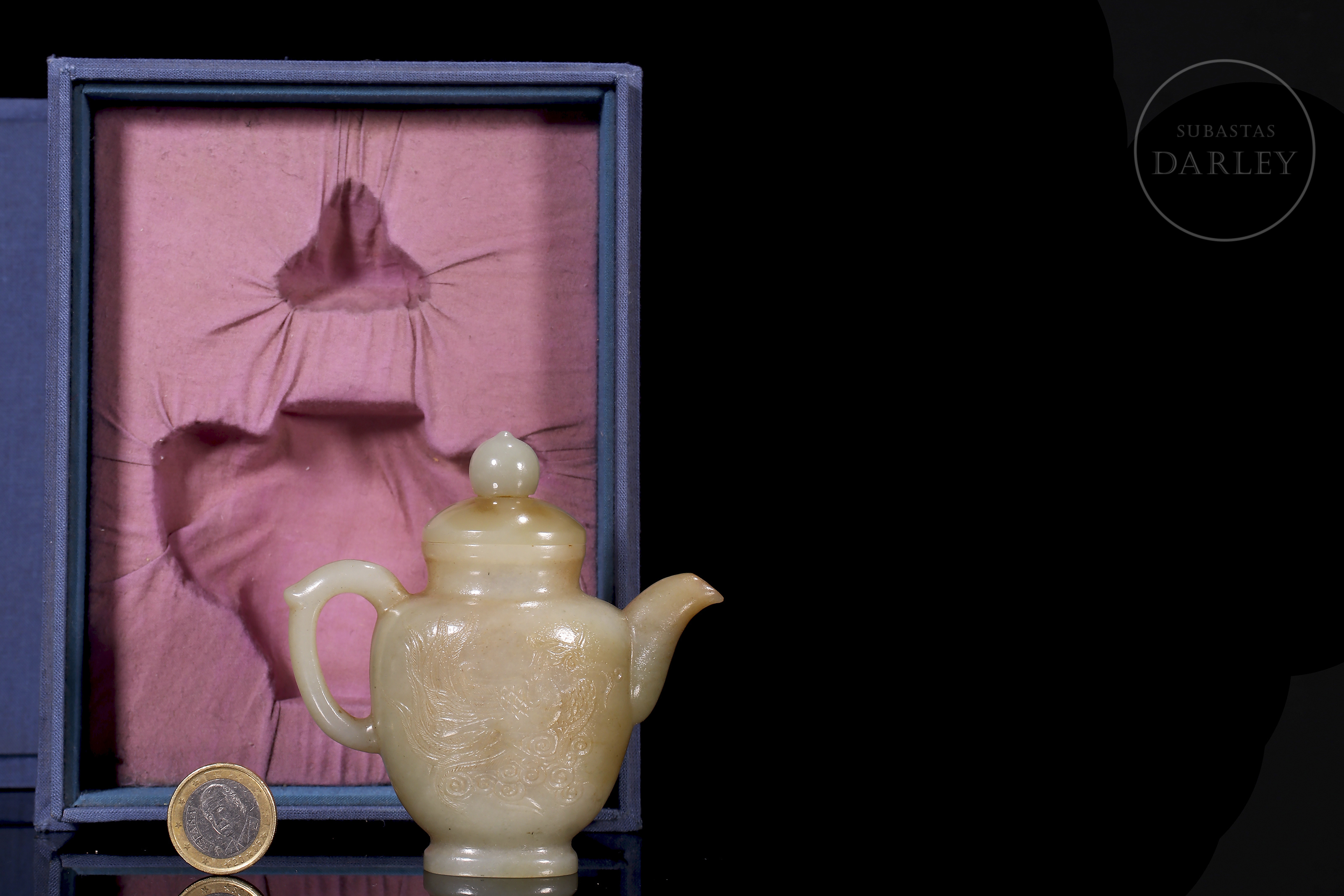 Tetera con tapa tallada de jade de Hetian, de forma ovalada, con un elegante pico, un asa curva y un pie circular. La tapa es abovedada y se remata con un pomo en forma de brote. El jade es de color blanco cremoso, con vetas de pátina marrón ocre. La decoración muestra, en cada una de las caras, la representación de un feroz dragón (long) y una majestuosa ave fénix en una danza grácil, tallados en bajo relieve. Con caja forrada a medida. Dinastía Qing (1644–1912).