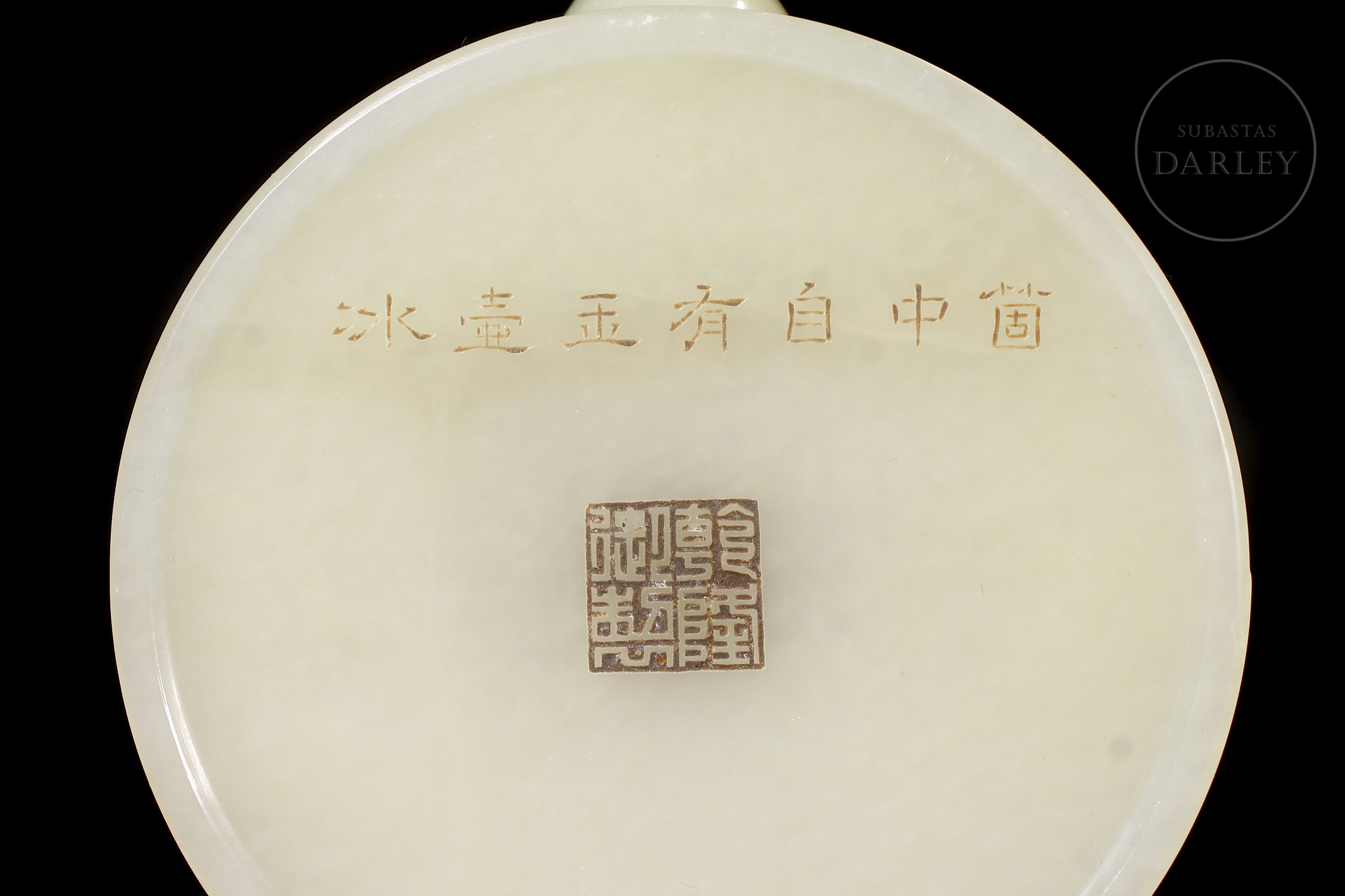 Pequeña tetera de cuerpo globular, realizada en jade blanco de Hetian, con asa circular y tapa ajustada. La superficie está recorrida por una inscripción caligráfica y en la base presenta el sello inciso "乾隆御制". Asimismo, en la parte inferior figura la frase "箇中自有玉壶冰", en alusión a la transparencia y rectitud moral. Con caja a medida.