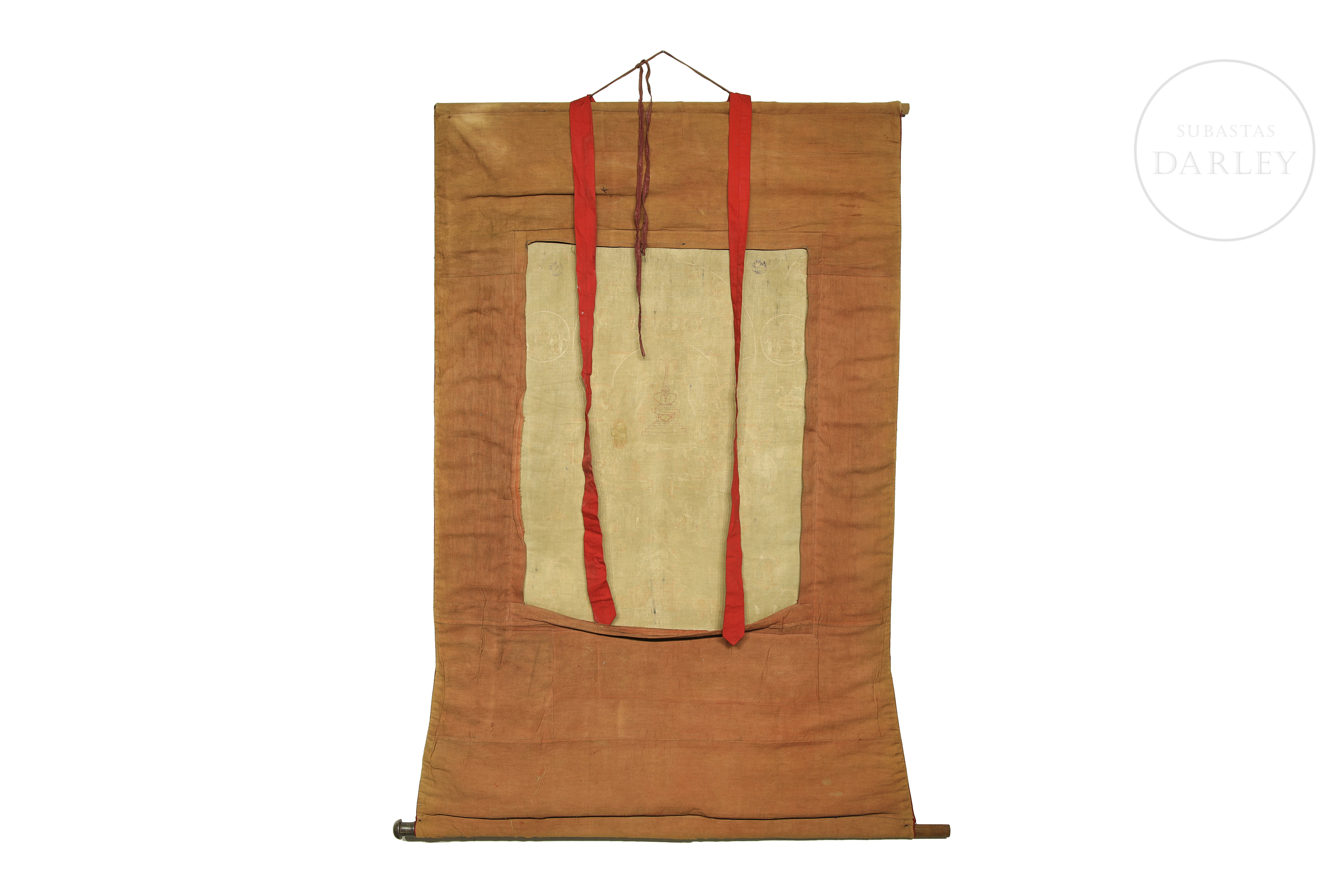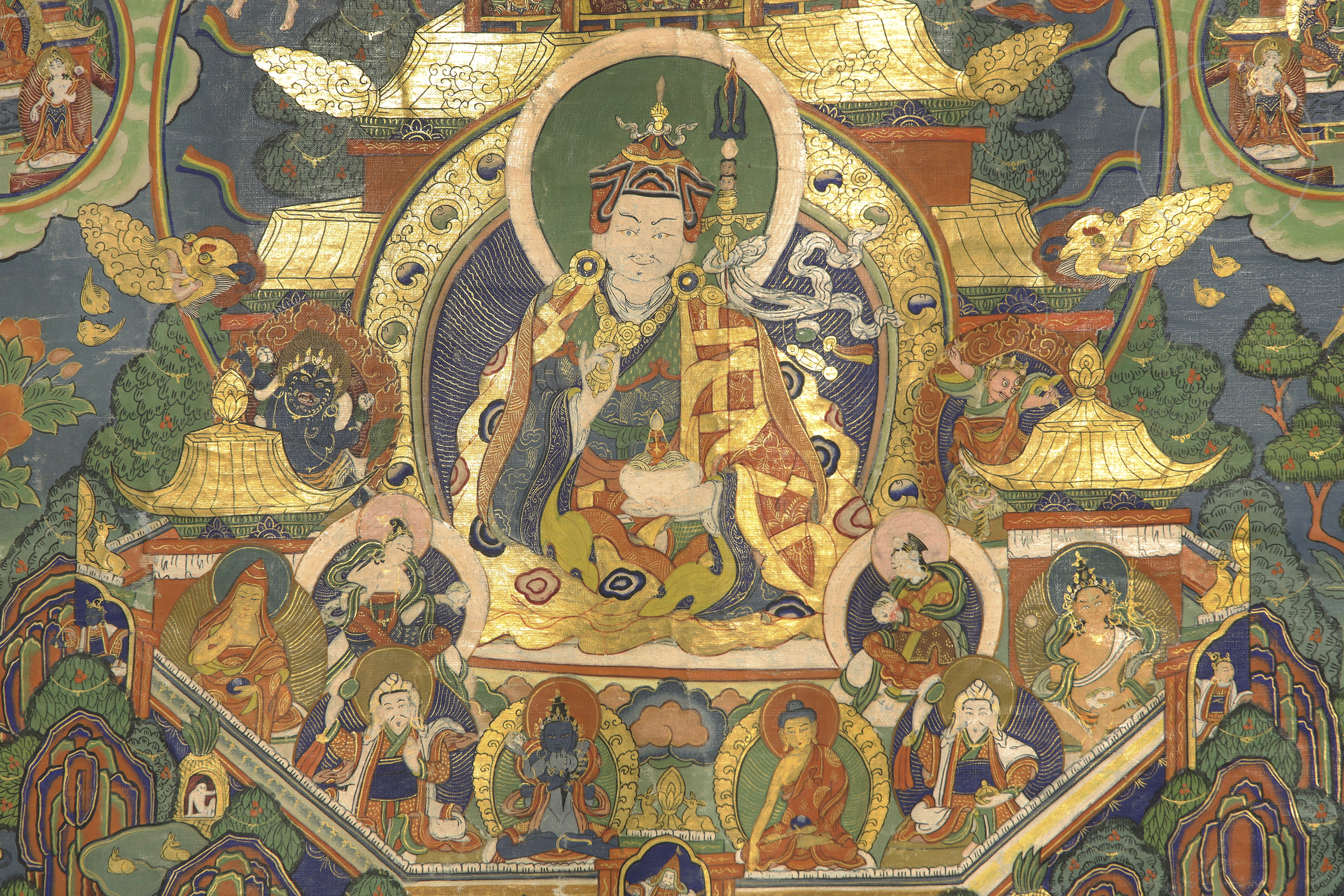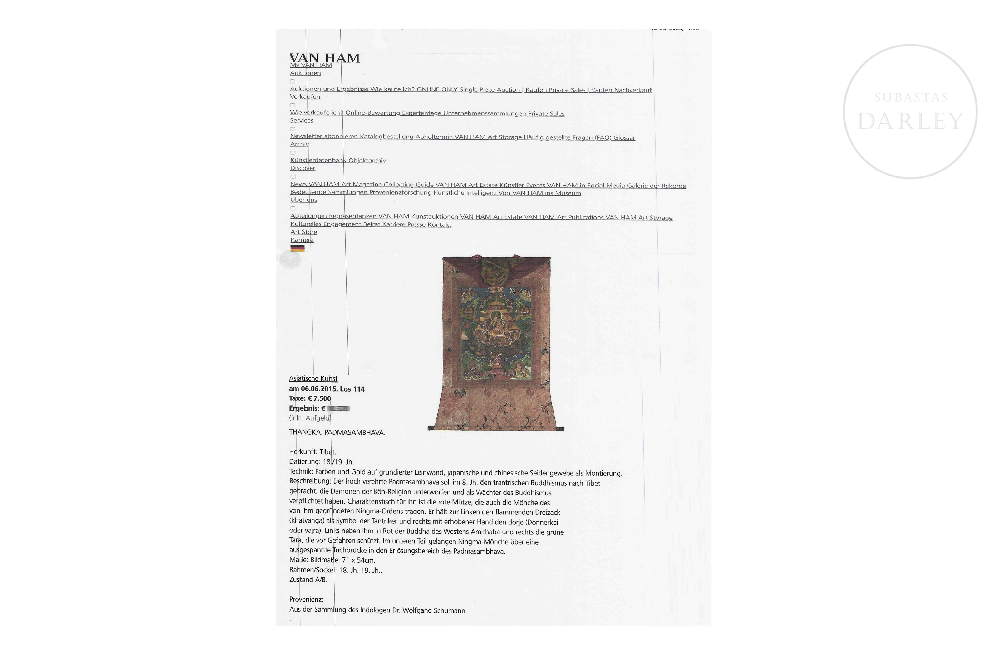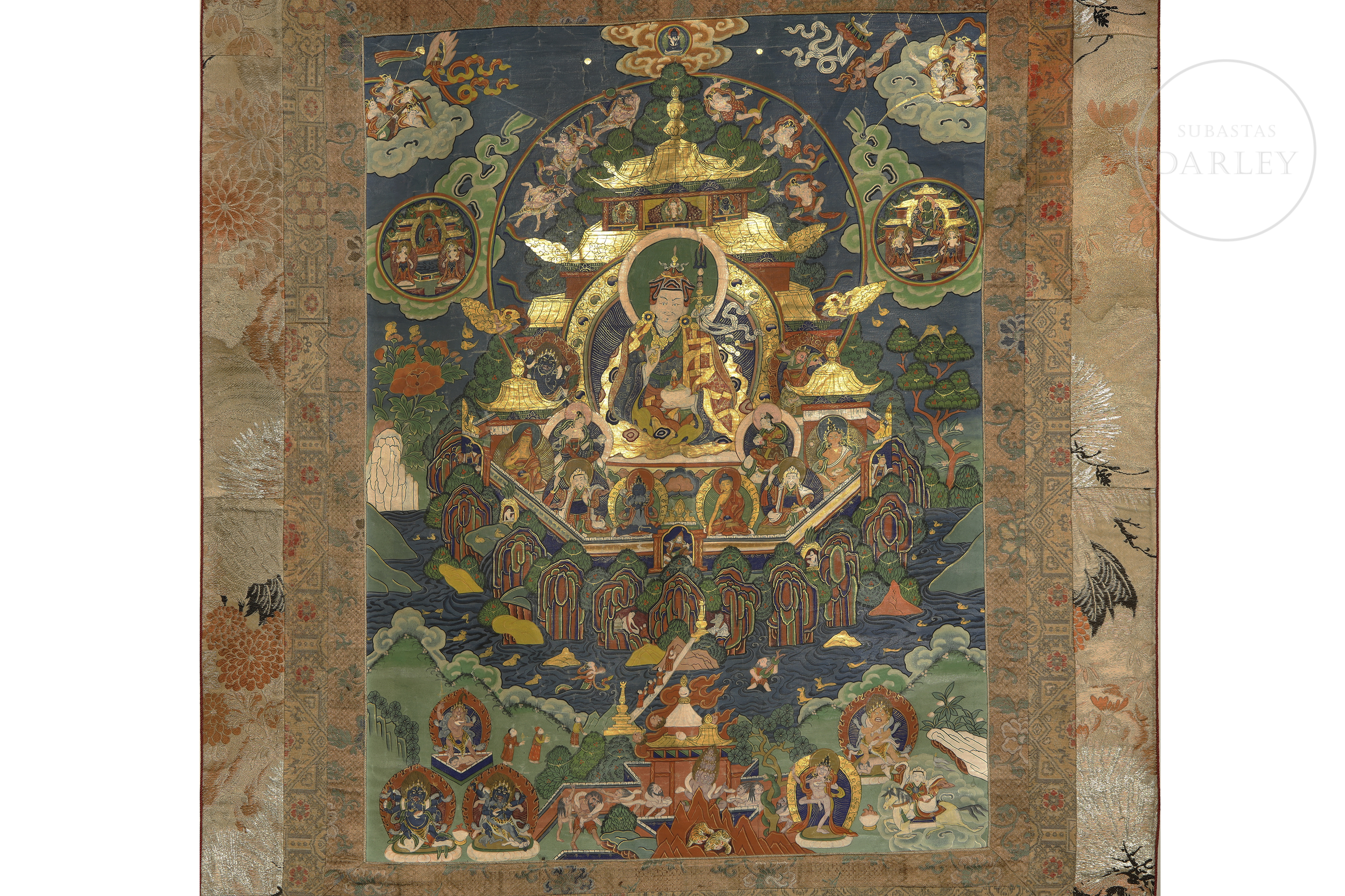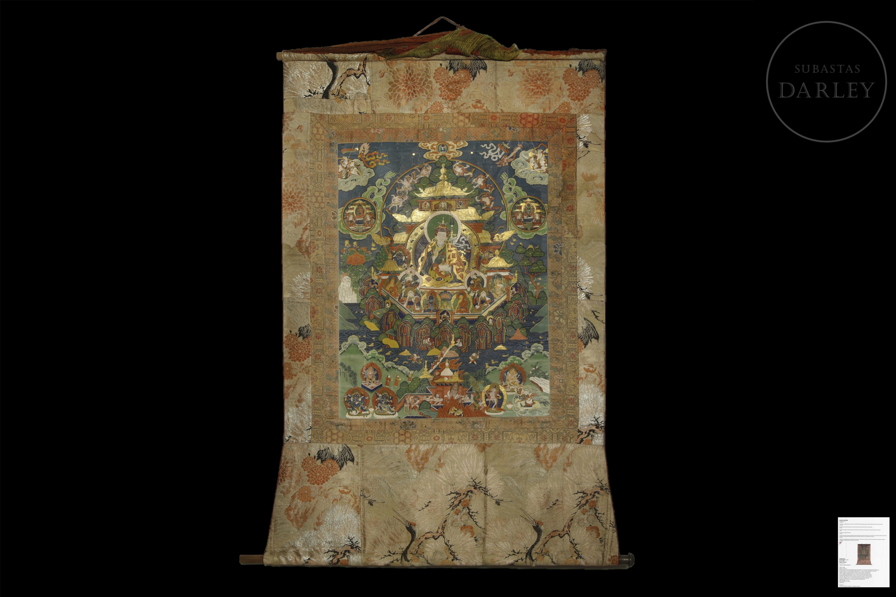 Thangka tibetano realizado con pigmentos y oro sobre lienzo de seda japonesa. La composición, de gran complejidad iconográfica, está presidida por la figura de Padmasambhava, sentado en un trono de loto en el centro de su paraíso celestial. Sostiene sus atributos característicos tántricos: el vajra, la kapala y el khatvanga. A su alrededor se dispone jerárquicamente un completo panteón de lamas, deidades y discípulos, conformando una asamblea sagrada, mostrando a su izquierda, en rojo, está el Buda del Oeste Amithaba y a su derecha a Tara verde, protectora contra los peligros. La pintura está enmarcada por su marco original tradicional de seda brocada, y cubierta con su velo protector. Tíbet, s. XVIII o posterior.