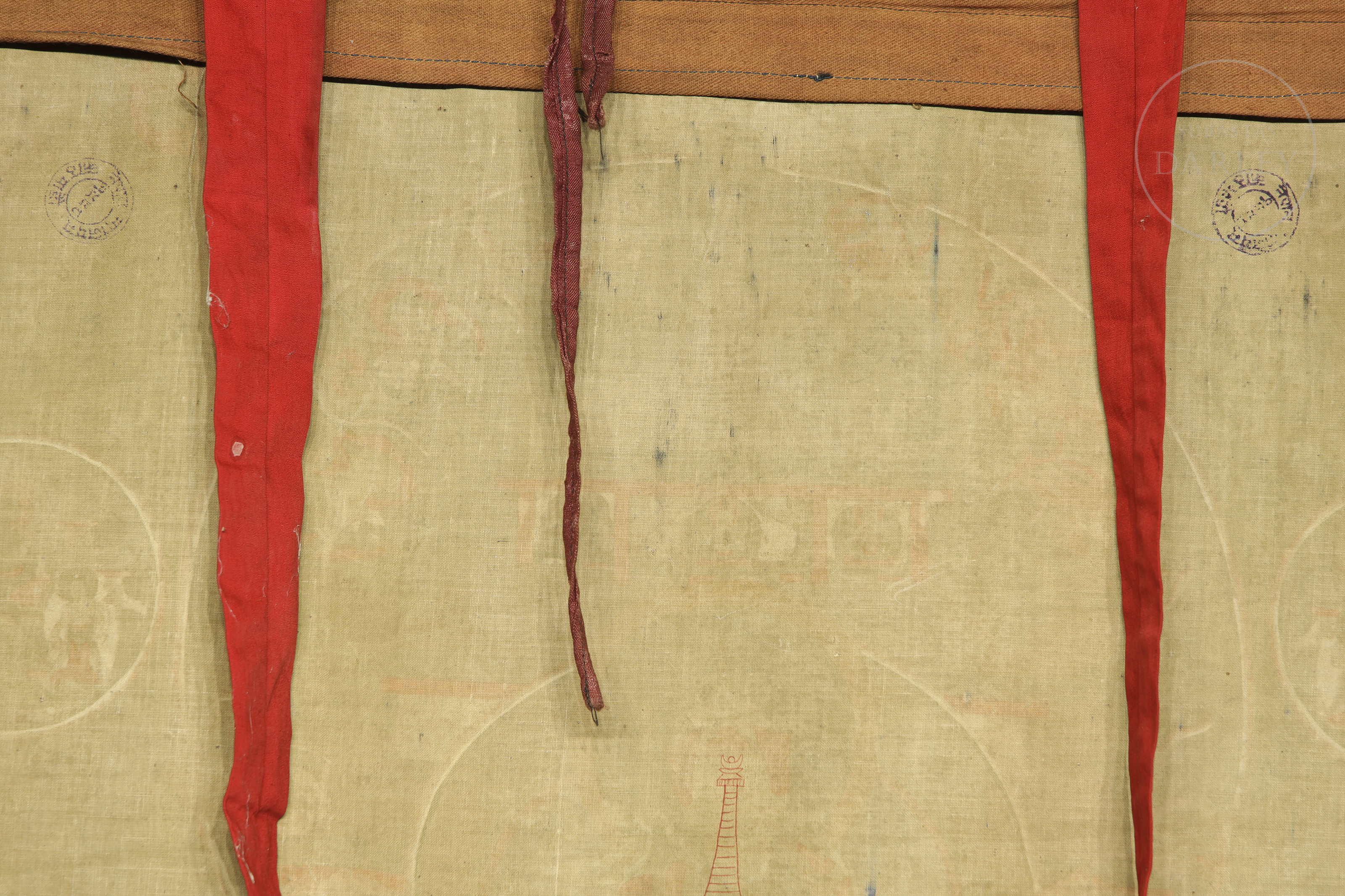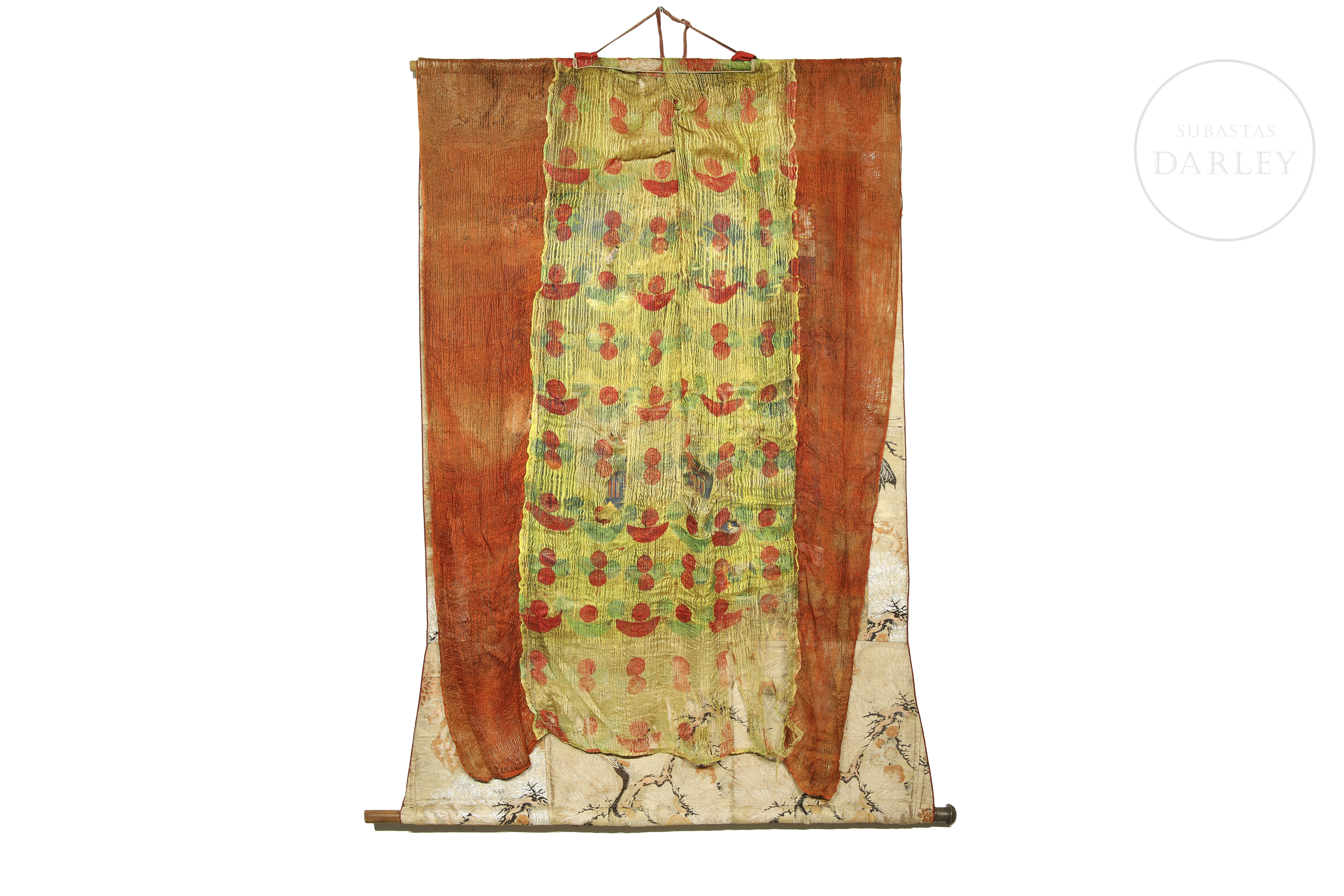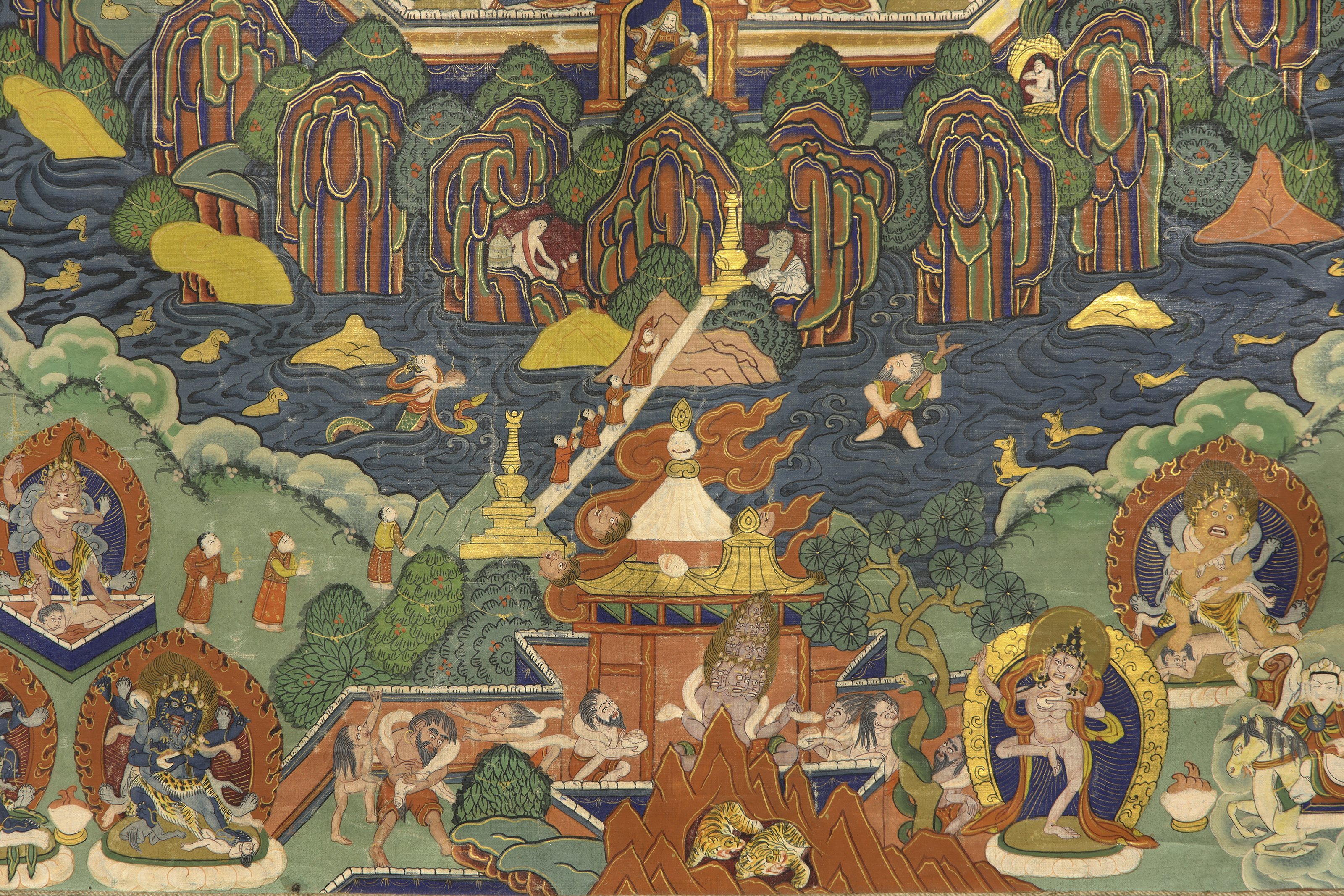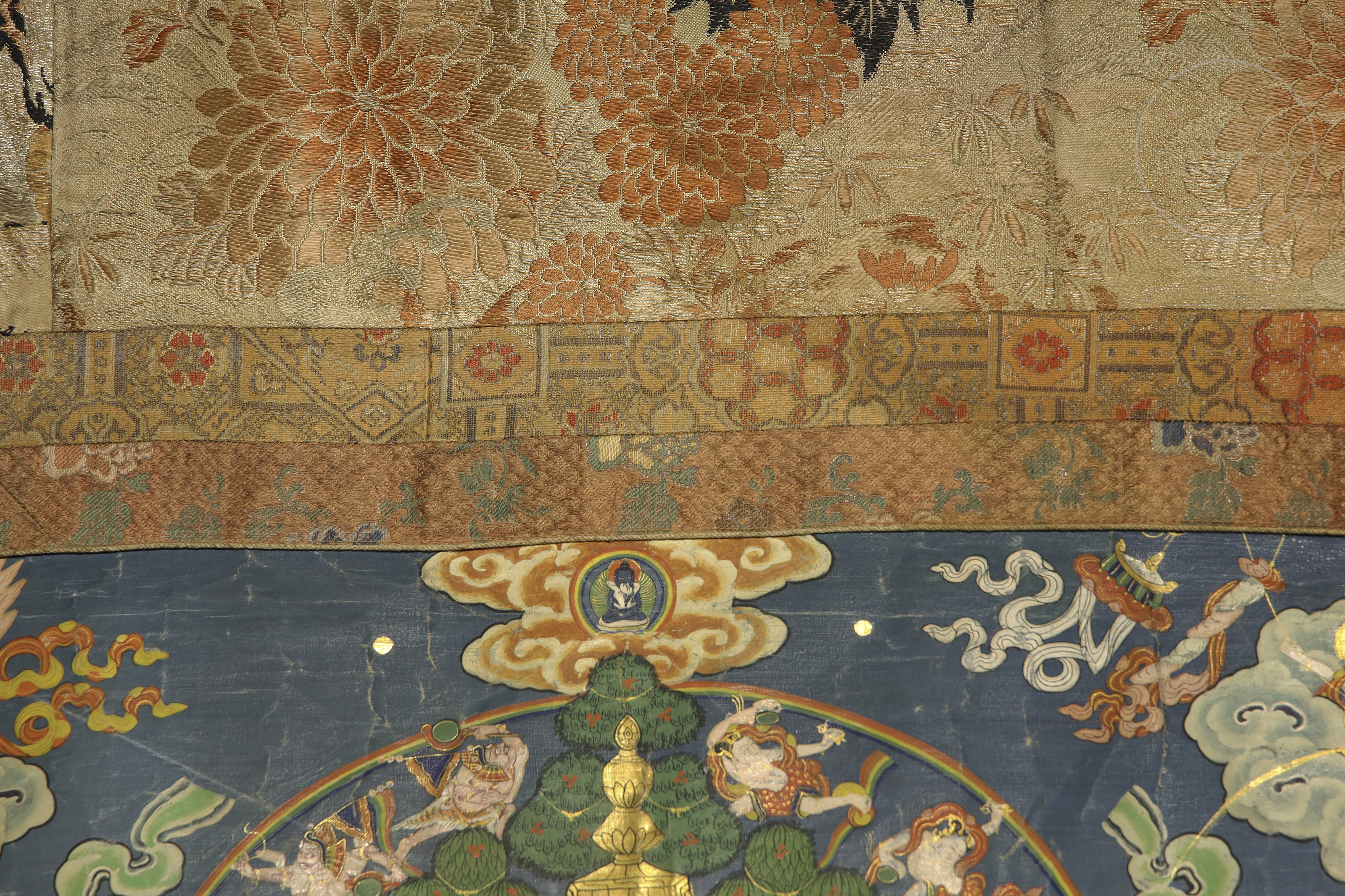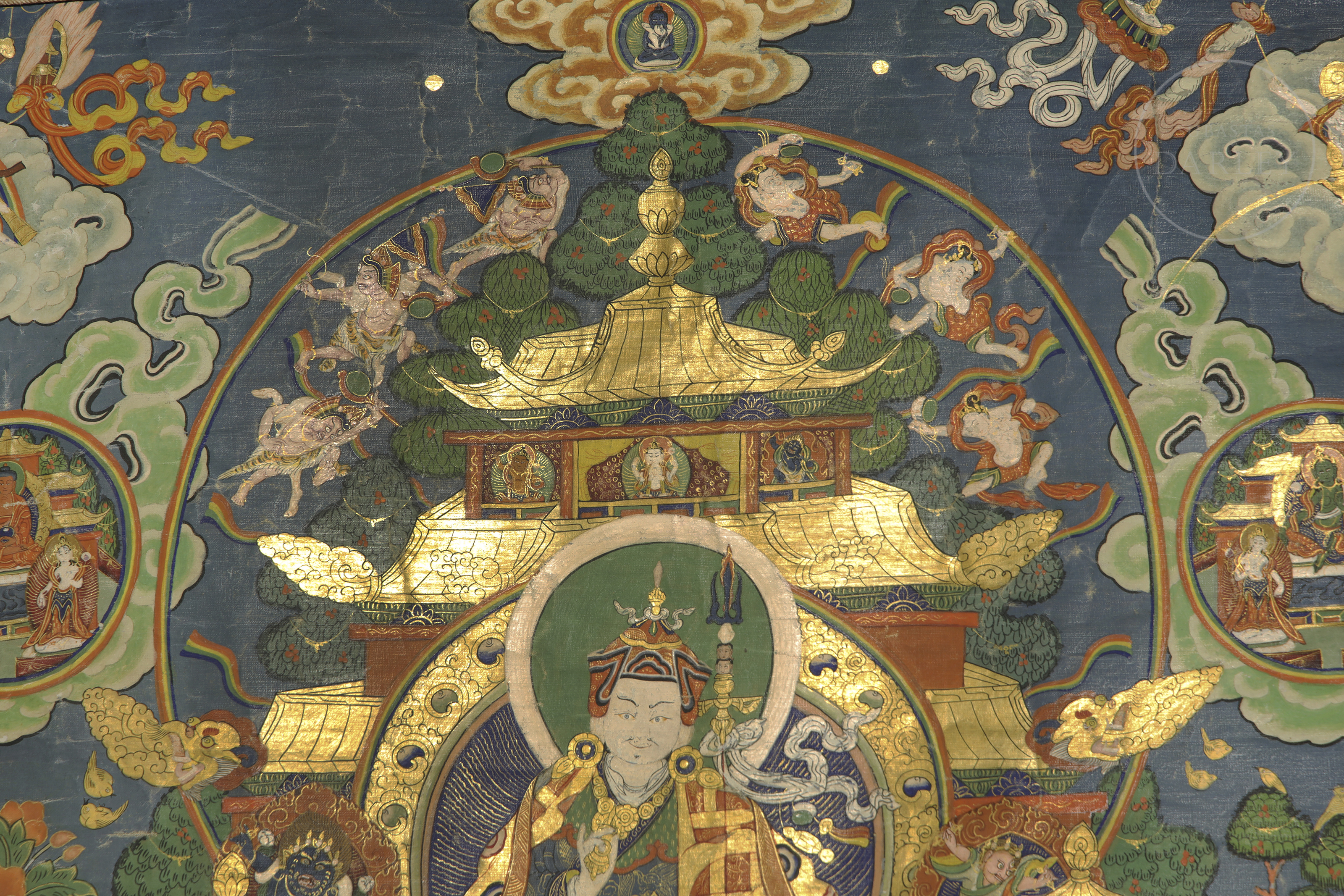 Thangka tibetano realizado con pigmentos y oro sobre lienzo de seda japonesa. La composición, de gran complejidad iconográfica, está presidida por la figura de Padmasambhava, sentado en un trono de loto en el centro de su paraíso celestial. Sostiene sus atributos característicos tántricos: el vajra, la kapala y el khatvanga. A su alrededor se dispone jerárquicamente un completo panteón de lamas, deidades y discípulos, conformando una asamblea sagrada, mostrando a su izquierda, en rojo, está el Buda del Oeste Amithaba y a su derecha a Tara verde, protectora contra los peligros. La pintura está enmarcada por su marco original tradicional de seda brocada, y cubierta con su velo protector. Tíbet, s. XVIII o posterior.