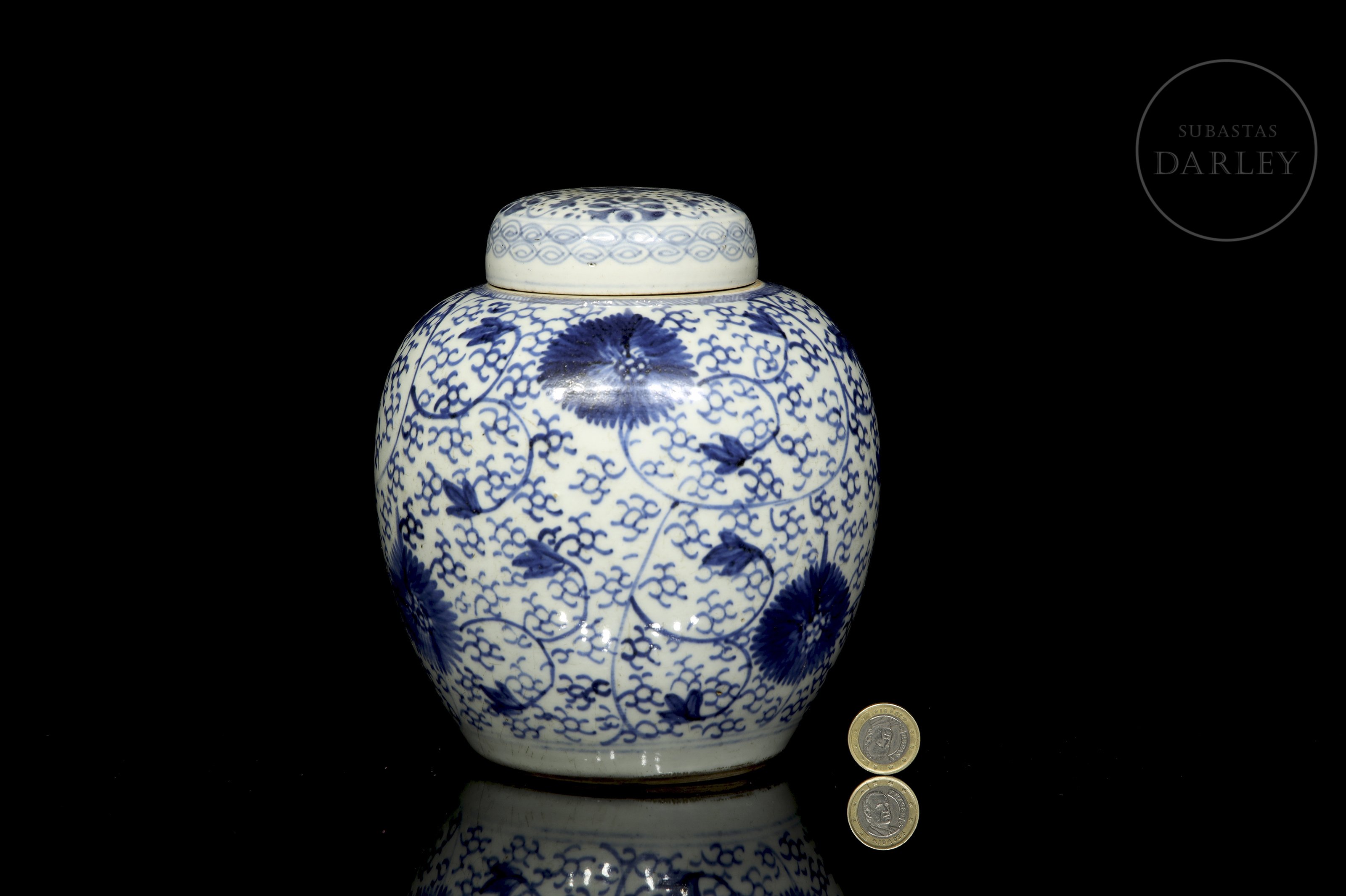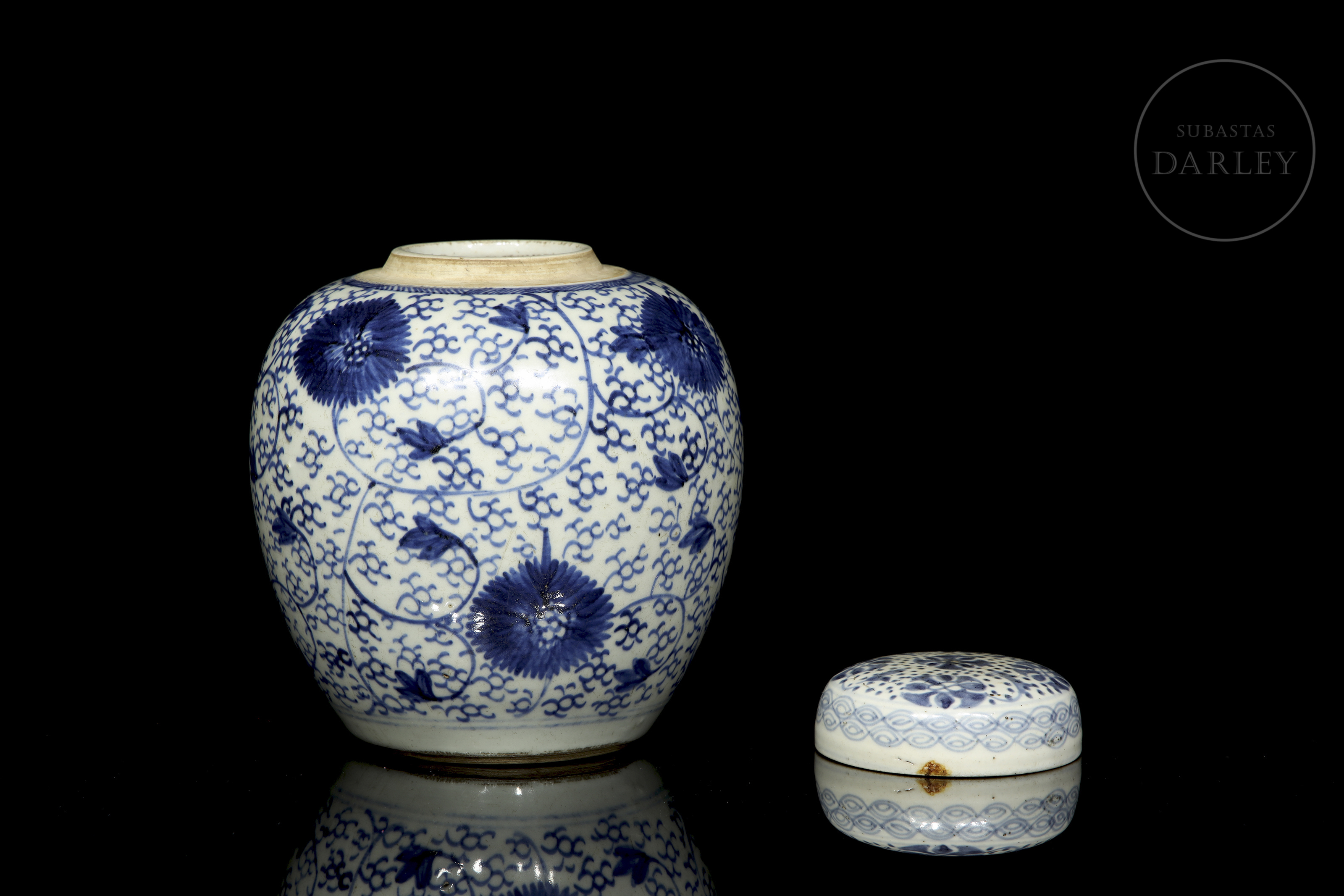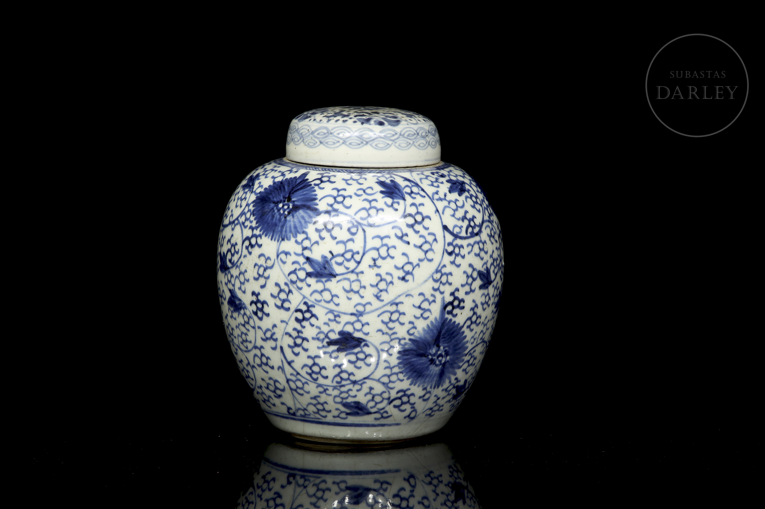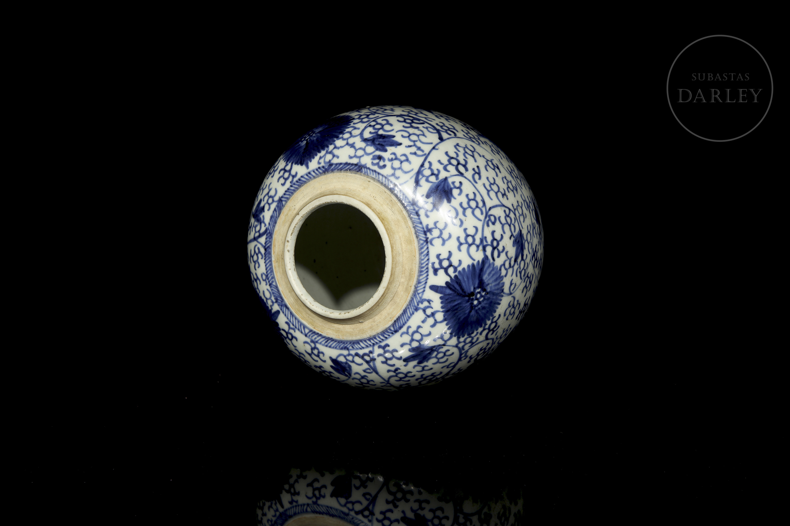 Tibor de porcelana esmaltada en azul y blanco "Crisantemos", s.XX