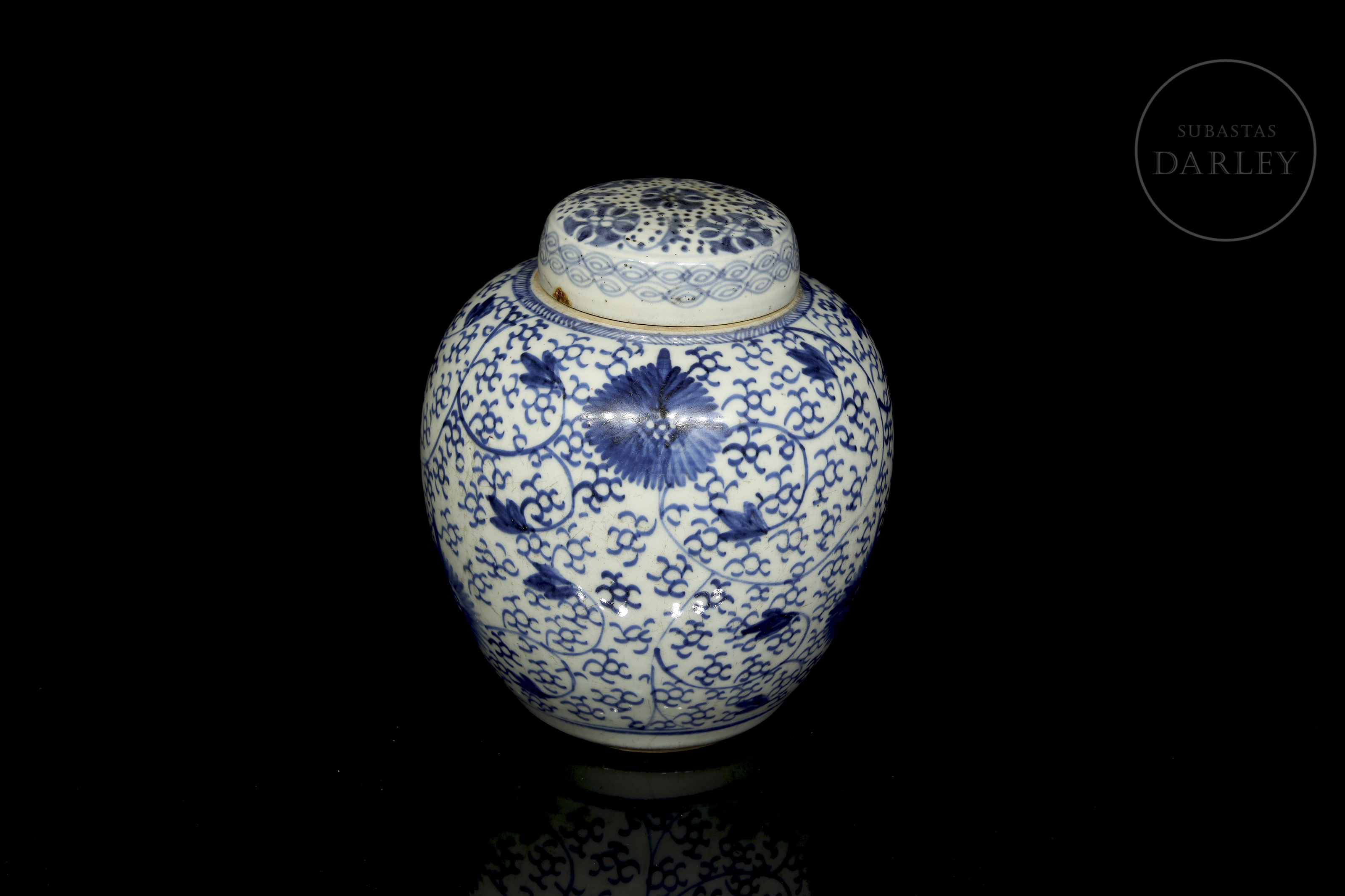 Tibor de porcelana esmaltada con decoración bajo vidriado de fondo blanco y decoración en azul cobalto. Posee un cuerpo globular que se estrecha en la base y cuello, rematado con una tapa a juego. Decorado con un patrón floral de crisantemos y volutas.