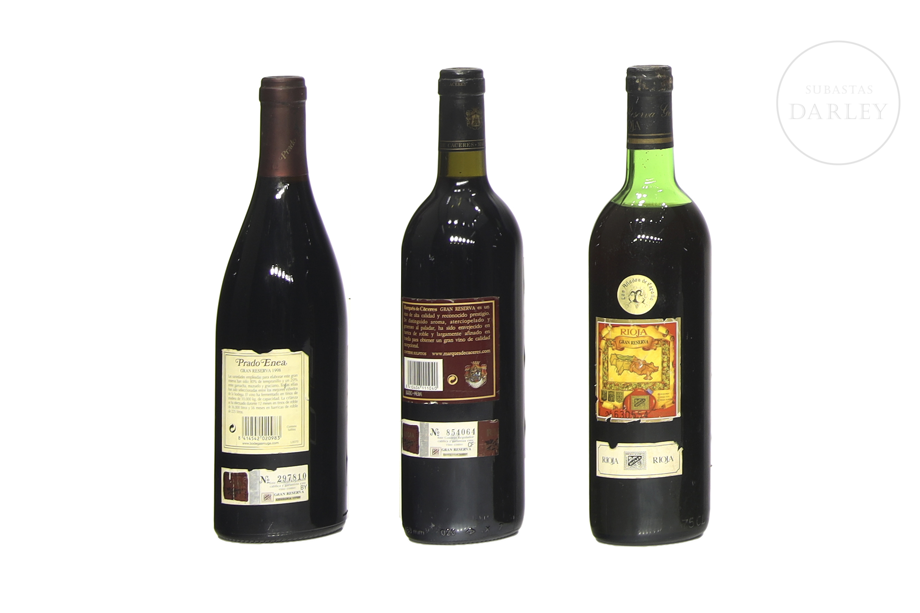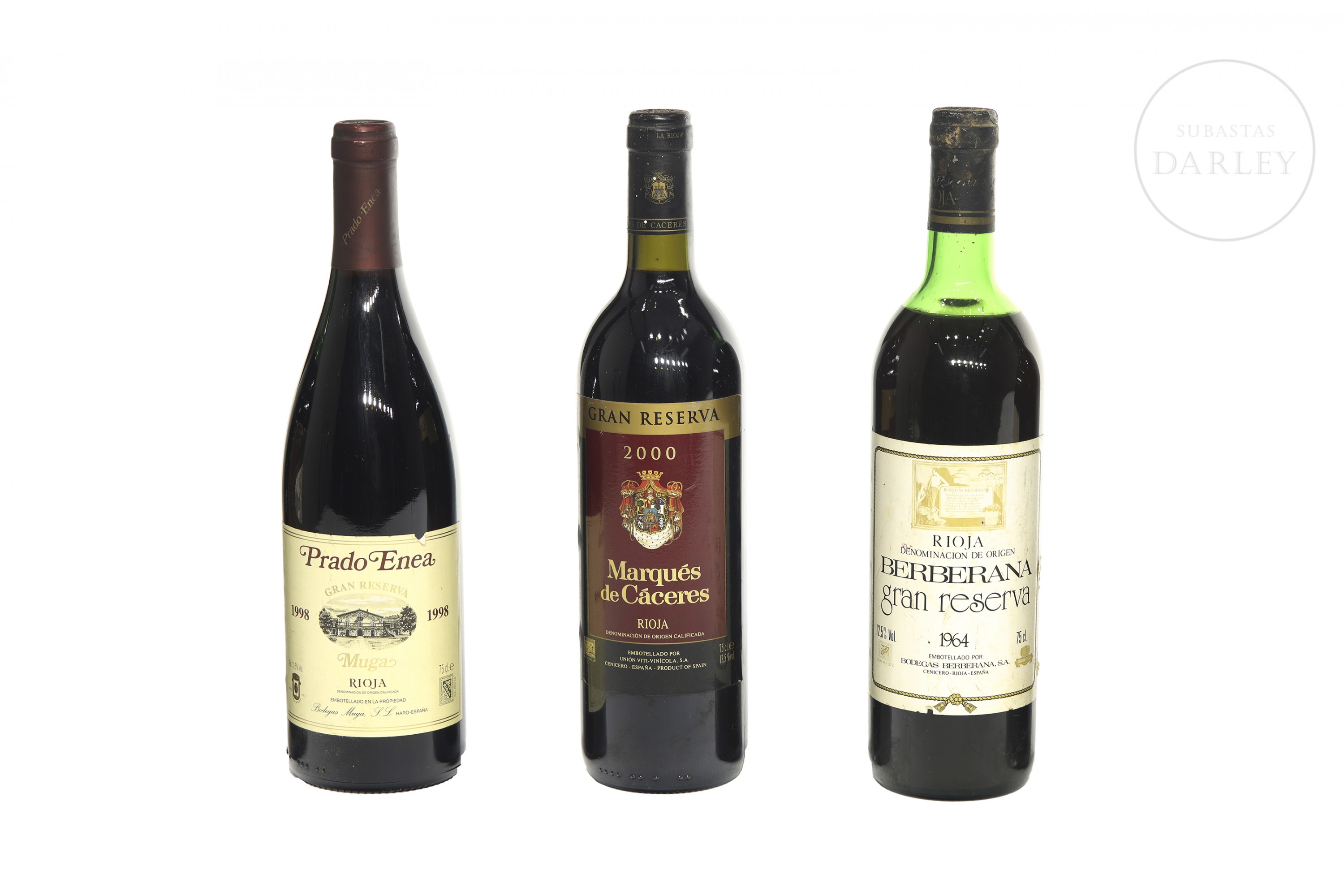 Lote compuesto por tres botellas de vino tinto de la D.O.Ca. Rioja: Muga Prado Enea Gran Reserva 1998, Marqués de Cáceres Gran Reserva 2000 y Berberana Gran Reserva 1964.