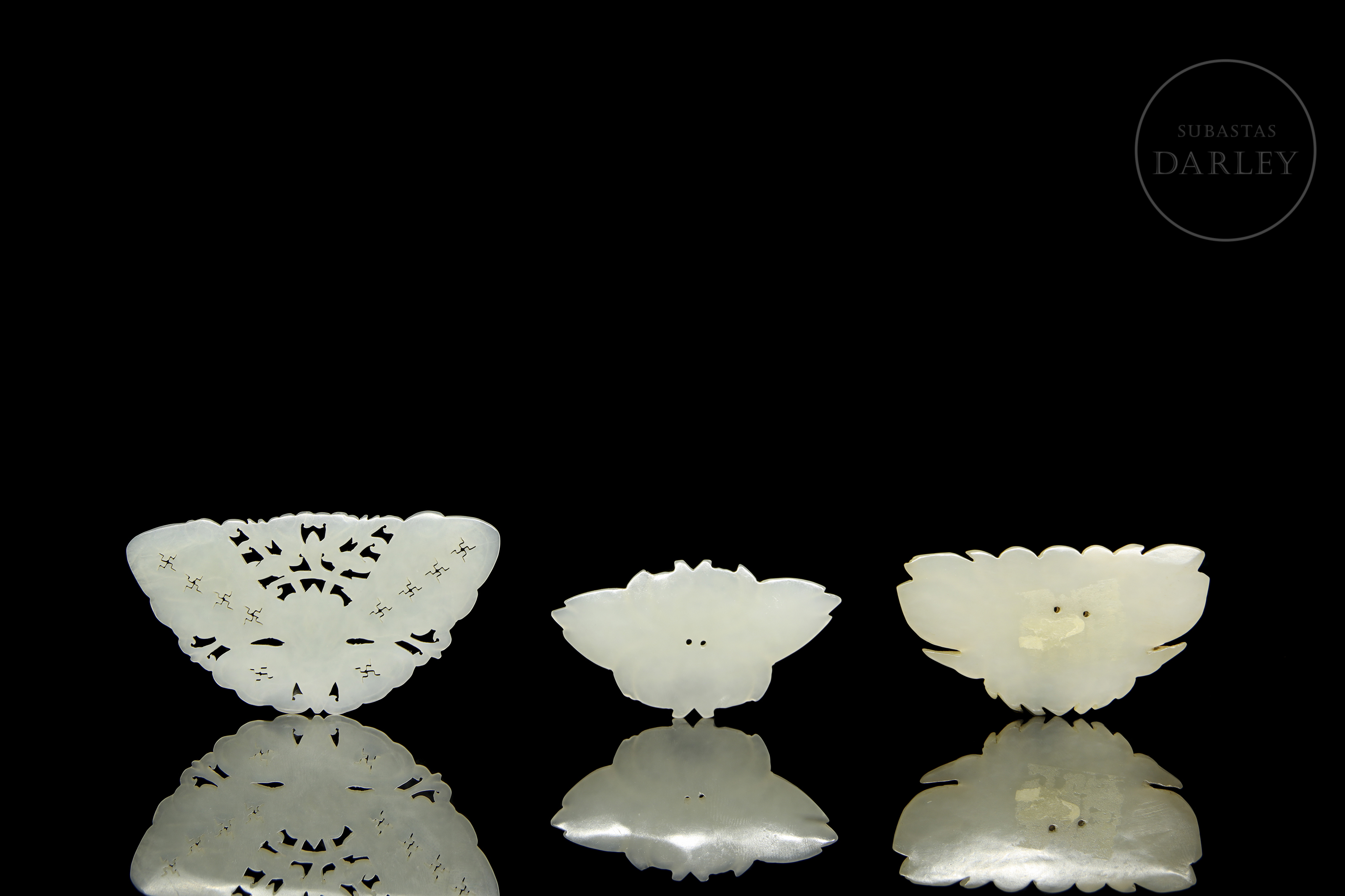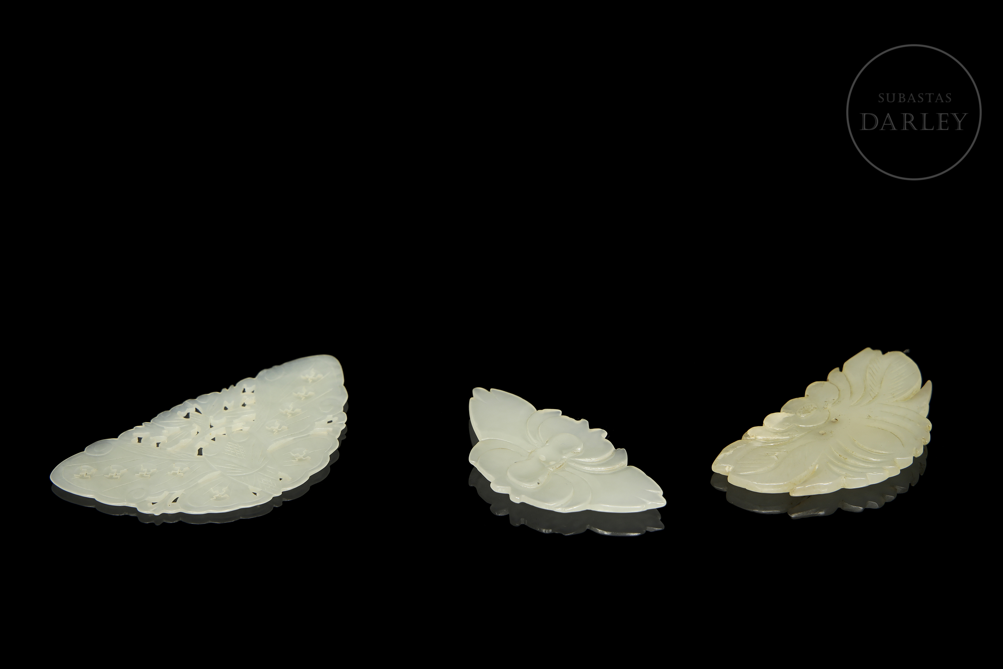 Conjunto formado por tres piezas finamente trabajadas en jade de tono blanquecino, cada una representando motivos naturalistas de flores e insectos. La talla destaca por la minuciosidad de los calados y el pulido que resalta la translucidez de la piedra. Dinastía Qing (1644-1912).