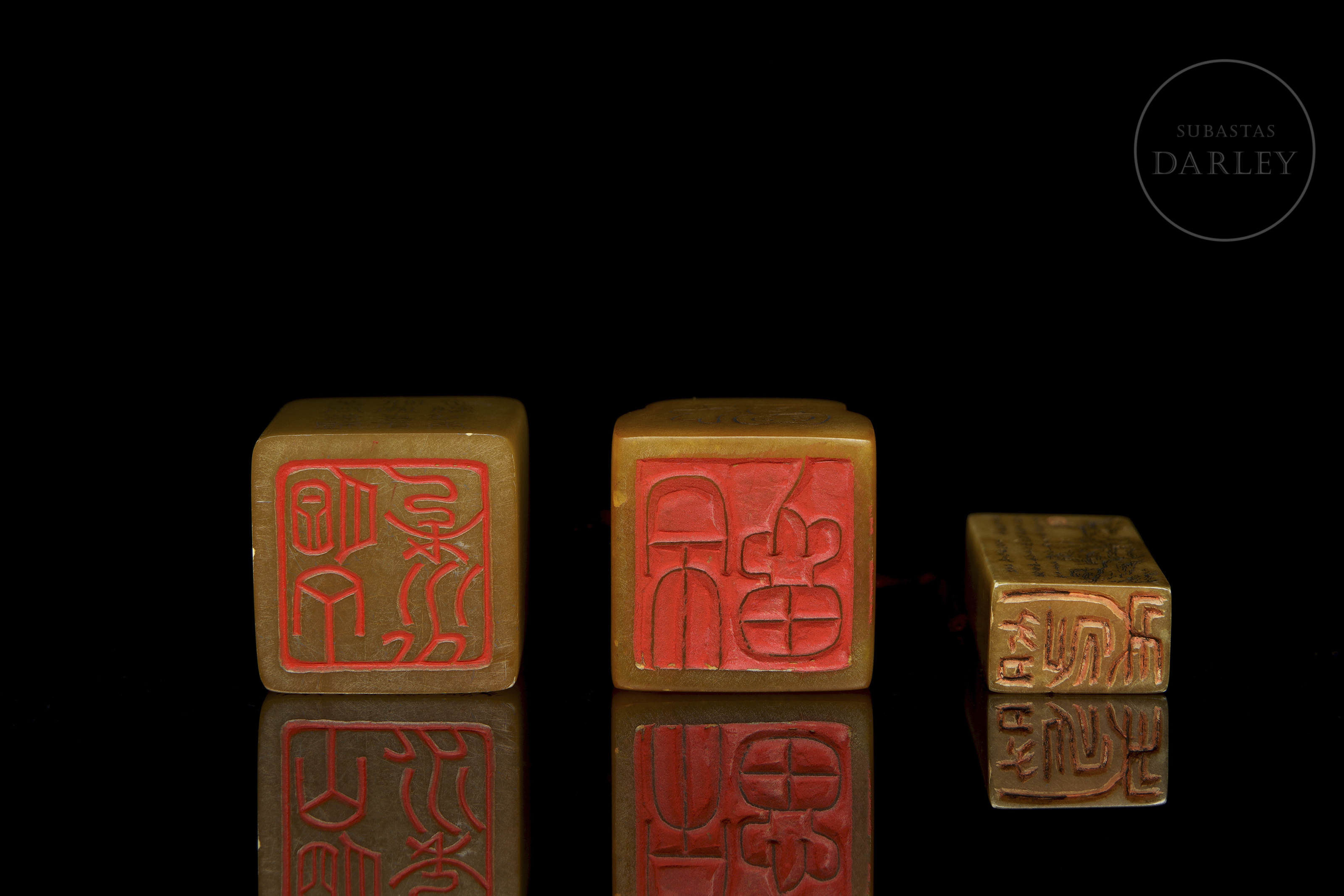 Tres sellos de piedra shoushan de tonalidad ámbar. Dos de las piezas son de formato cúbico o rectangular, finamente grabadas con escenas de montañas, flores y poemas. La tercera pieza, de formato rectangular escalonado, presenta caracteres en dos de sus caras. Las tres piezas muestran caracteres de sello en bajorrelieve con restos de lacre rojo.