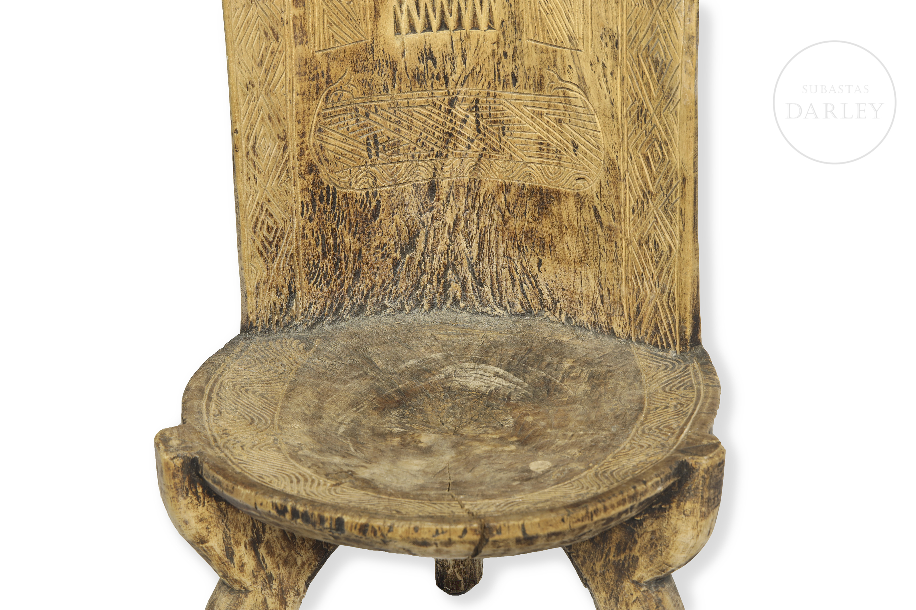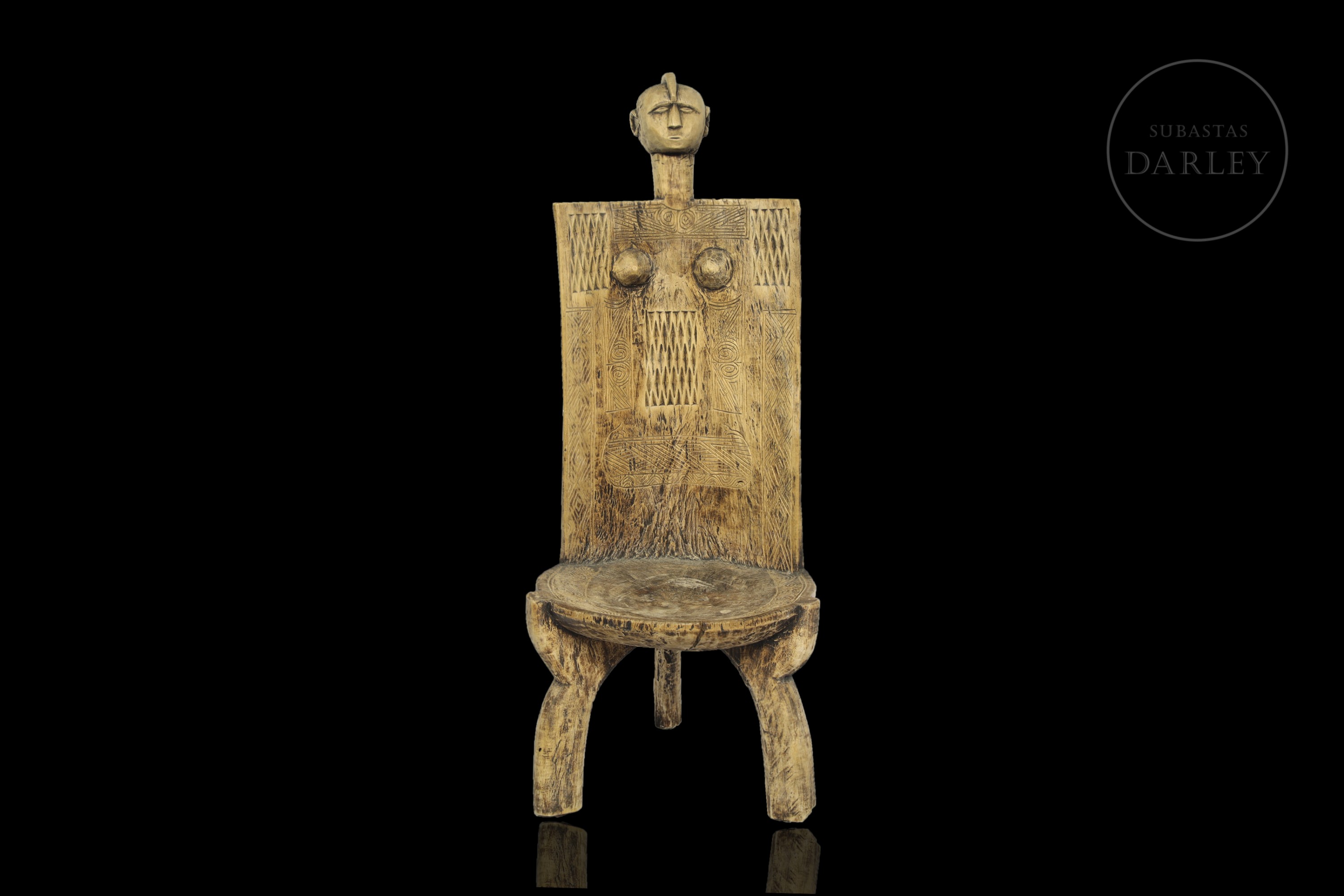 Silla tradicional de origen africano elaborada en madera tallada. Presenta atributos humanos como cabeza o senos femeninos, así como motivos geométricos tribales.