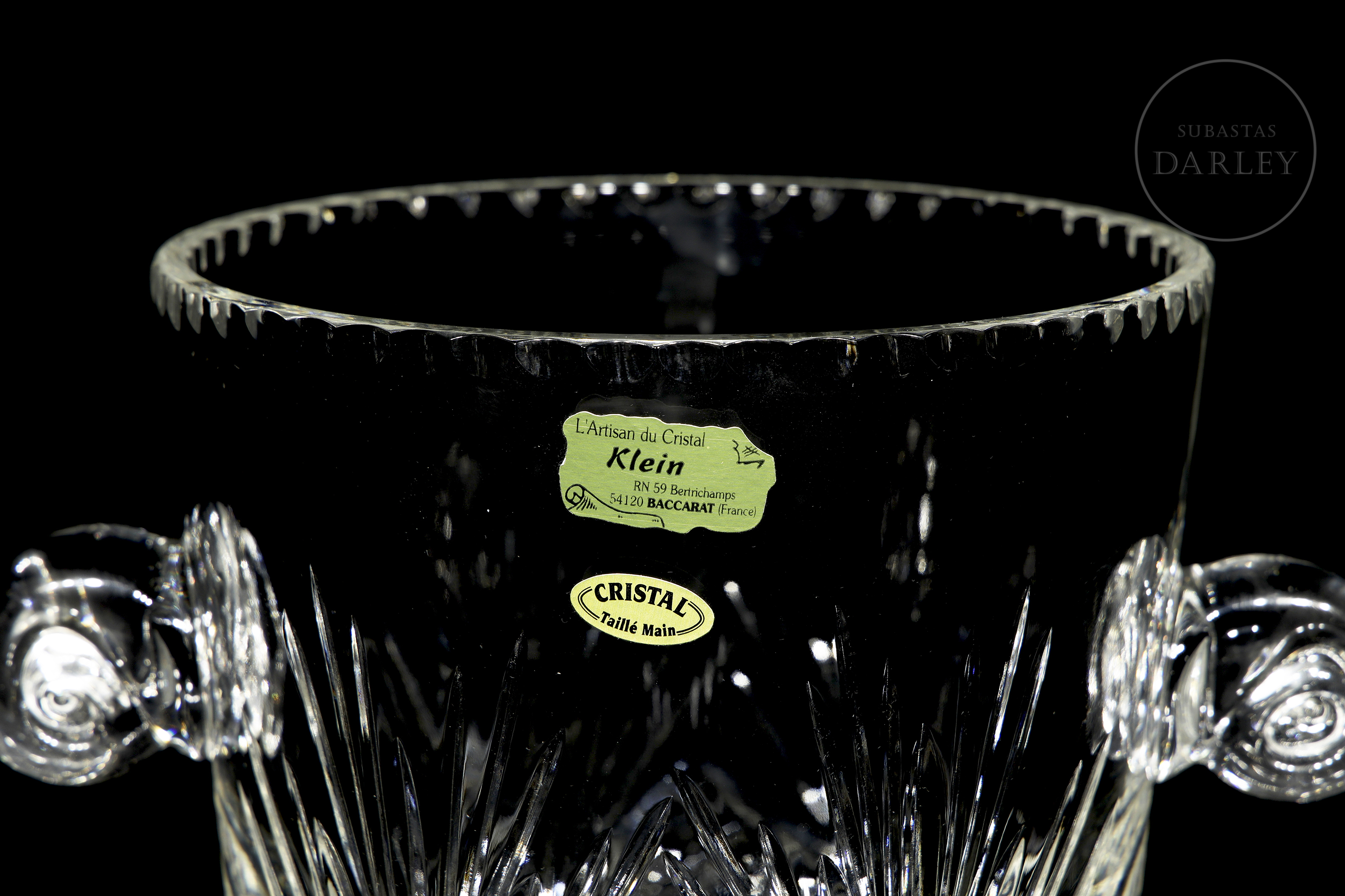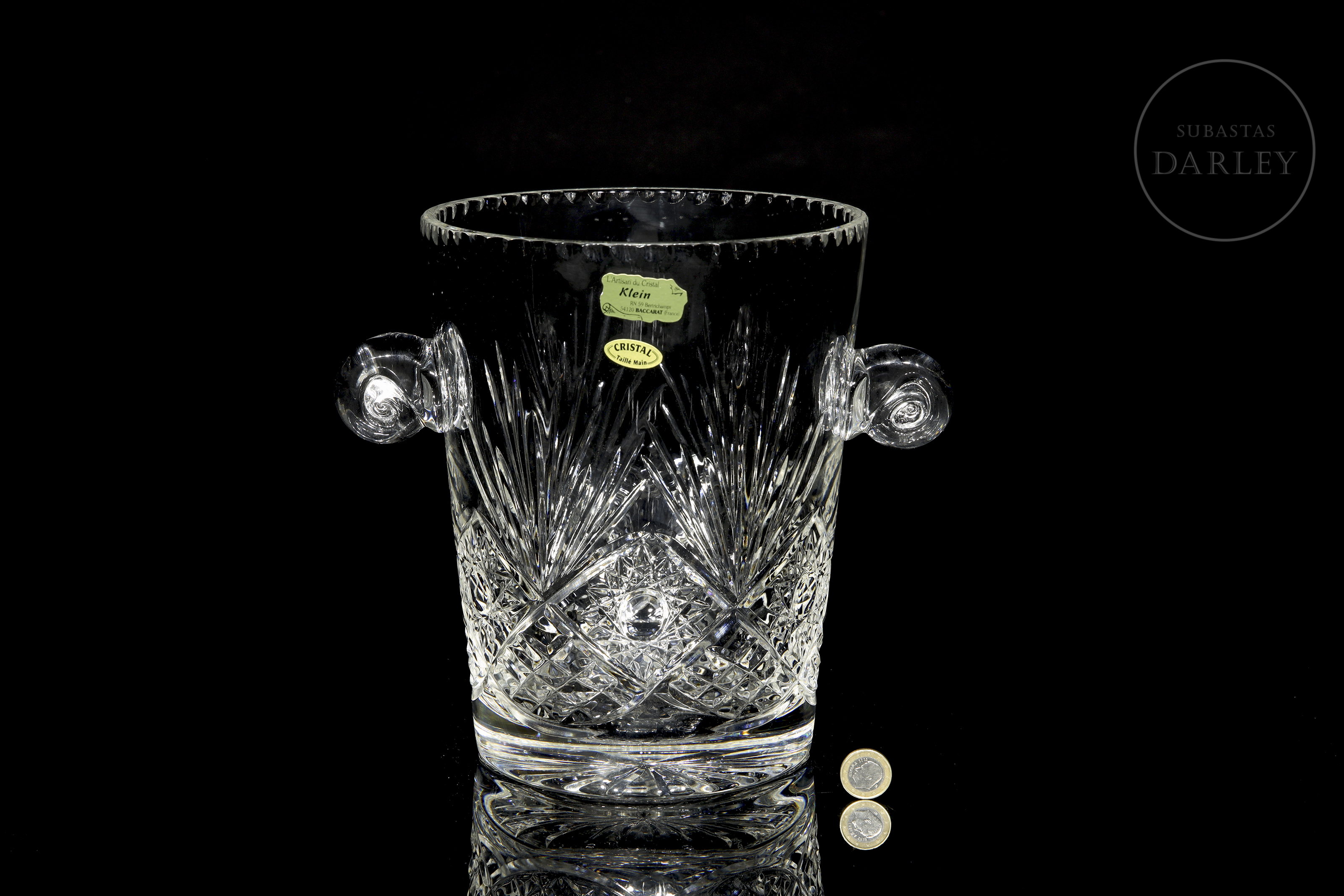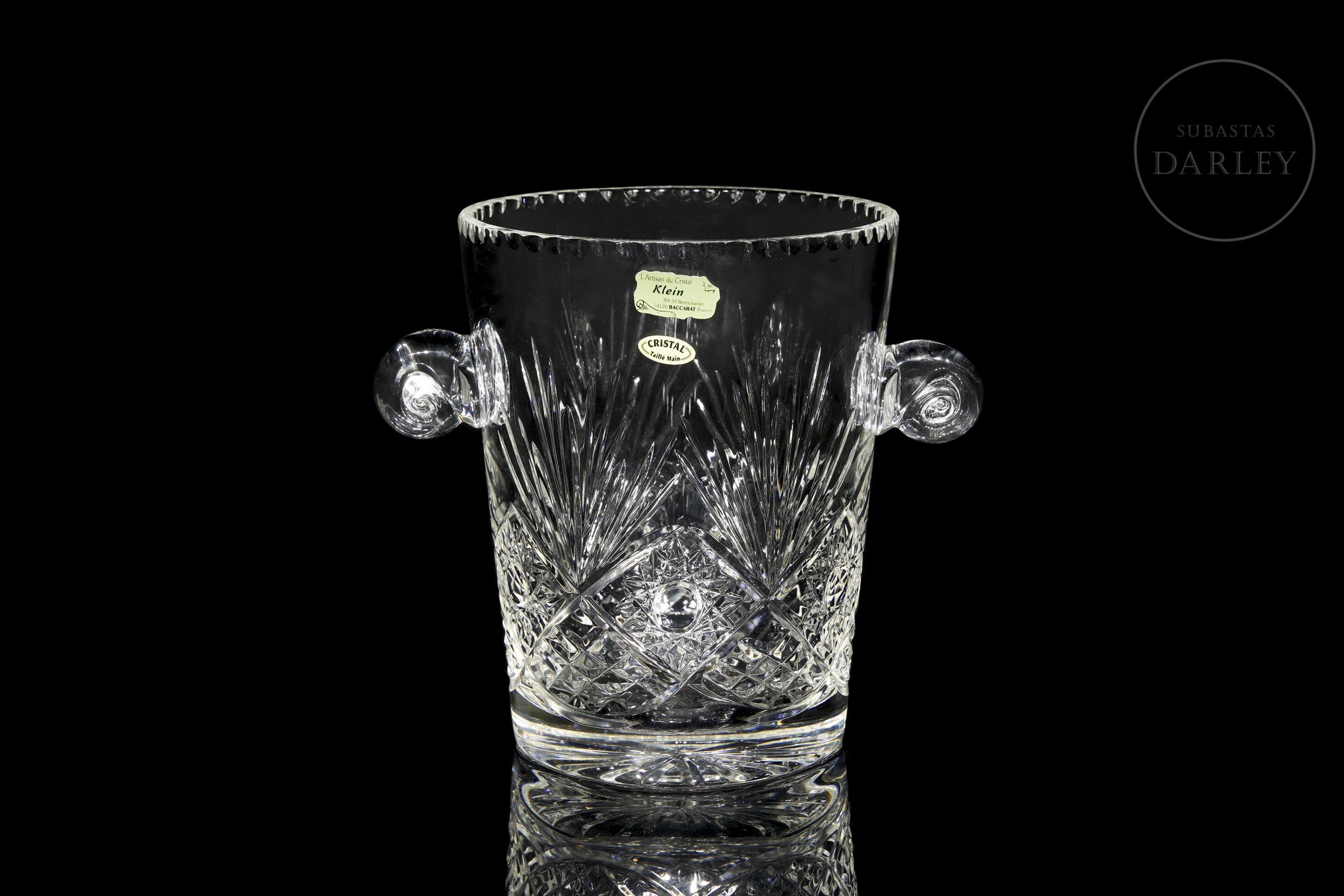 Recipiente para enfriar botellas realizado en cristal con profusa decoración tallada de motivos radiales y geométricos. Presenta dos asas laterales en forma de voluta y un borde superior dentado. Presenta etiquetas de "L’Artisan du Cristal - Klein - Baccarat (France)" y "CRISTAL Taillé Main" en el frente, además de sello inciso en la base. Con caja.