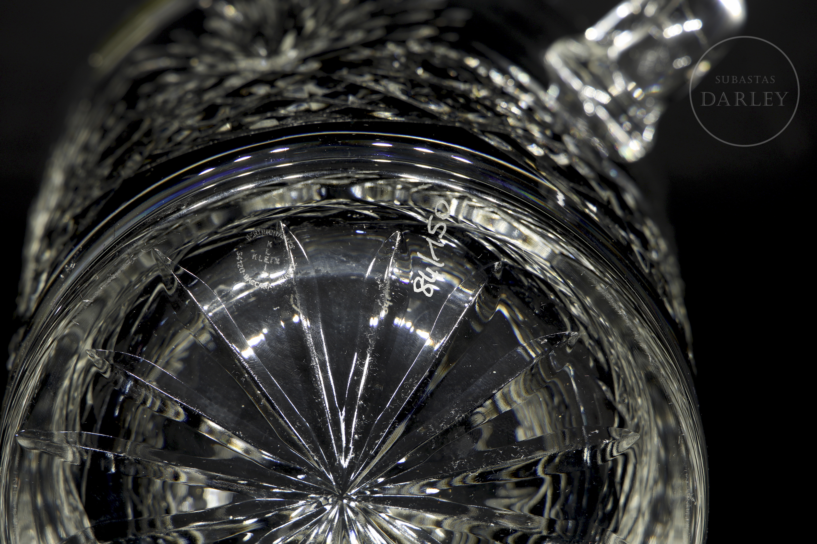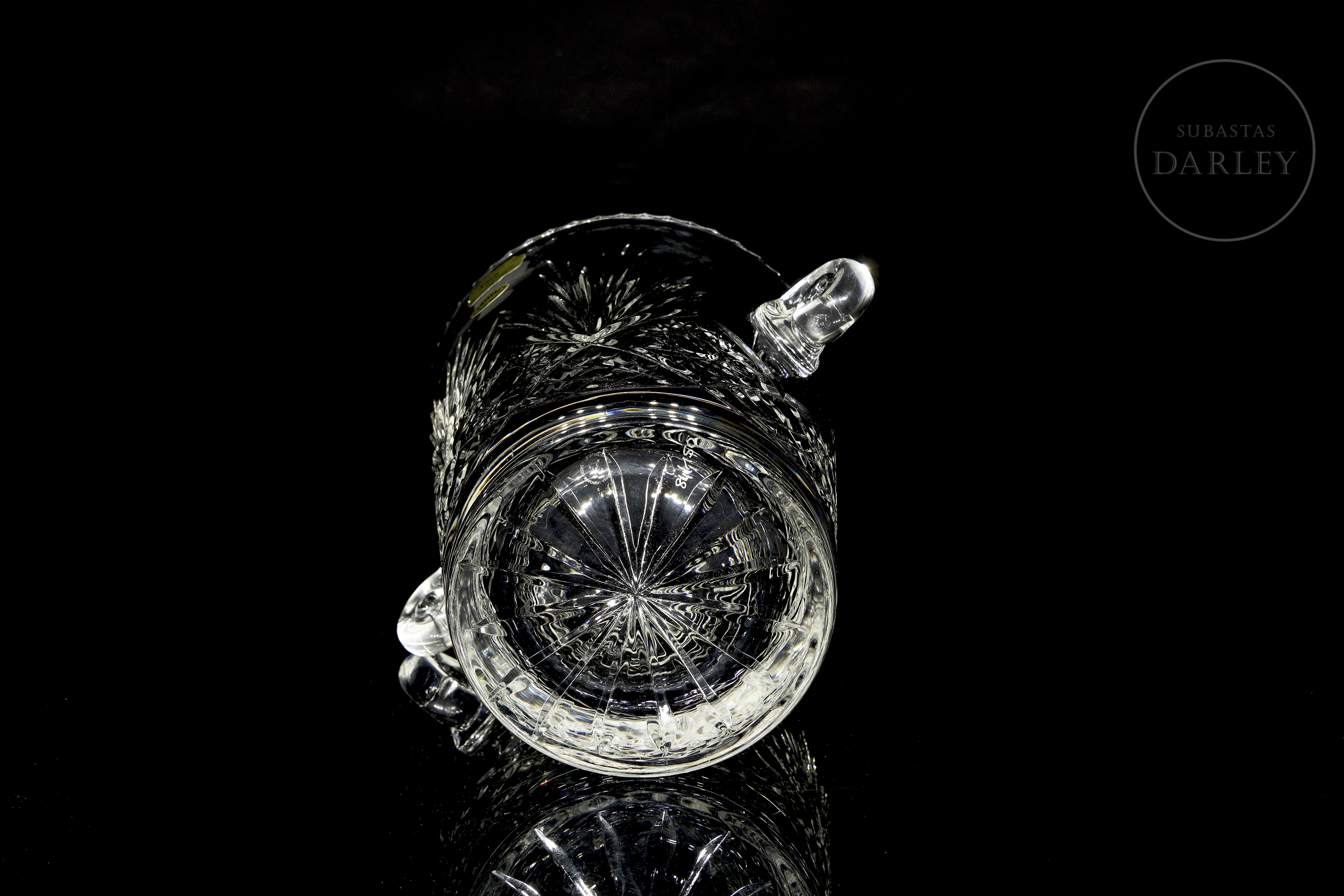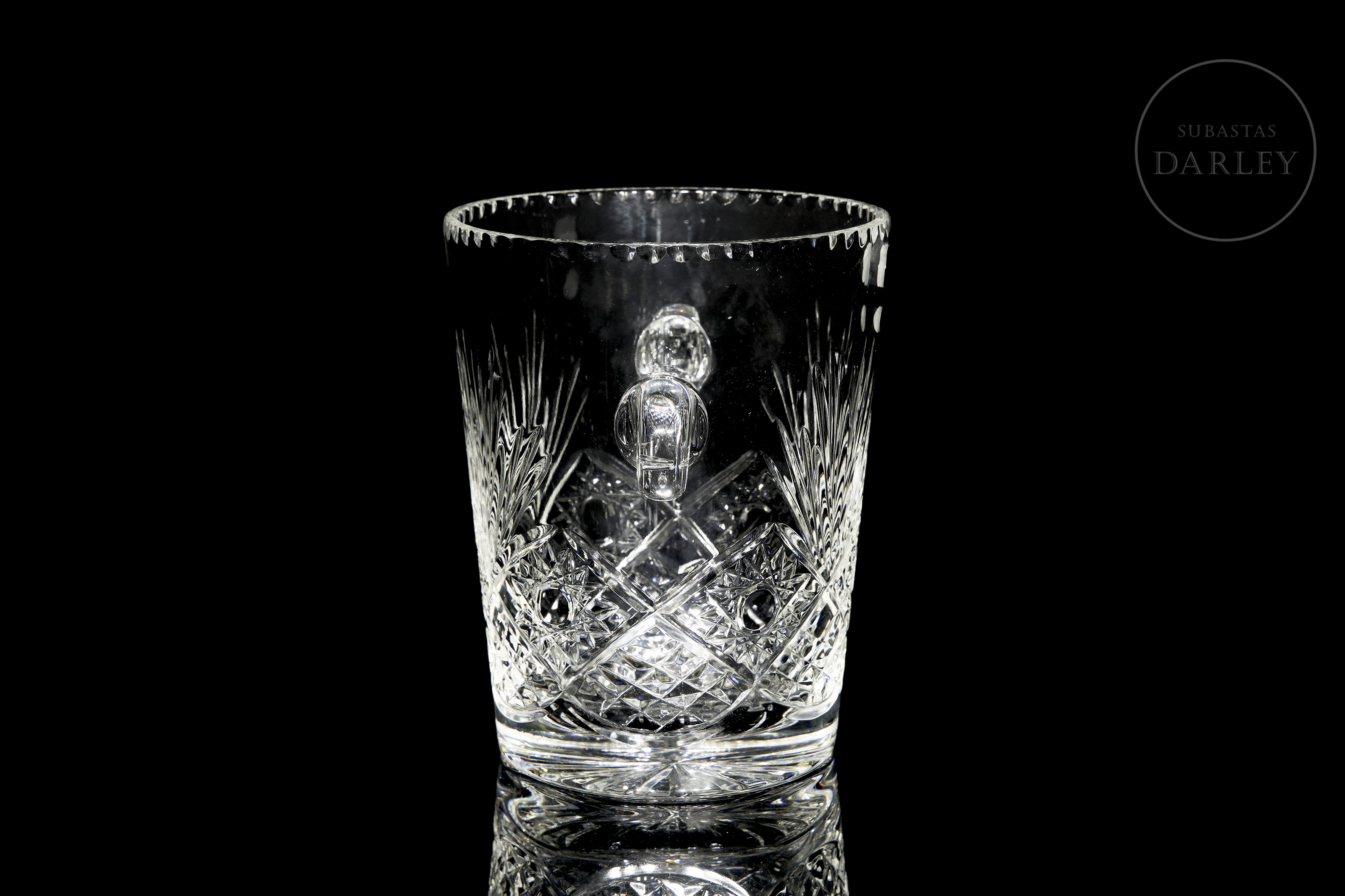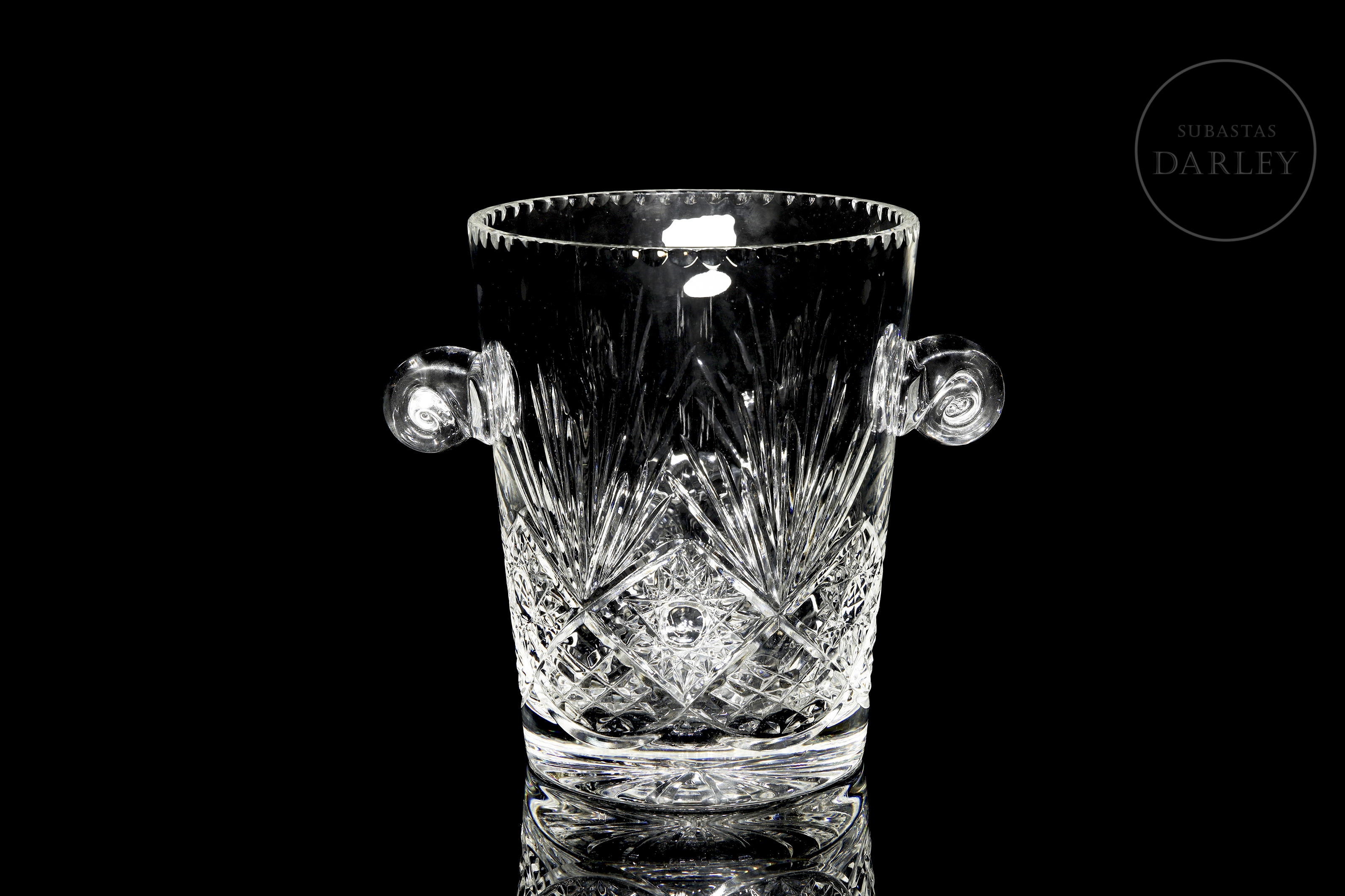 Recipiente para enfriar botellas realizado en cristal con profusa decoración tallada de motivos radiales y geométricos. Presenta dos asas laterales en forma de voluta y un borde superior dentado. Presenta etiquetas de "L’Artisan du Cristal - Klein - Baccarat (France)" y "CRISTAL Taillé Main" en el frente, además de sello inciso en la base. Con caja.