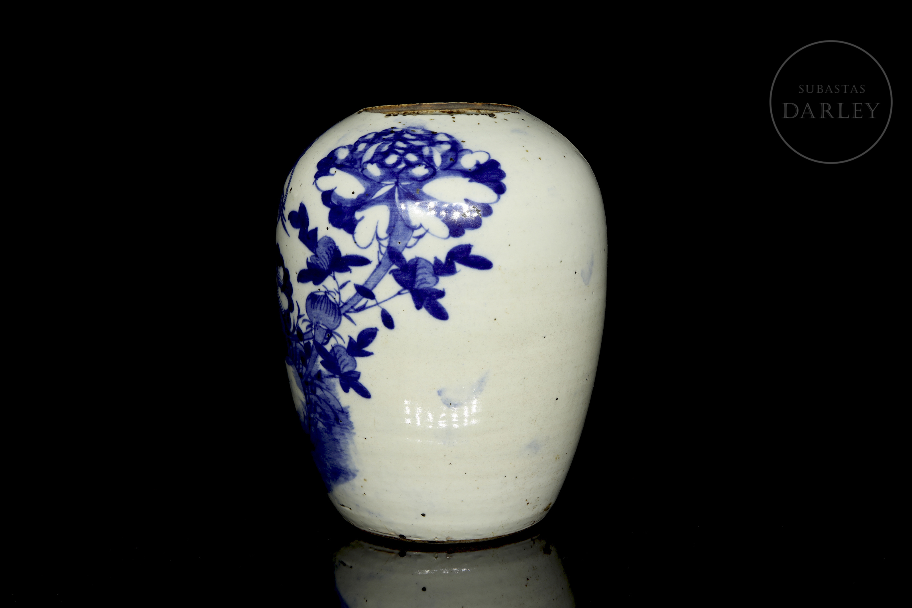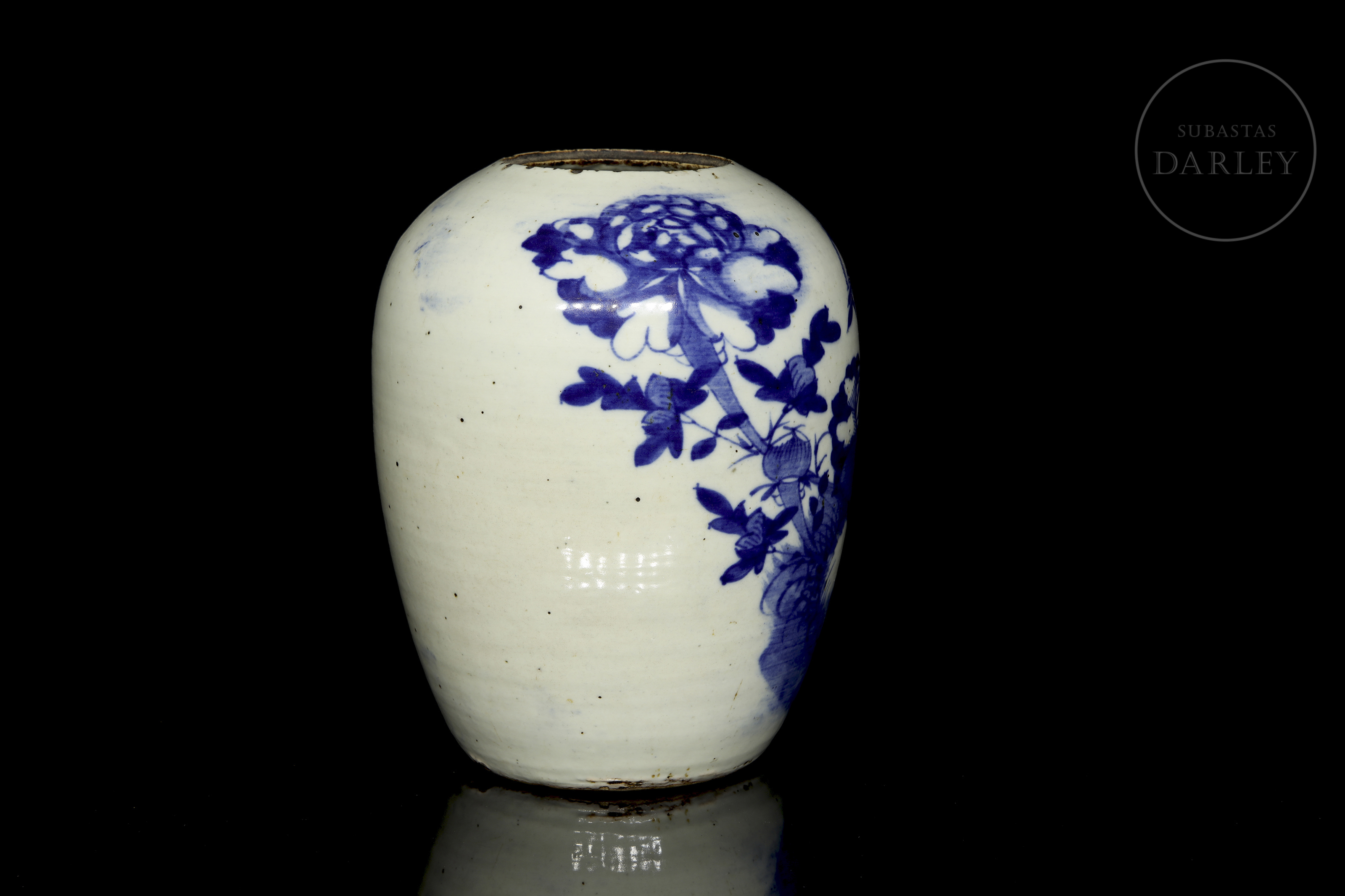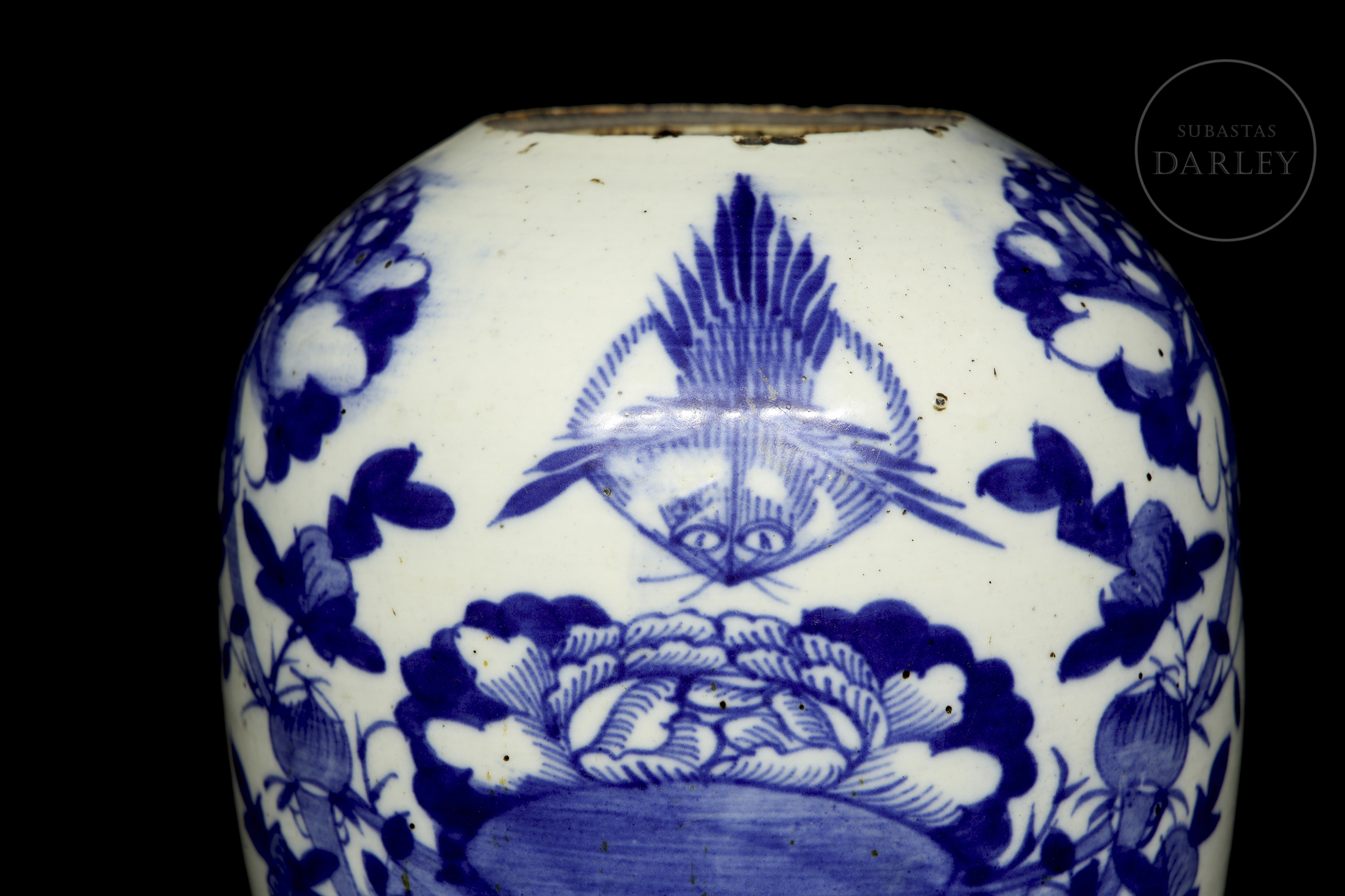 Vasija de porcelana esmaltada con decoración bajo vidriado en blanco y azul cobalto. Posee un cuerpo ovoide, sin cuello. Está decorada con aves estilizadas sobre un frondoso fondo de rocas y peonías en flor, todo ello flanqueado por gruesas ramas. Dinastía Qing (1644-1912).