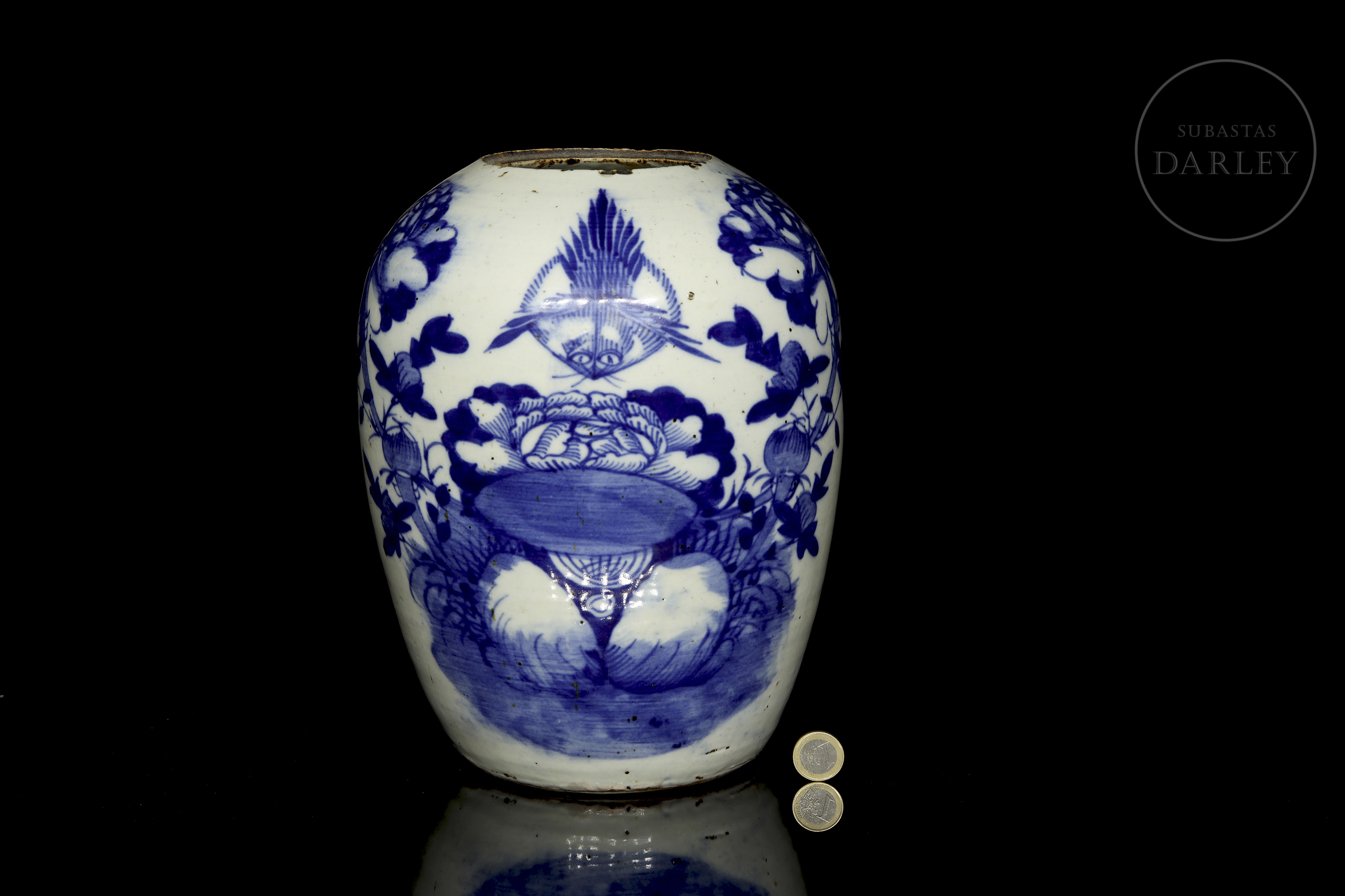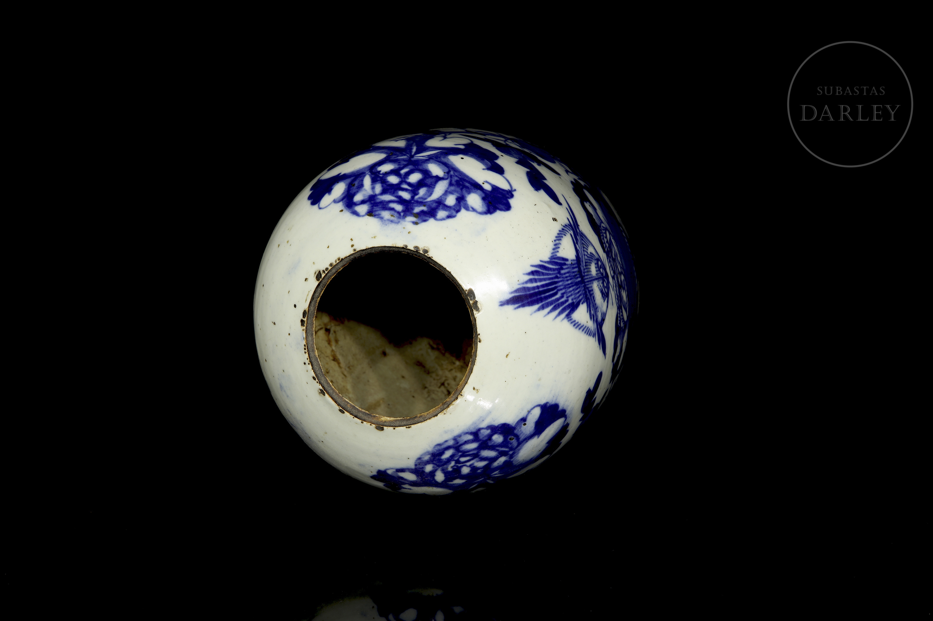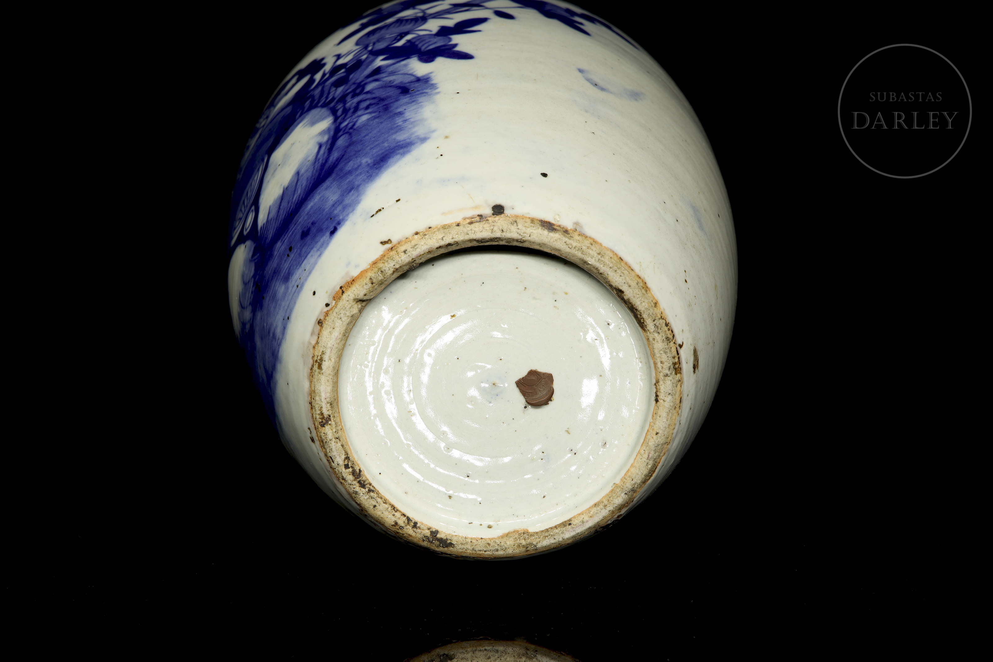 Vasija de porcelana esmaltada con decoración bajo vidriado en blanco y azul cobalto. Posee un cuerpo ovoide, sin cuello. Está decorada con aves estilizadas sobre un frondoso fondo de rocas y peonías en flor, todo ello flanqueado por gruesas ramas. Dinastía Qing (1644-1912).
