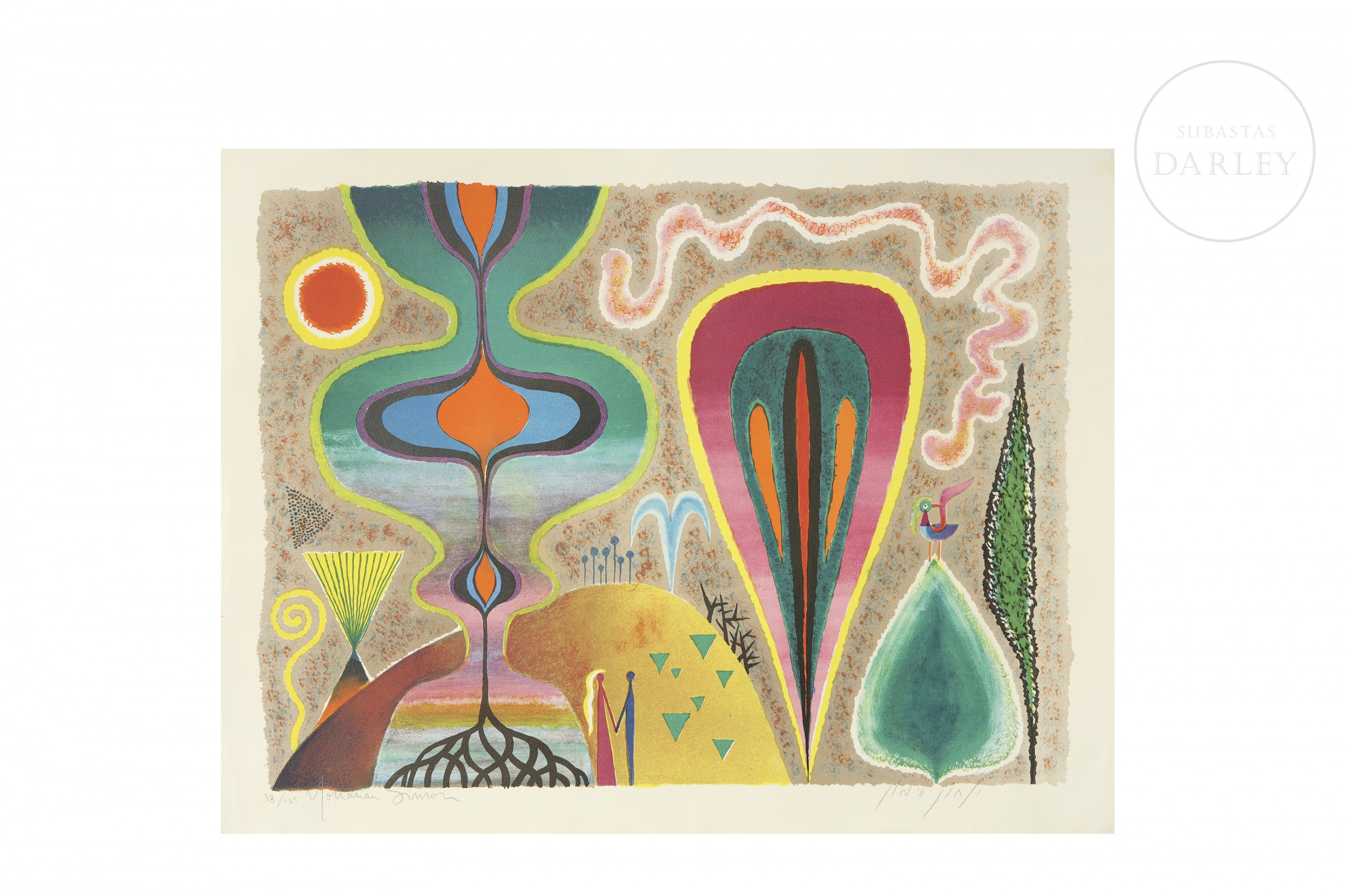 Litografía sobre papel. Composición surrealista y abstracta de gran riqueza cromática que presenta formas orgánicas y simbólicas integradas en un paisaje onírico. Firmado y numerado "Yohanan Simon - 38/225" en la esquina izquierda inferior; y en hebreo en la esquina derecha inferior.