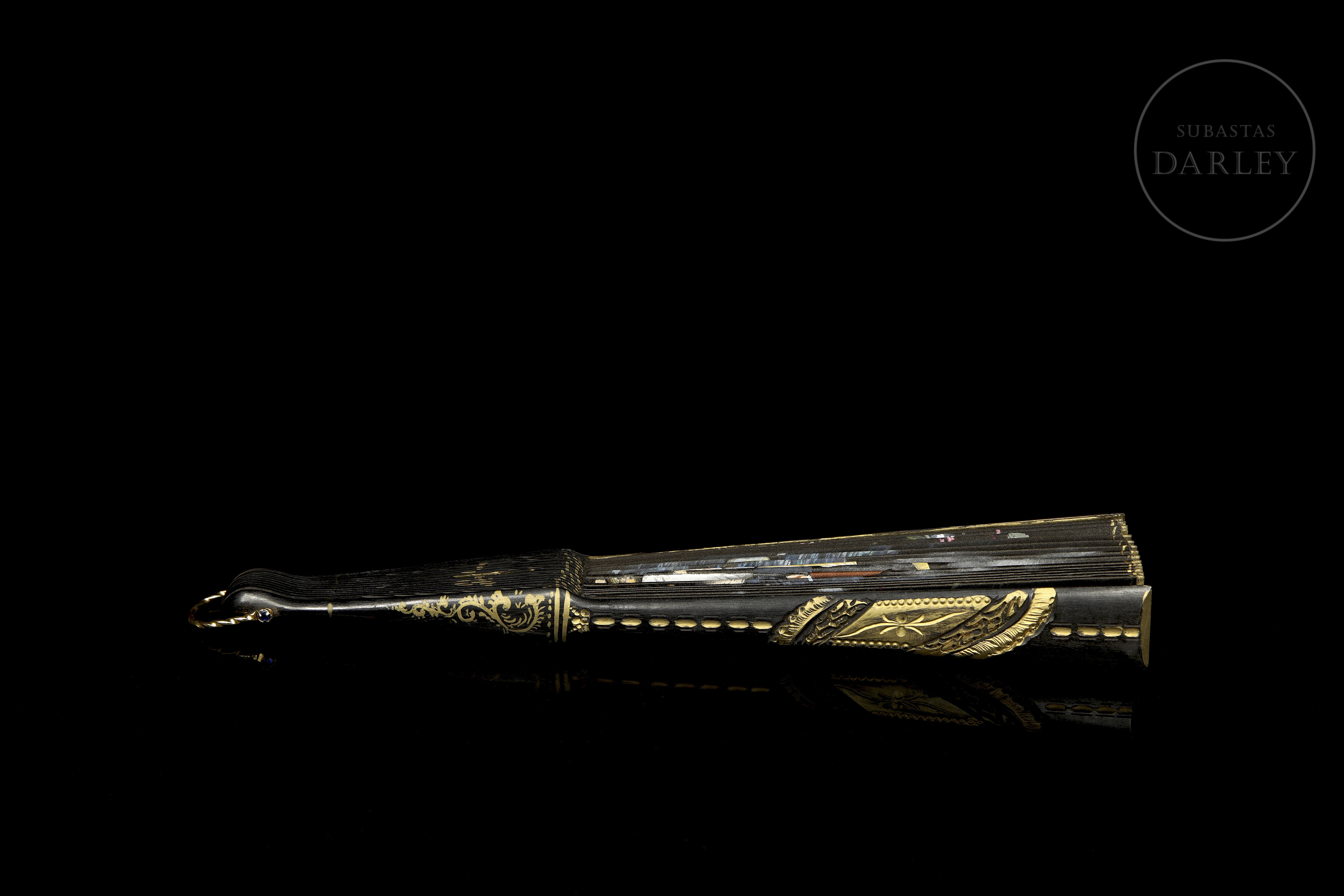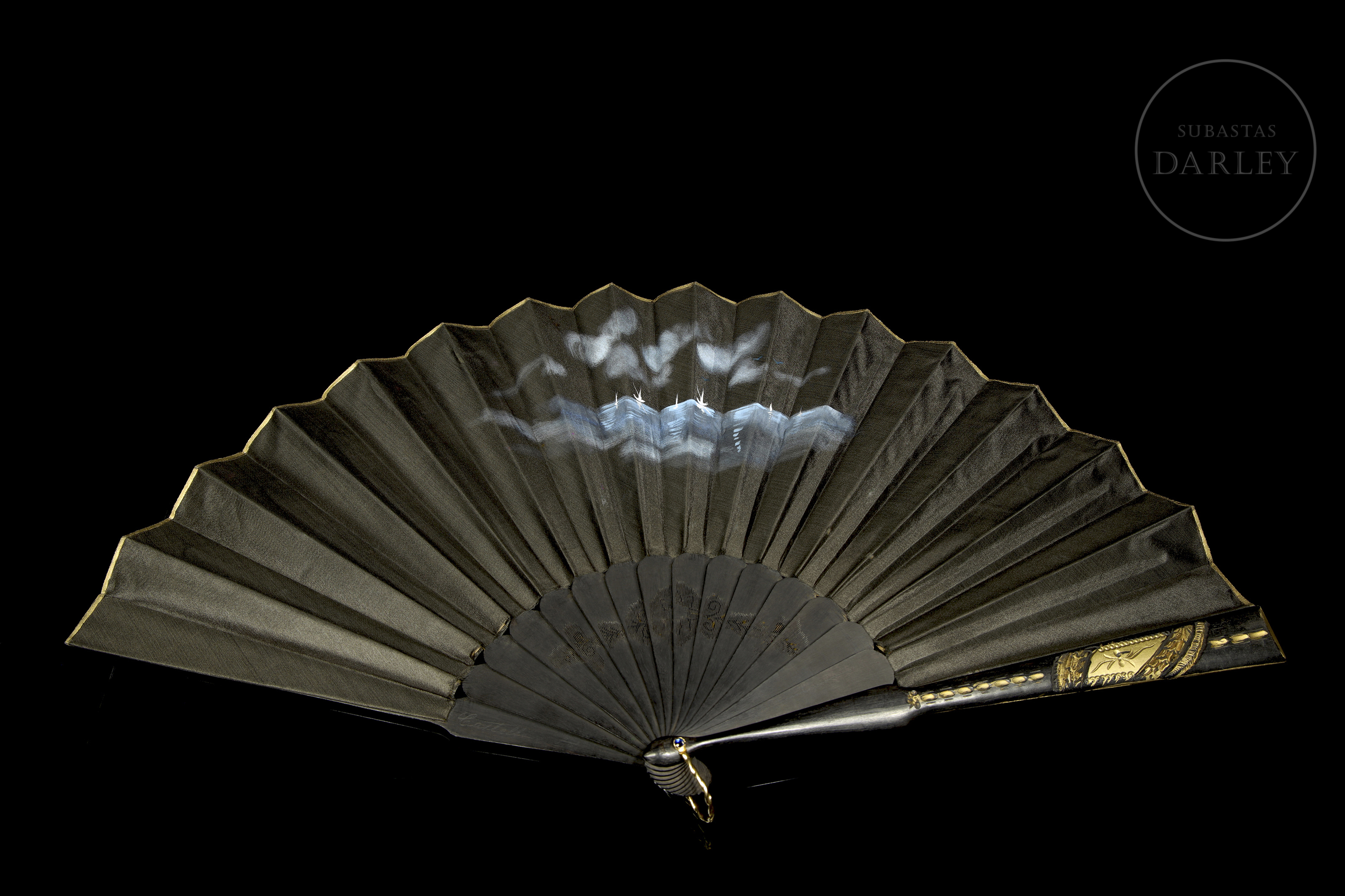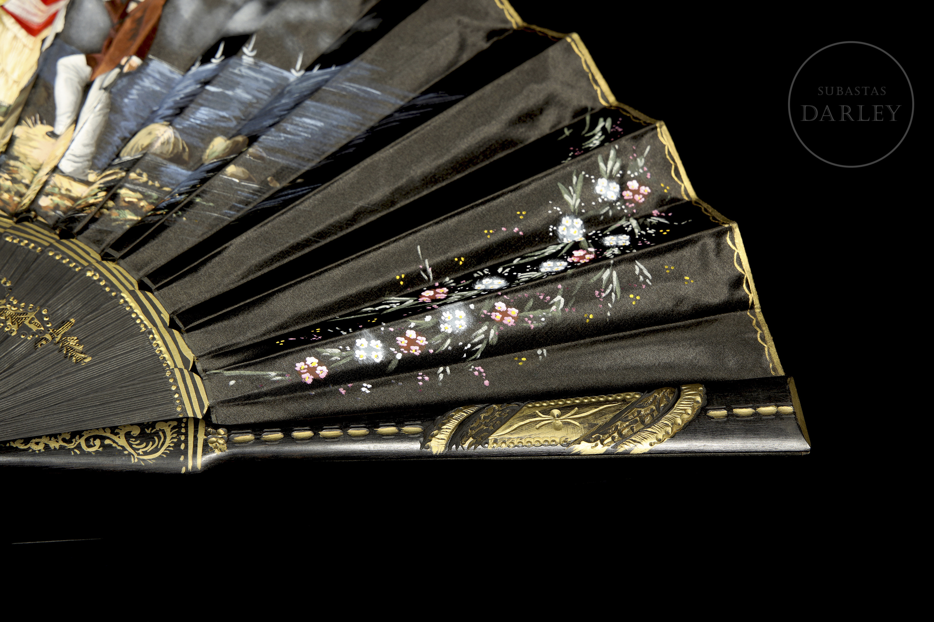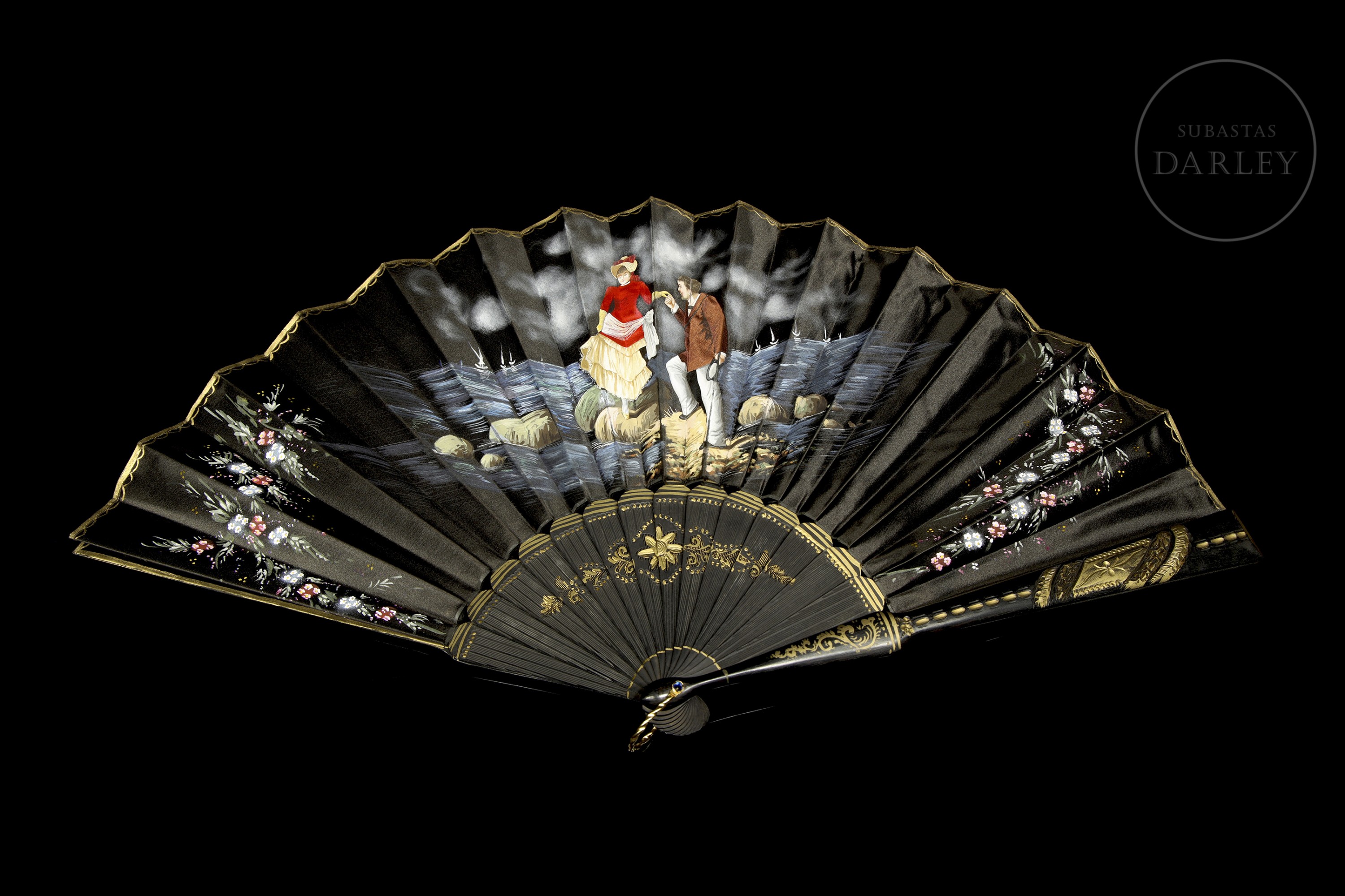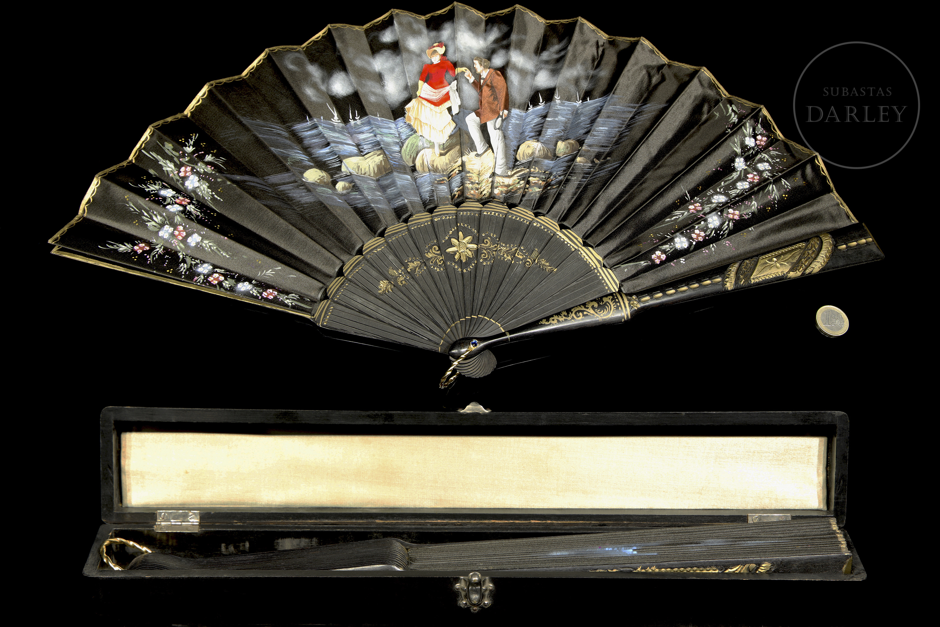 Abanico con país de seda negra. Presenta una escena central pintada a mano de una pareja en un paisaje costero. Los laterales tienen decoración floral, y el varillaje de madera lacada en negro incluye aplicaciones de oro. Incluye caja.
