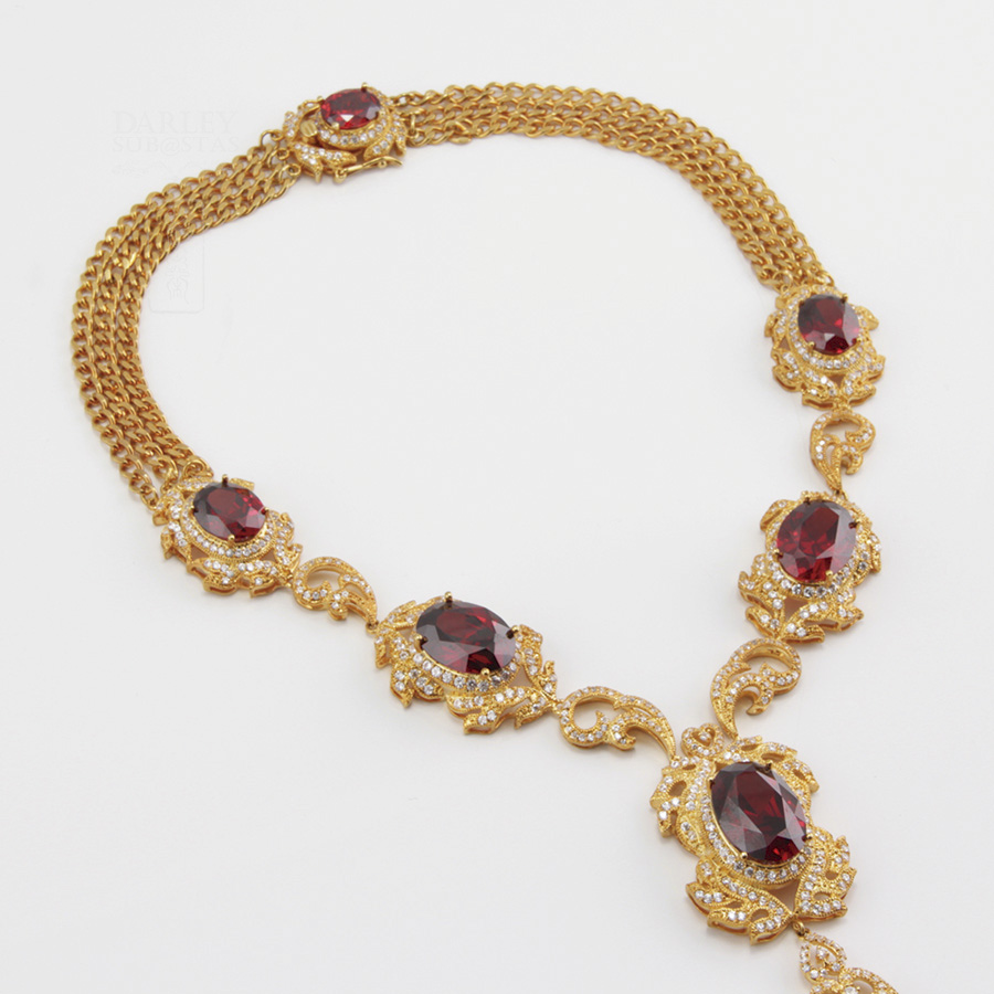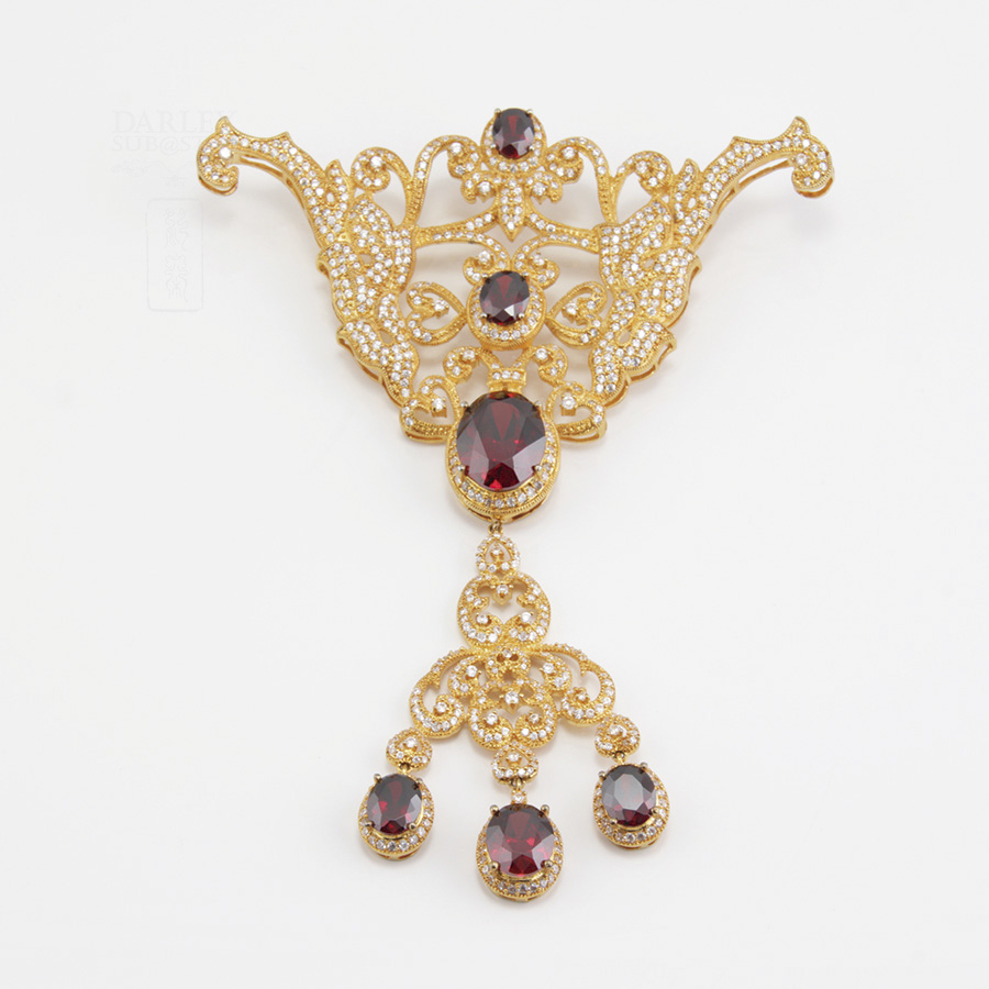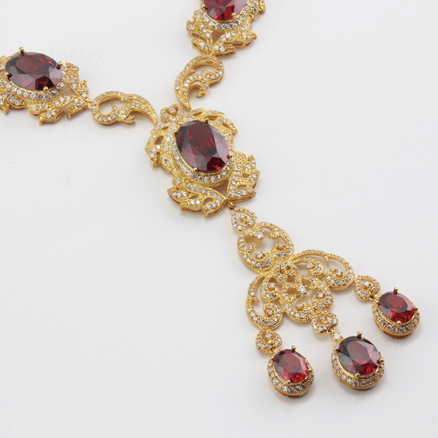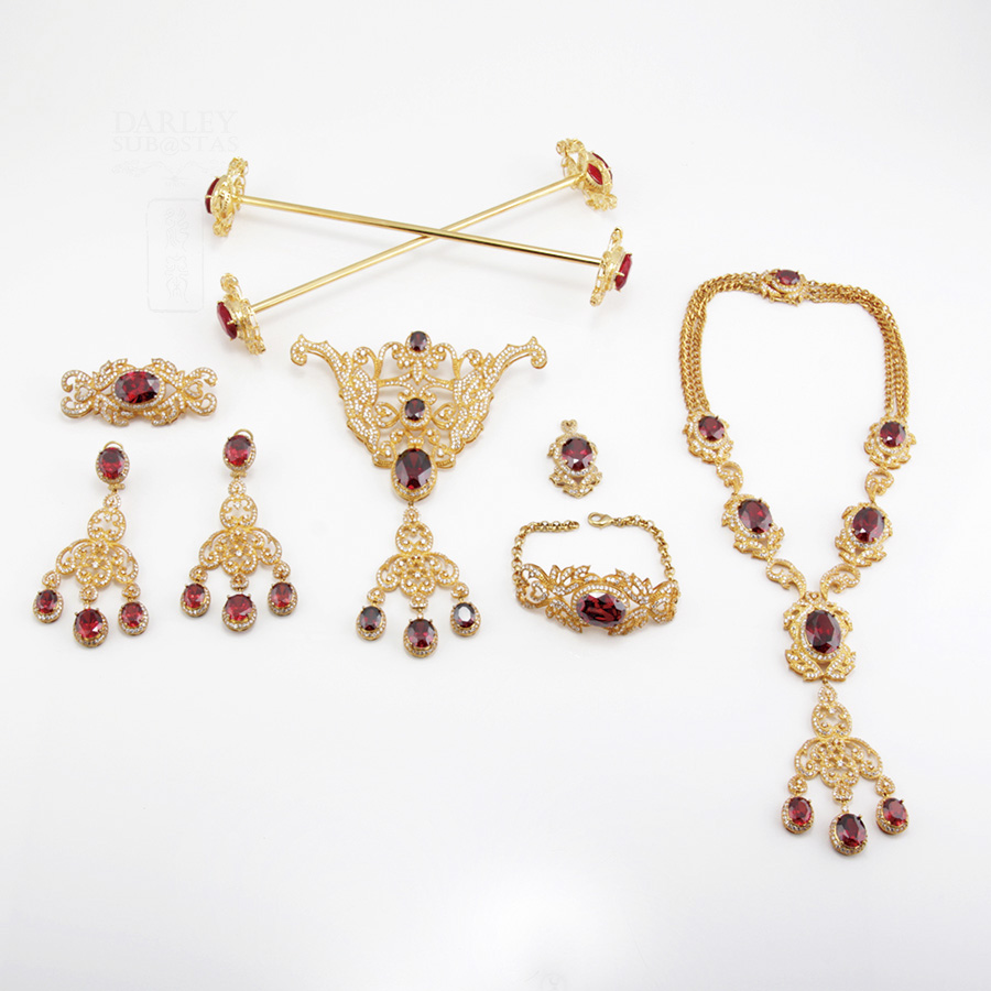 Está realizado en latón con baño de rodio de oro blanco y decorado con circonitas engarzadas (no pegadas) y piedras de color sintéticas de muy buena calidad. Lo componen: Agujas para los moños, joia, pendientes, colgante y pulsera y collar.