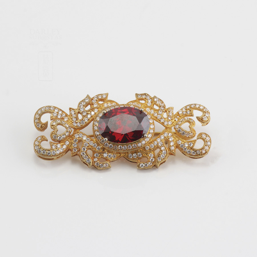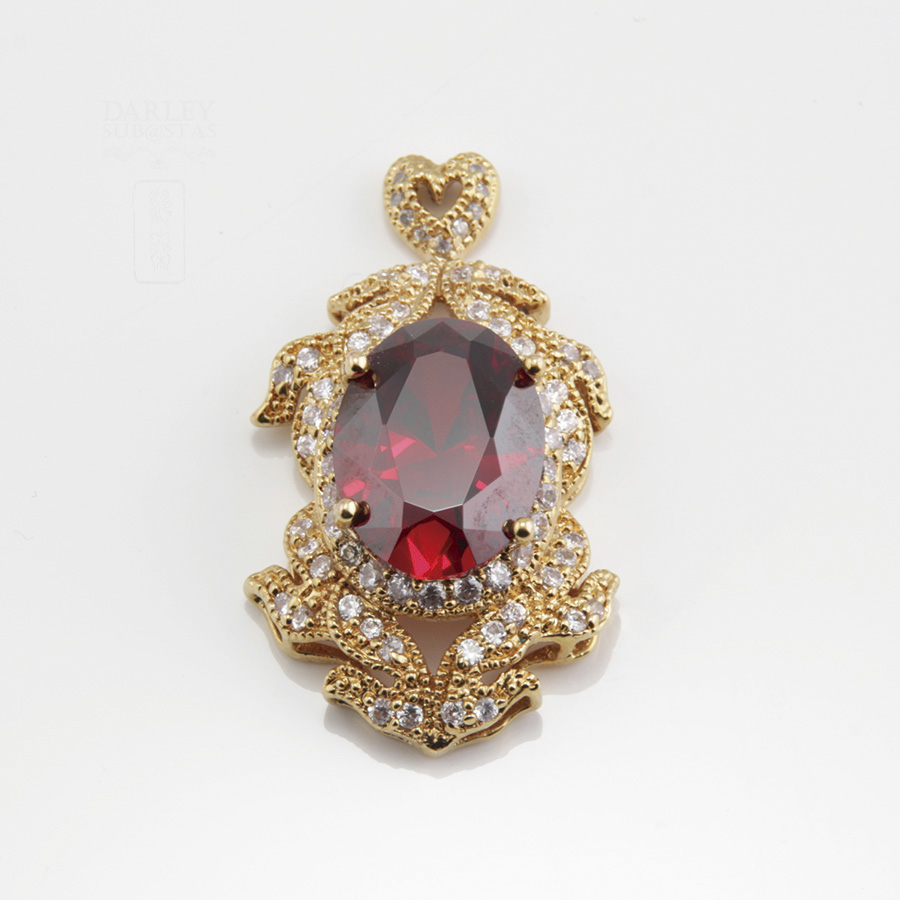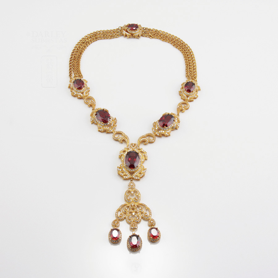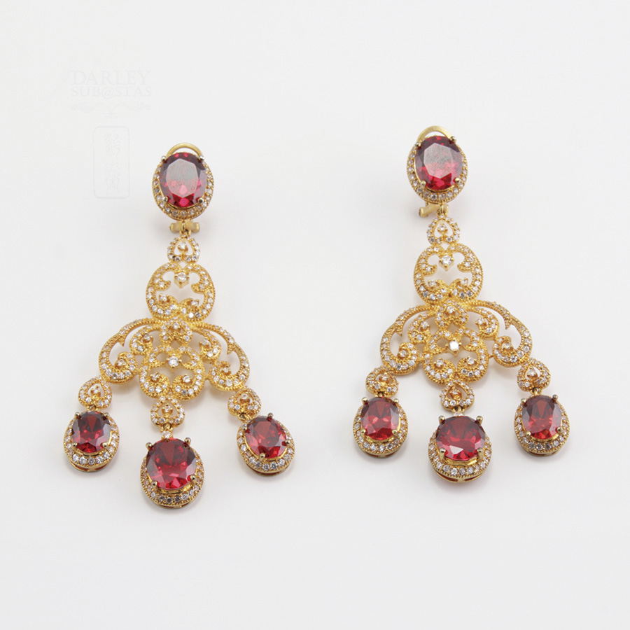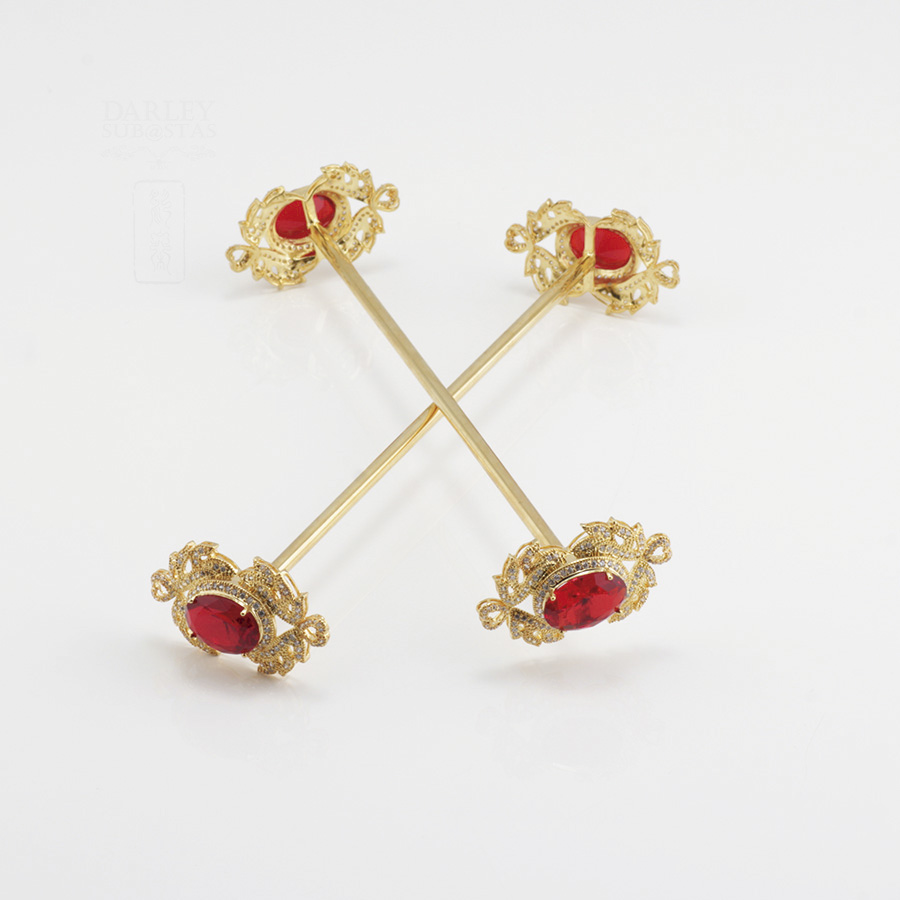 Está realizado en latón con baño de rodio de oro blanco y decorado con circonitas engarzadas (no pegadas) y piedras de color sintéticas de muy buena calidad. Lo componen: Agujas para los moños, joia, pendientes, colgante y pulsera y collar.