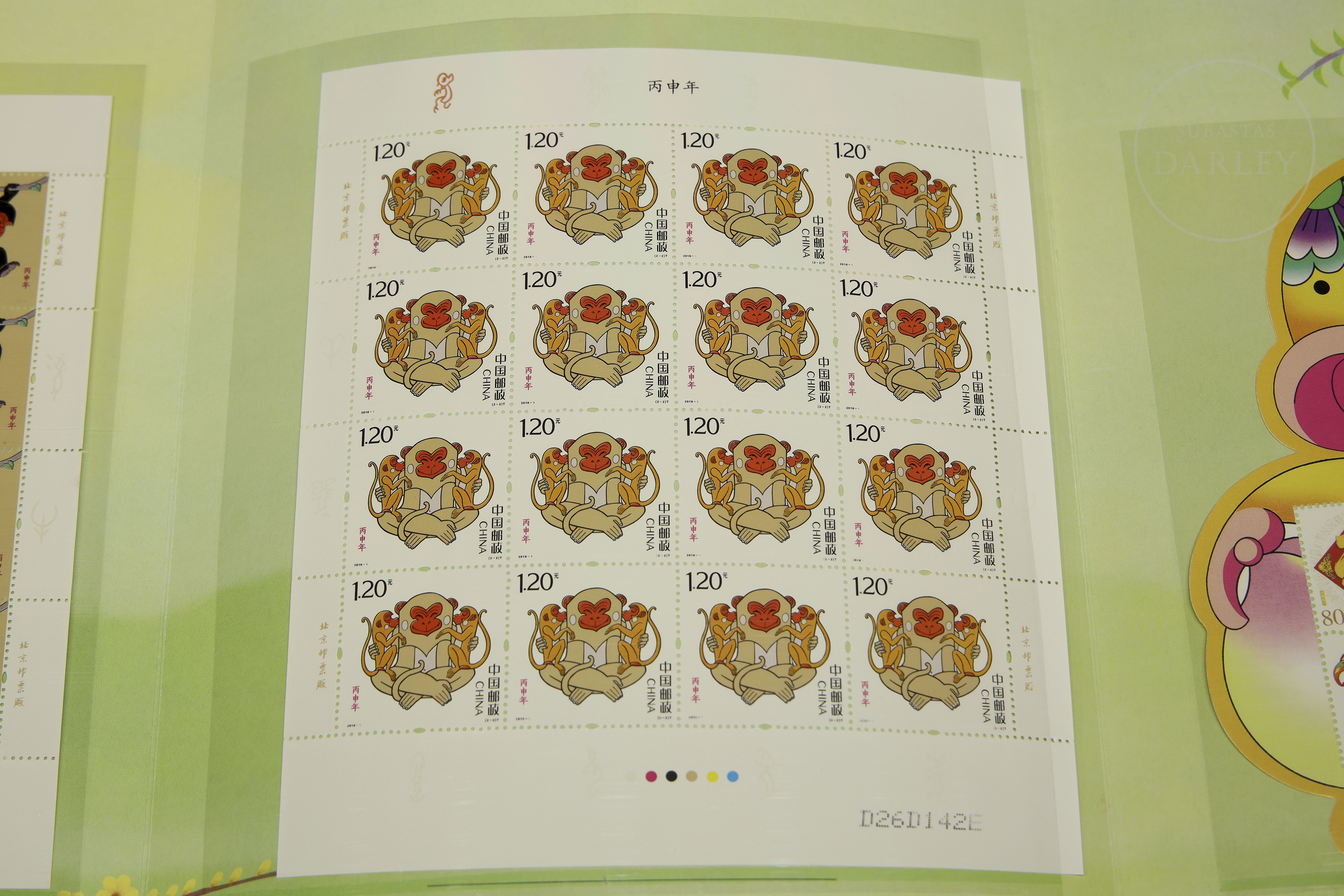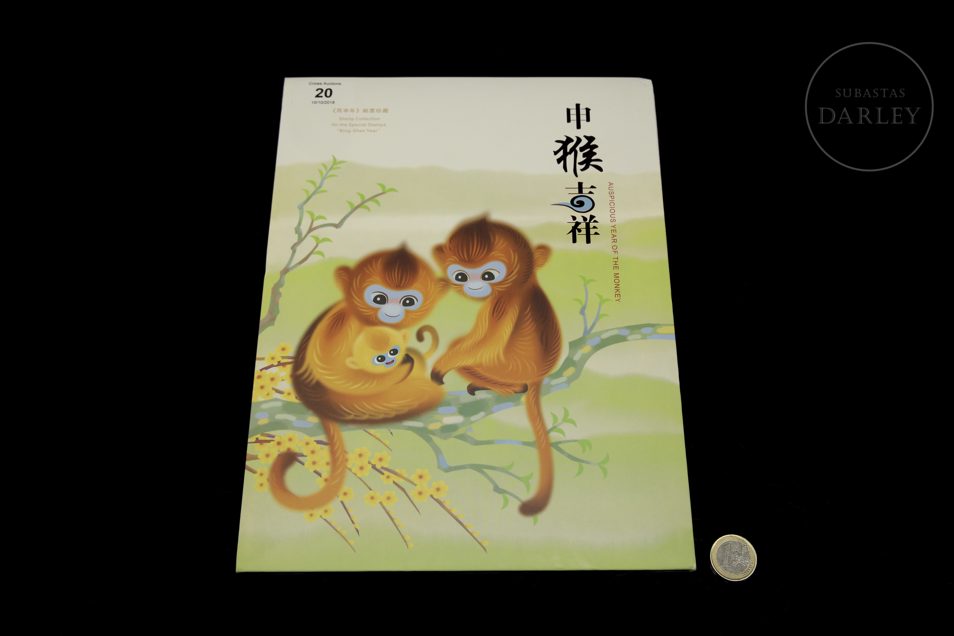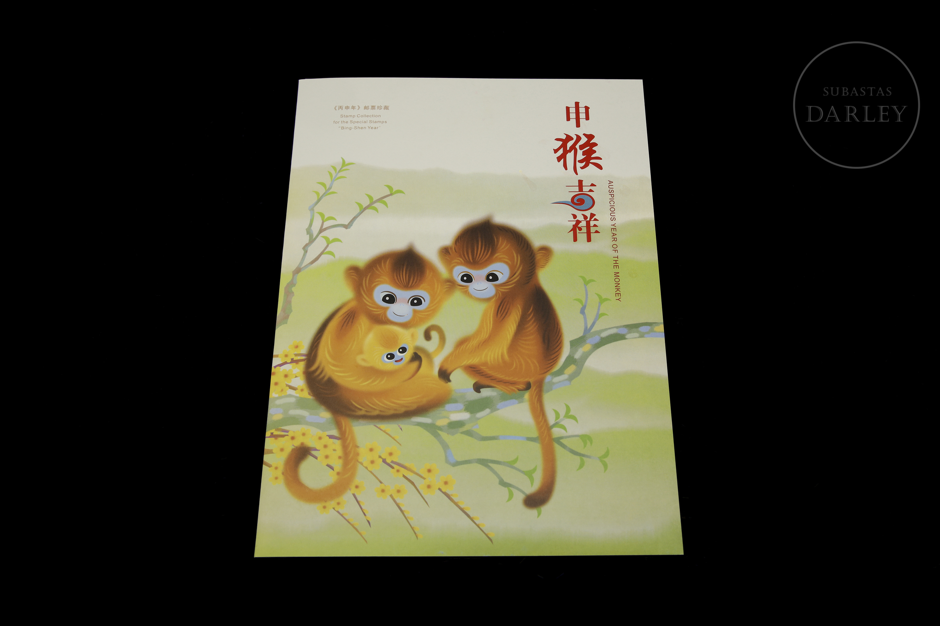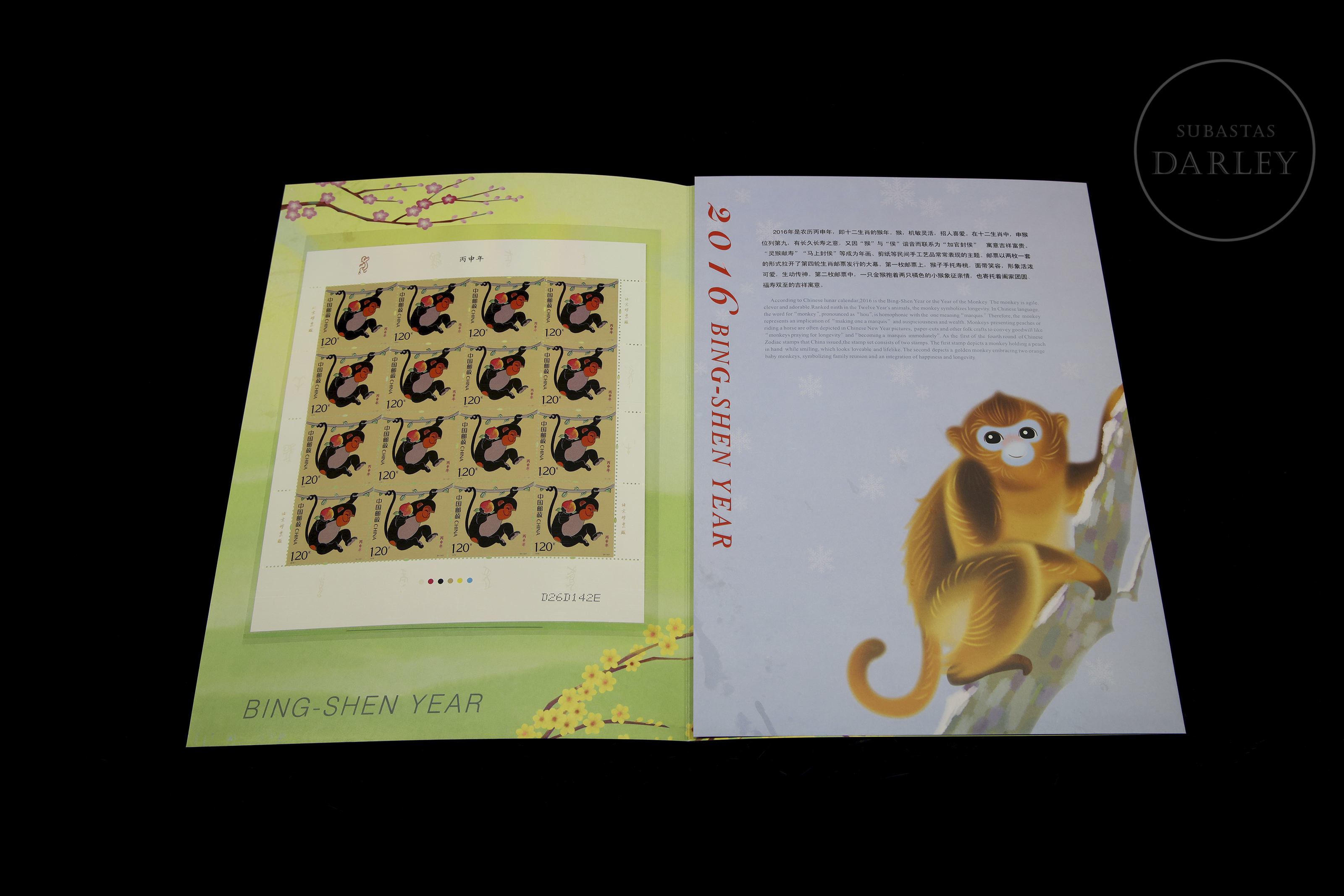 Álbum de coleccionista, realizado de forma conmemorativa en el año 2016, también conocido como "Año del Mono de fuego" según el calendario lunar. Se compone de tres hojas completas, dos de ellas de 16 unidades cada una, y una de menor tamaño de 6 unidades, emitidos en 2016 por China Post, y diseñados por el artista Huang Yongyu.