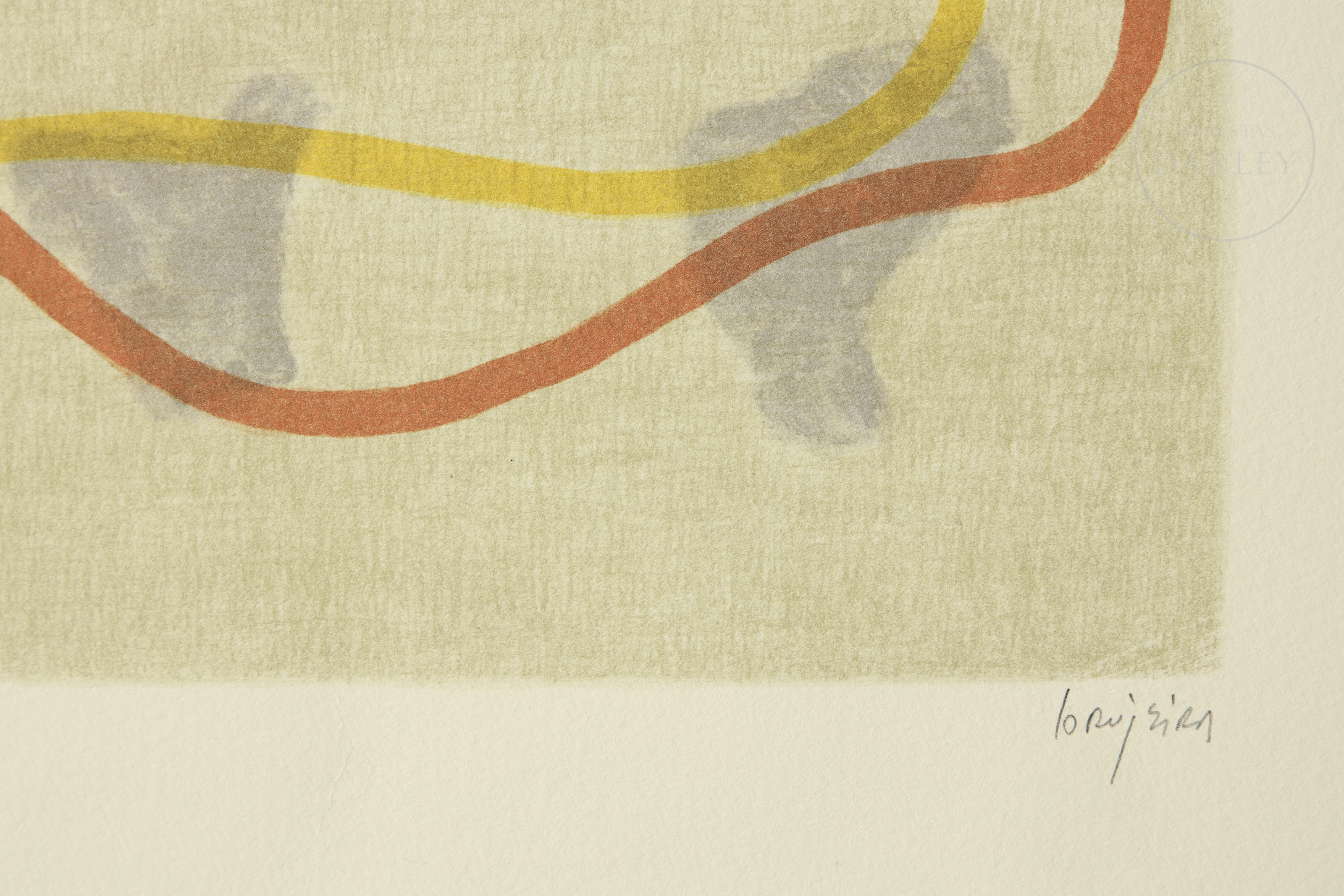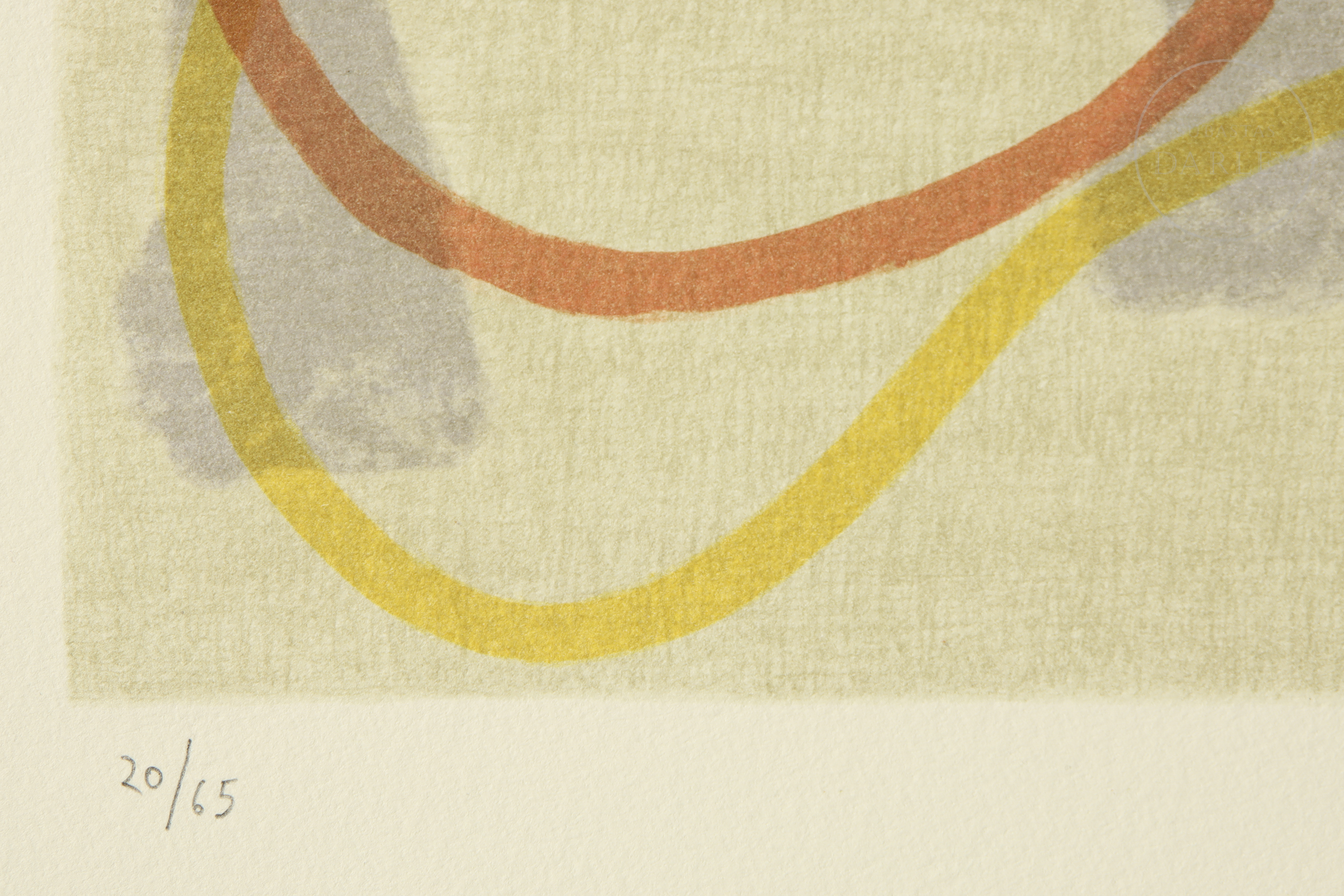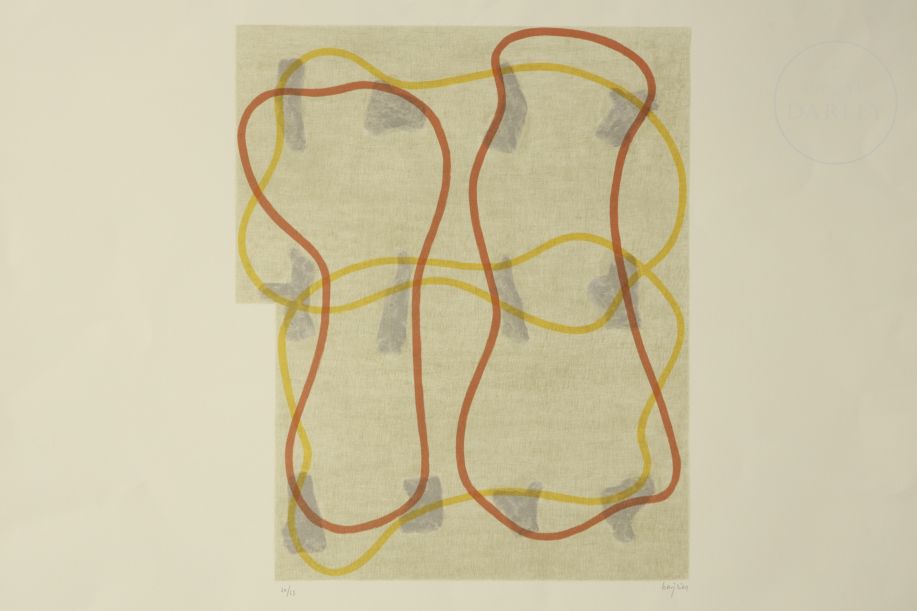 Litografía sobre papel. Composición abstracta sobre fondo neutro. Firmado en la esquina inferior derecha y numerado a lápiz "20/65" en la esquina inferior izquierda