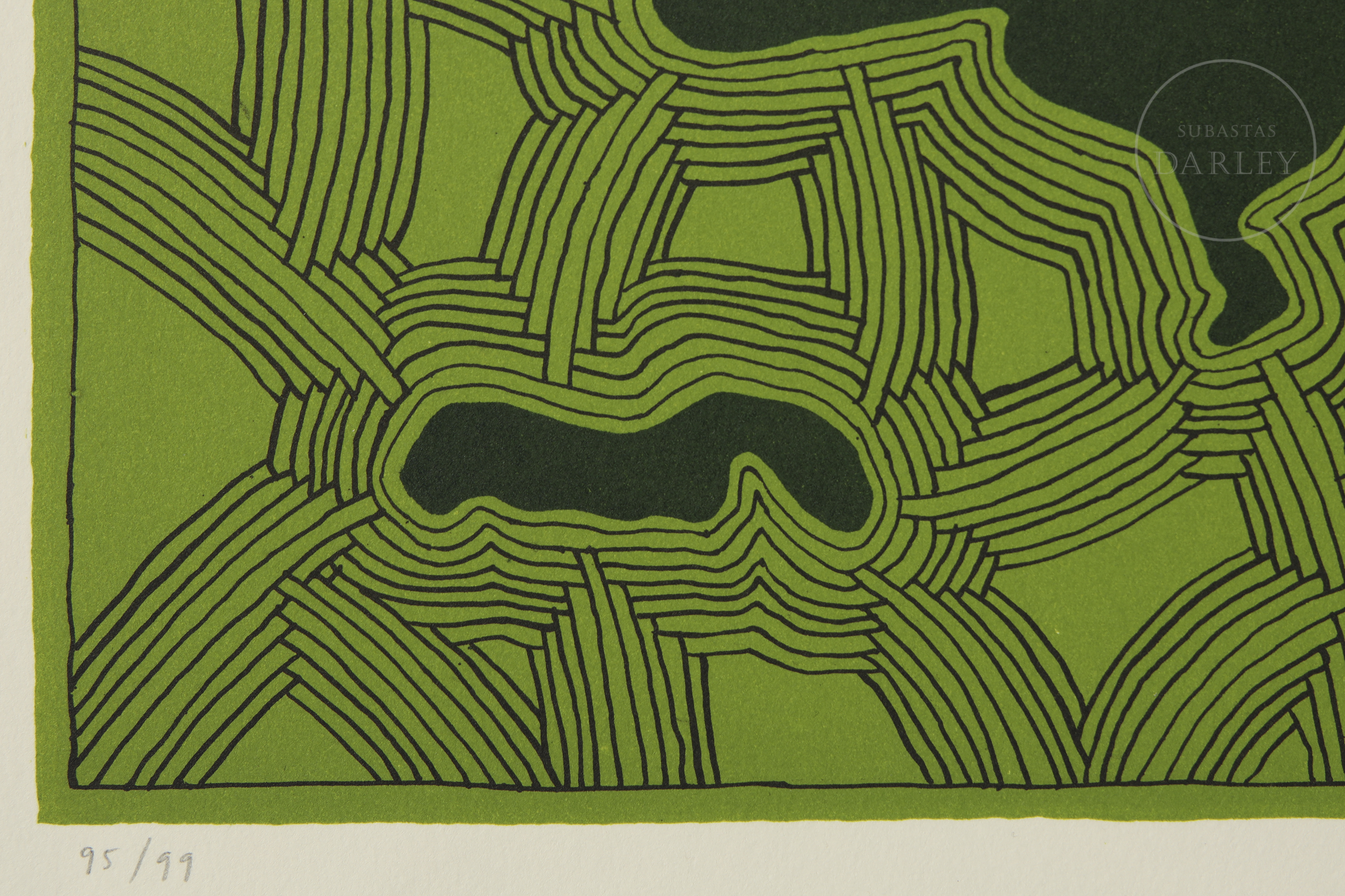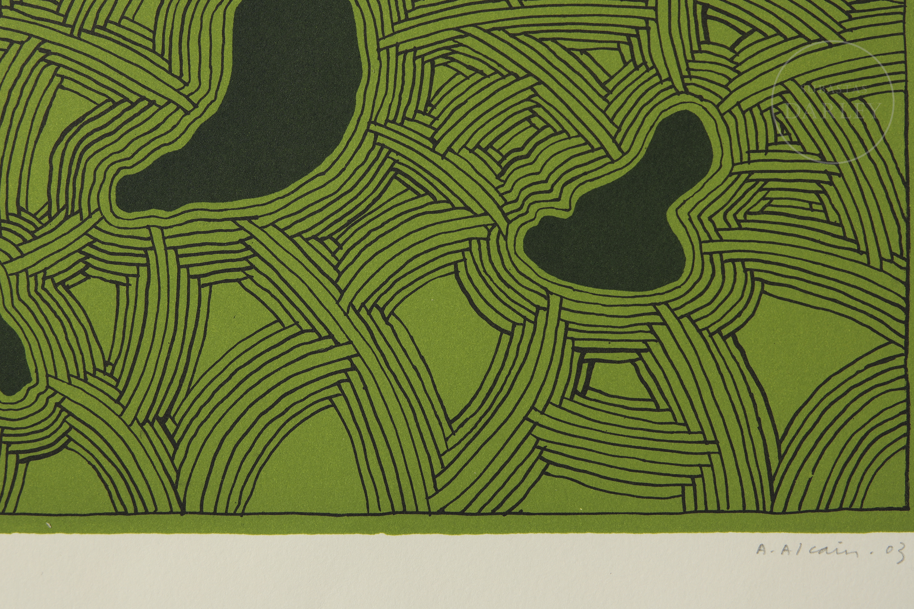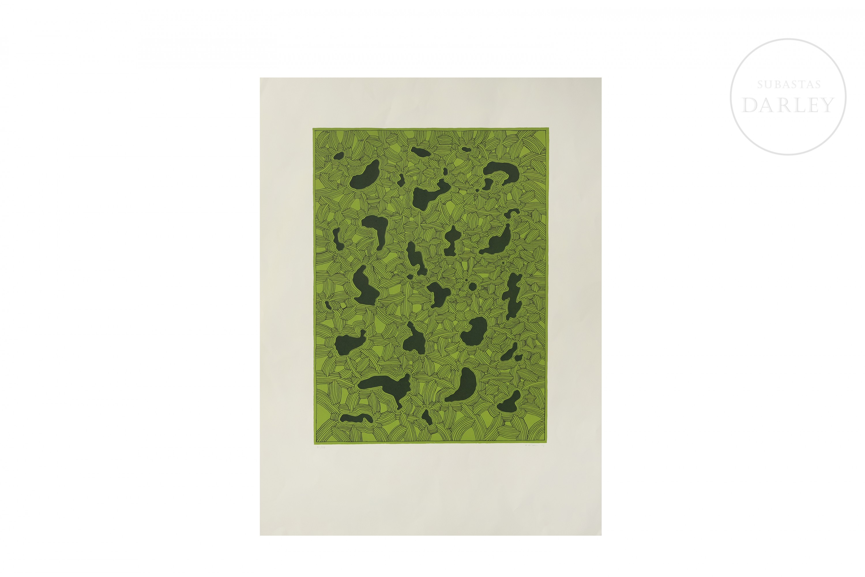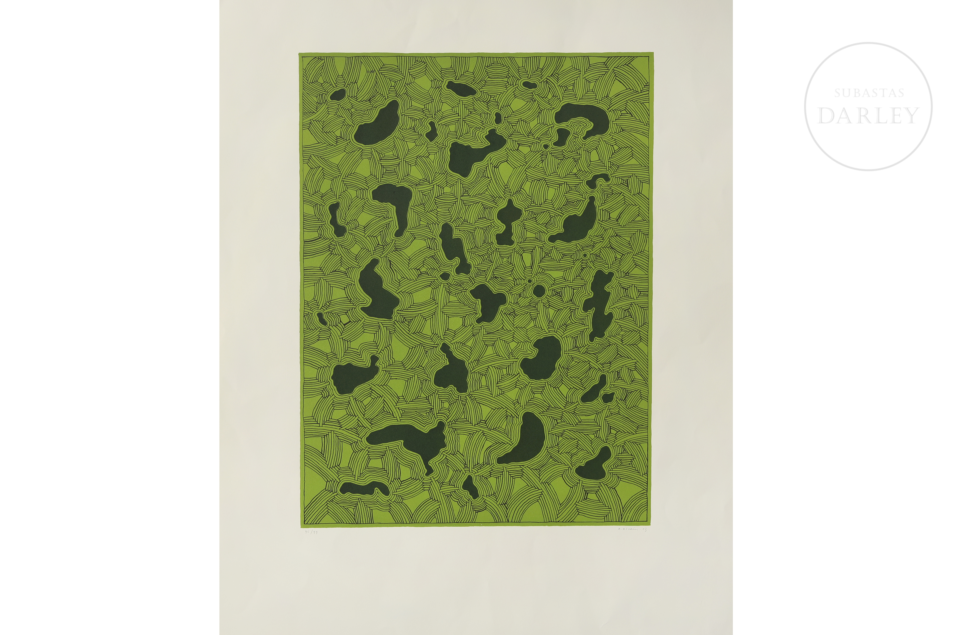 Litografía sobre papel. Composición abstracta compuesta por verde y negro. Firmado y fechado "A. Alcain/03" en la esquina inferior derecha y numerado a lápiz "95/99" en la esquina inferior izquierda.
