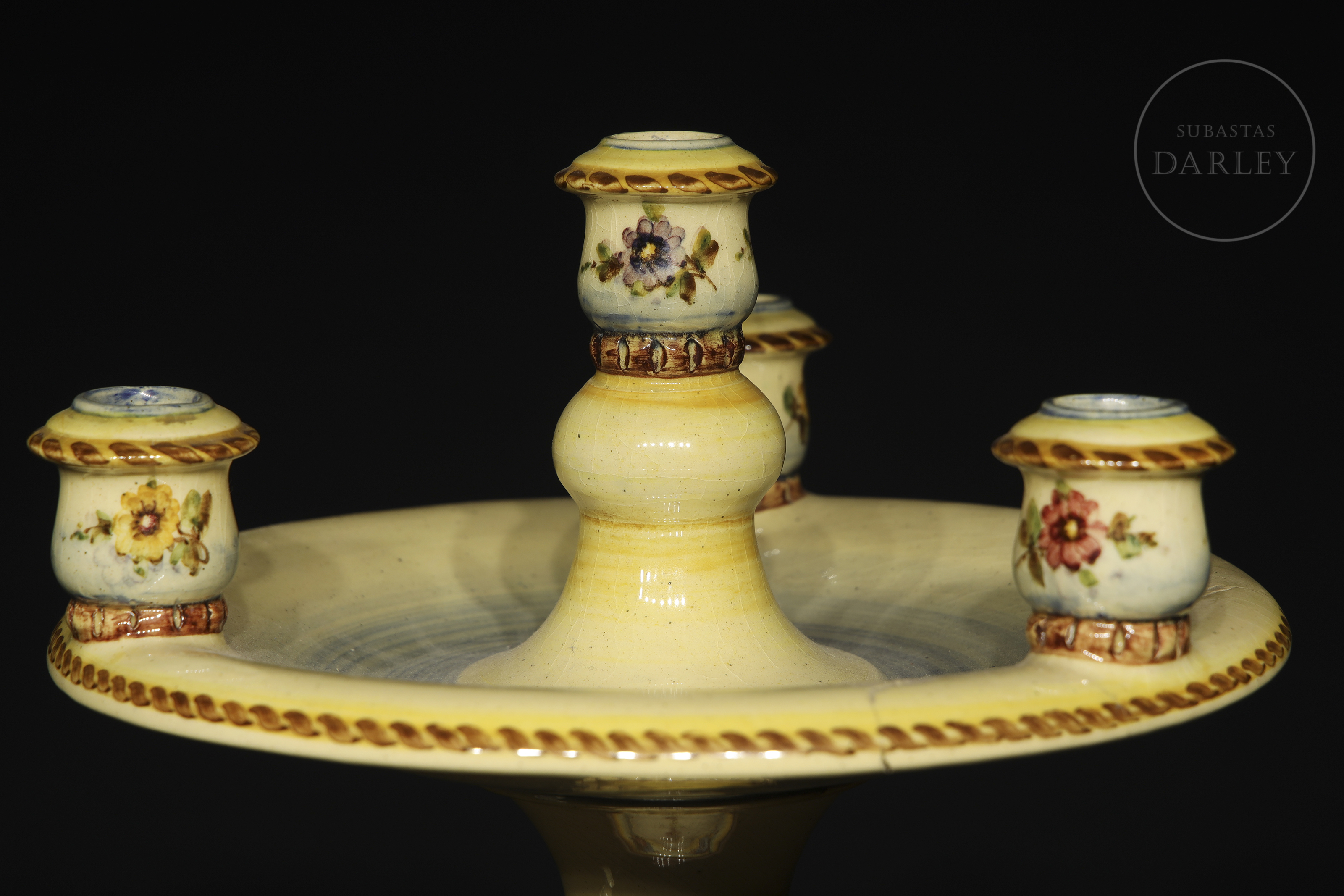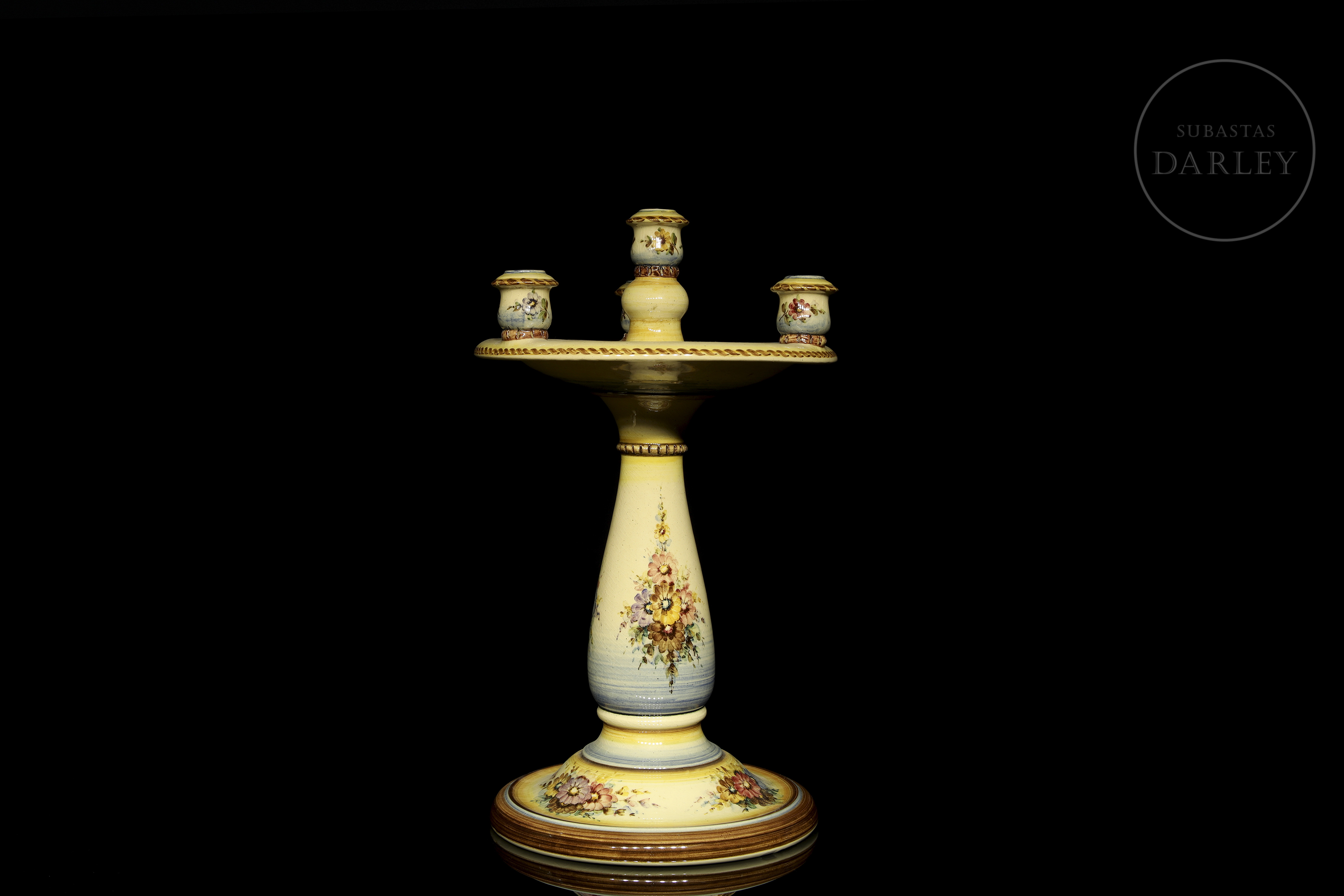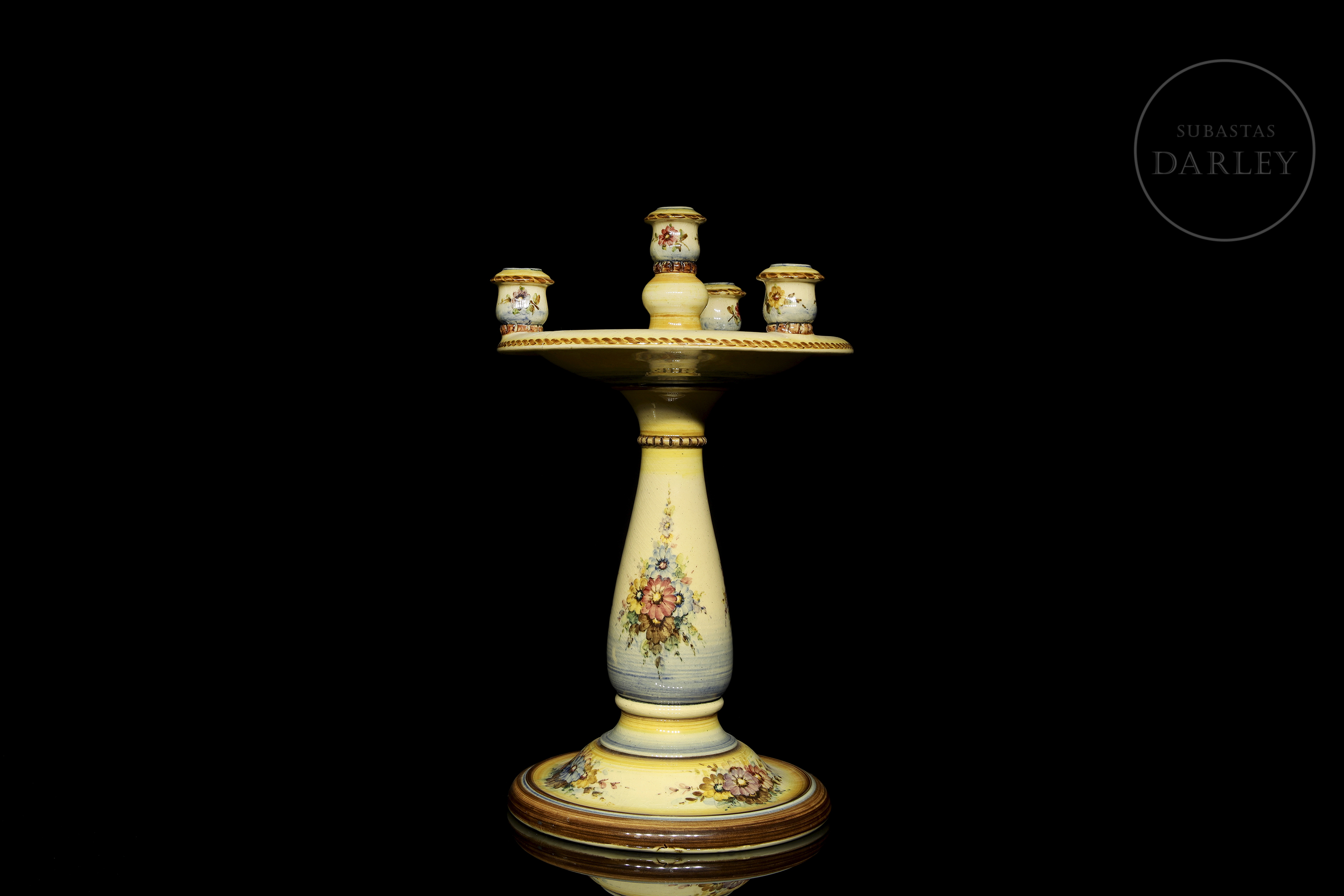 Candelabro de cerámica esmaltada, con cinco soportes para velas y decorado con temática floral. Firmado "Peyró" en la base, presenta una inscripción con referencia al "Año de la victoria".