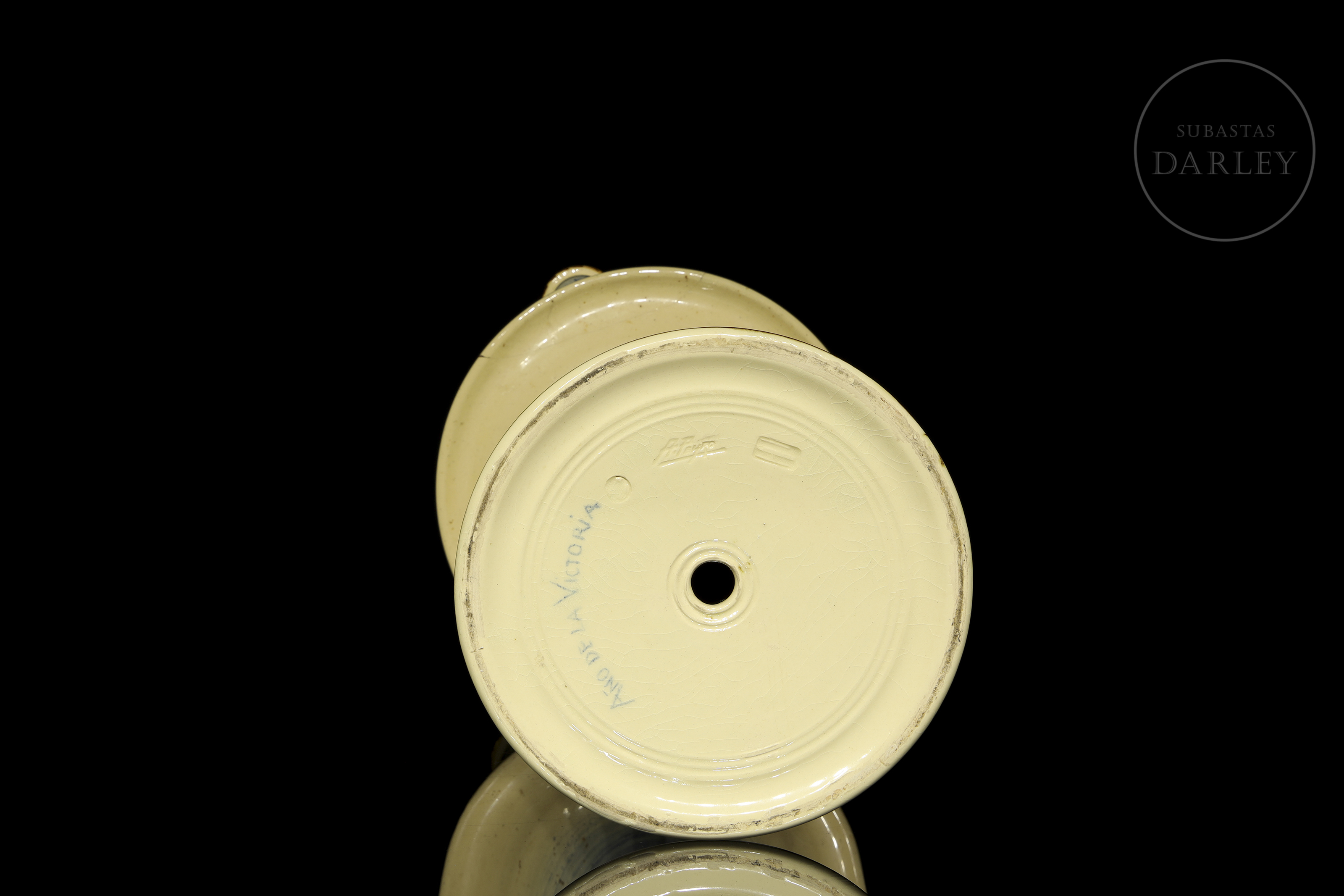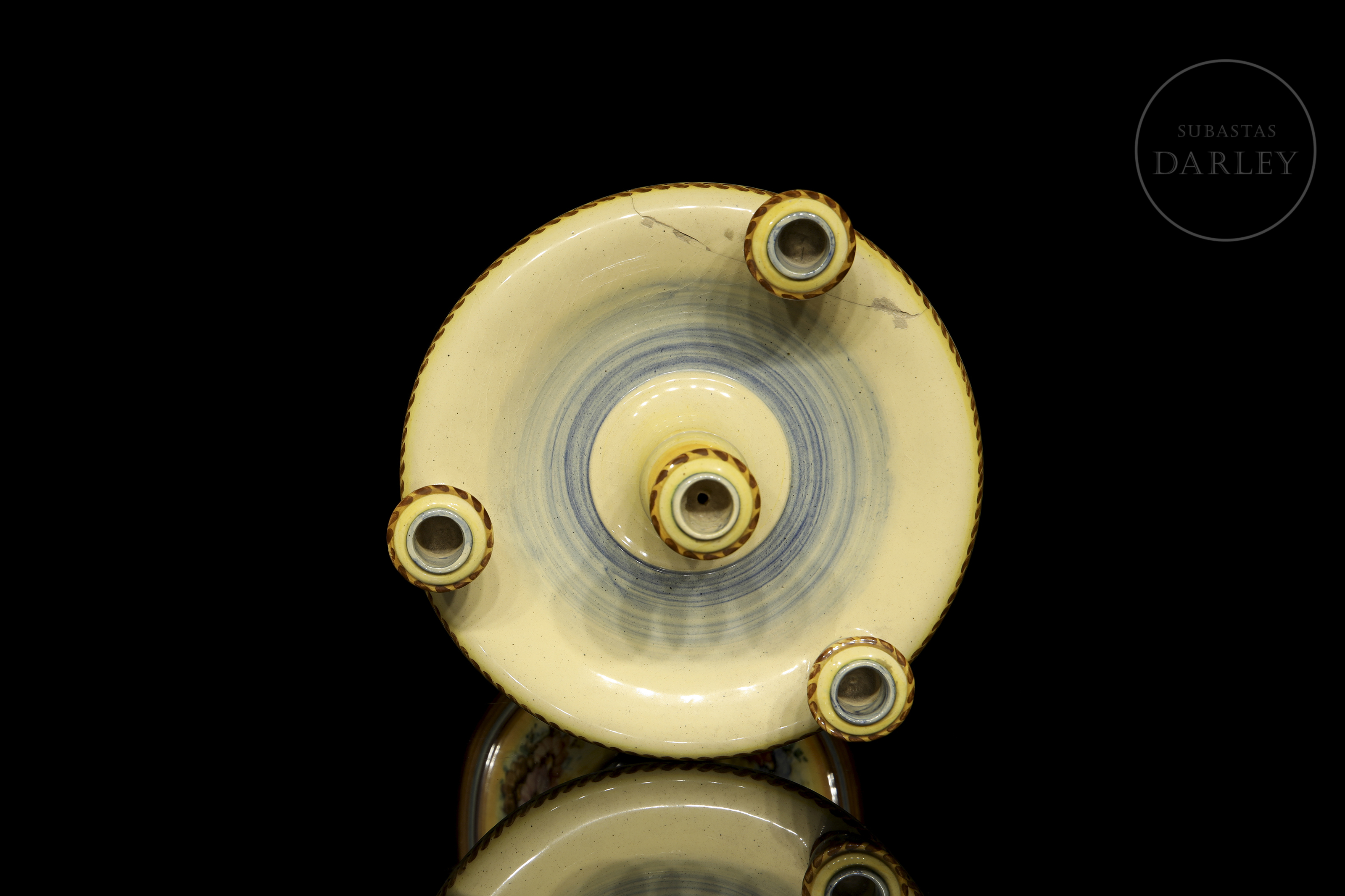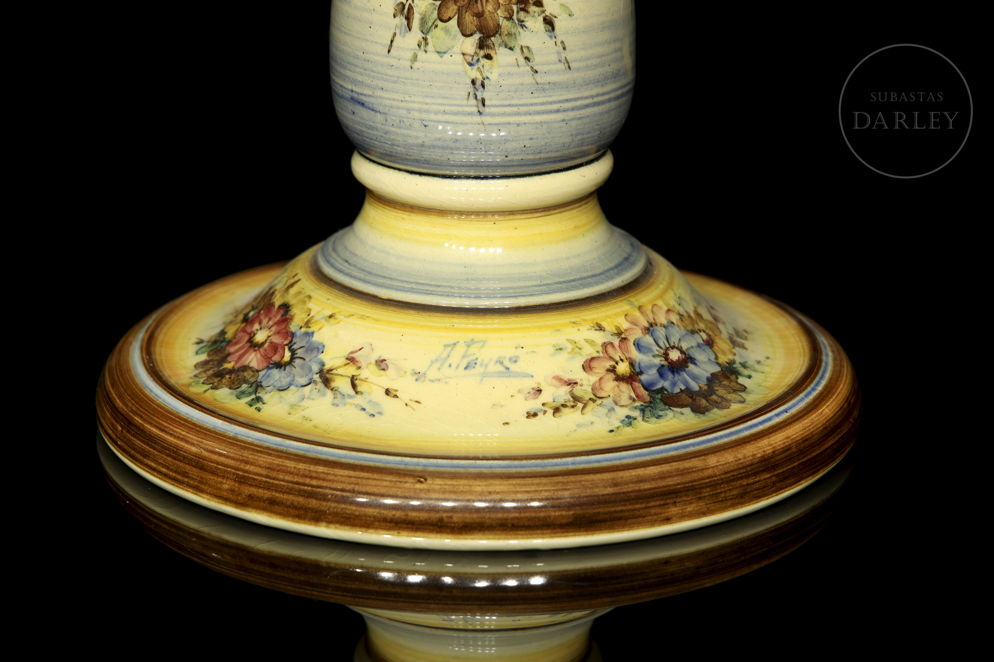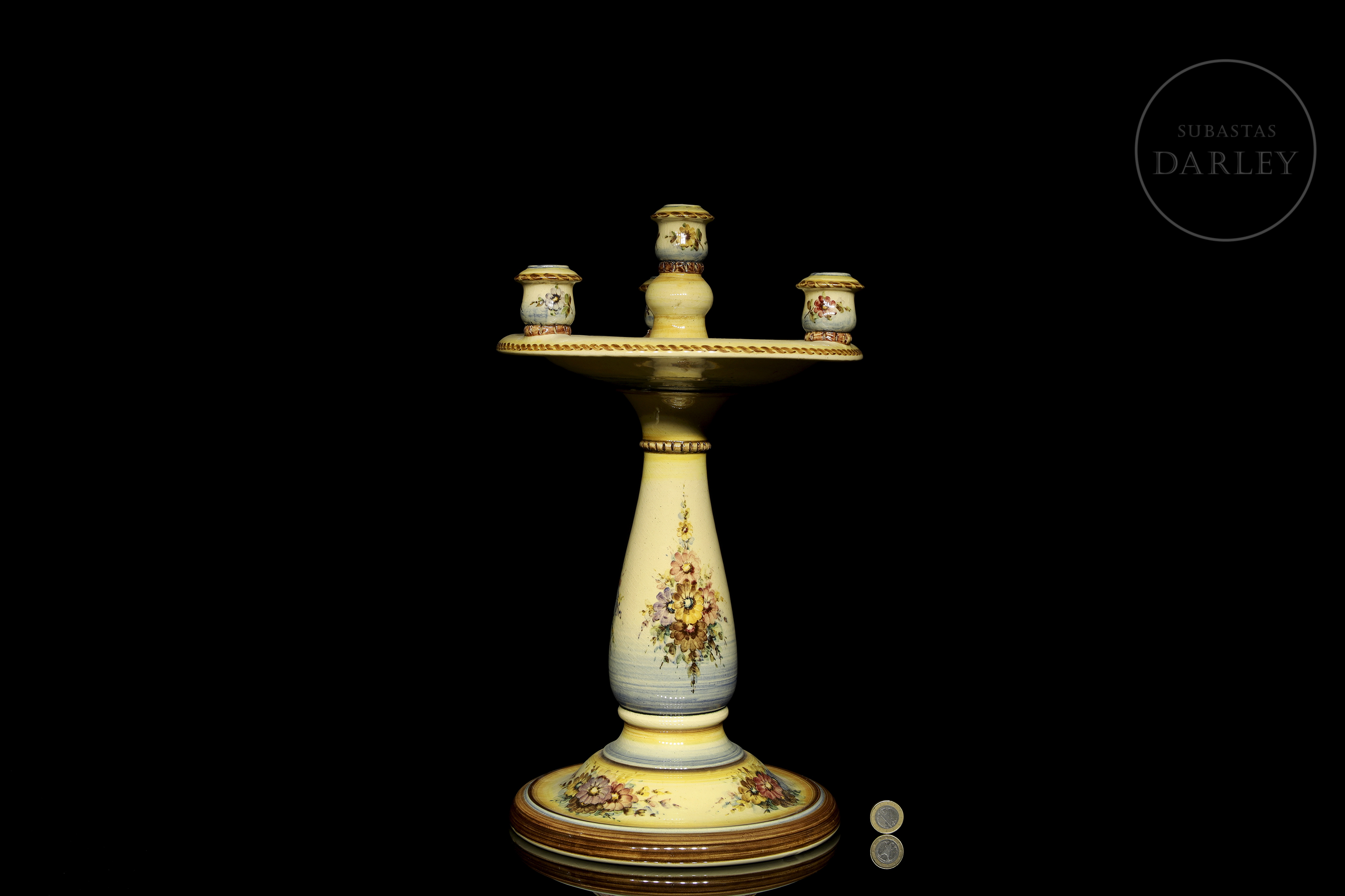 Candelabro de cerámica esmaltada, con cinco soportes para velas y decorado con temática floral. Firmado "Peyró" en la base, presenta una inscripción con referencia al "Año de la victoria".