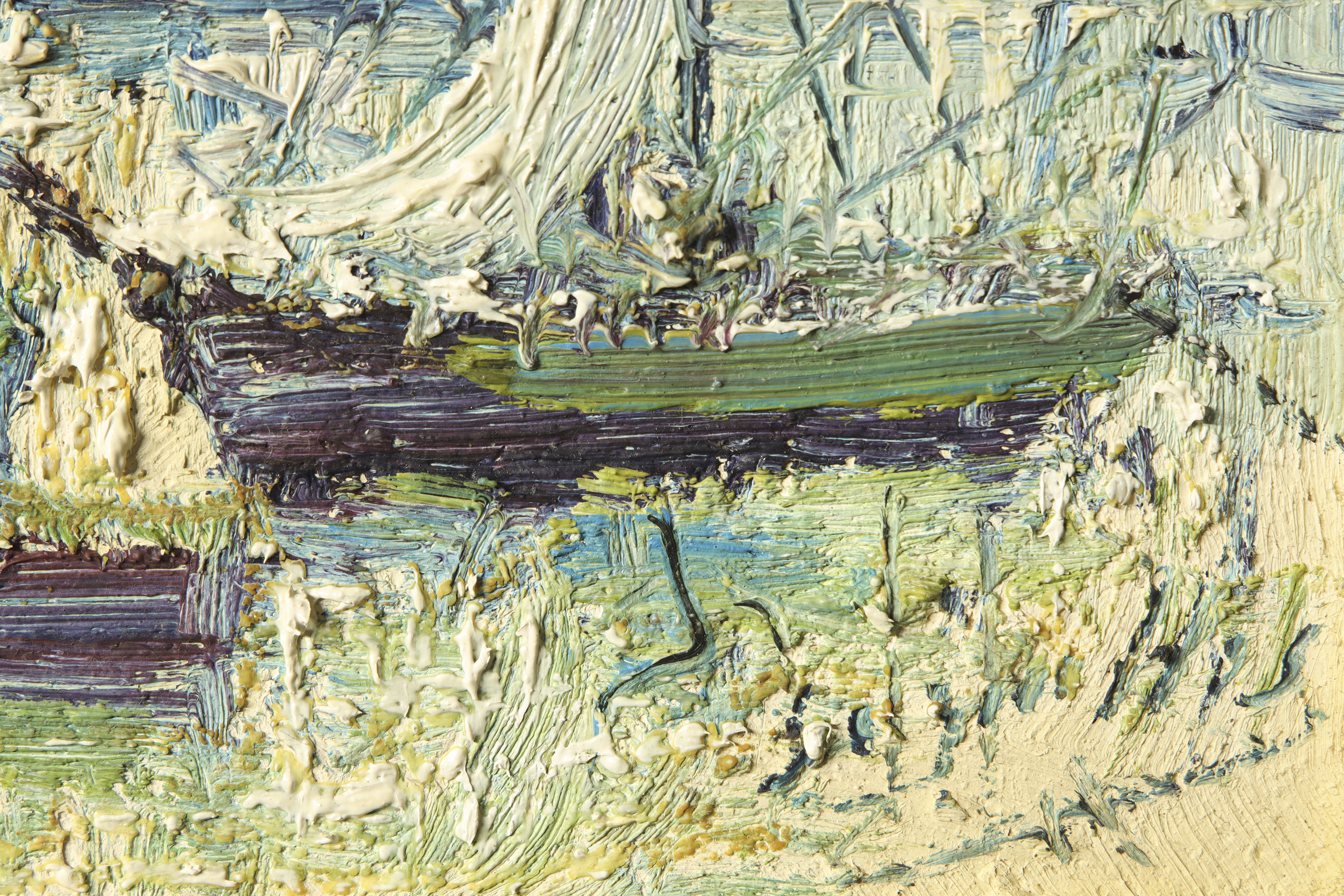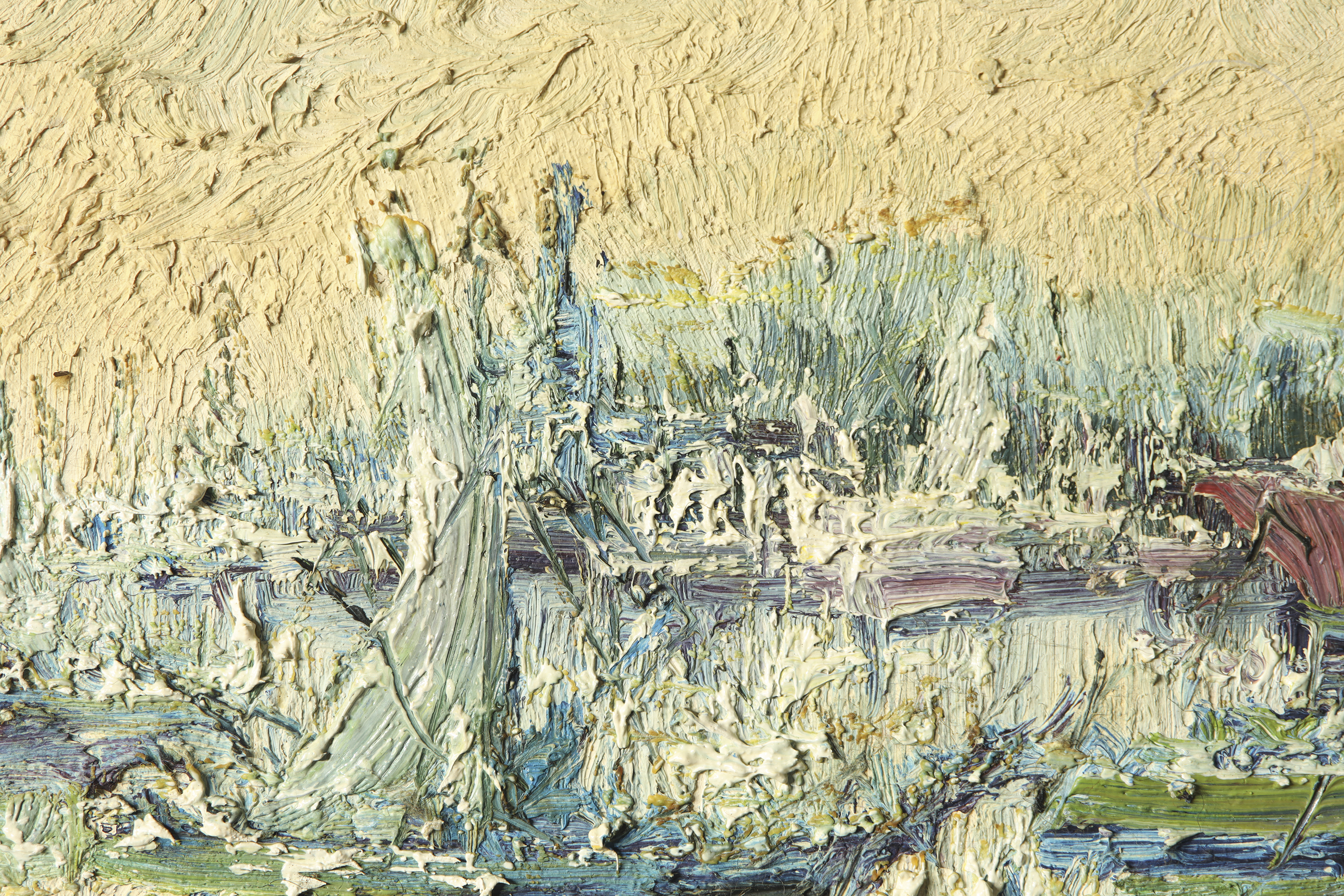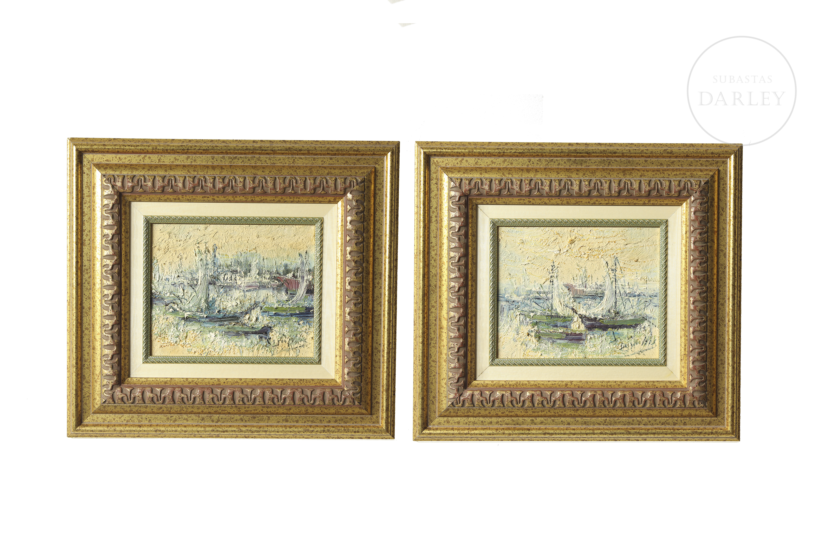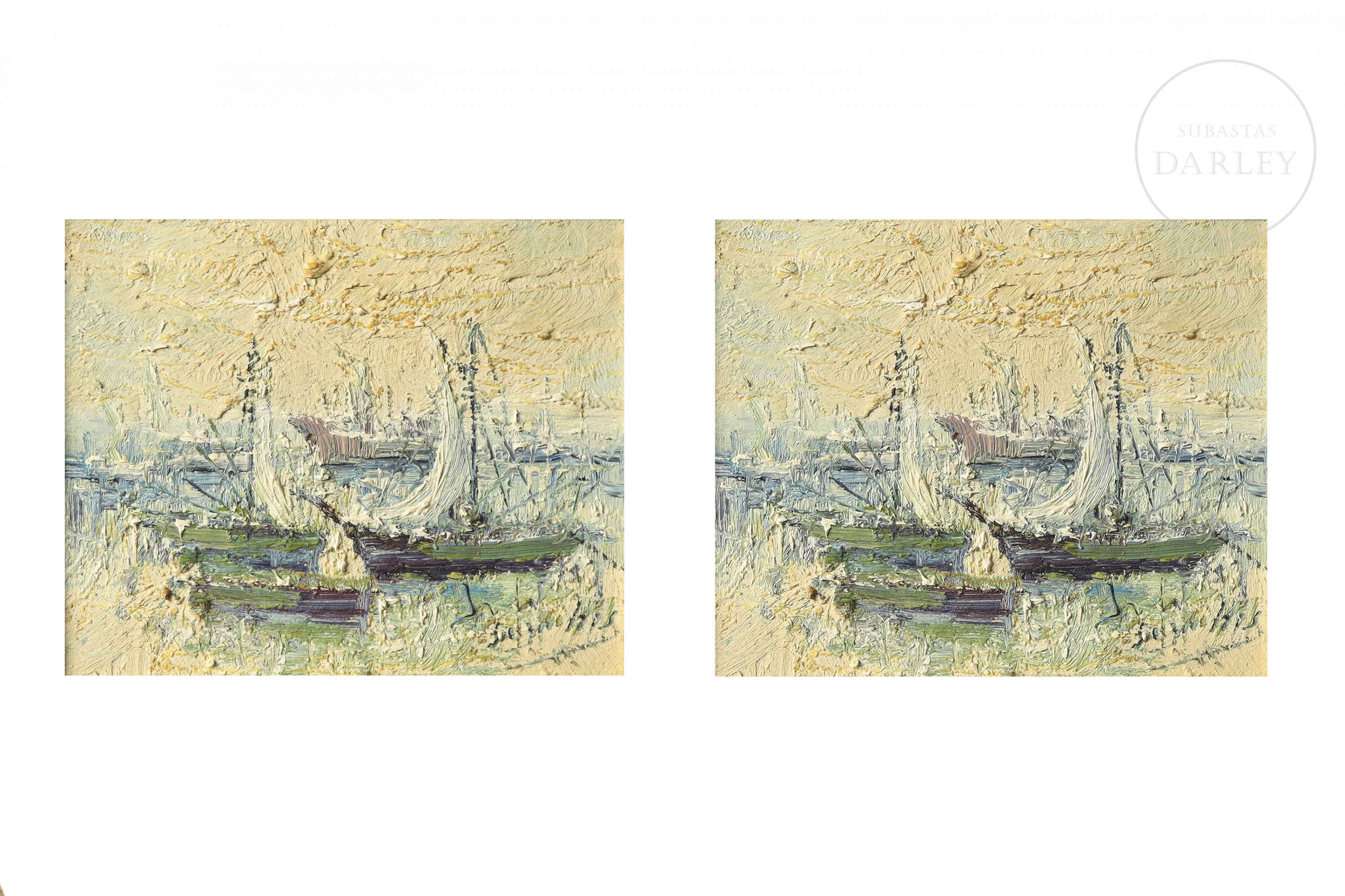Pareja de pequeñas pinturas al óleo sobre lienzo. Dos representaciones de tres barcas verdes a vela en el puerto. Firmado "Segrelles" en la esquina inferior derecha.