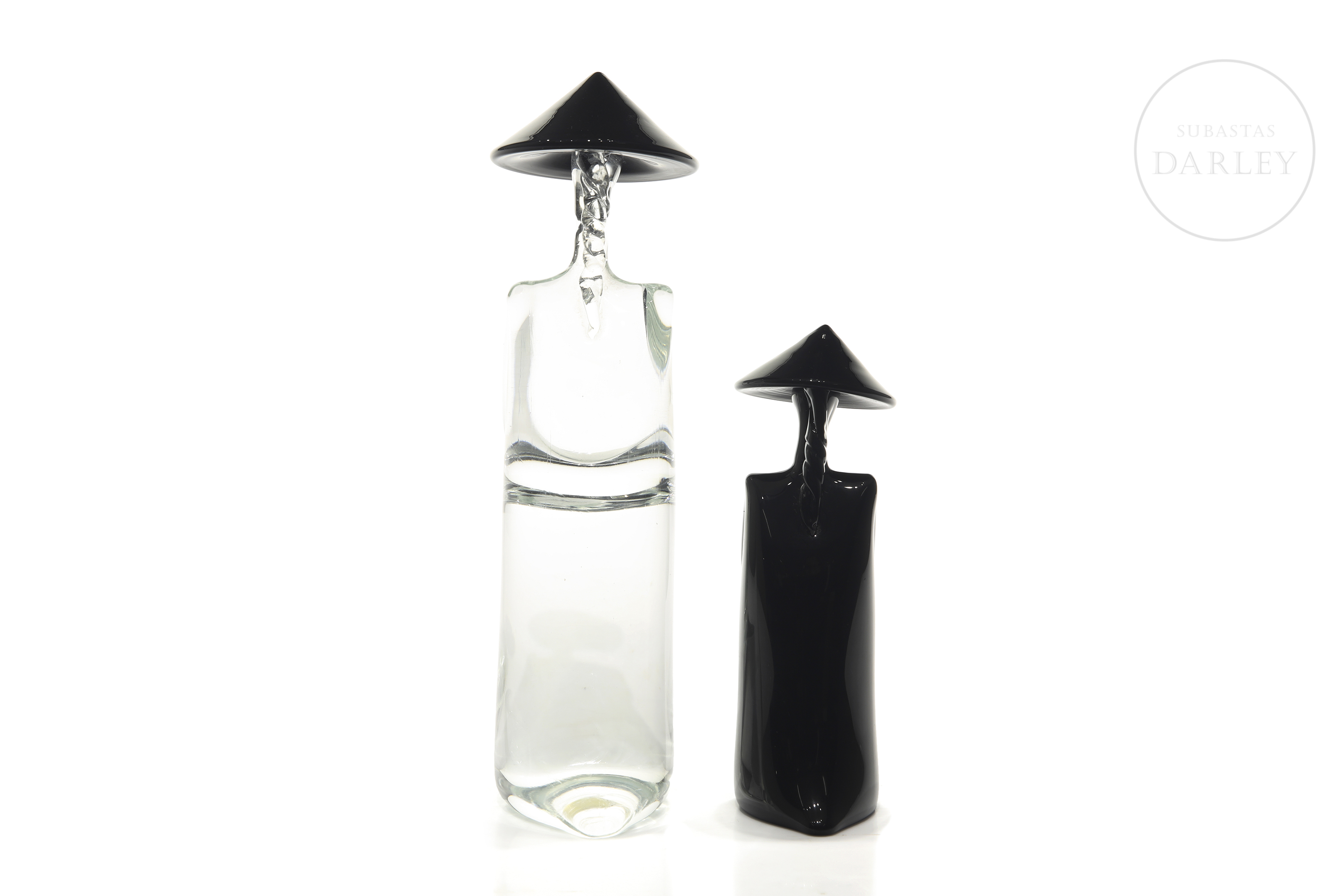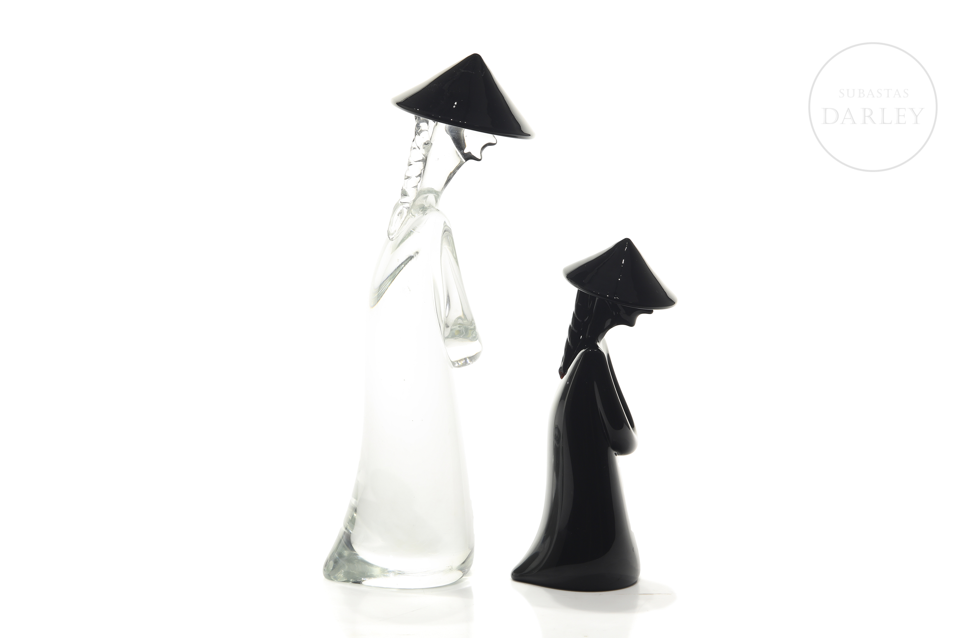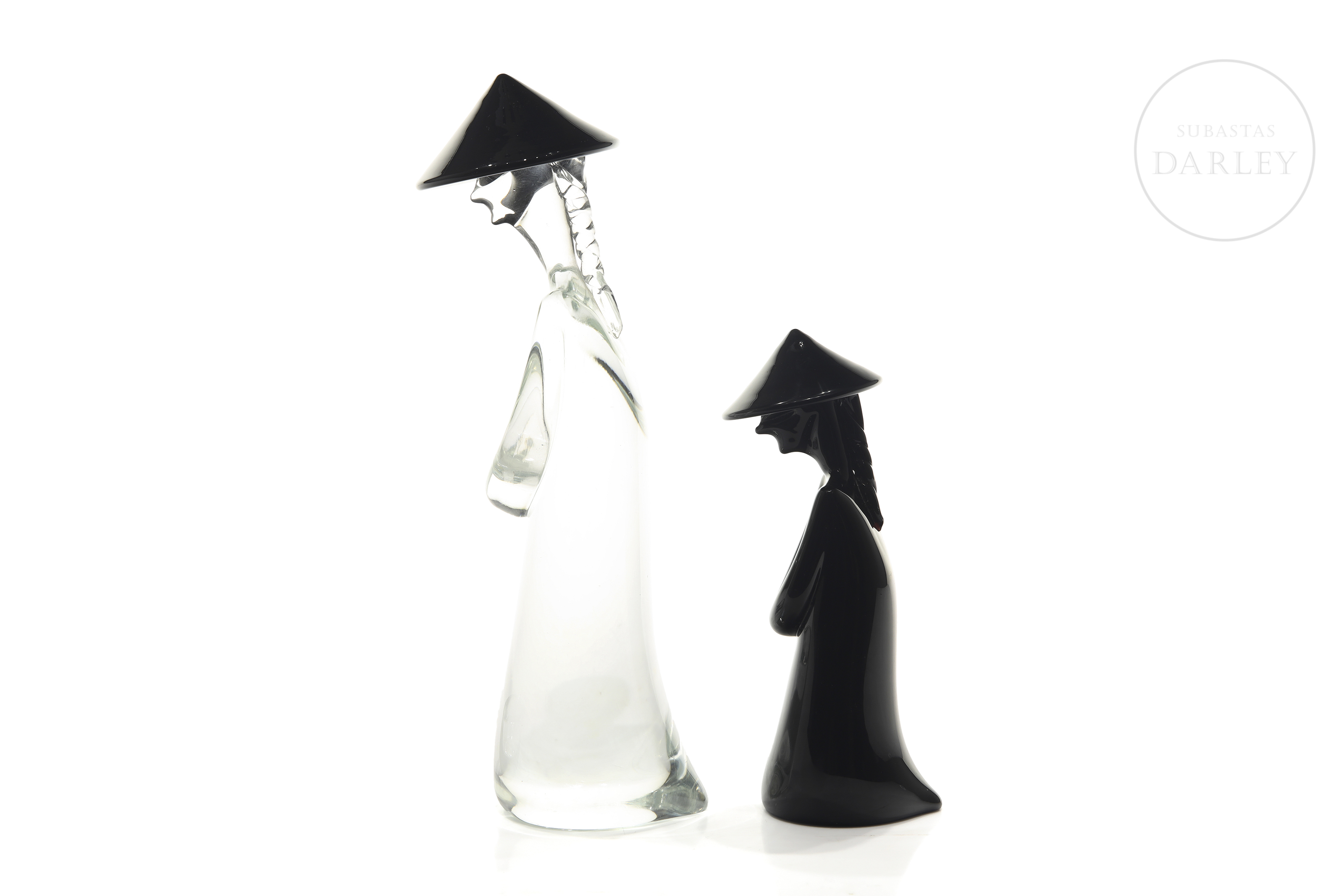 Pareja de personajes de cristal de Murano con sello "Archimede Seguso/Murano/Made in Italy". Realizados a partir de cristal translúcido y negro mediante la técnica de cristal soplado. Ambos personajes presentan rasgos relacionados con el mundo oriental, como son el sombrero cónico y la representación de una larga melena.