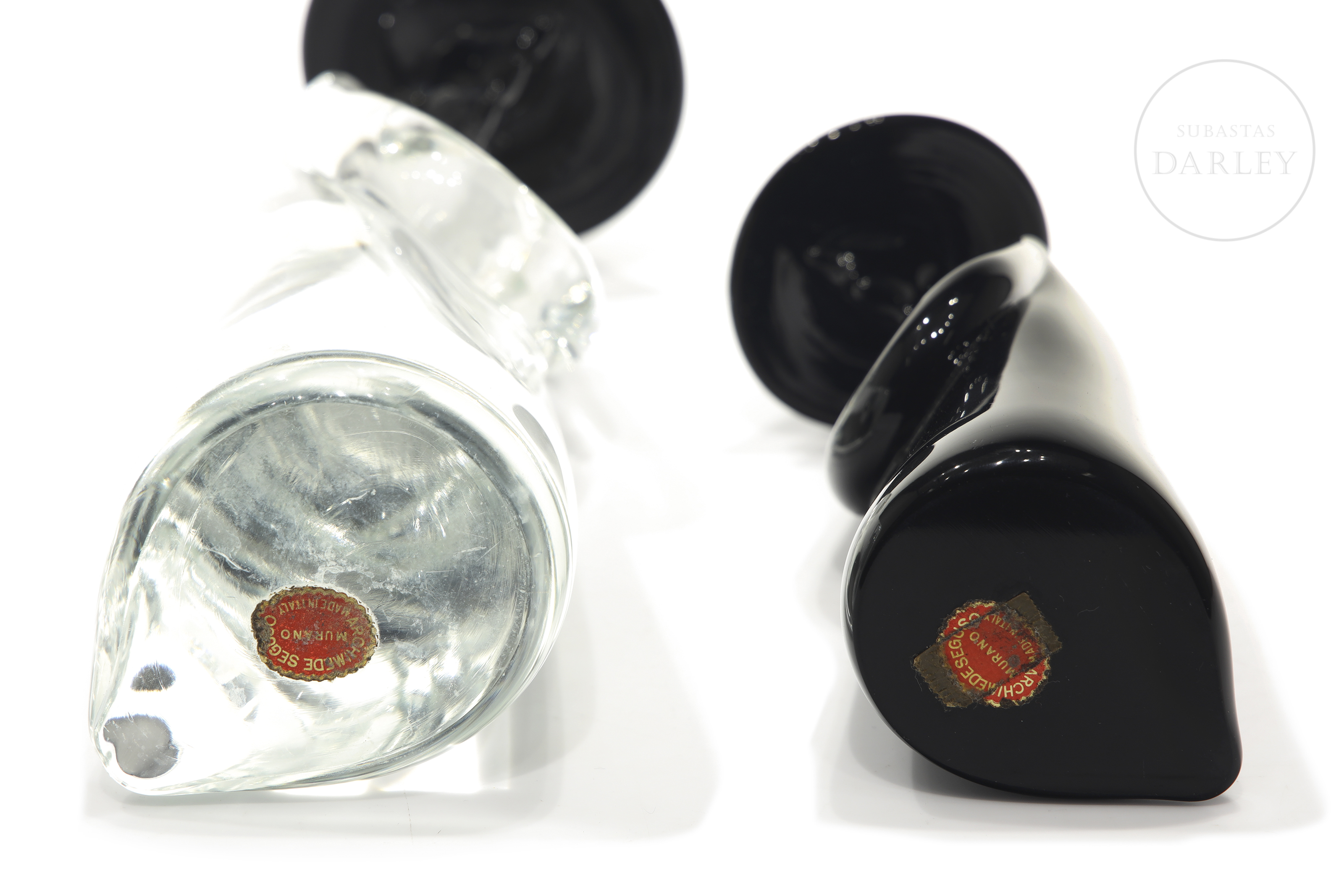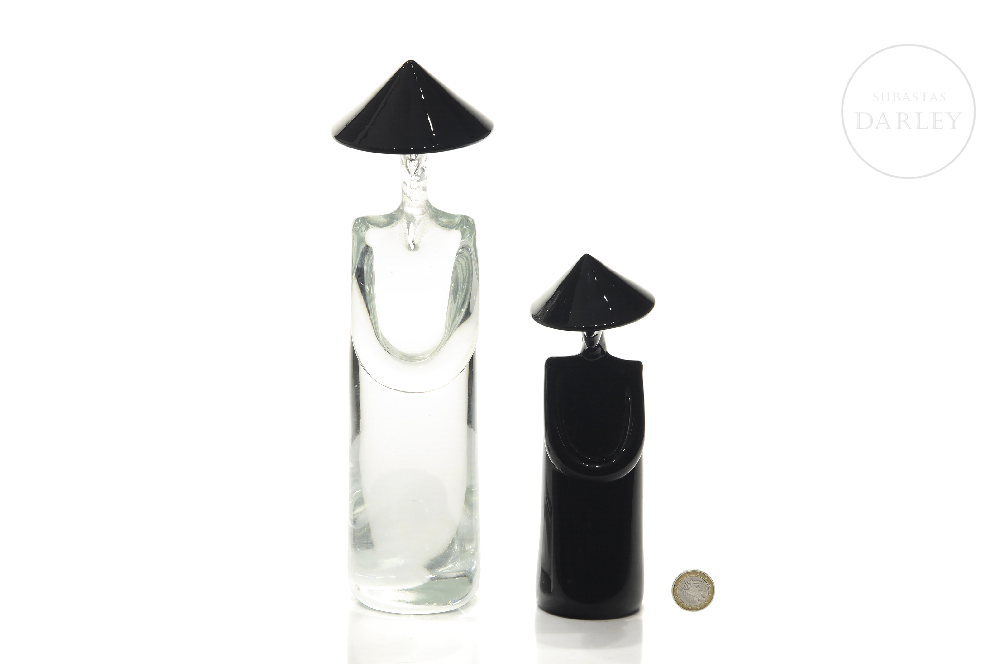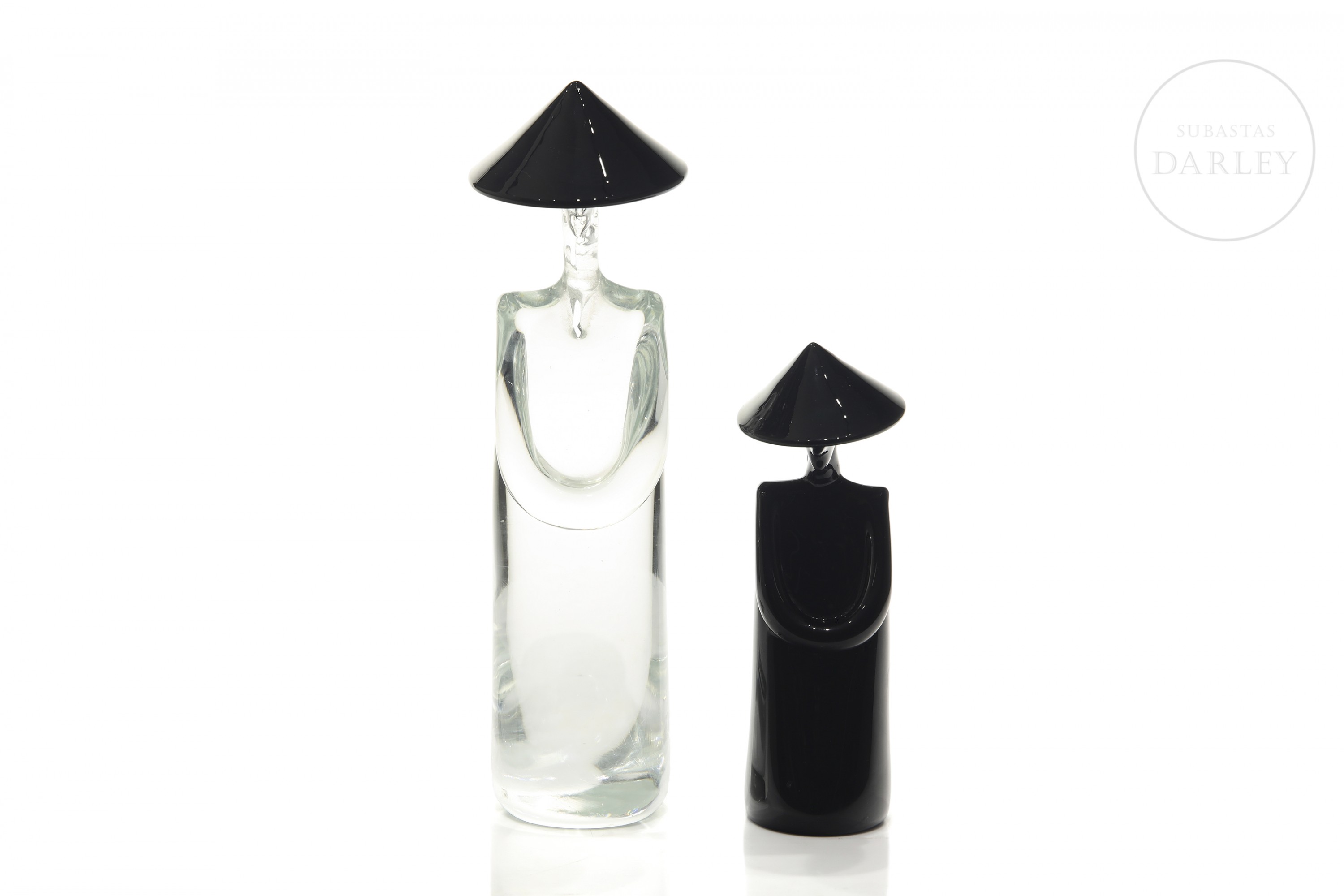 Pareja de personajes de cristal de Murano con sello "Archimede Seguso/Murano/Made in Italy". Realizados a partir de cristal translúcido y negro mediante la técnica de cristal soplado. Ambos personajes presentan rasgos relacionados con el mundo oriental, como son el sombrero cónico y la representación de una larga melena.
