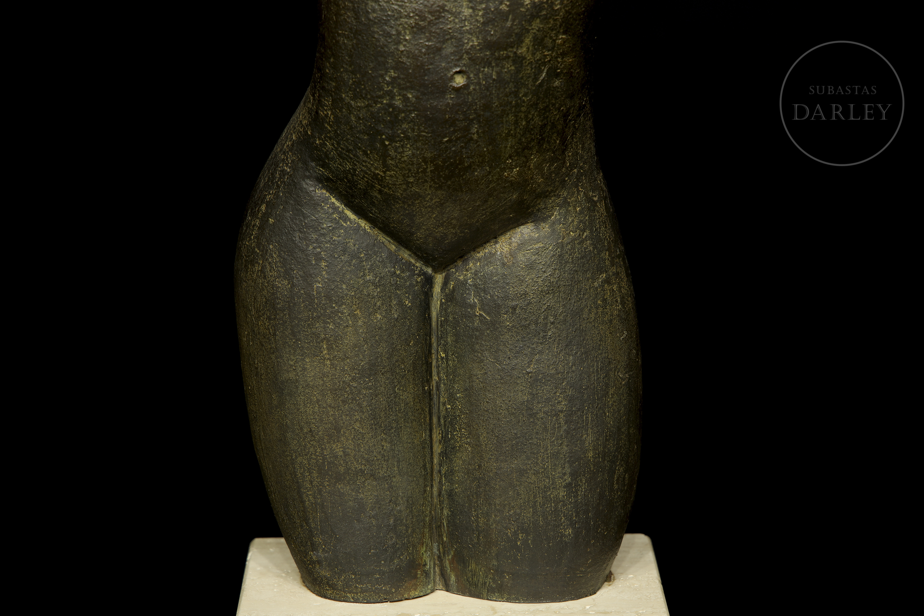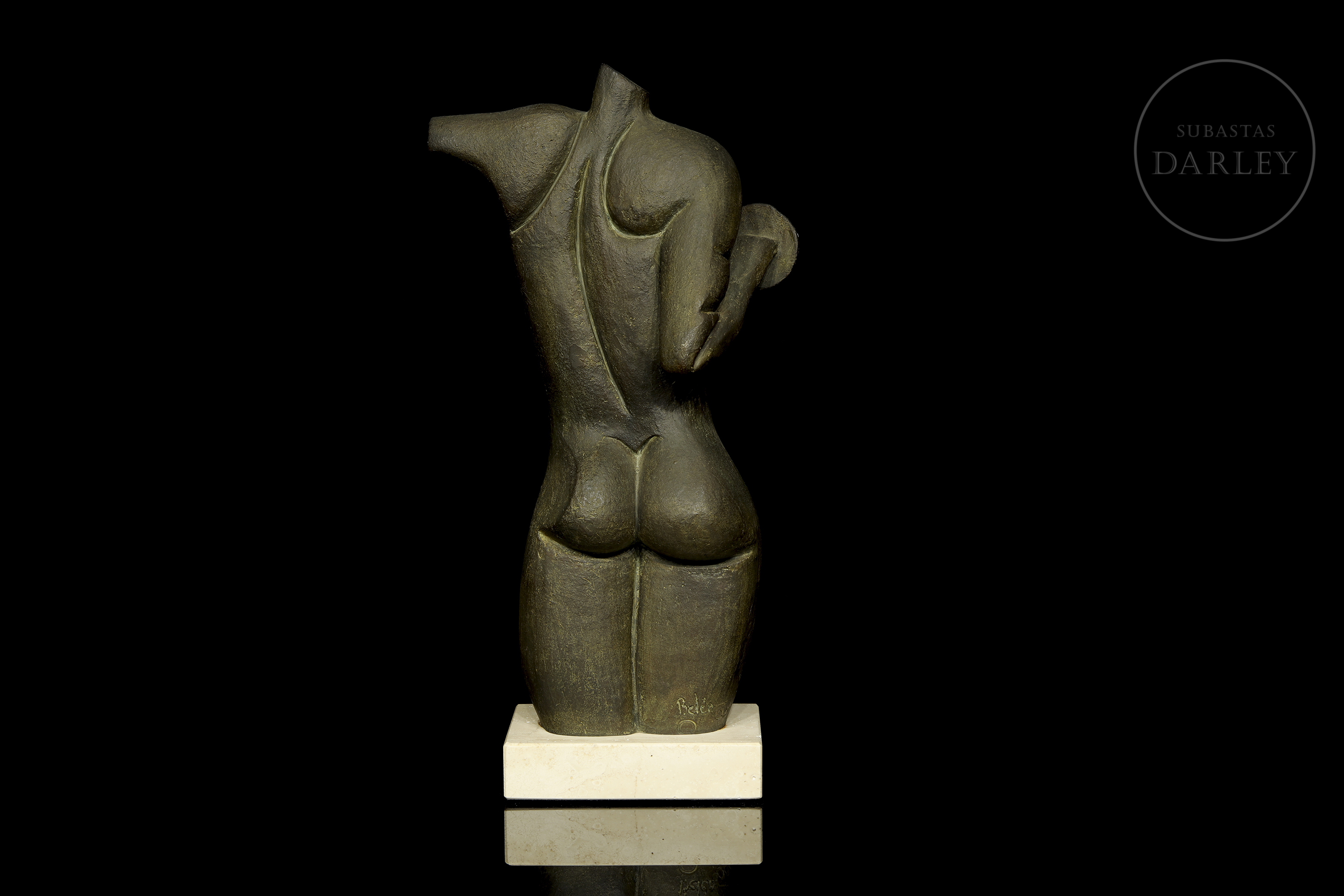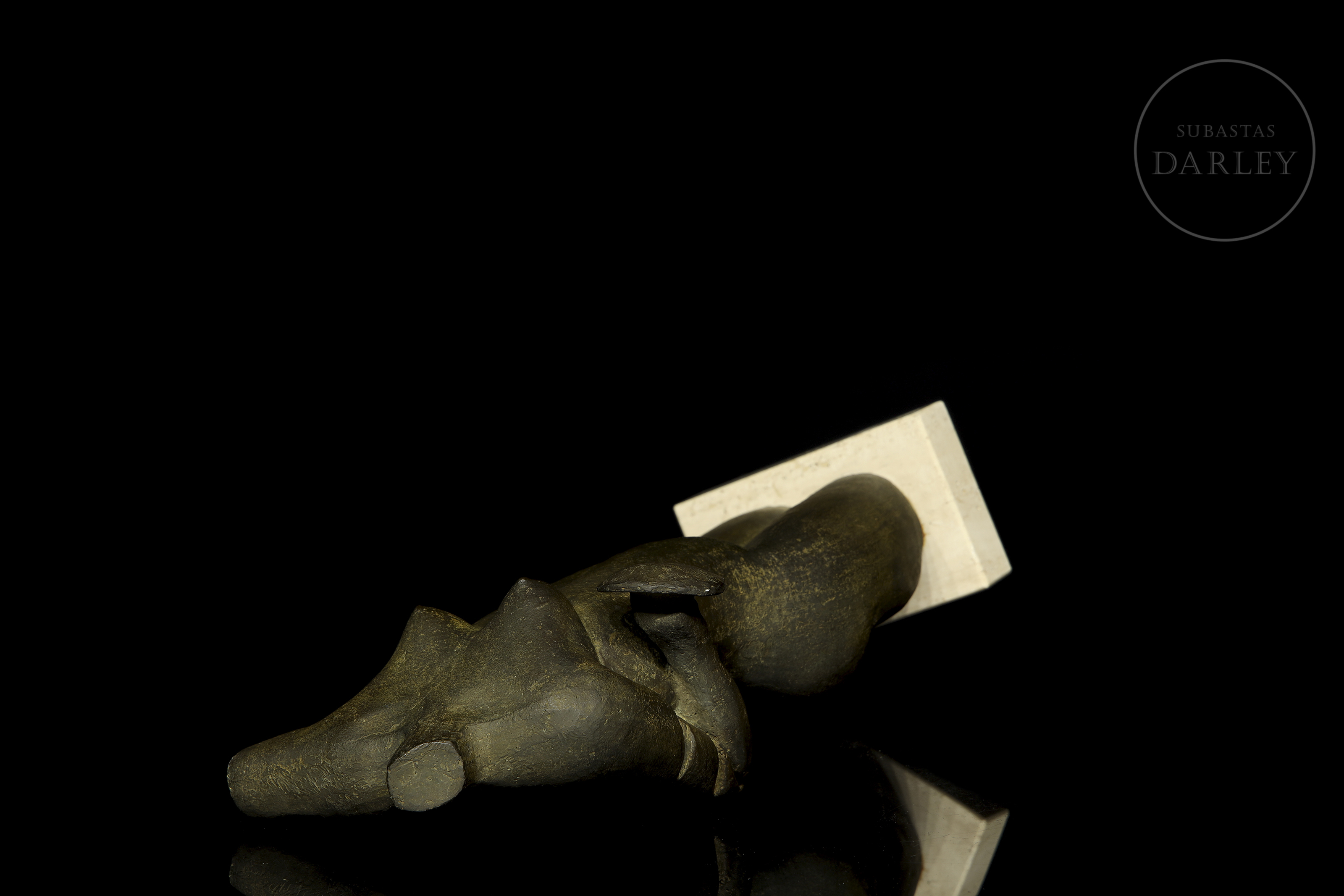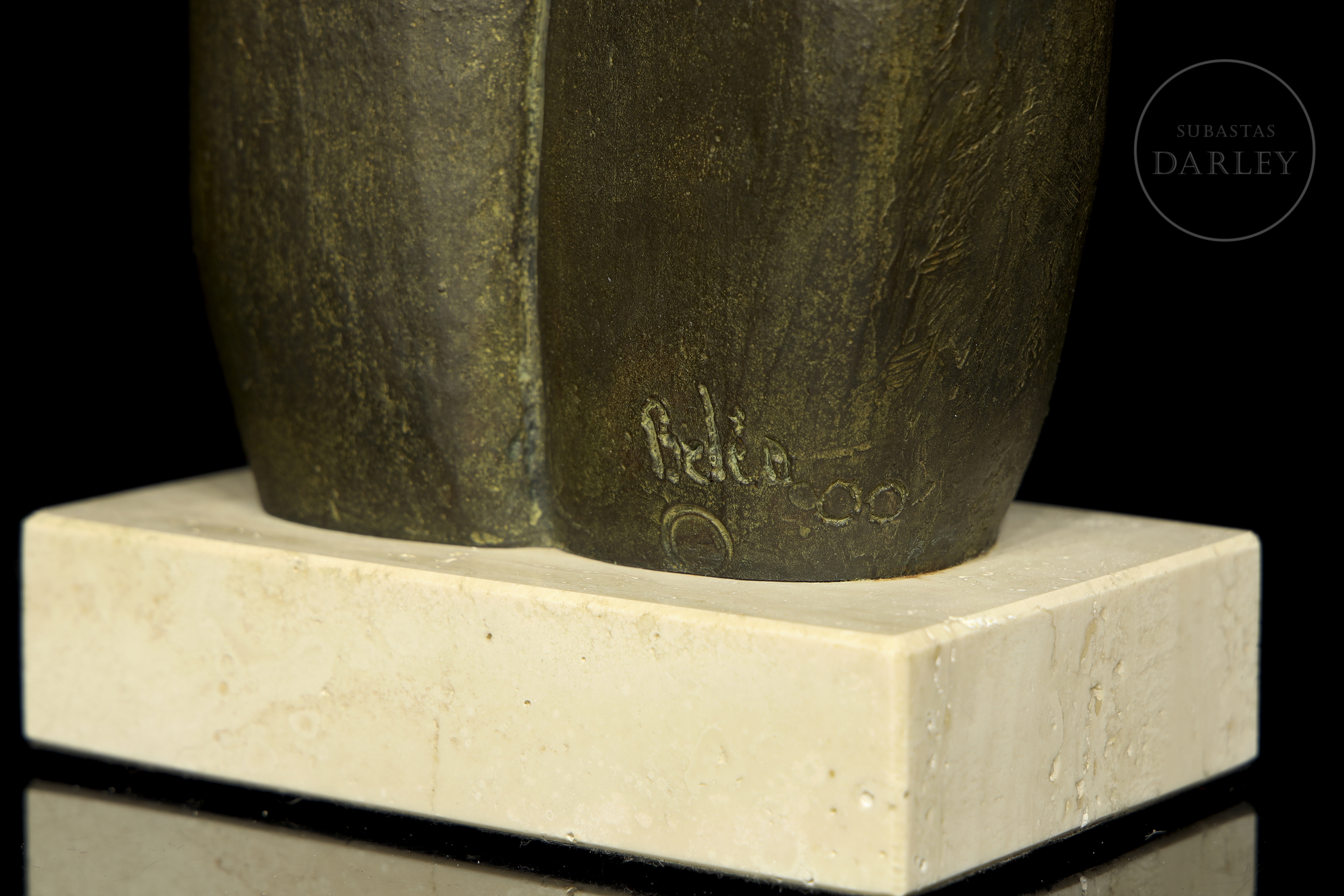 Figura de bronce patinado, con superficie texturizada. Presenta firma "Belén" y fecha en la parte posterior. Sobre base de mármol.