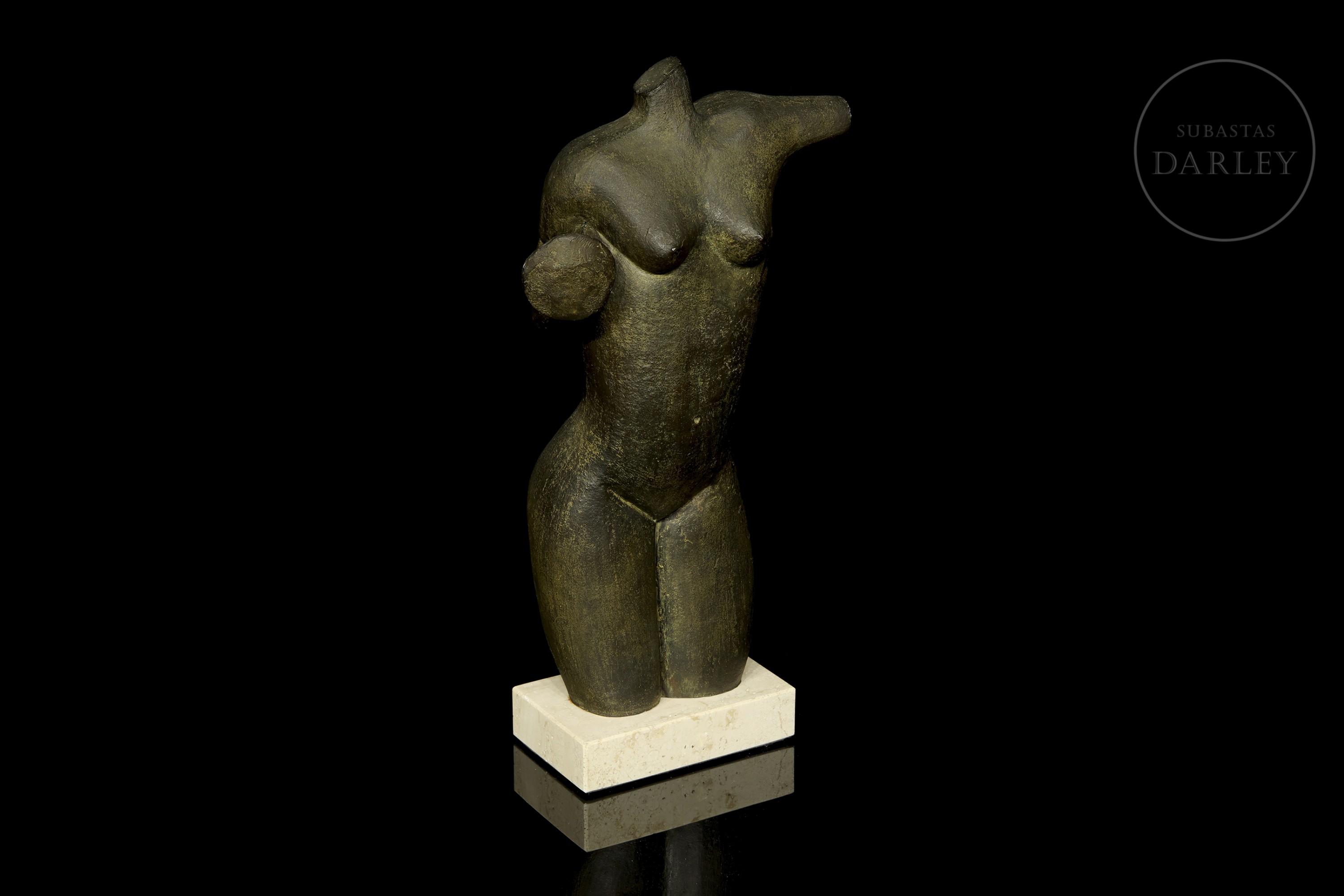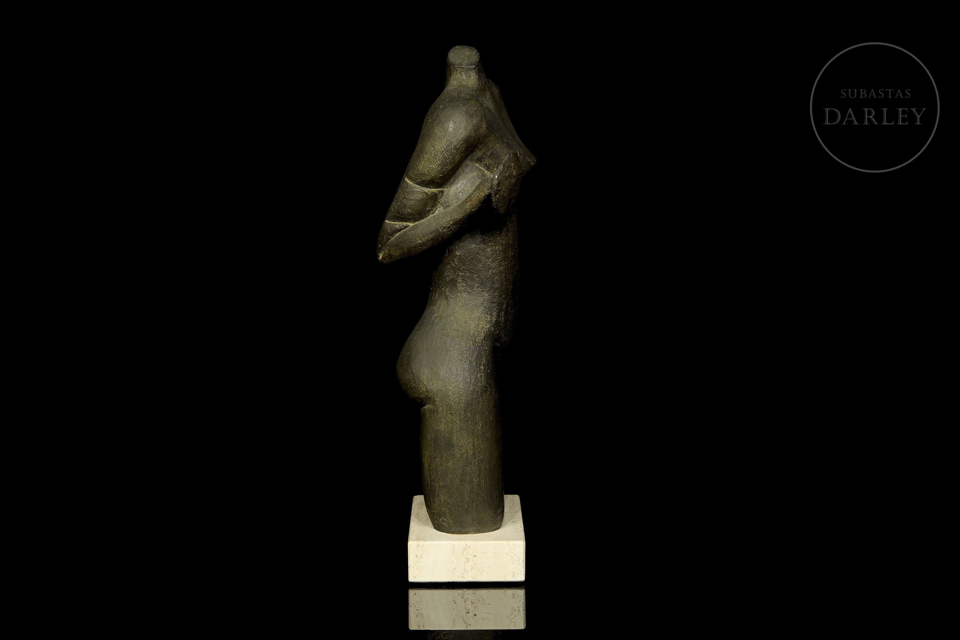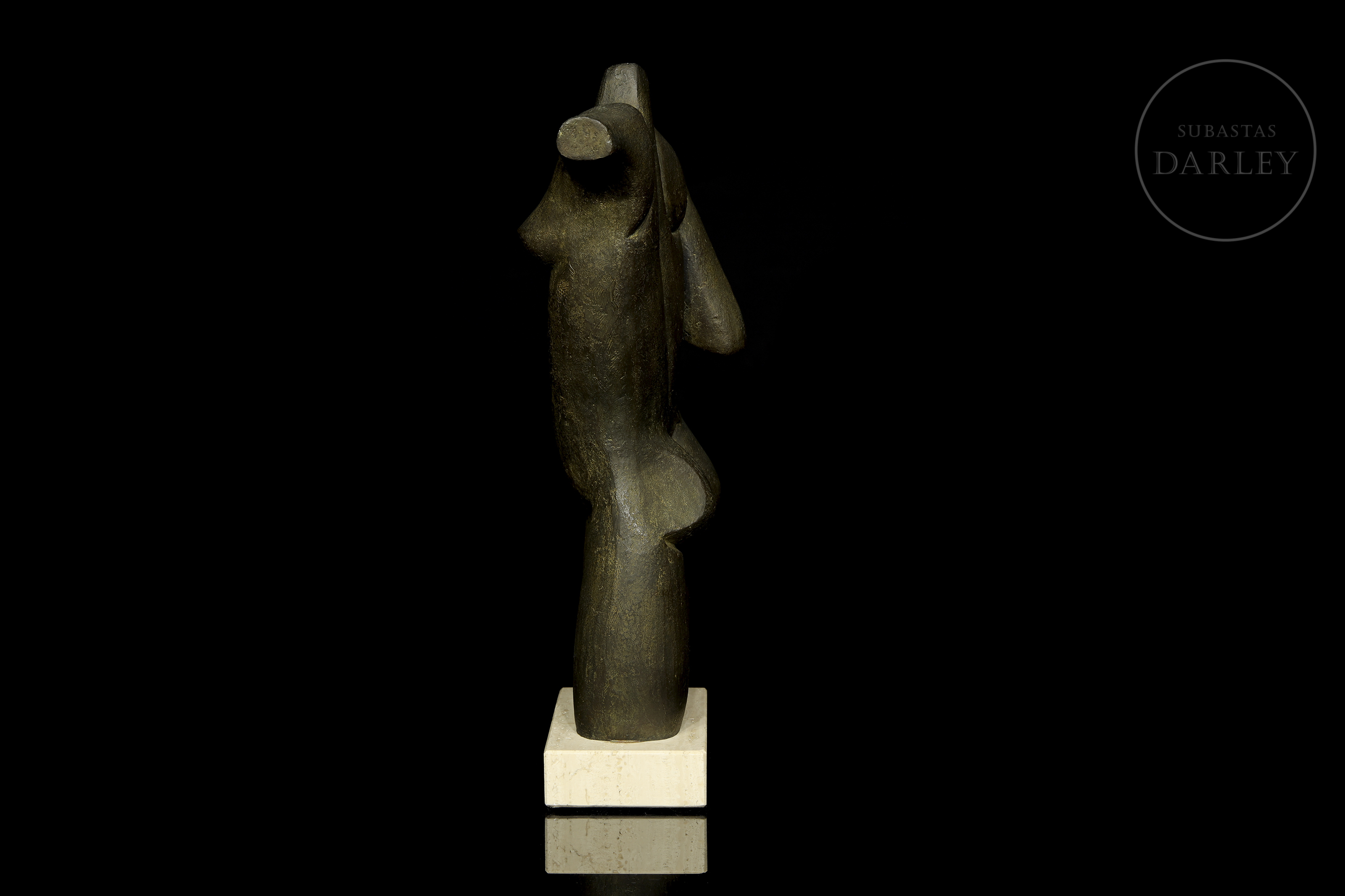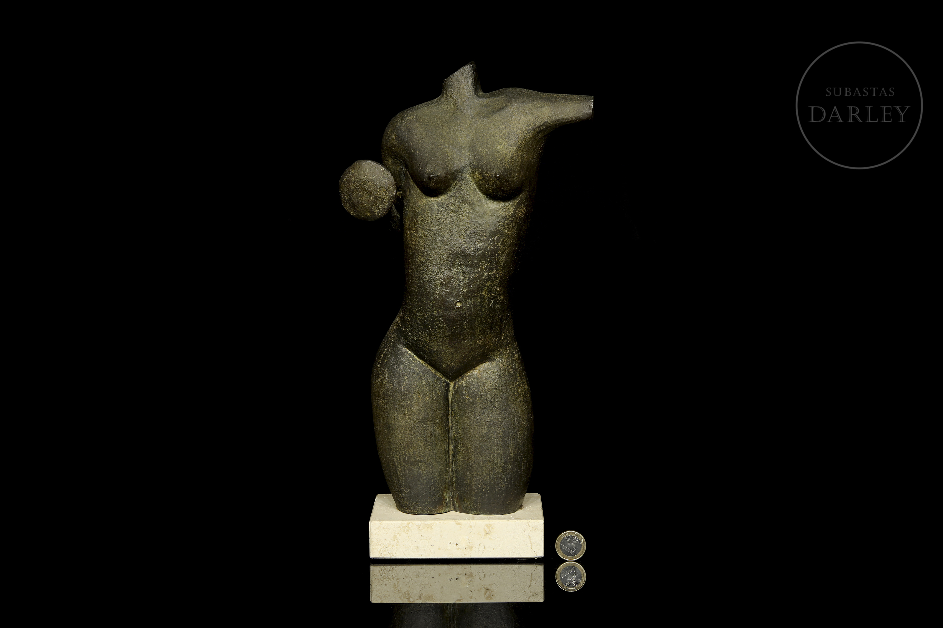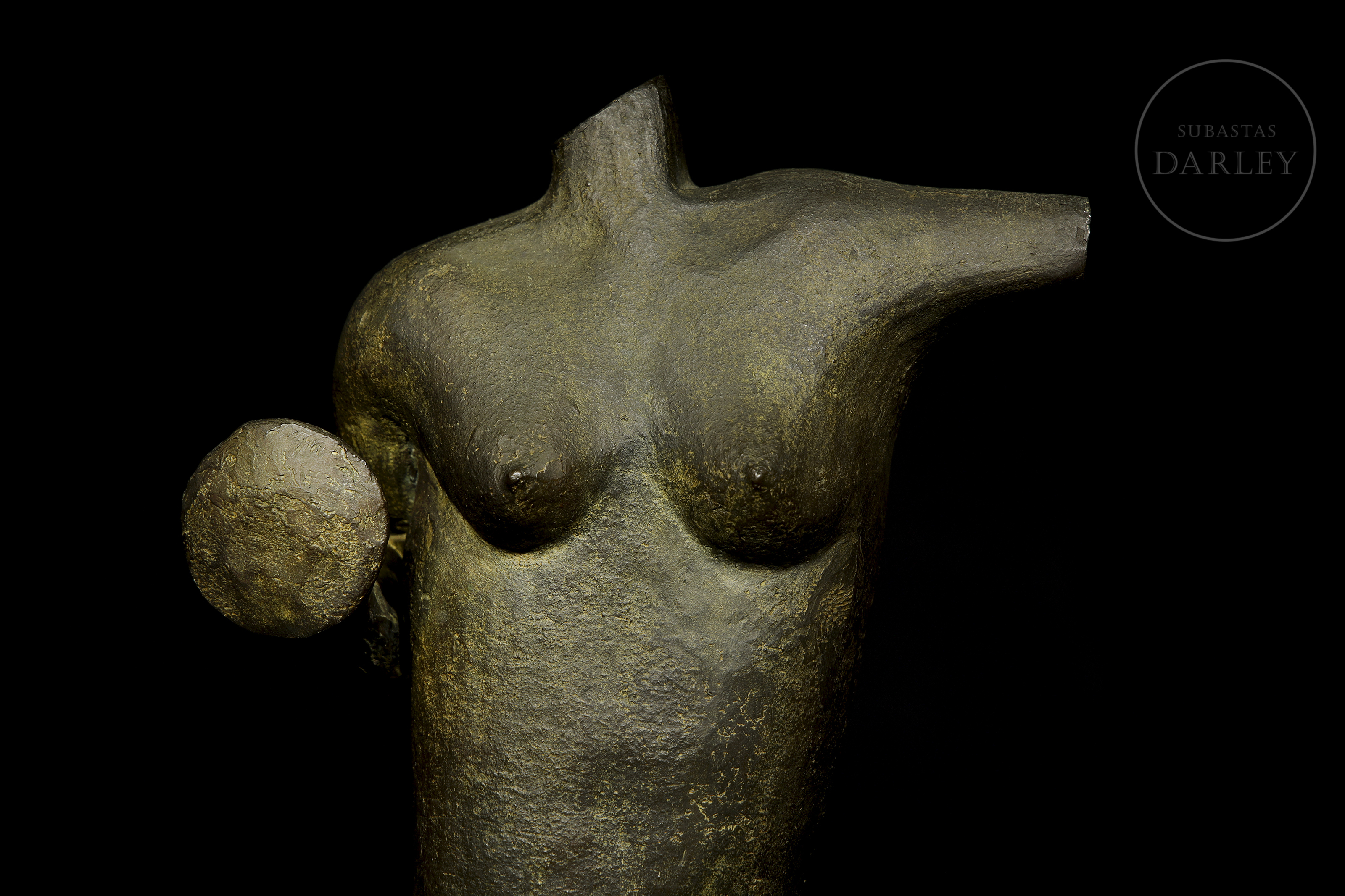 Figura de bronce patinado, con superficie texturizada. Presenta firma "Belén" y fecha en la parte posterior. Sobre base de mármol.
