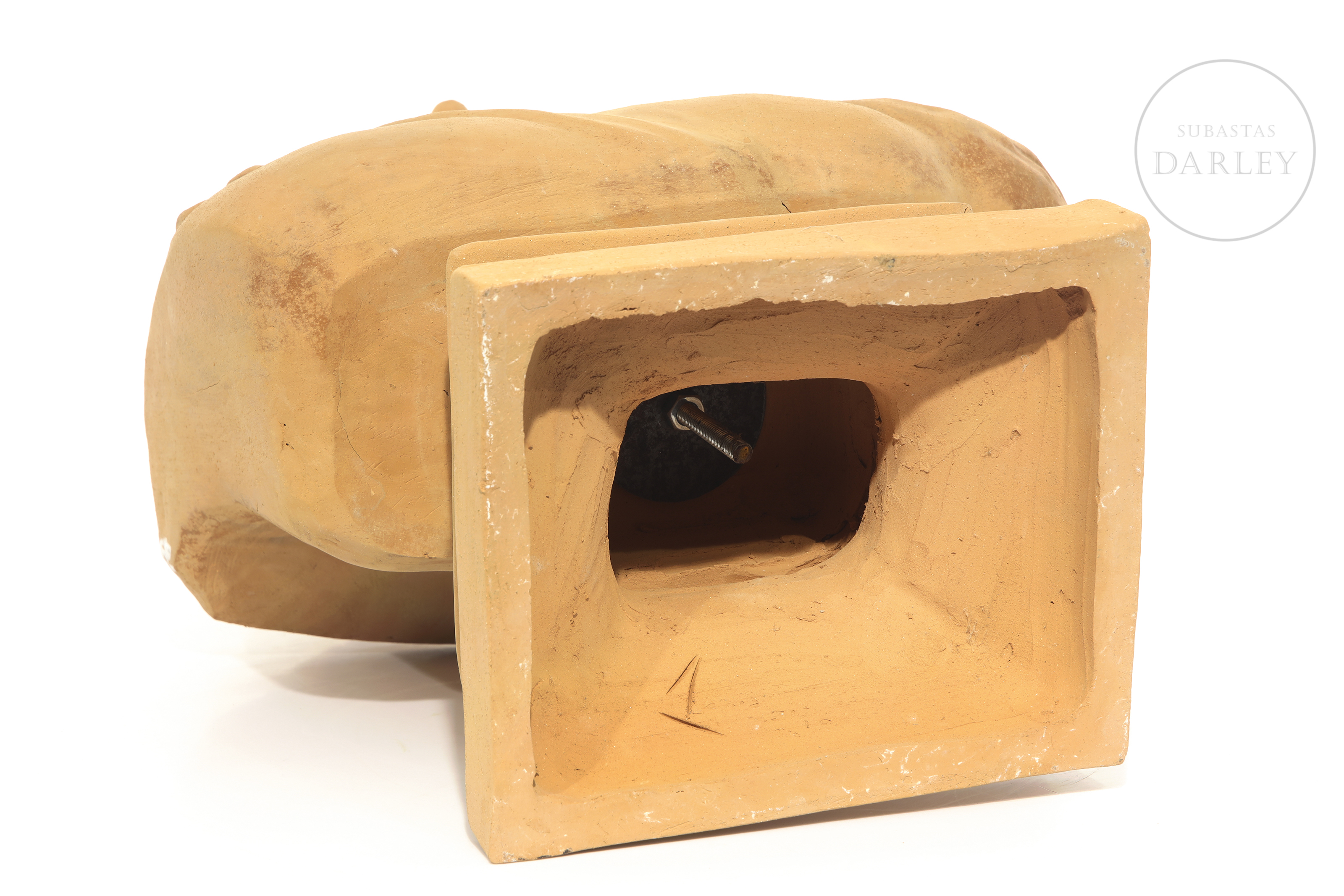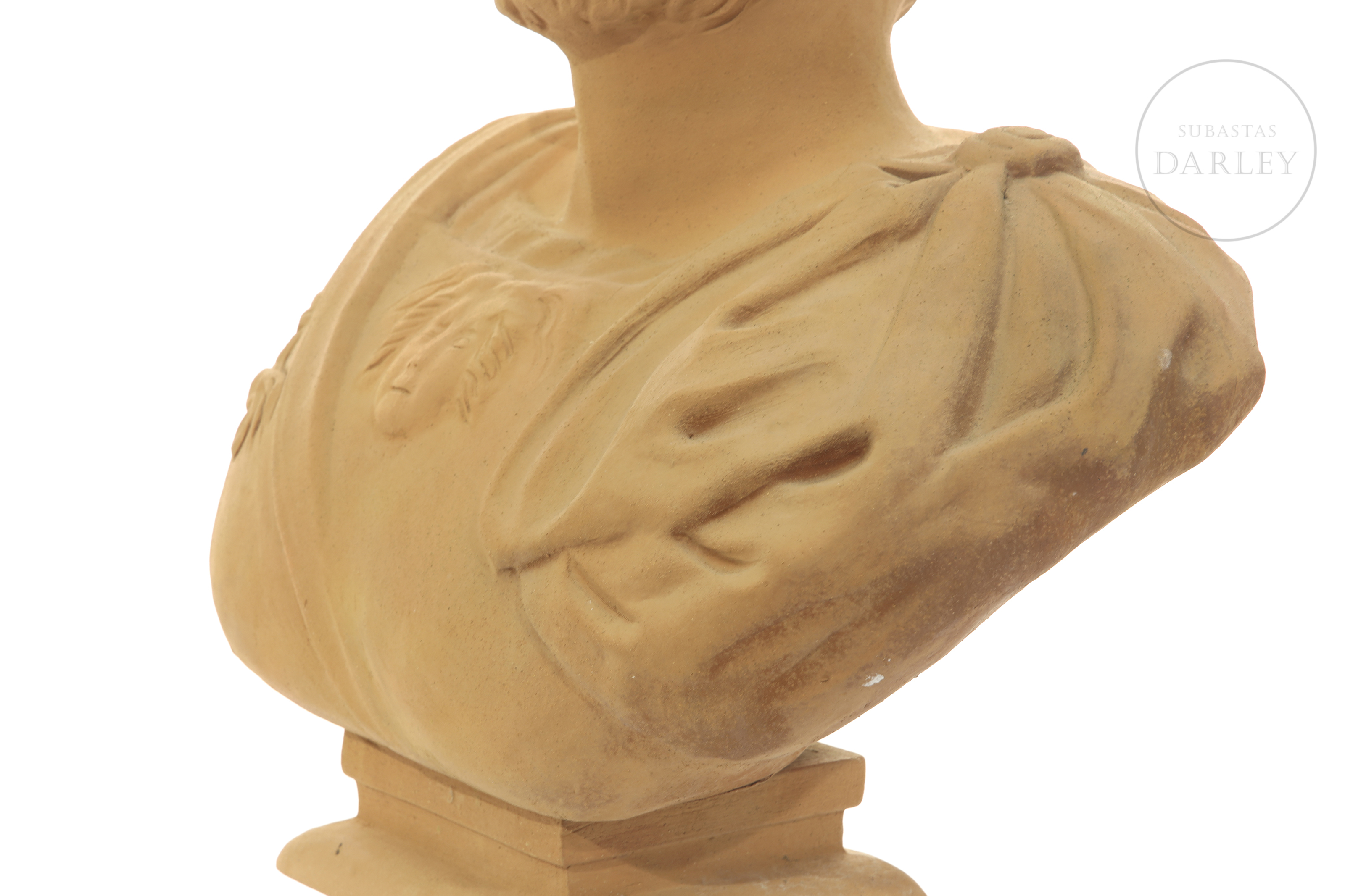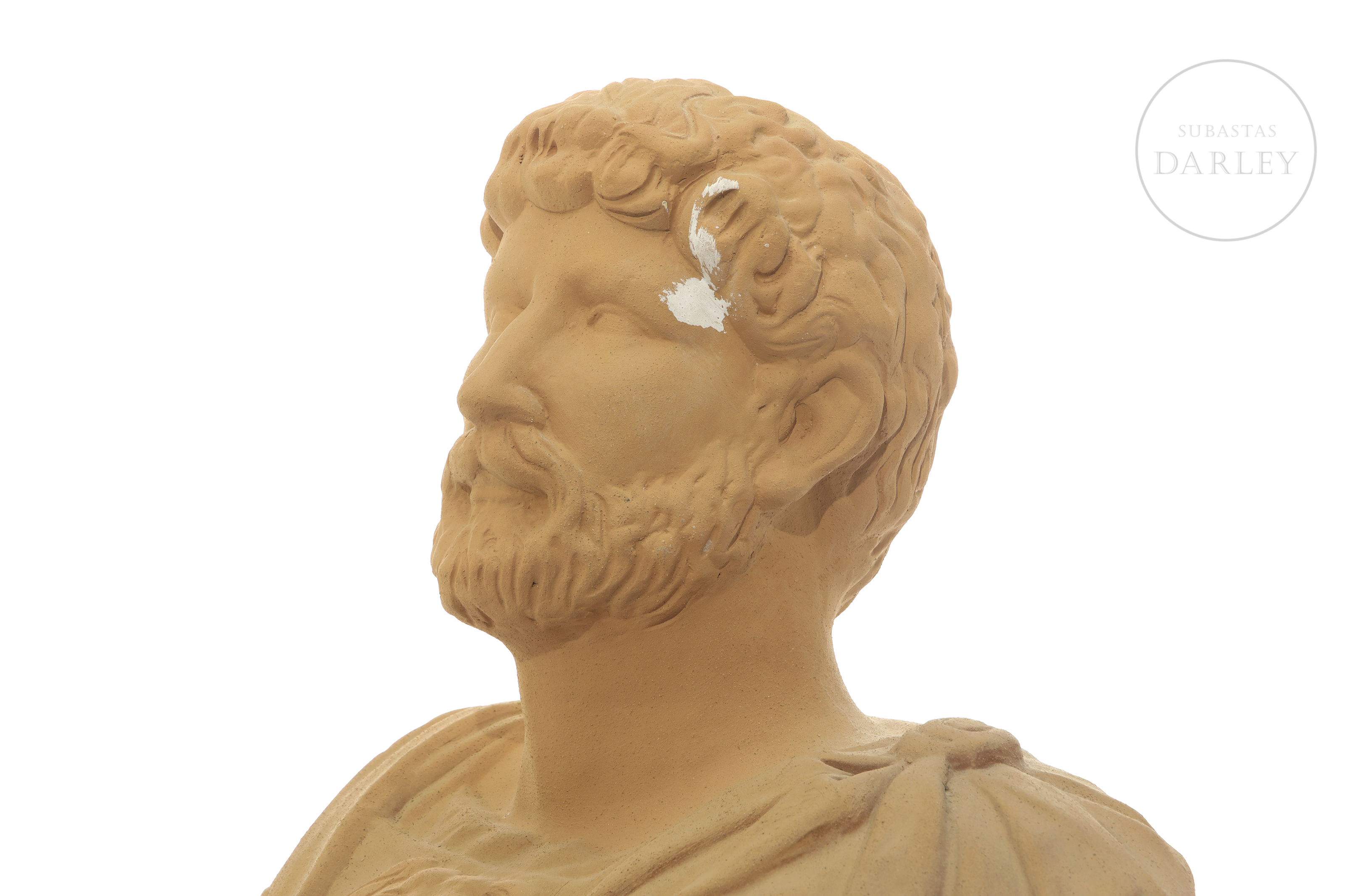 Barro o terracota modelada y cocida, con forma de emperador romano. Muestra una mancha de pintura blanca en el la cabeza.