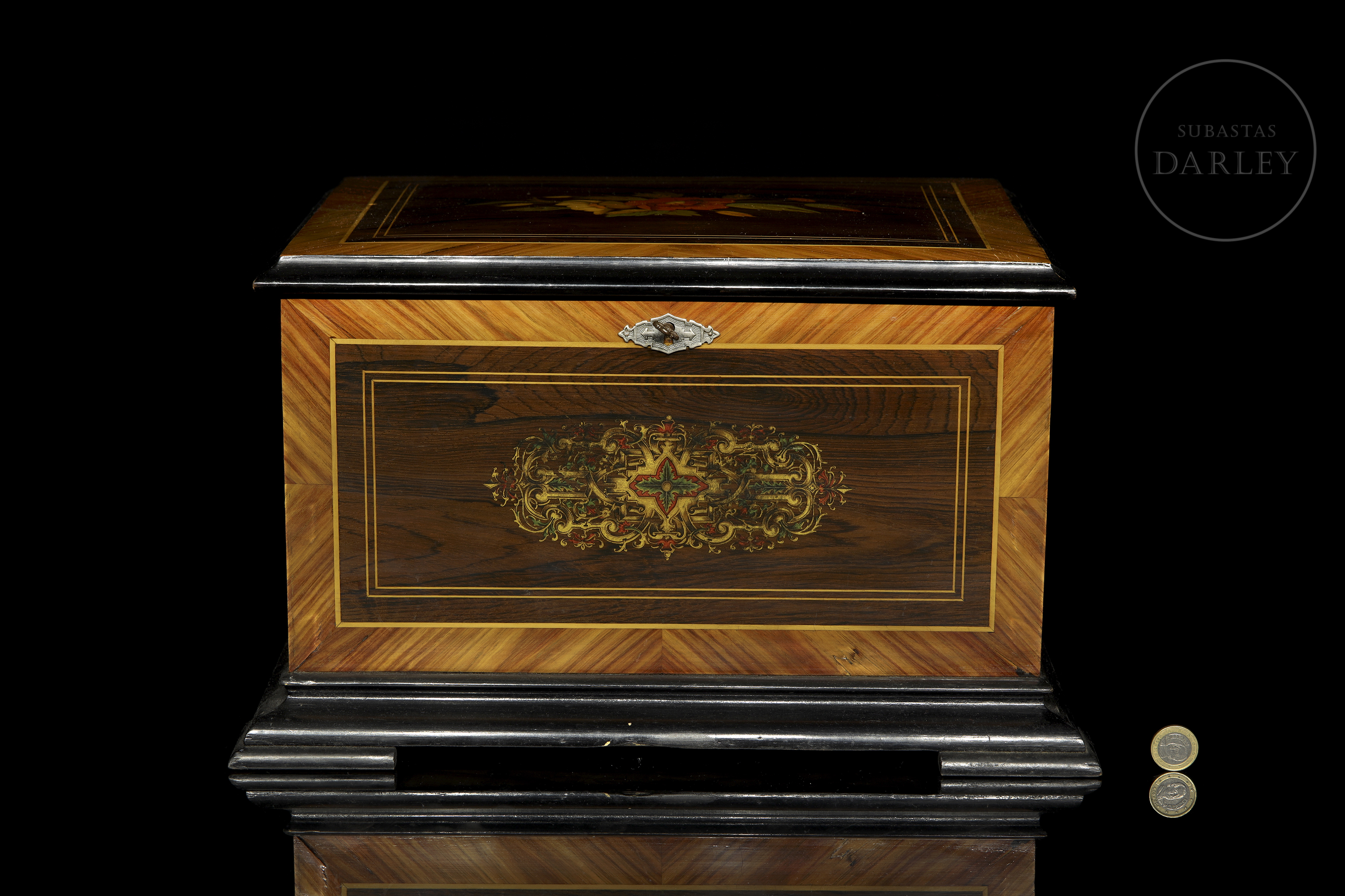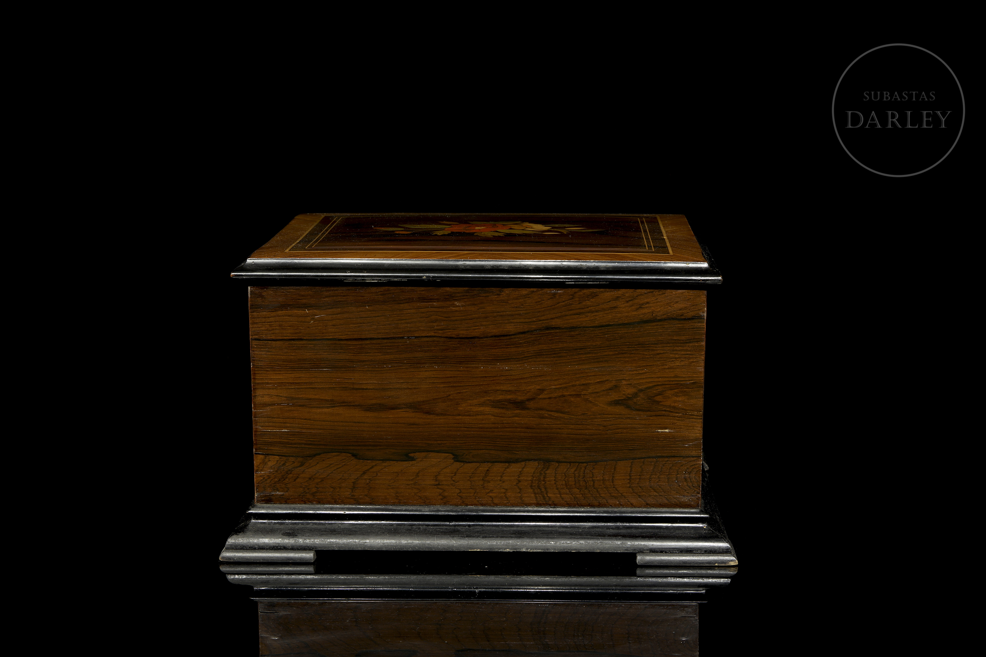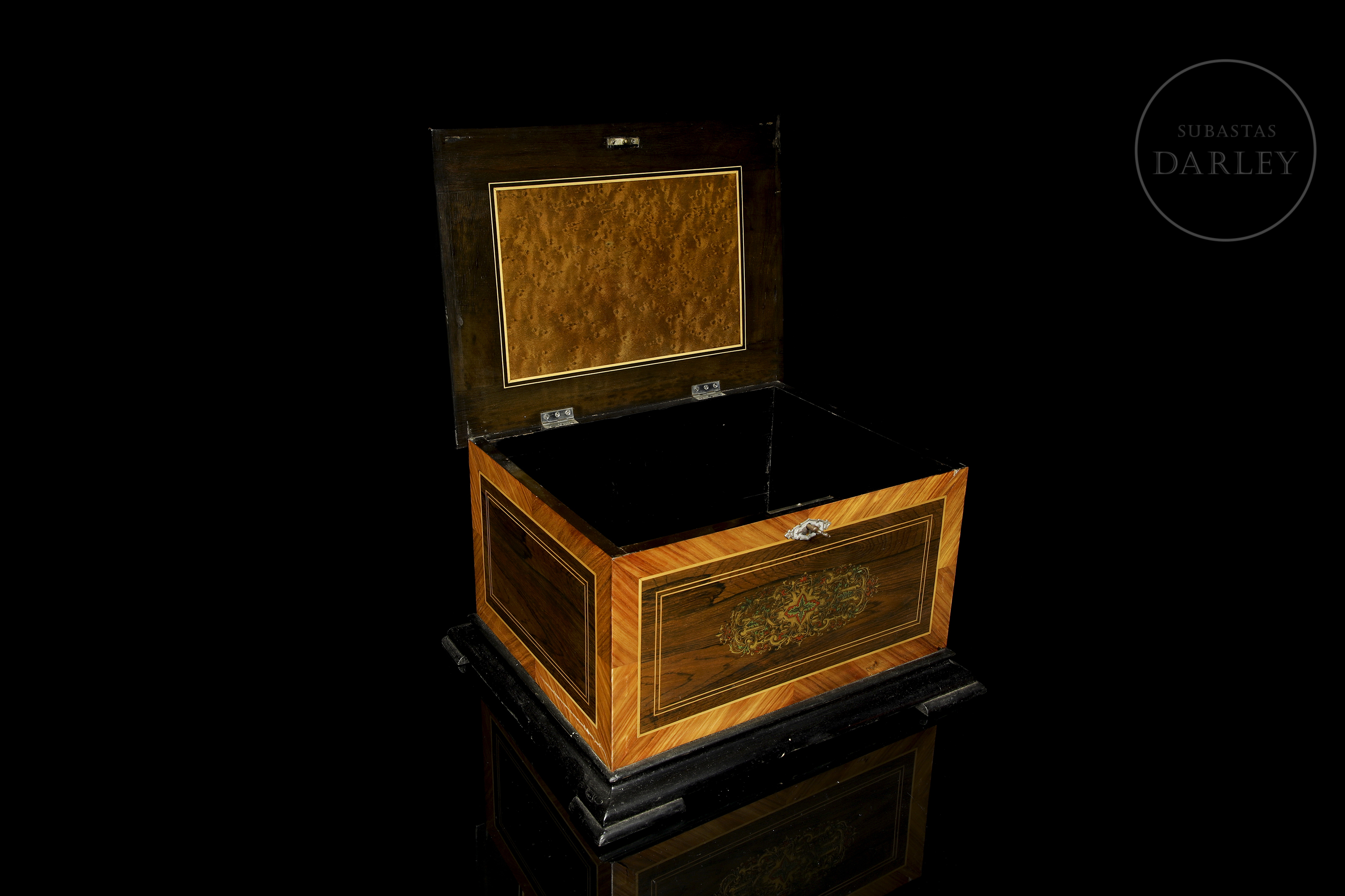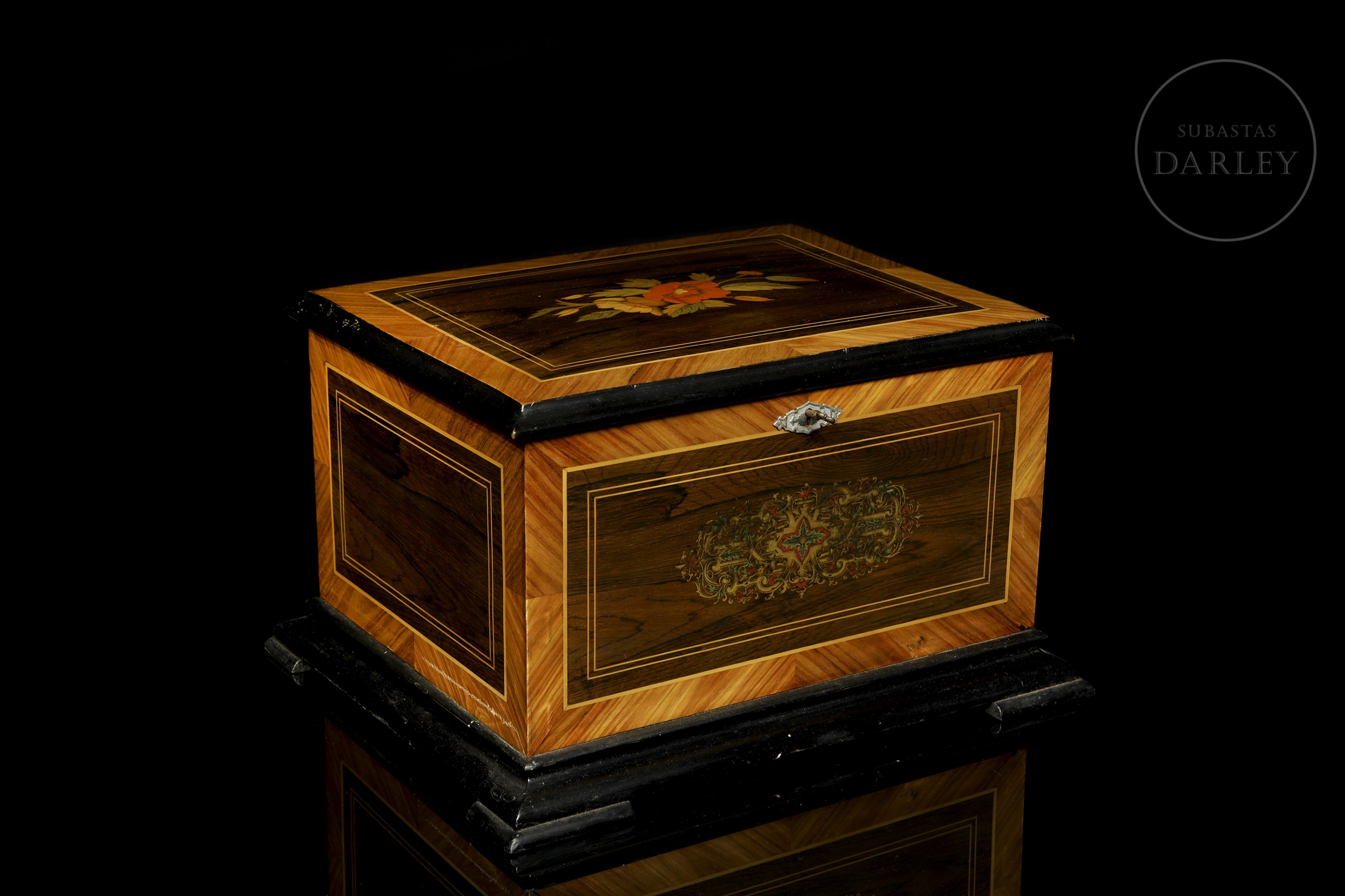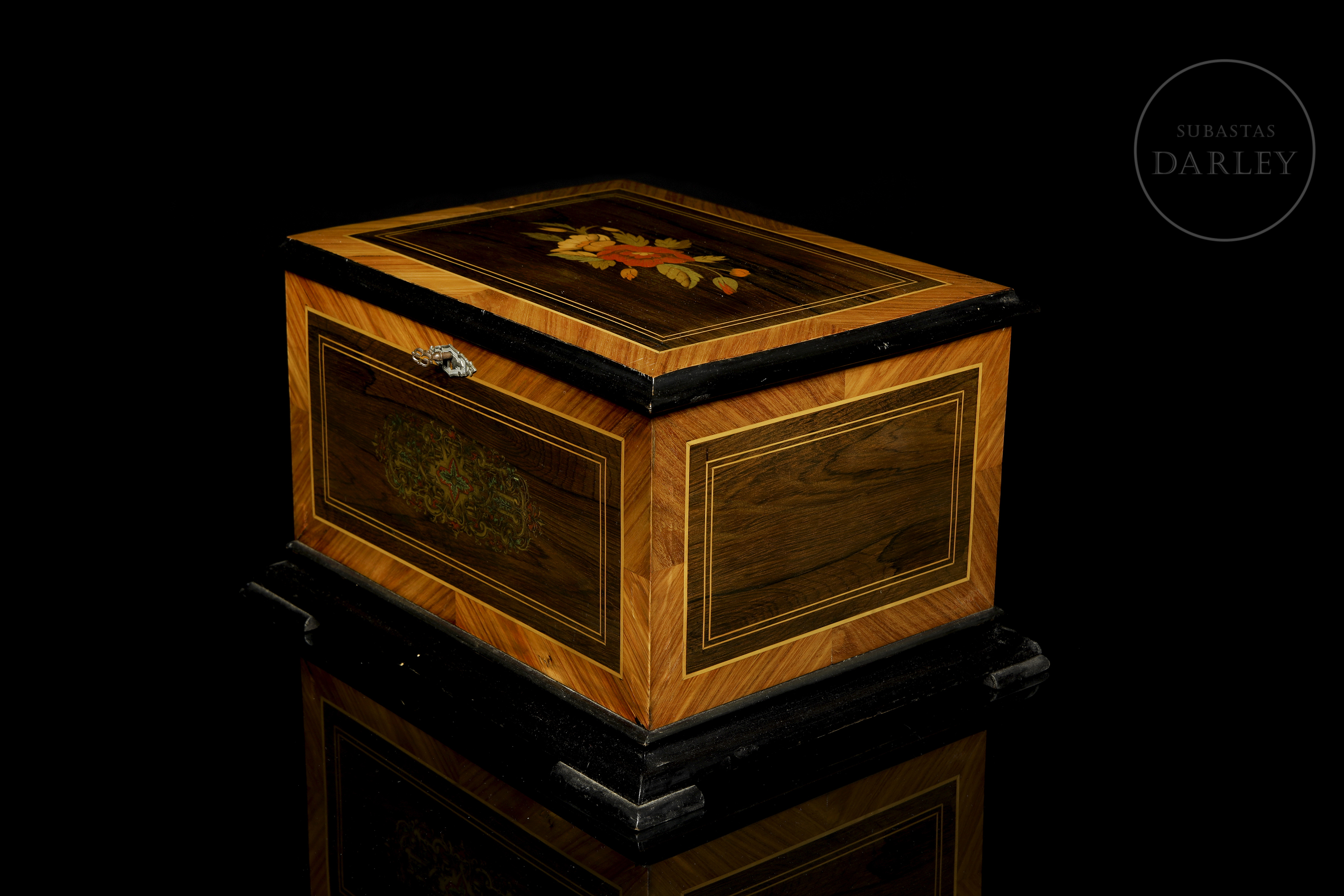 Caja decorativa grande de madera con tapa abisagrada, decorada con marquetería. Presenta un diseño floral en la tapa y un elaborado diseño de greca central en el frontal-