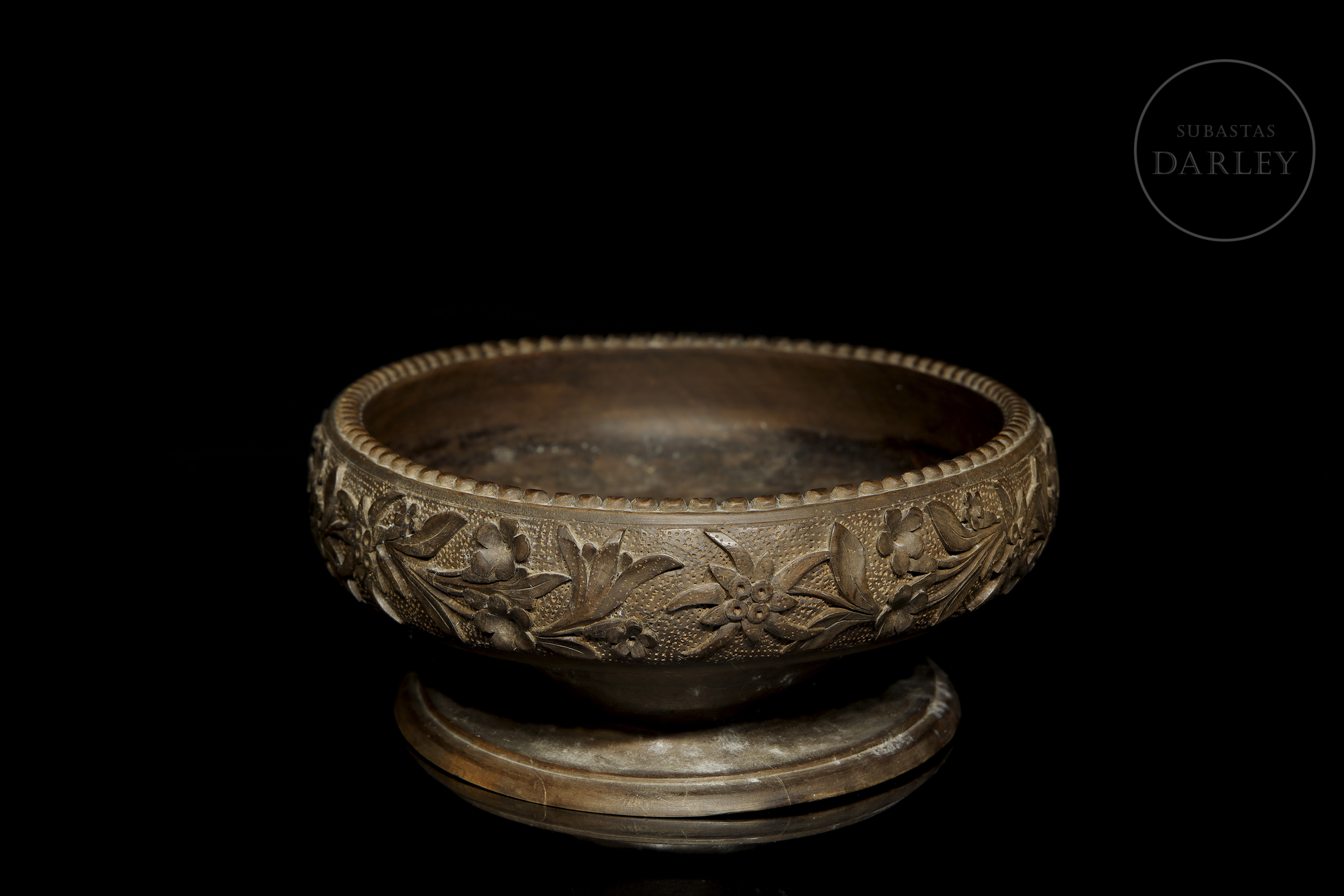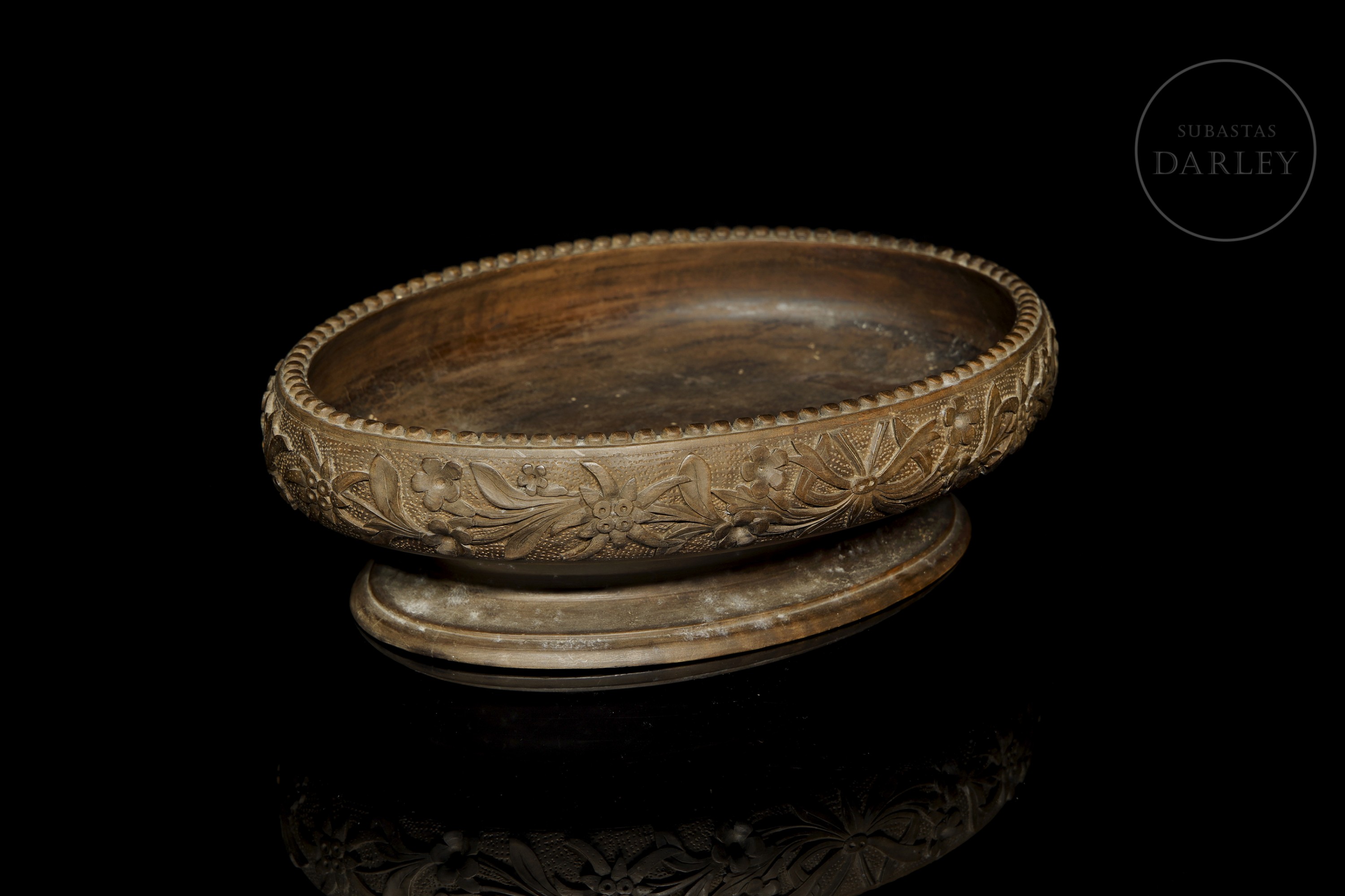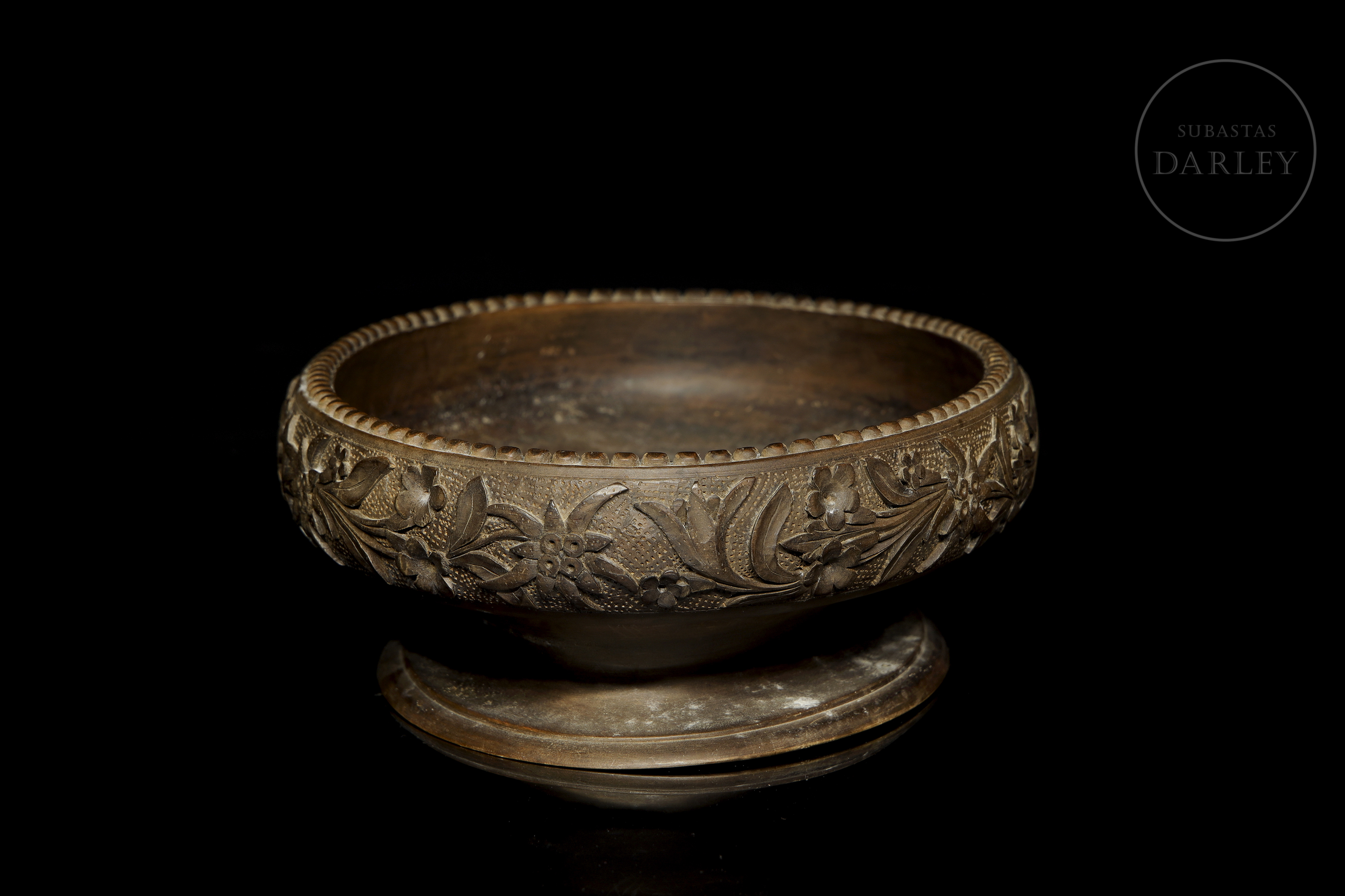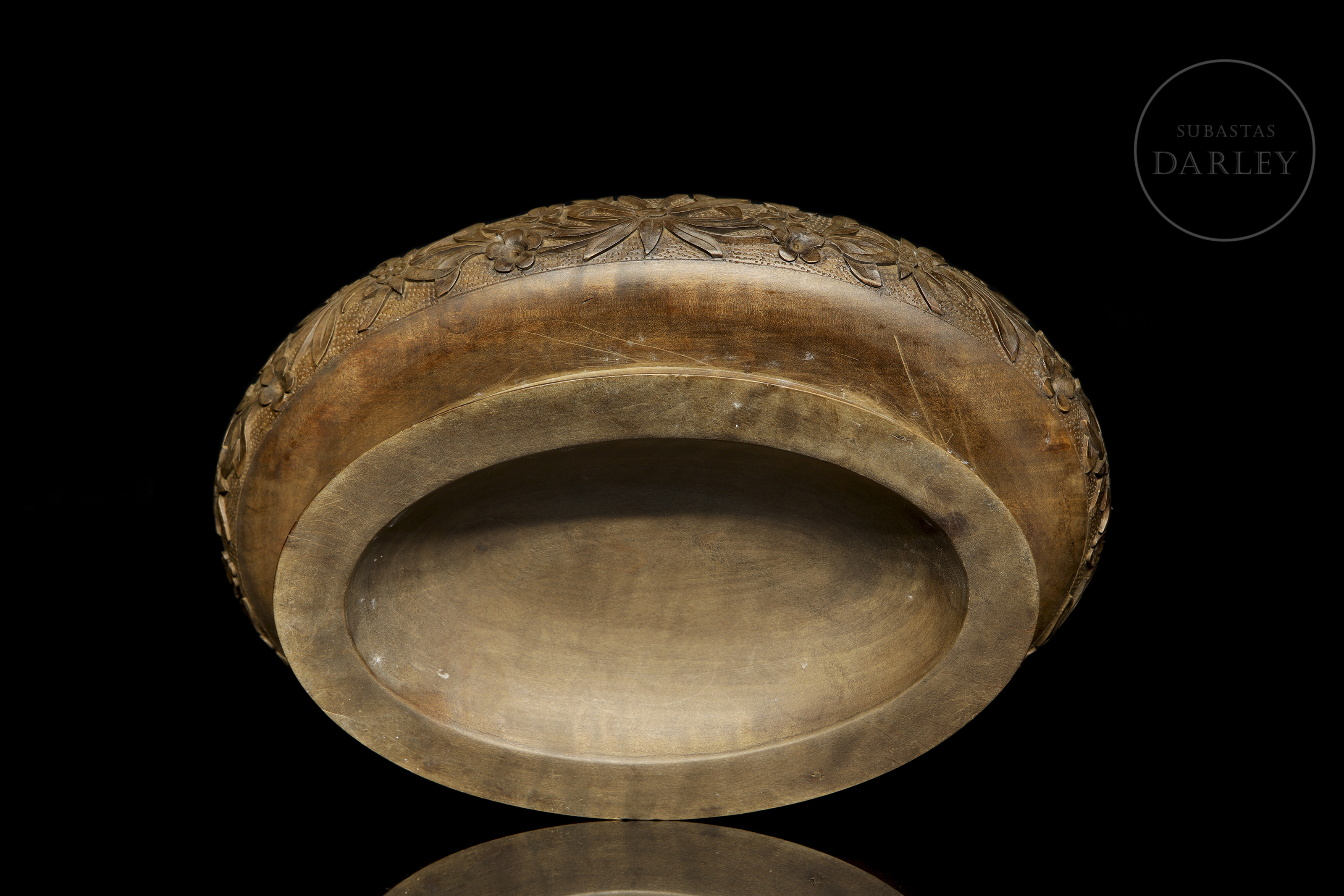 Madera tallada. Posee forma elíptica, con un pie acampanado sobre el que se dispone el cuerpo, hondo y de perfil curvo, adornado en el exterior por finos detalles incisos y en relieve de hojas y curvas ramas en flor. Muestra desgaste por envejecimiento.